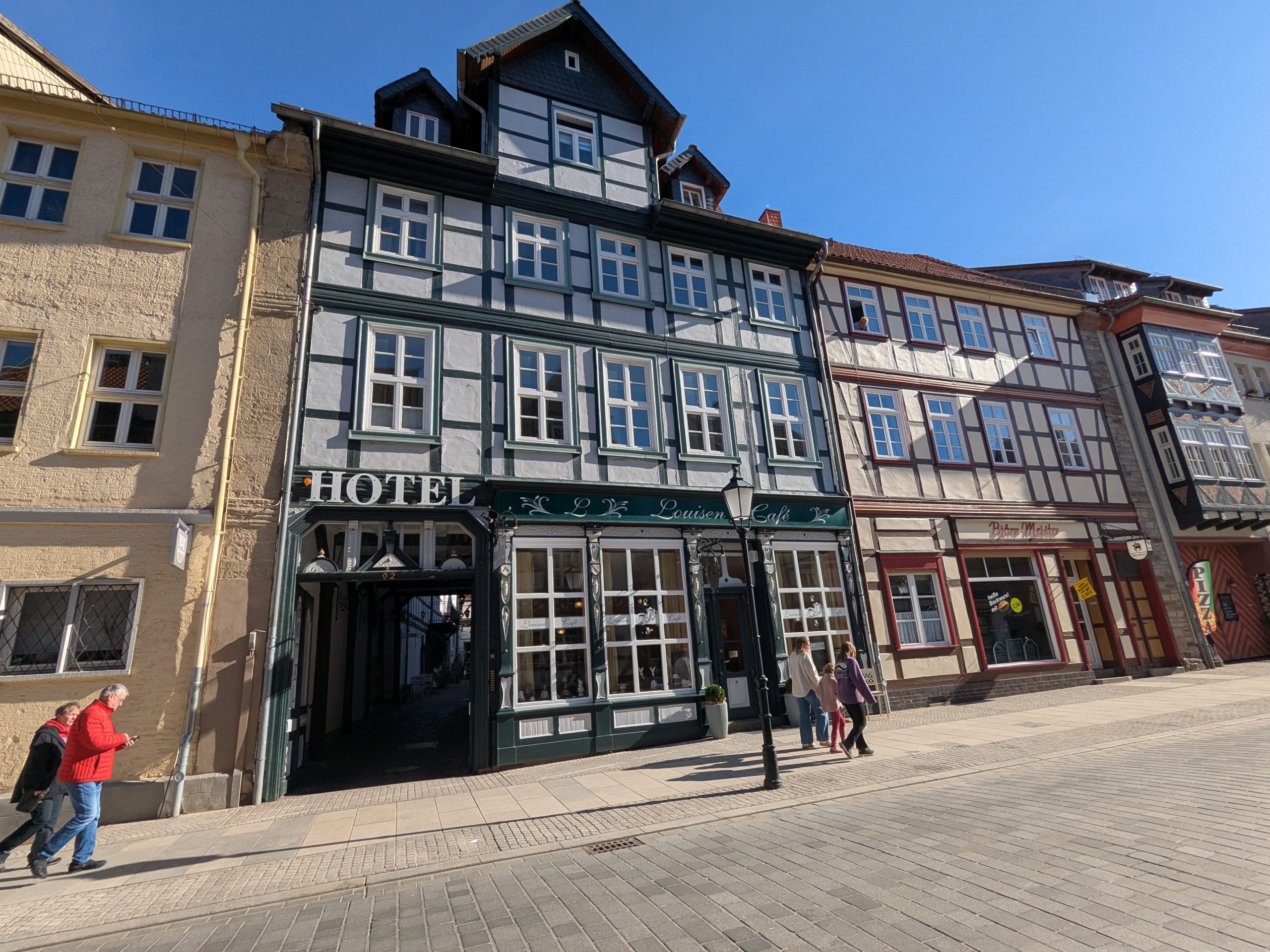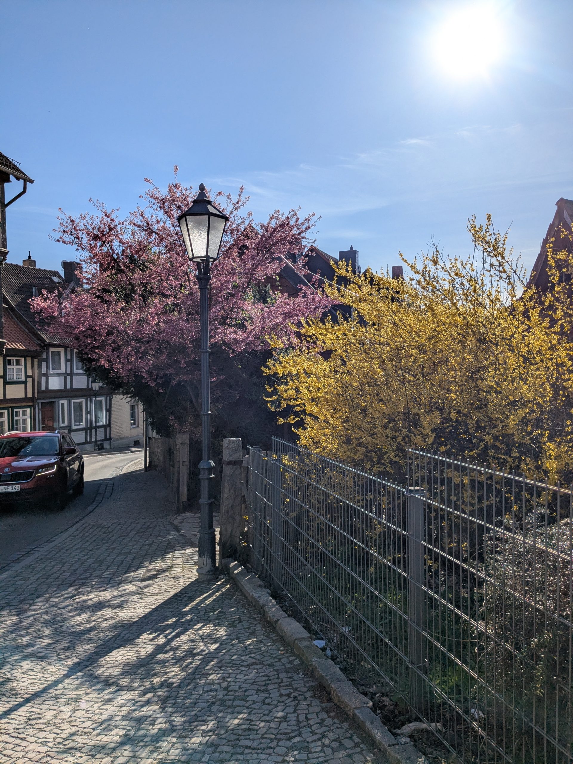 Wir haben etwas verschlafen, also wieder Frühstück zur Mittagszeit. Dann geht es mit dem Kleinen Richtung Blankenburg. Auf dem Wanderparkplatz der Burg Regenstein wird geparkt und wie der Name schon sagt, wird dann gewandert. Bergauf zur Ruine der Burg, dann Bergauf und runter, auf „perfekten“ Wanderwegen zu den Sandsteinhöhlen und schließlich zurück zum Auto. Nächster Stopp, Blankenburg und hier das Café Colonial. In Ermangelung des Mittagessens gibt es Torte und Kakao, total lecker, aber kein echter Ersatz fürs Mittagessen, findet Ralf, was sich sehr negativ auf seine Laune auswirkt. Trotzdem gibt es noch etwas Blankenburg, das große Schloss ist zum Glück schon geschlossen, sonst wäre seine Laune noch schlechter, aber, das Rathaus und das kleine Schloss mit Barockgarten schauen wir uns an. Inzwischen ist es 18:00 und wir beschließen zurück zum Stellplatz zu fahren. Klappt aber nicht ganz, es kommt uns noch ein Chinese dazwischen. Was sich aber sehr positiv auf Ralfs Laune auswirkt und extrem lecker ist. 12150 Schritte waren es heute.