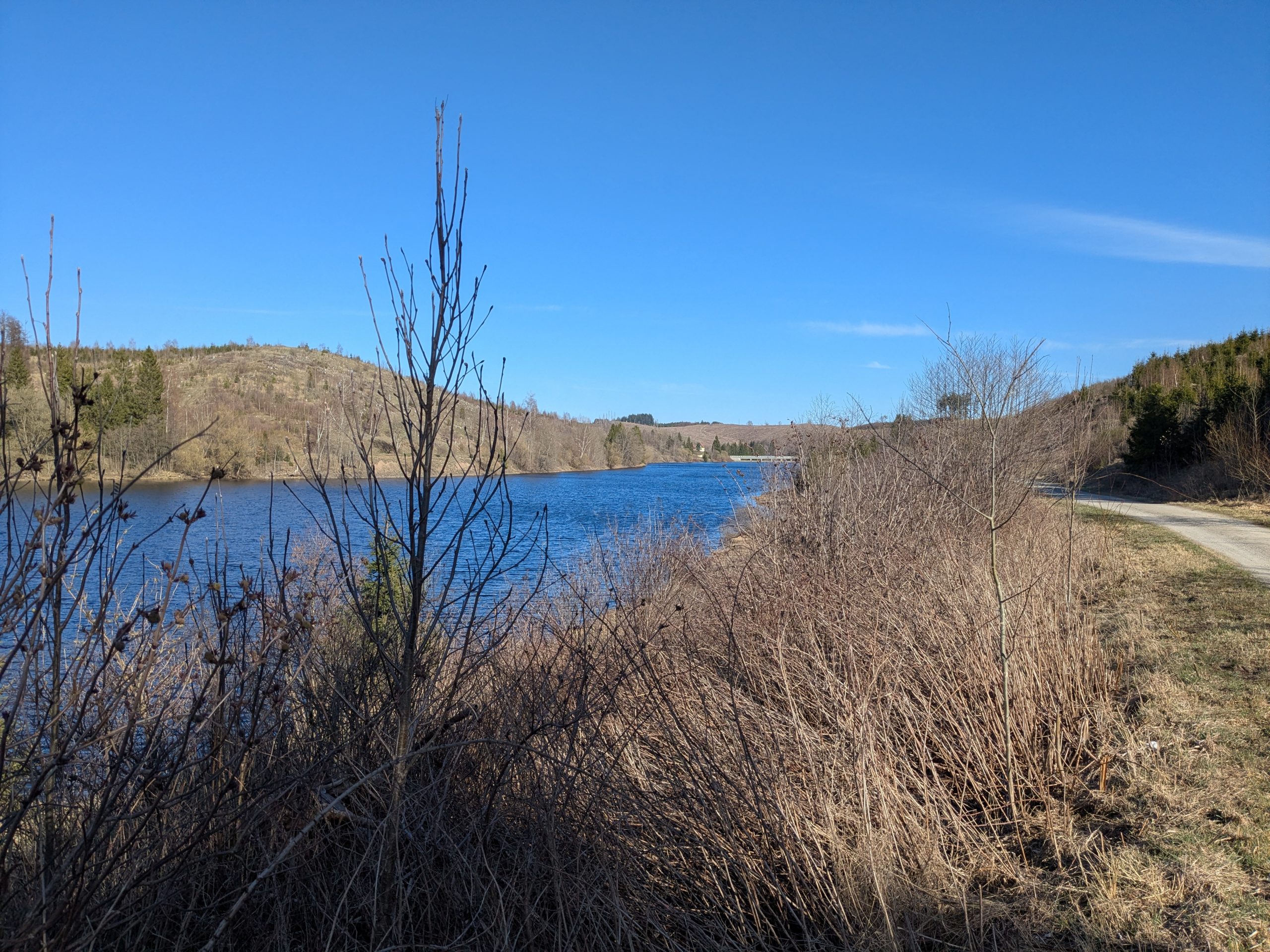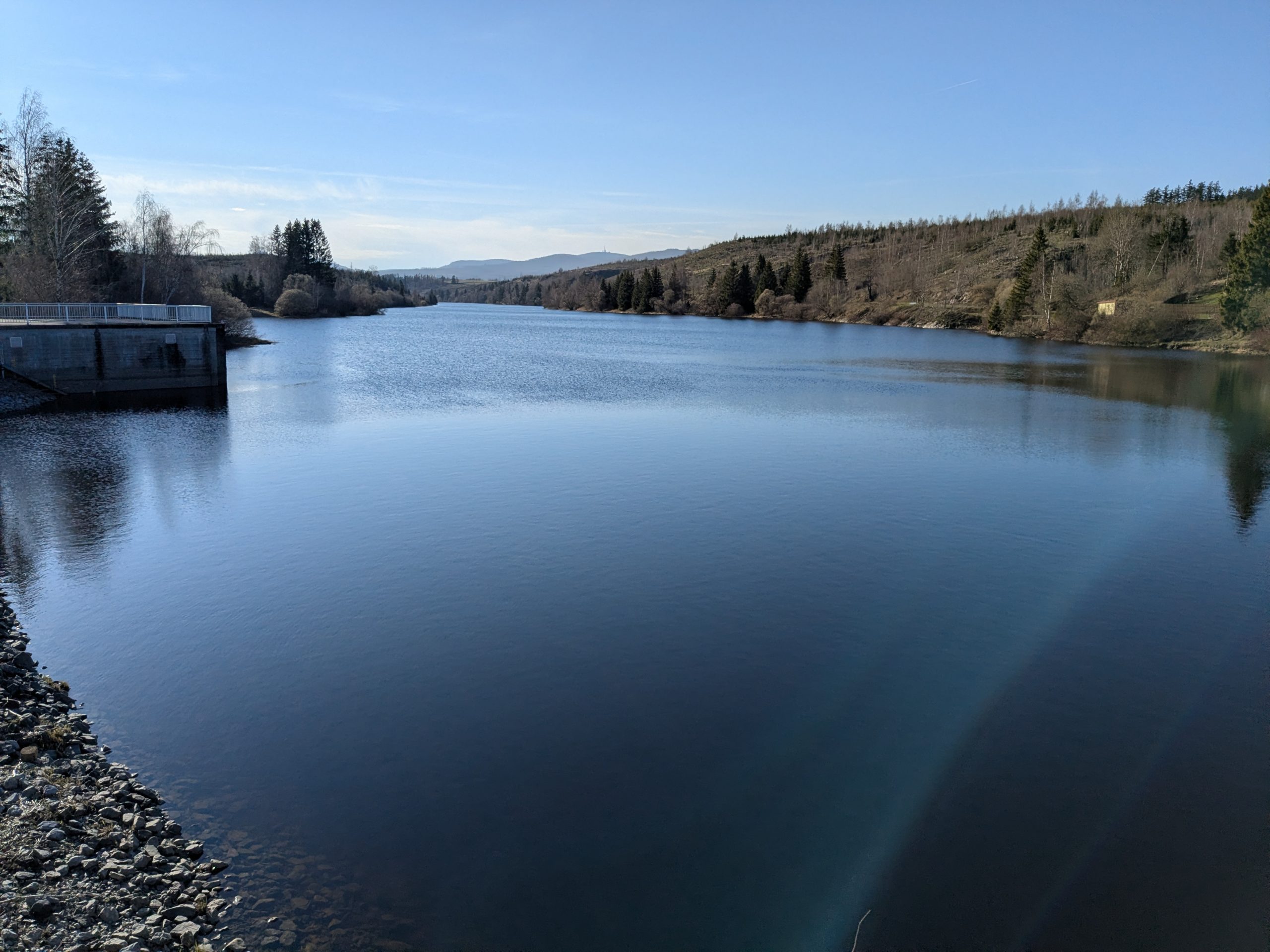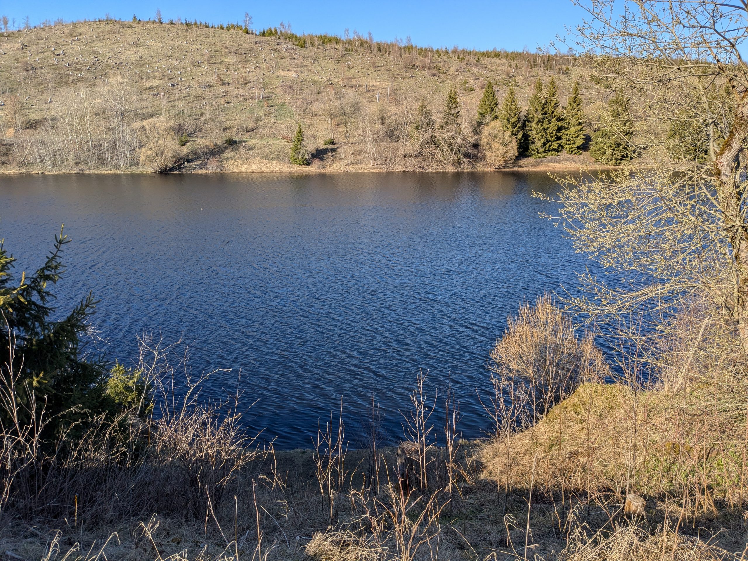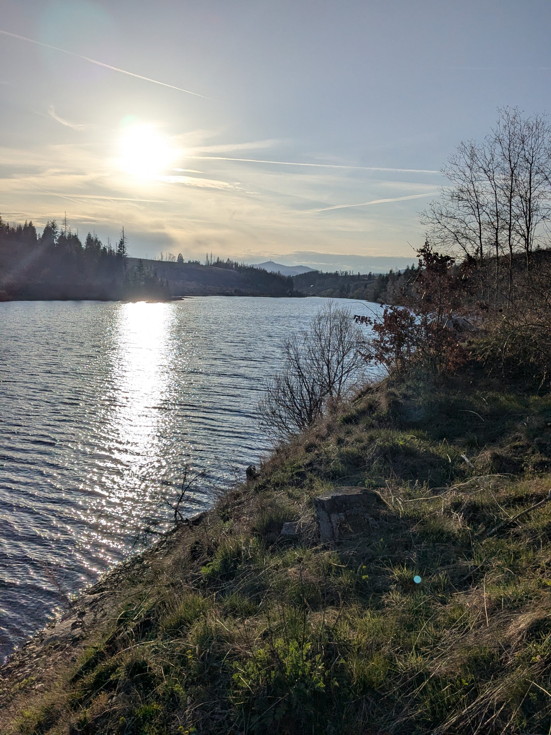 Heute müssen wir Gas tanken, also wieder nach Wernigerode, Gas, Futter und Currywurst Pommes zum Mittag. Zurück zum Stellplatz, Auto wechseln und auf zum Stausee Königshütte, hier machen wir einen „kleinen Spaziergang“, der mit 22 Caches dekoriert ist, einmal um den See. Das heißt, ich cache und Ralf macht per Handy eine Videokonferenz. Kurz vor dem Dunkelwerden sind wir dann wieder beim Auto und können auf dem Heimweg sogar noch ein Schnäppchen machen: Super E 10 für 2,089€.