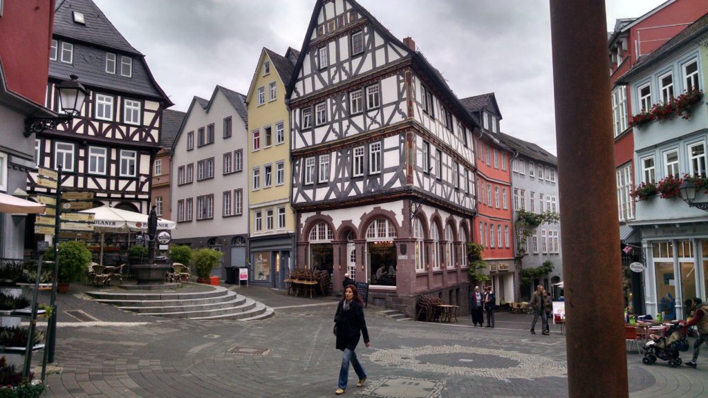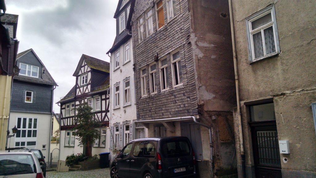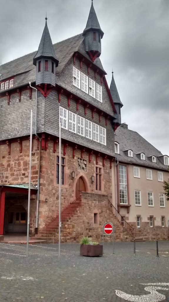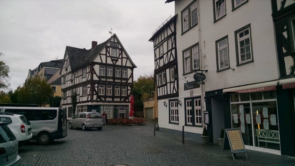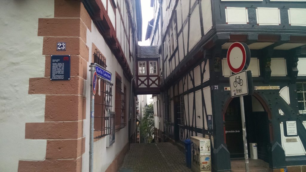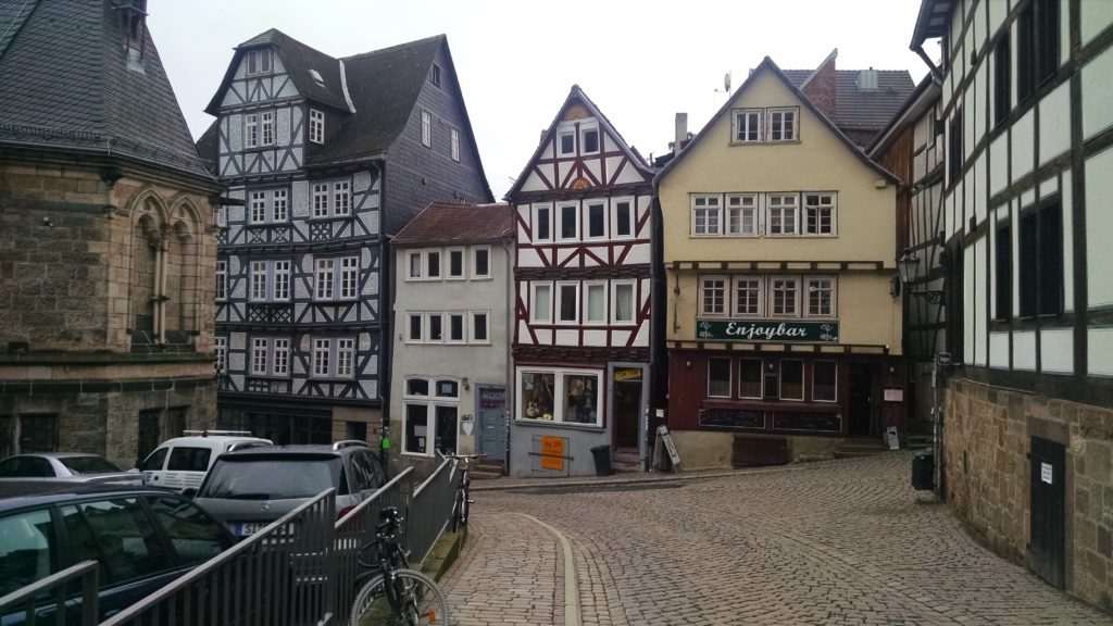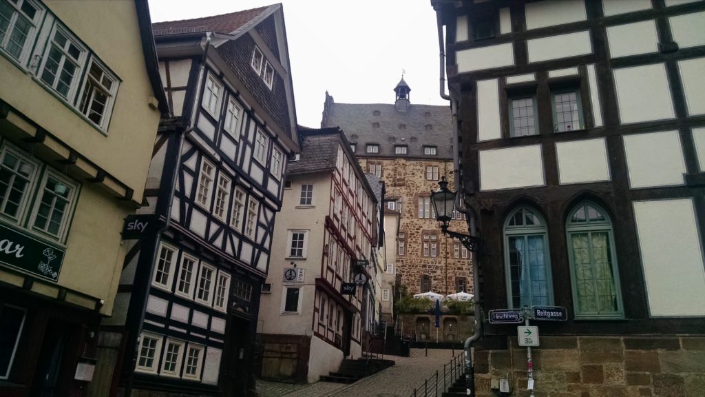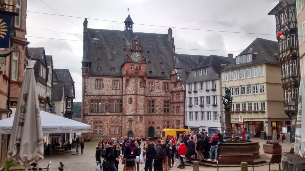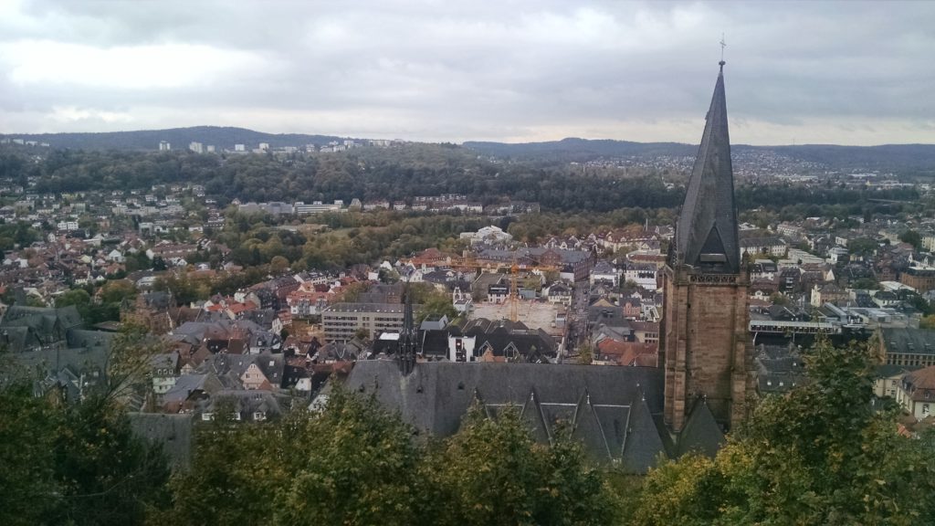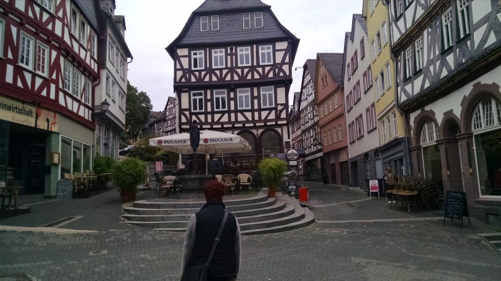 10.10.17 Um 8:30 Uhr ist draussen Randale mit Rasenmähern, Pustern und Freischneider. Trotzdem sind wir erst um 11 auf der B3 Richtung Marburg. In Marburg ist noch viel Platz. Nach dem Mittagessen laufen wir in die Altstadt.