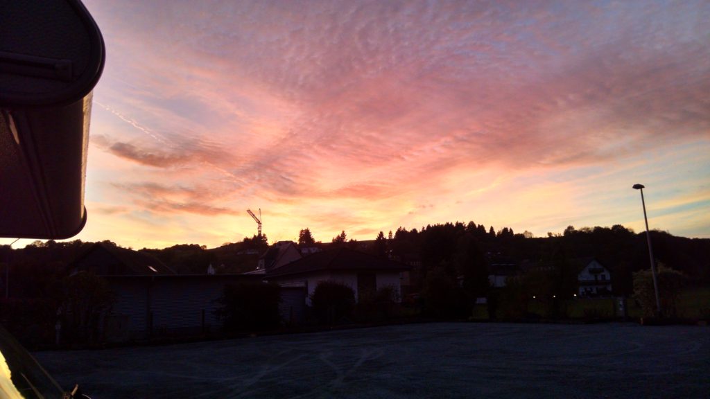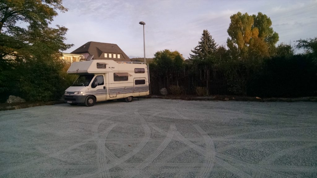 12.10.17 Wir beschliessen Wetzlar zu verlassen, der Gallus-Markt verspricht viel Lärm in der Nacht; das Gelände ist ca. 500 m Luftlinie entfernt. Also auf nach Weilmünster. Leider klappt der Termin mit Thomas nicht, der Ford ist fast umsonst mitgekommen. Obwohl, Tina sagt, es hat ihr gefallen. Ein super Verbrauch: nur 10,3 l/100 km. In Weilmünster versperrt ein Bagger die Zufahrt zum Stellplatz. Eigentlich ist er bis zum 14. geschlossen. Nachdem die Arbeiter den jungfräulichen Platz fotografiert haben, dürfen wir drauf – Glück gehabt.