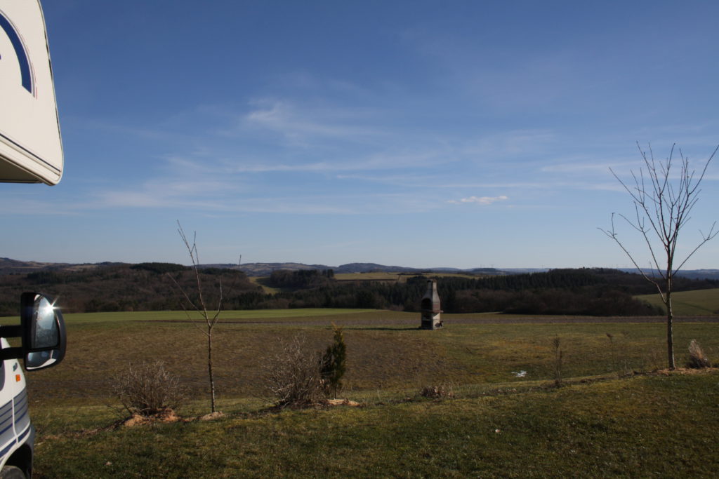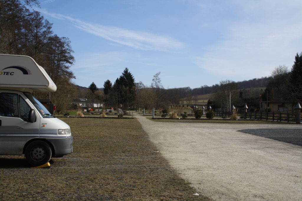 Wir sind ganz gemütlich die B270 zum Stellplatz Höhenblick in Oberbrombach gefahren und dort um 15 Uhr angekommen. So war noch genug Zeit, zu einem Geocache in 1 km zu wandern.