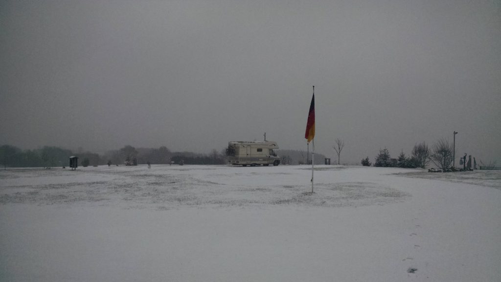 Um 10:30 Uhr mit Tina in Kleefeld getroffen und noch die Sachen umgeladen. Dann ganz gemächlich auf die A7 Richtung Süden. Grobes Ziel: Marburg. Gelandet sind wir schließlich in Neukirchen auf dem Stellplatz Urbachtal. Ganz hinten stand ein Kastenwagen und kurz nach uns kam noch ein Wohnmobil. Spät abends noch ein Pickup mit Kabine, der den nächsten Morgen schon ganz früh weg war. Strom brauchte ich nicht bezahlen, da war noch genug auf den Dosen von den Vorgängern. Abends noch lecker Lammlachs und früh ins Bett. Sehr kalter Wind und Frost, so dass der Abwassertank nicht zu benutzen war. Nicht weiter tragisch, die Duschen sind hier sehr komfortabel. Bezahlt haben wir ca. 20 Euro.