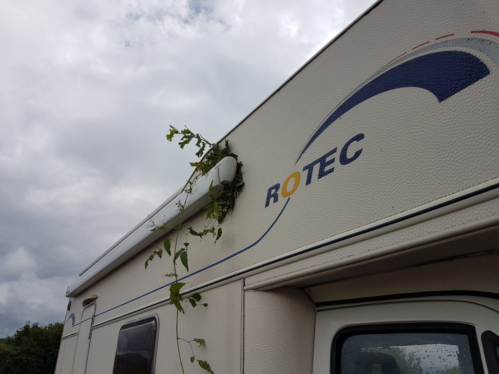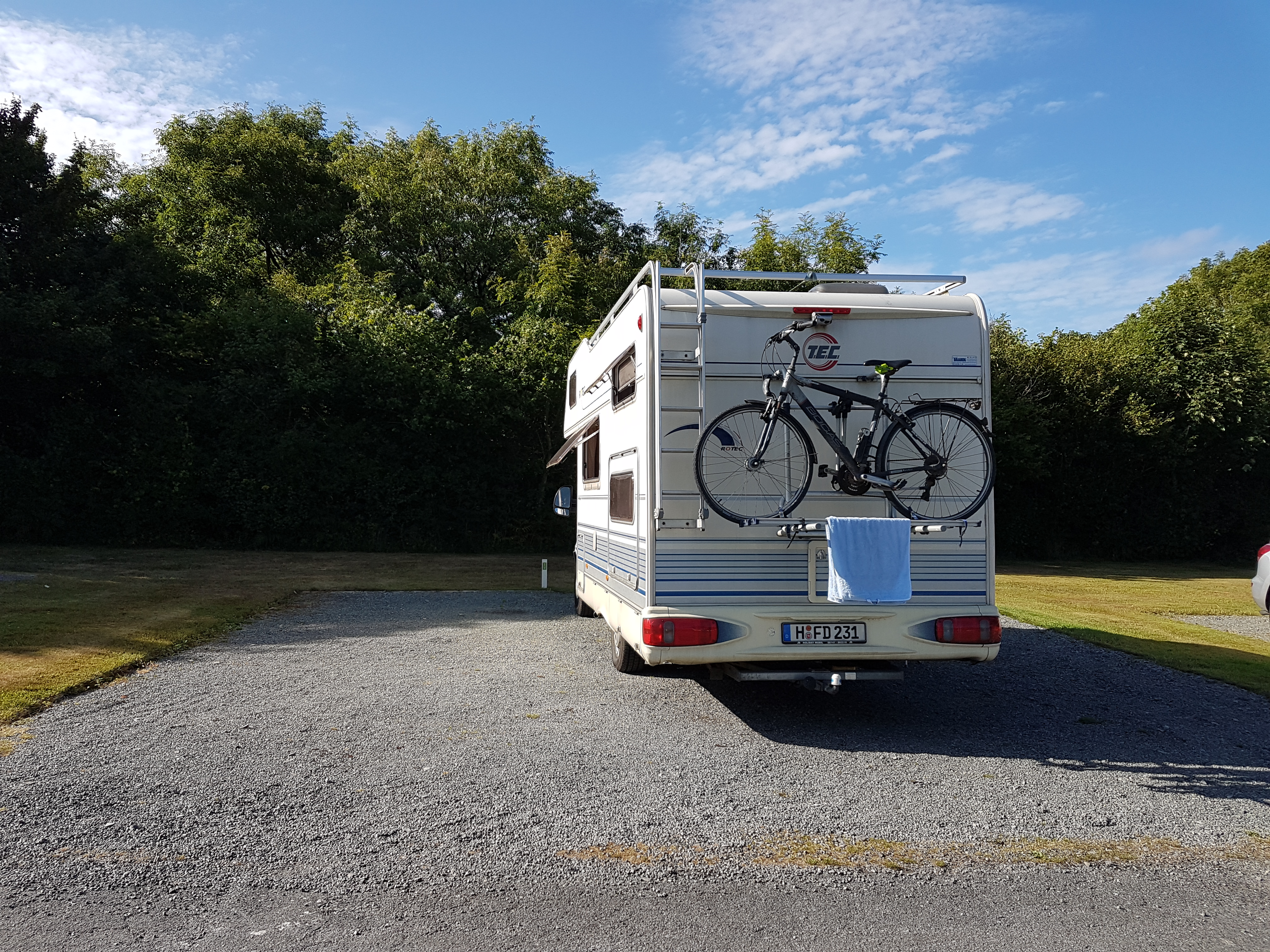 Tachostand 145102 km = 3734 km. Links fahren war mal wieder kein Problem, nur beim Rechtsabbiegen komme ich mit dem Denken nicht schnell genug nach. Ganz fies sind die teilweise sehr spitz zulaufenden Kreiseleinfahrten, da kann nach rechts überhaupt nichts sehen und muss blind auf Tina vertrauen. Ein einziges Mal war es haarig in einem Single-Track, da sind wir gefühlt 2 Meilen an keiner Ausweichstelle vorbeigekommen und prompt stand uns ein Transporter gegenüber. Der hatte aber wirklich nur 20 m zurückzufahren, hat er aber nur mit Problemen geschafft. Es war so eng, dass die Zweige oben am Womo entlang schabten. Ob ich die Schürze wieder schön bekomme, weiss ich noch nicht. Einmal lag ein Baum auf der Strasse, so dass wir wenden mussten, habe ich schneller als die PKW-Fahrer geschafft, nur die Halterung der Anhängerdose hat es ein wenig verbogen, war eine 2-spurige Strasse.