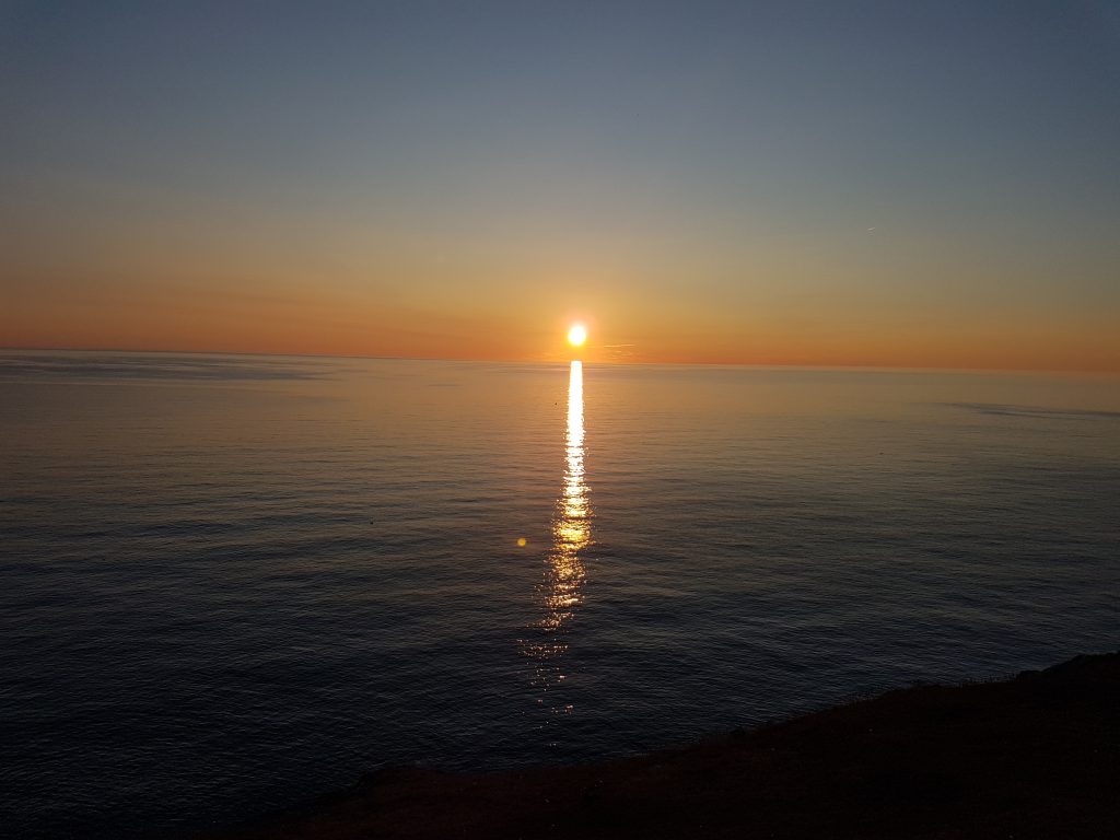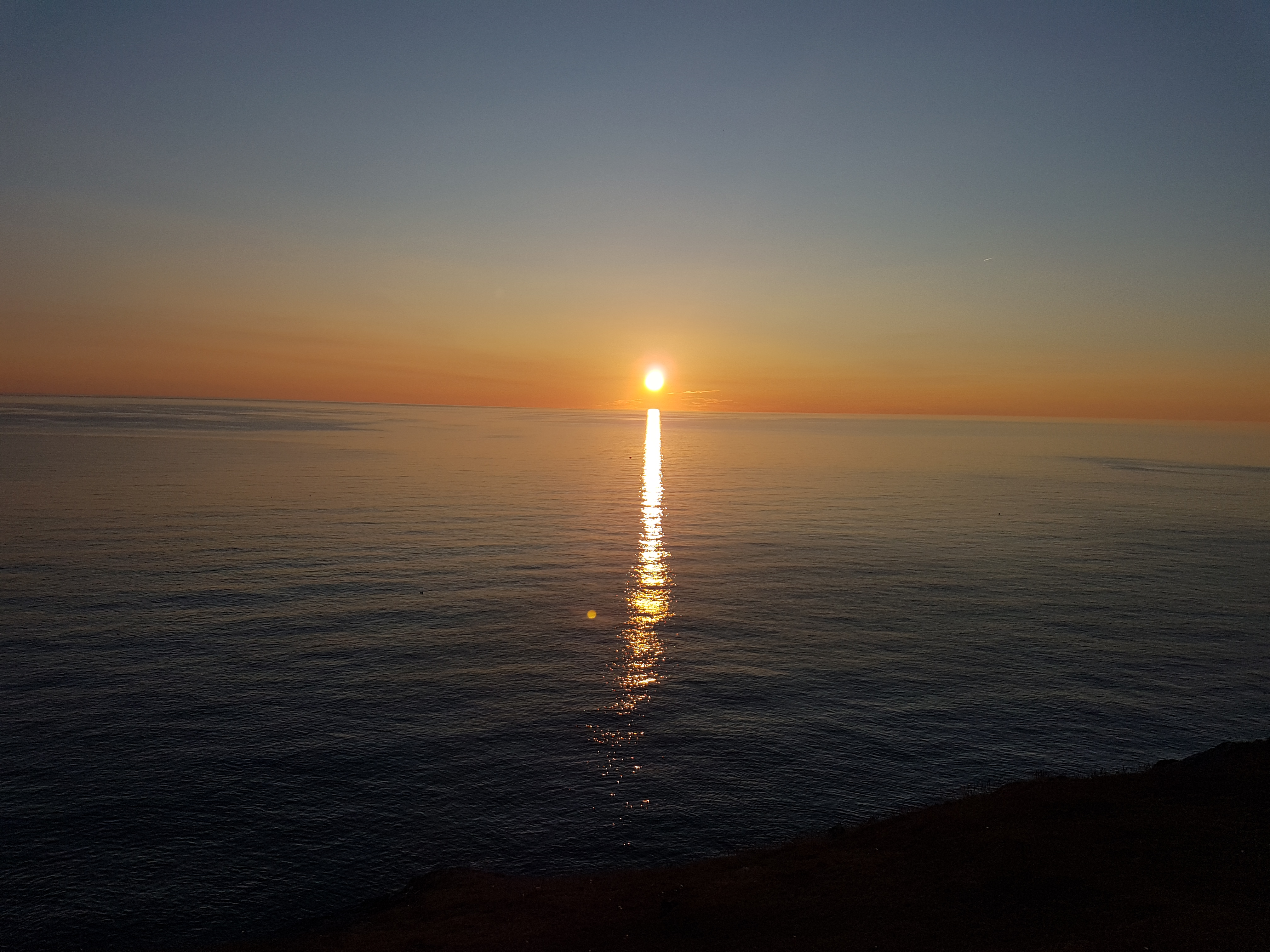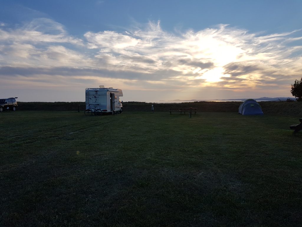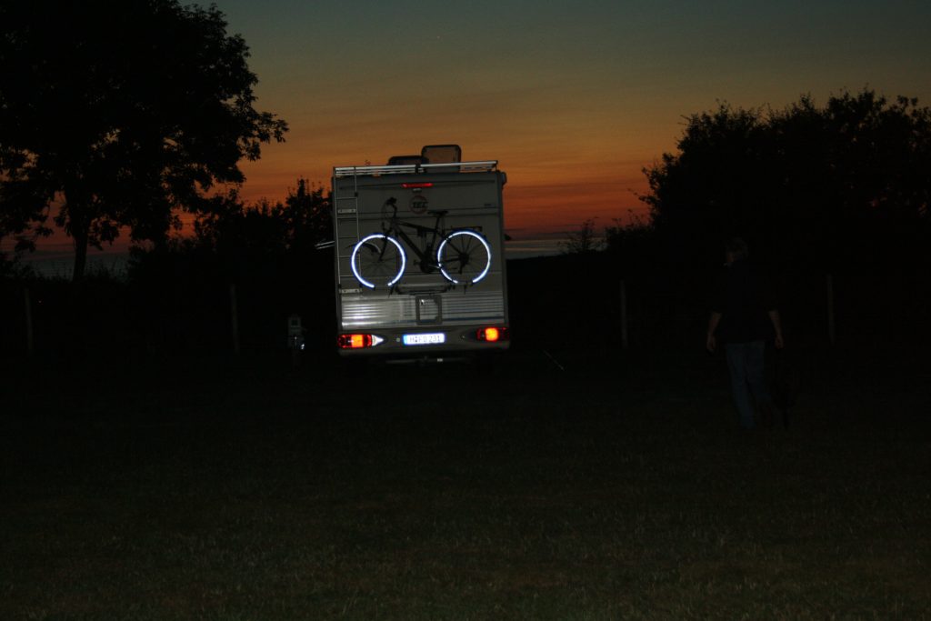 Um 21 Uhr römert der Mähdrescher immer noch direkt neben dem Campingplatz herum. Hört sich an wie ein Schiffsdiesel mit Lagerschaden. Ab und zu kommt noch ein Trecker mit Anhänger, um die Ernte abzuholen.