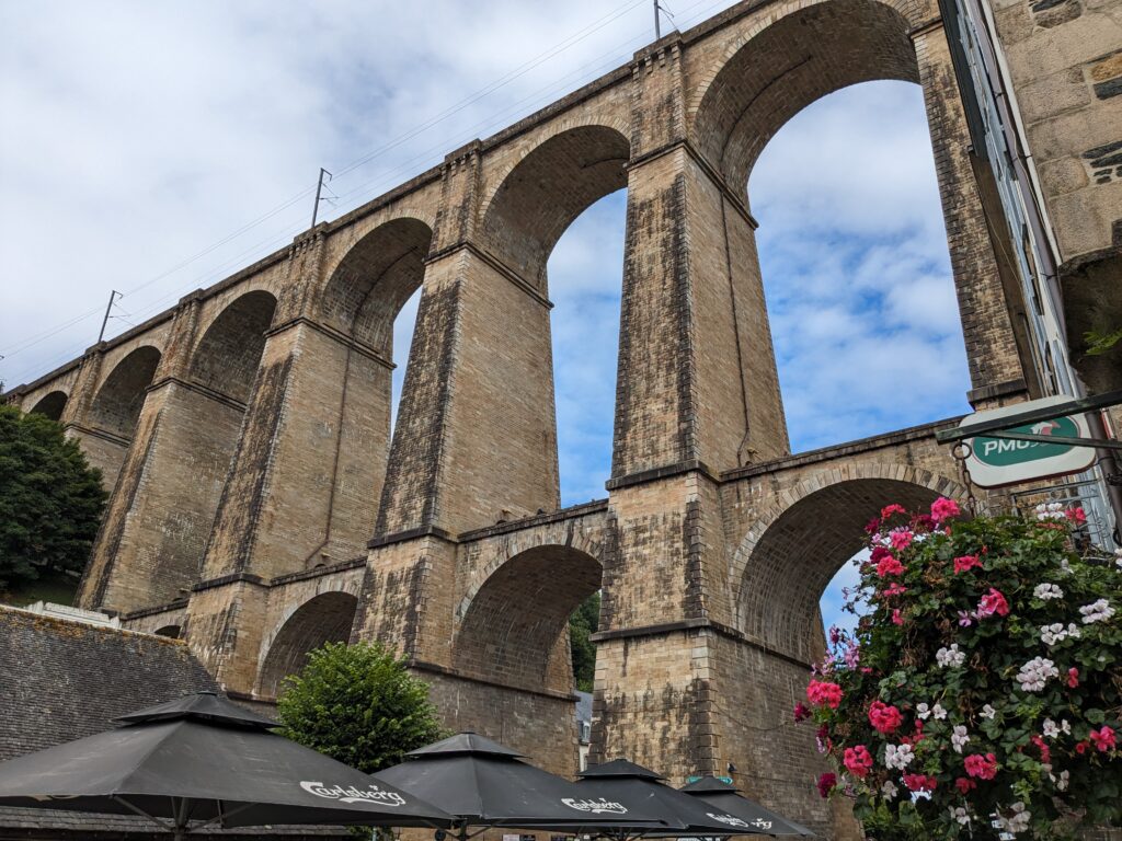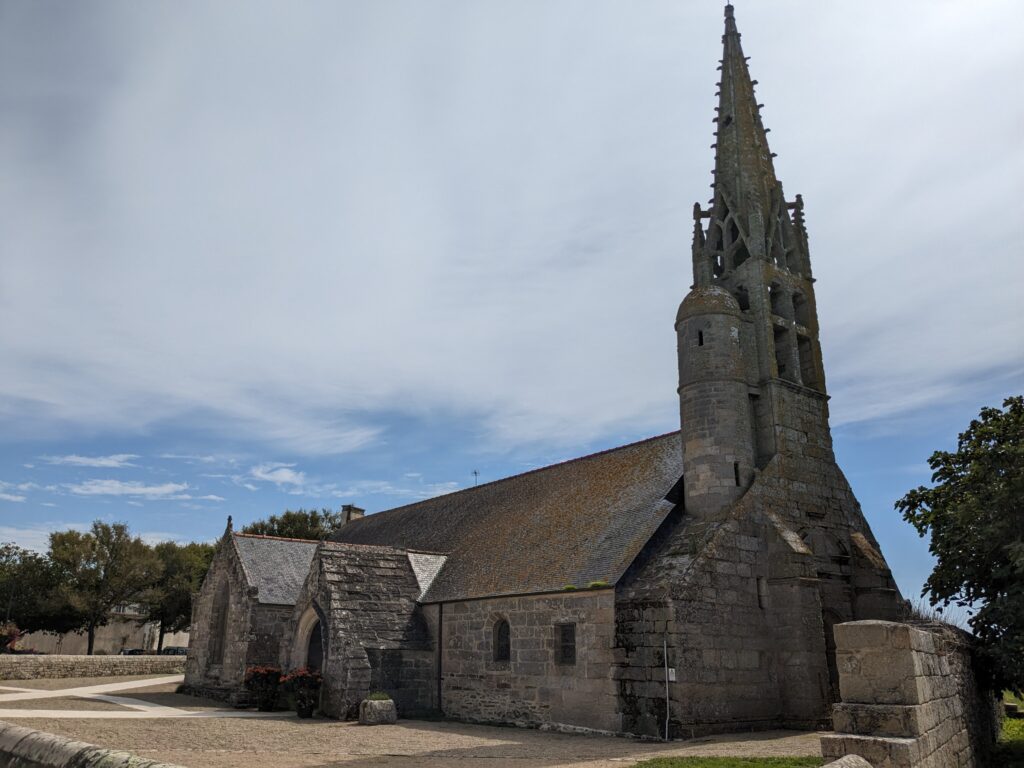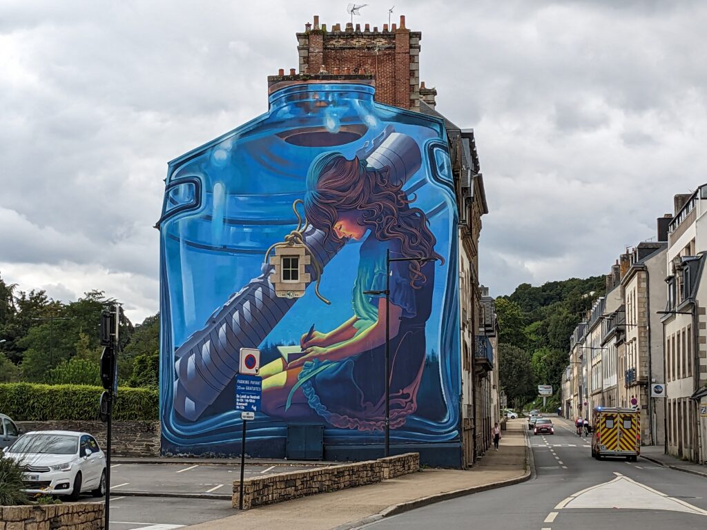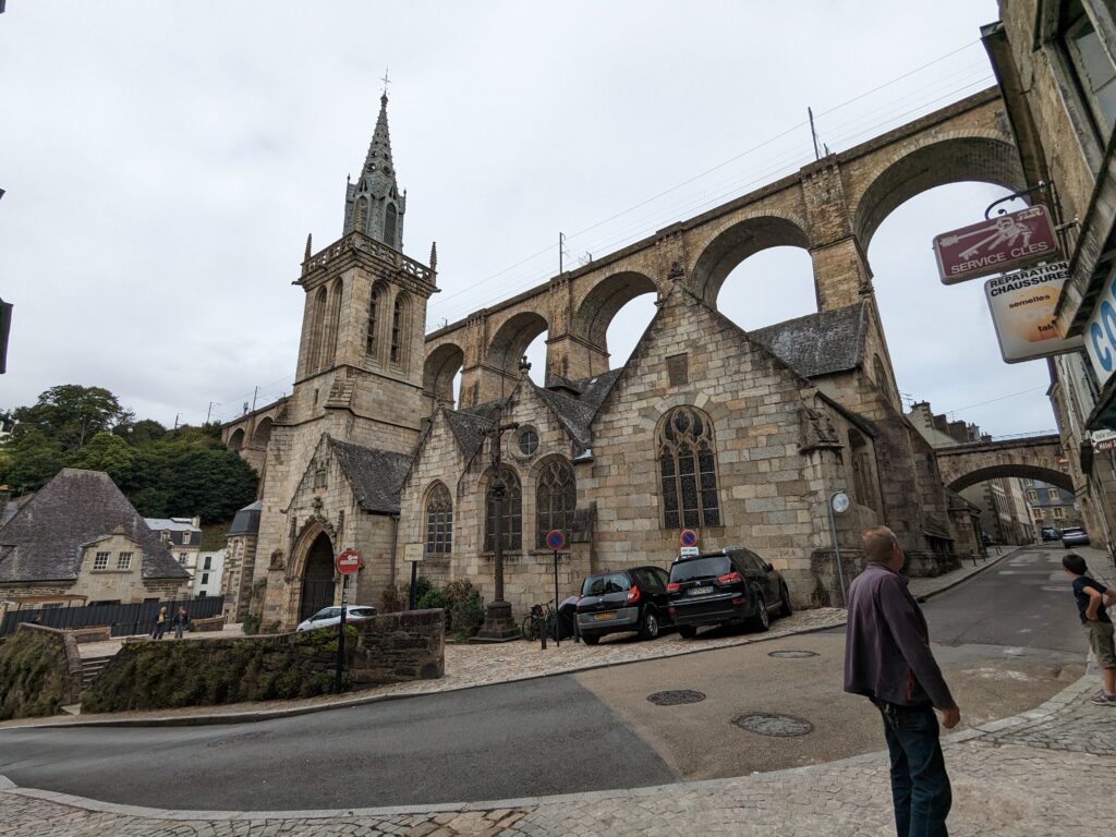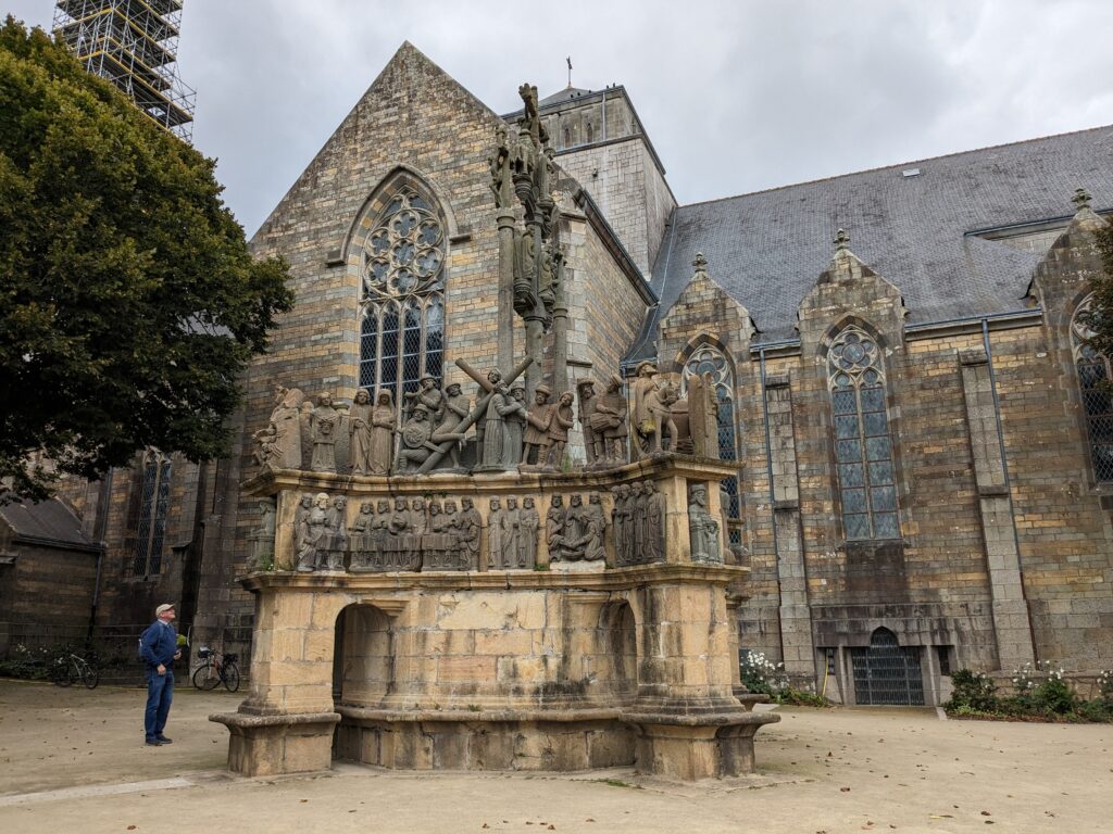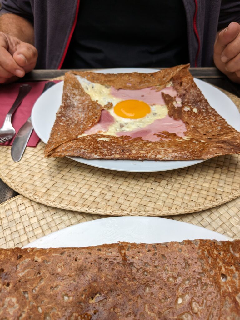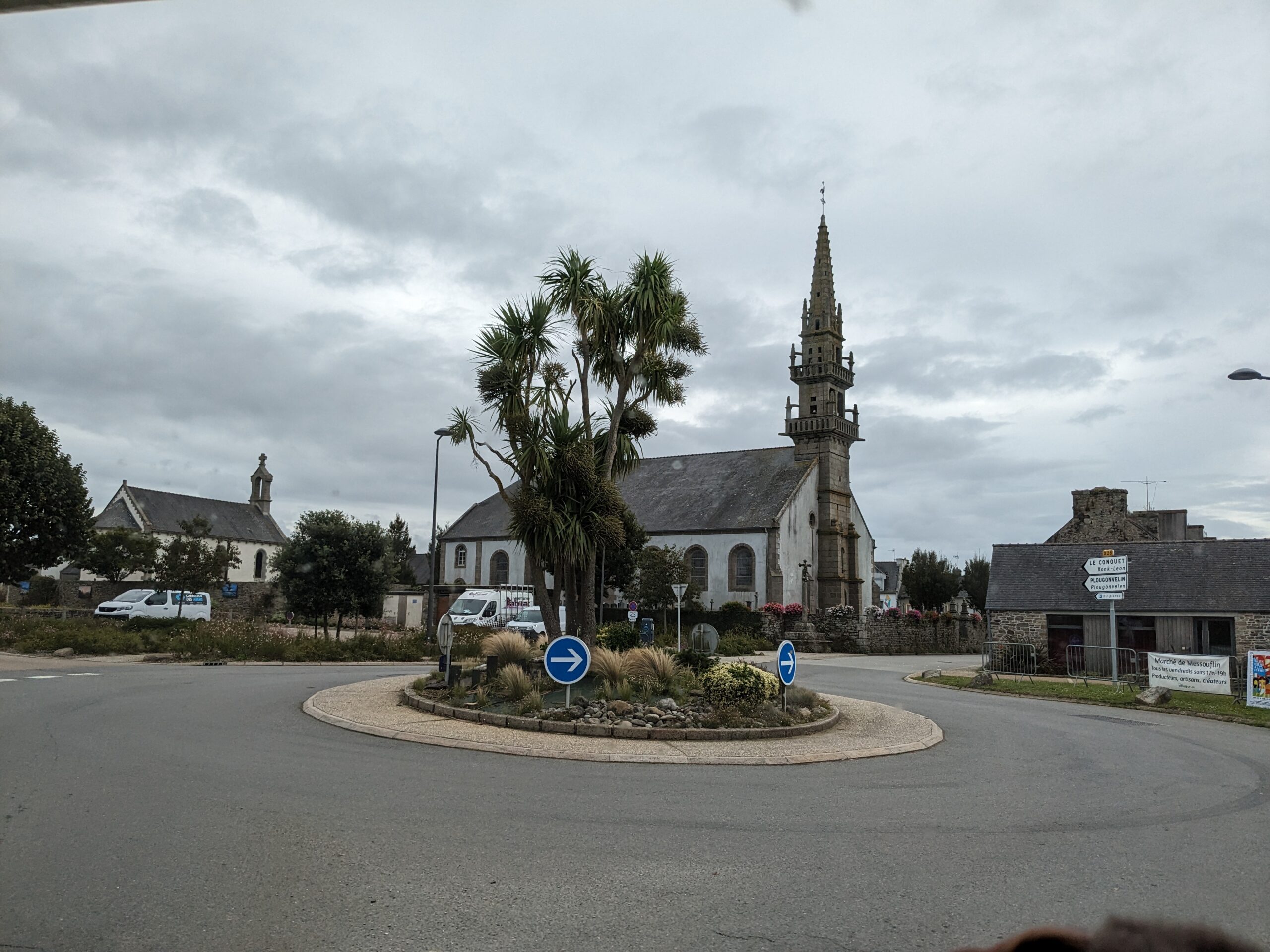 Nach dem Frühstück brechen wir auf nach Morlaix. Unterwegs ein kurzer Stopp in Berrien, um die Kirche zu fotografieren, dann 30 km und 40 Minuten später parken wir knapp 10 Gehminuten vom Zentrum entfernt auf einem für Wohnmobile reservierten Parkplatz – kostenlos: Frankreich! Eine Ver- und Entsorgung gibt es hier auch, mitten in der Stadt! Morlaix ist wirklich nett. Alte Häuser, eine schöne Kirche, (die erste mit Dach im Schiffsrumpfstil) und natürlich das berühmte Viadukt für die Eisenbahn. Nebenher gibt es noch einen Labcache und zum Mittag ein Galette und Breizh Cola – den typisch bretonischen Buchweizenpfannkuchen mit herzhafter Füllung. Lecker! Dann geht es zurück zum Wohnmobil. Unterwegs gibt es schöne Wandmalereien. Wir fahren noch einmal 26 km zum Stellplatz am Pointe de Roscoff. Hier steht noch eine Radtour um die kleine Halbinsel und noch ein Labcache auf dem Programm. Danach radeln wir noch nach Santec, um Baguette zu kaufen! Ist gerade aus. Wir müssen 12 Min warten, dann gibt es ganz frisches, Abends um 19:00.