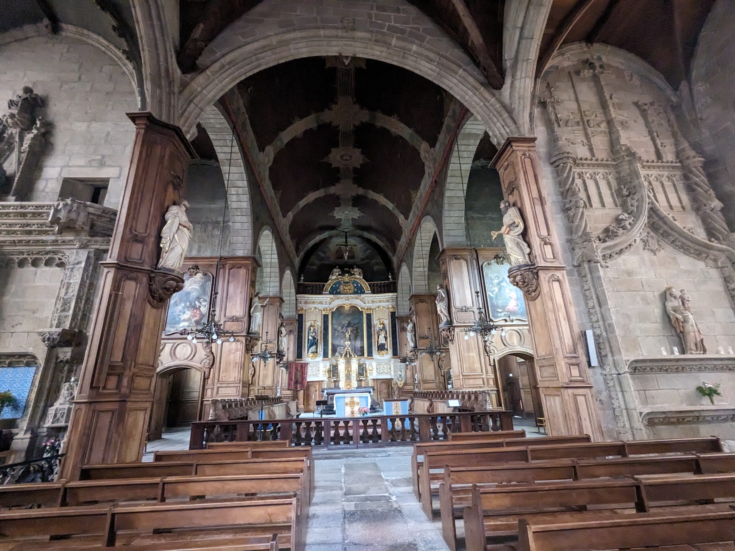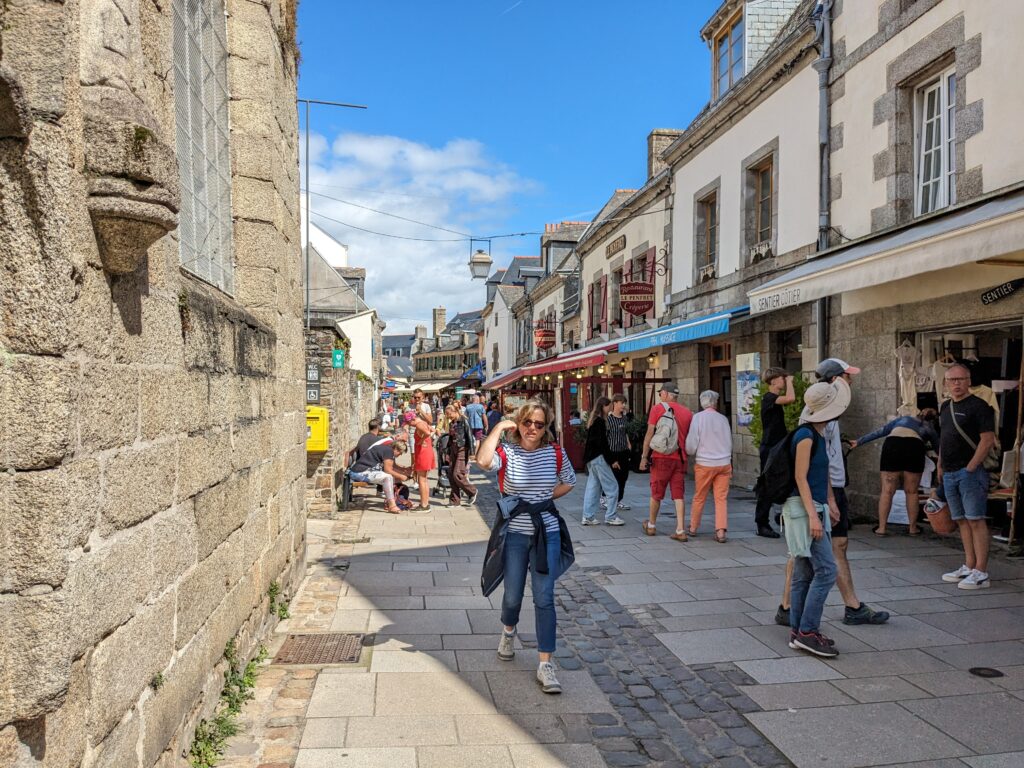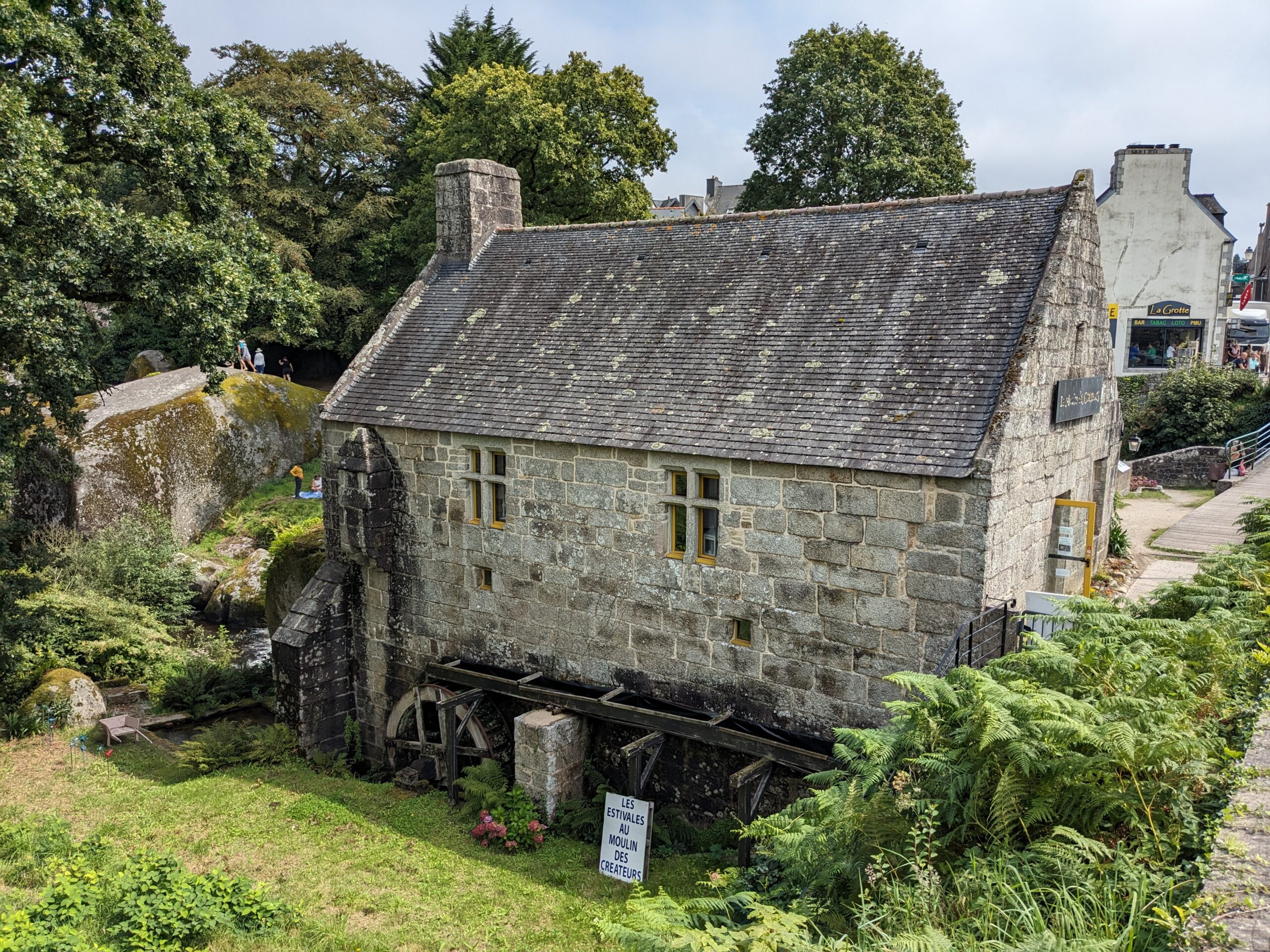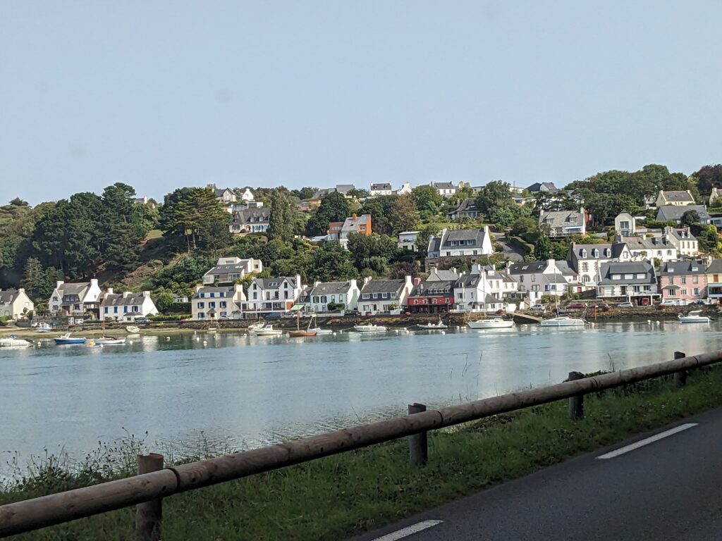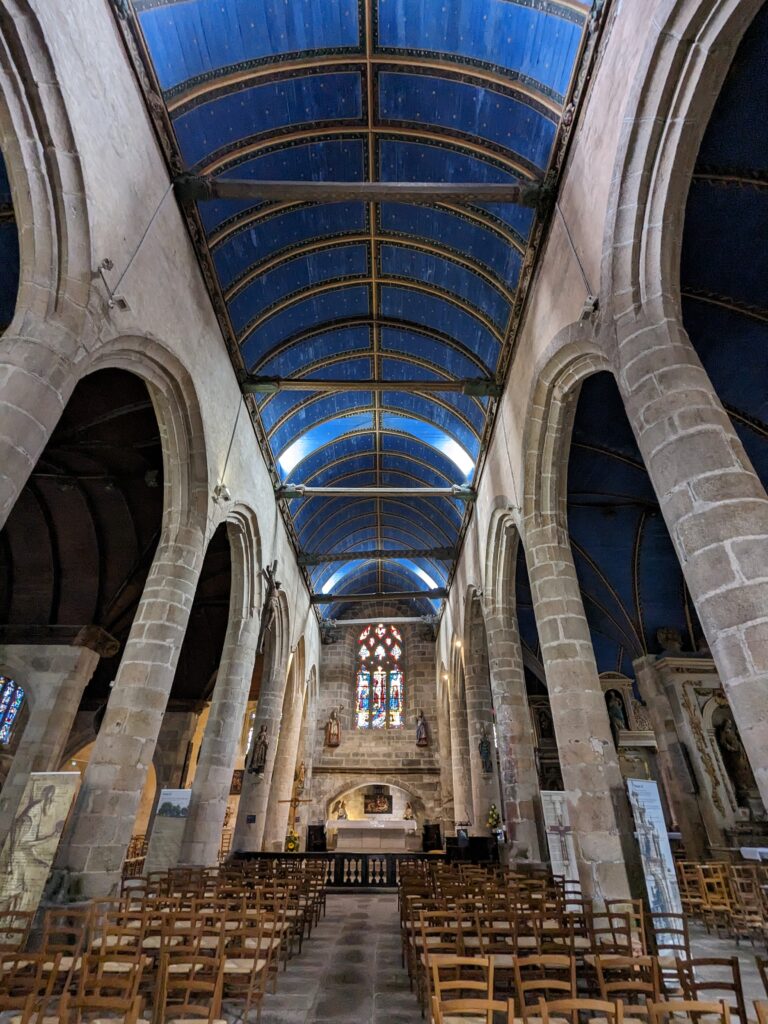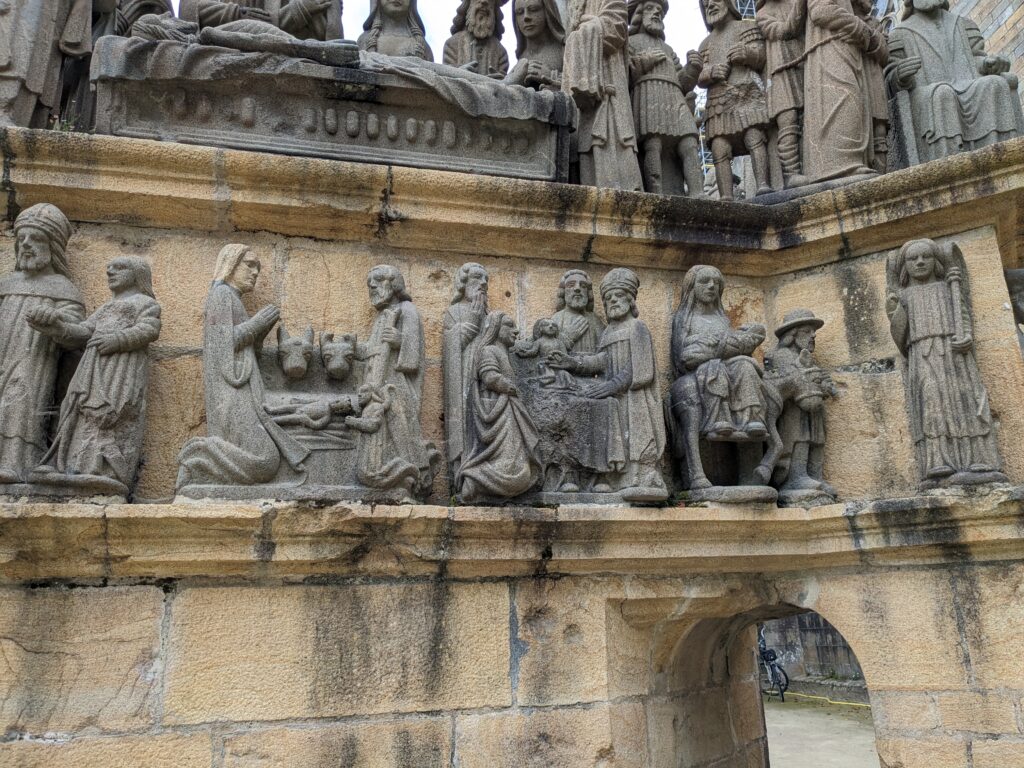 Nach dem Frühstück brechen wir auf nach Morlaix. Unterwegs ein kurzer Stopp in Berrien, um die Kirche zu fotografieren, dann 30 km und 40 Minuten später parken wir knapp 10 Gehminuten vom Zentrum entfernt auf einem für Wohnmobile reservierten Parkplatz – kostenlos: Frankreich! Eine Ver- und Entsorgung gibt es hier auch, mitten in der Stadt! Morlaix ist wirklich nett. Alte Häuser, eine schöne Kirche, (die erste mit Dach im Schiffsrumpfstil) und natürlich das berühmte Viadukt für die Eisenbahn. Nebenher gibt es noch einen Labcache und zum Mittag ein Galette und Breizh Cola – den typisch bretonischen Buchweizenpfannkuchen mit herzhafter Füllung. Lecker! Dann geht es zurück zum Wohnmobil. Unterwegs gibt es schöne Wandmalereien. Wir fahren noch einmal 26 km zum Stellplatz am Pointe de Roscoff. Hier steht noch eine Radtour um die kleine Halbinsel und noch ein Labcache auf dem Programm. Danach radeln wir noch nach Santec, um Baguette zu kaufen! Ist gerade aus. Wir müssen 12 Min warten, dann gibt es ganz frisches, Abends um 19:00.