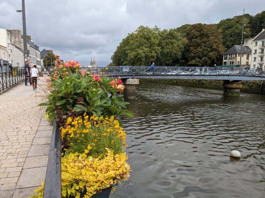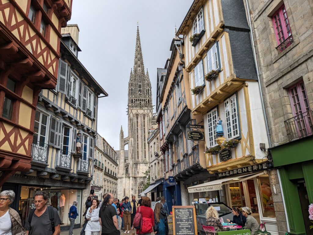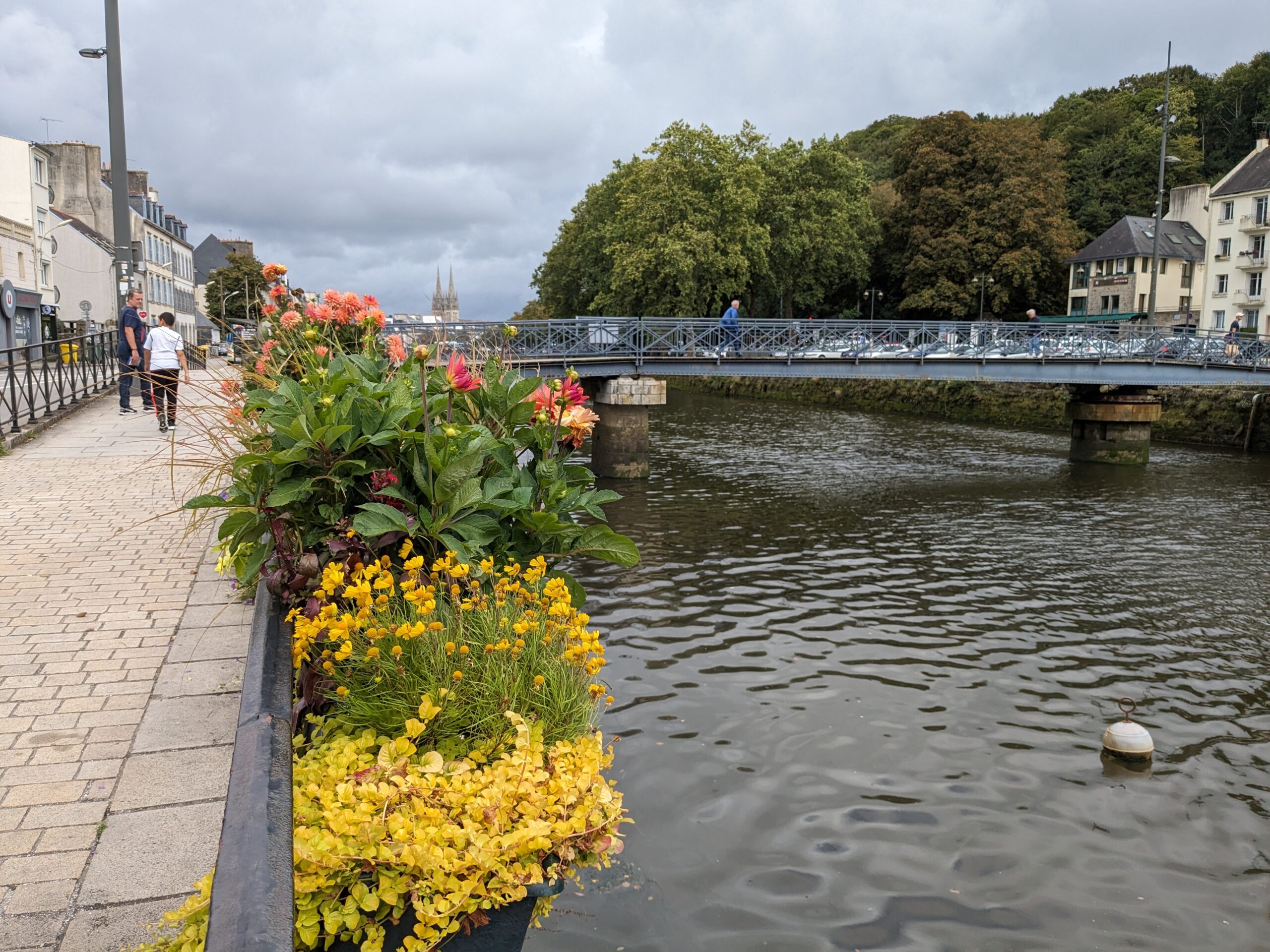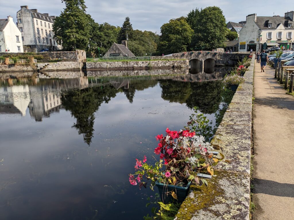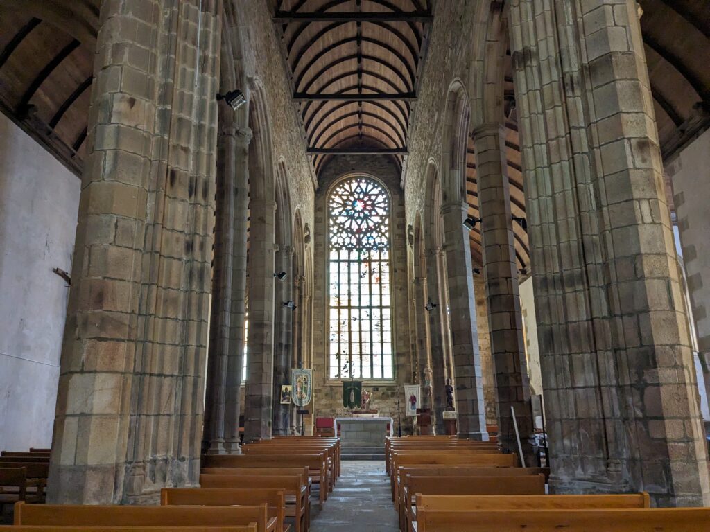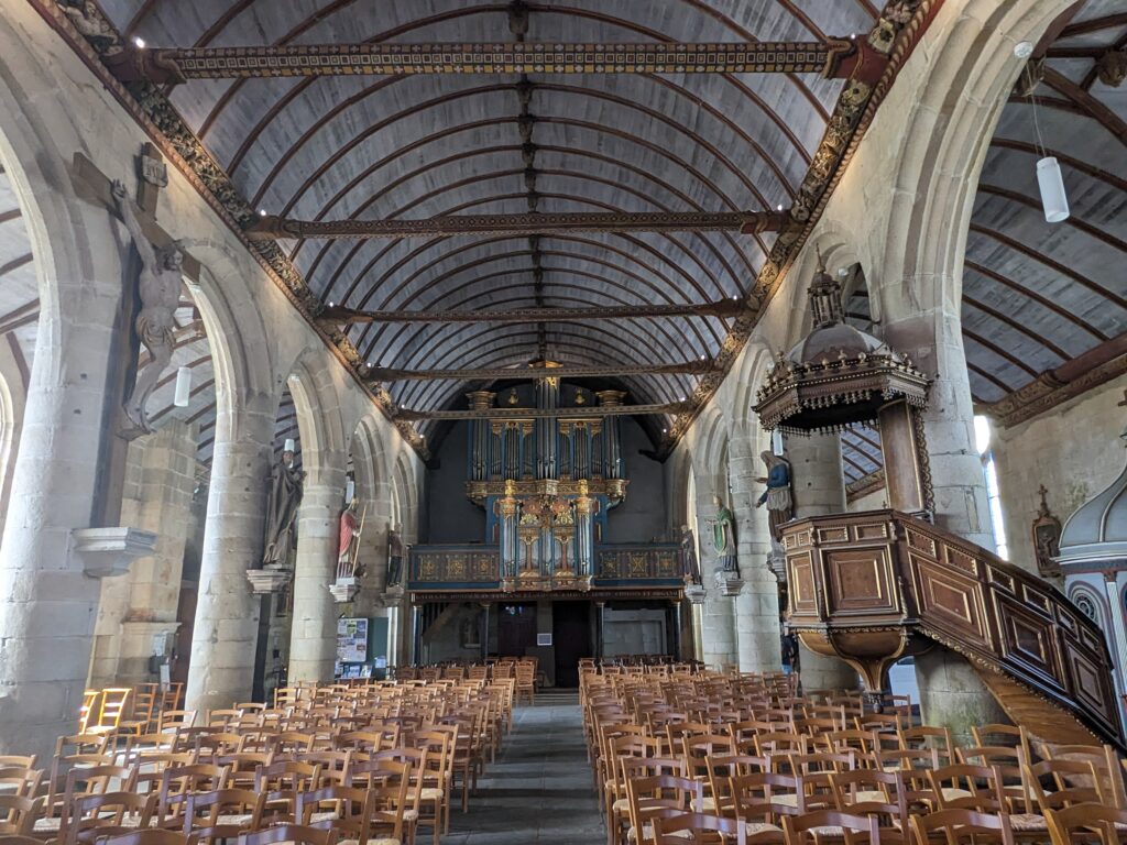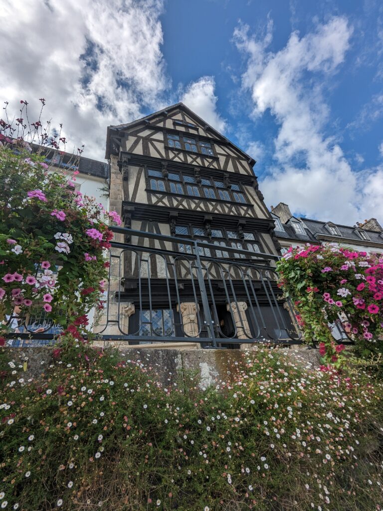 Nach dem Frühstück brechen wir auf nach Morlaix. Unterwegs ein kurzer Stopp in Berrien, um die Kirche zu fotografieren, dann 30 km und 40 Minuten später parken wir knapp 10 Gehminuten vom Zentrum entfernt auf einem für Wohnmobile reservierten Parkplatz – kostenlos: Frankreich! Eine Ver- und Entsorgung gibt es hier auch, mitten in der Stadt! Morlaix ist wirklich nett. Alte Häuser, eine schöne Kirche, (die erste mit Dach im Schiffsrumpfstil) und natürlich das berühmte Viadukt für die Eisenbahn. Nebenher gibt es noch einen Labcache und zum Mittag ein Galette und Breizh Cola – den typisch bretonischen Buchweizenpfannkuchen mit herzhafter Füllung. Lecker! Dann geht es zurück zum Wohnmobil. Unterwegs gibt es schöne Wandmalereien. Wir fahren noch einmal 26 km zum Stellplatz am Pointe de Roscoff. Hier steht noch eine Radtour um die kleine Halbinsel und noch ein Labcache auf dem Programm. Danach radeln wir noch nach Santec, um Baguette zu kaufen! Ist gerade aus. Wir müssen 12 Min warten, dann gibt es ganz frisches, Abends um 19:00.
