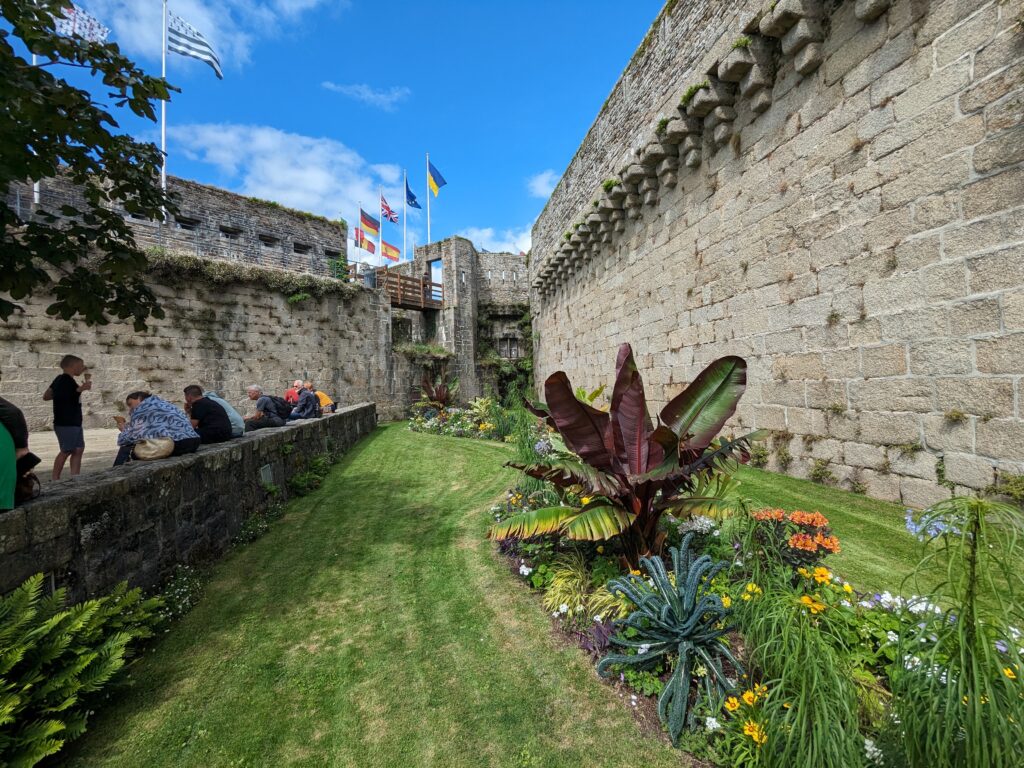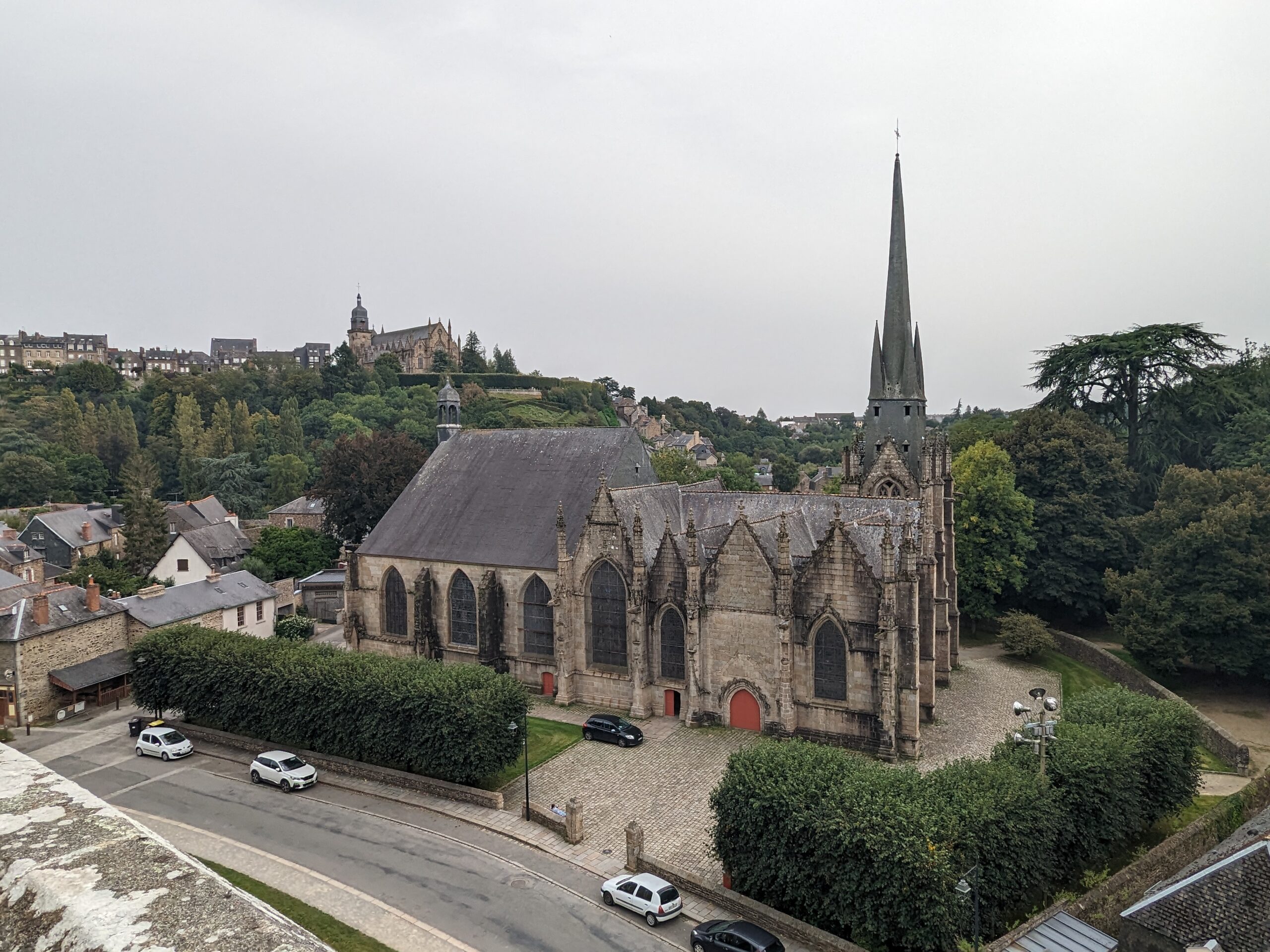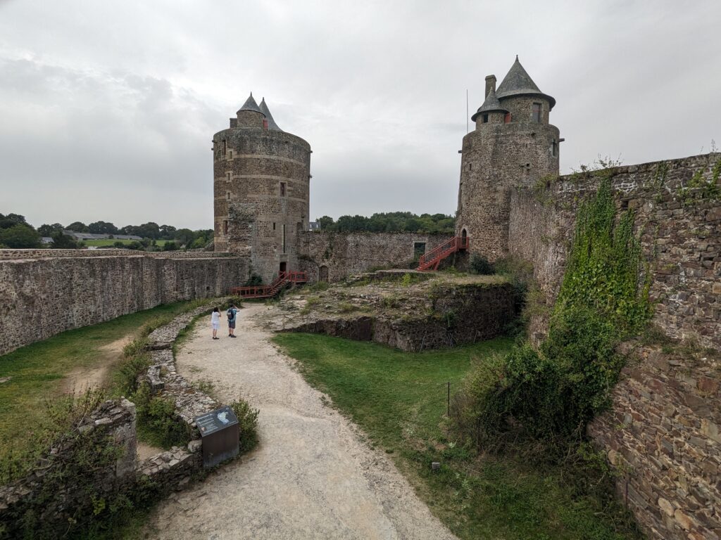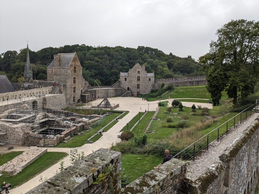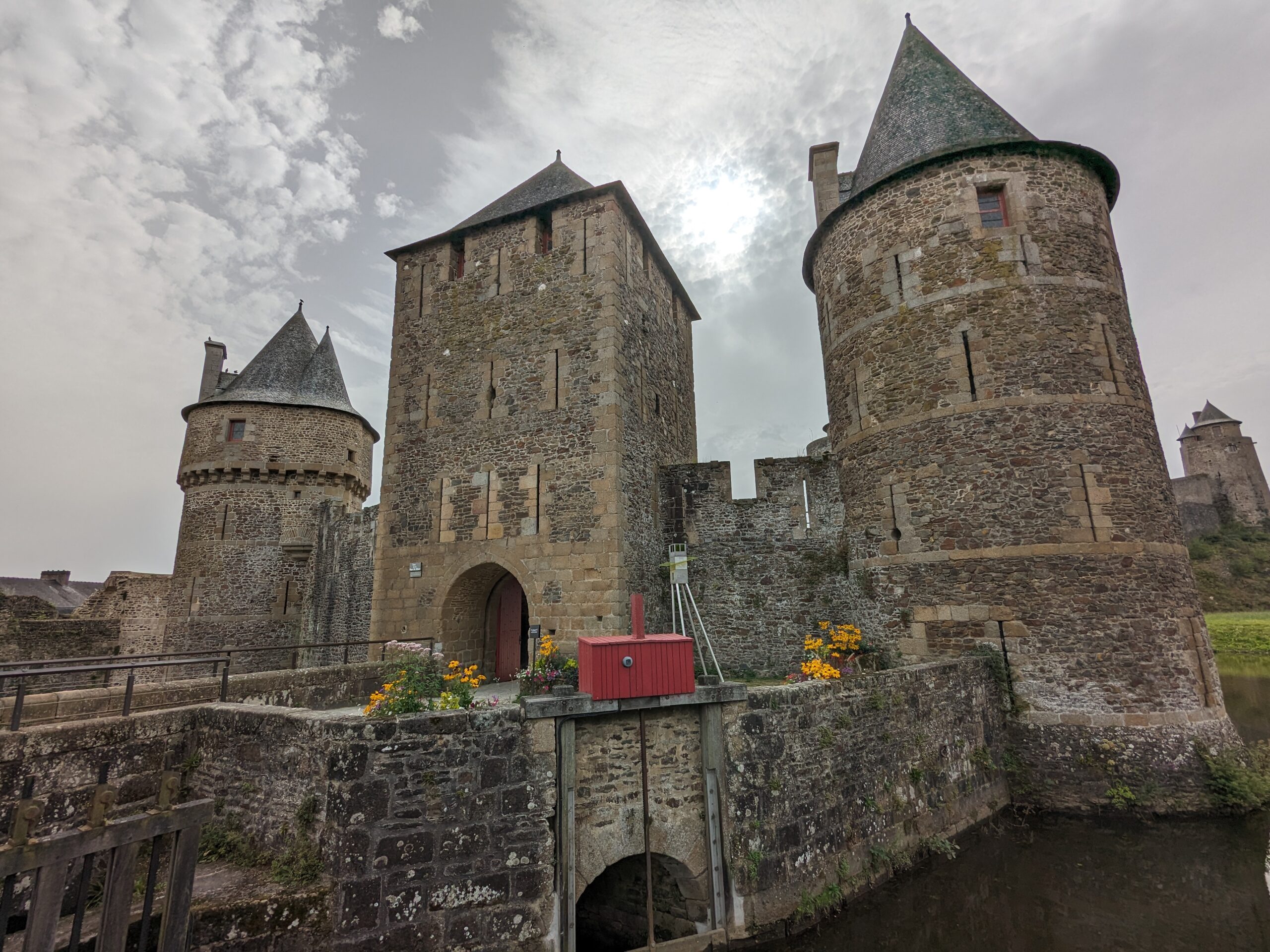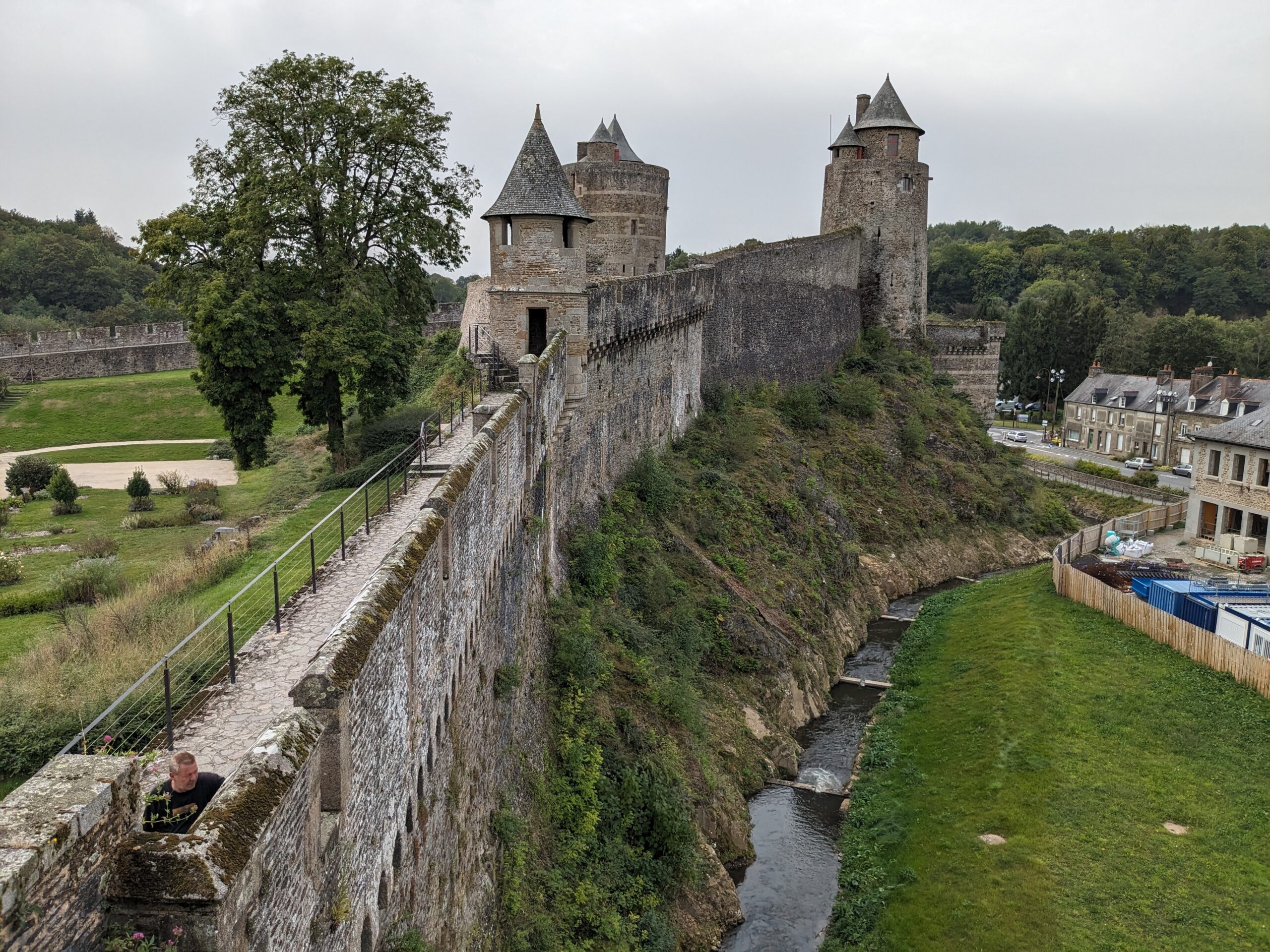 Nach einem letzten Frühstück mit Traumaussicht, sogar mit Wasser, nehmen wir schweren Herzens Abschied vom Meer. Vor uns liegen 230 km. Unser letztes Ziel in der Bretagne ist Fougères. Hier gibt es einen netten Camping Municipal (21,-€) und eine Burg (9,-€/P.). Heute ist es mit 31° und hoher Luftfeuchtigkeit fast unerträglich. Dazu spinnt Google und schickt uns in Fougères erstmal kreuz und quer. Als wir endlich den Campingplatz erreichen, ist dort eine lange Schlange vor uns, die erstmal abgefertigt werden muss. Nach einem Espresso schwingen wir uns trotz der Hitze auf die Räder, um das Chateau zu suchen. Leider ist Google immer noch bockig, aber schließlich finden wir es doch und starten die Besichtigung. Danach noch die 4 Wasserräder, (eins erzeugt den Strom für das Museum) und die Kirche Saint-Sulpice de Fougères, wieder mal mit tollen Buntglasfenstern. Dann haben wir hier endgültig genug geschwitzt und radeln zurück, um auf dem Campingplatz weiter zu schwitzen.