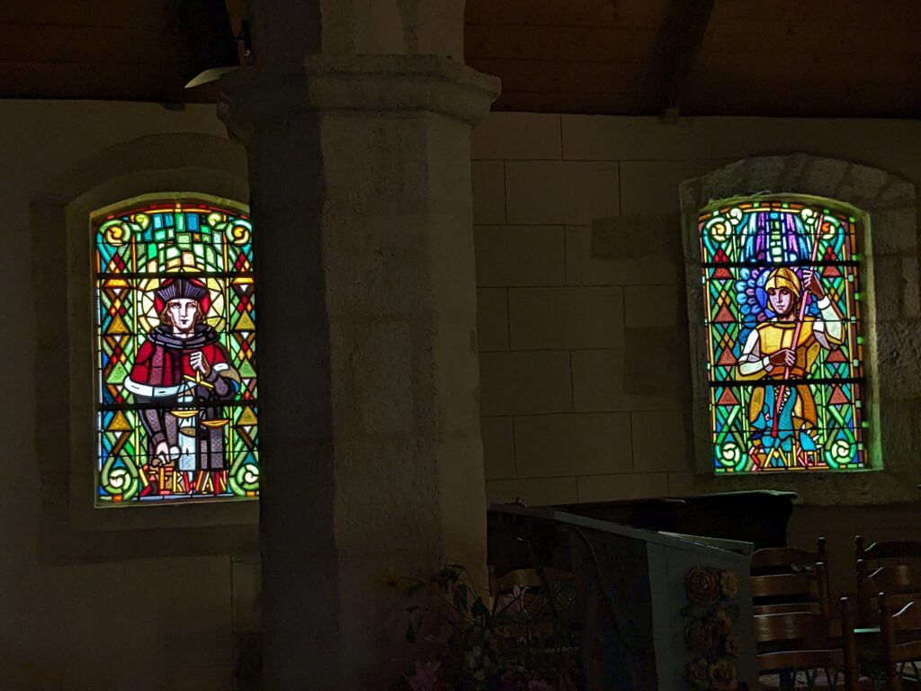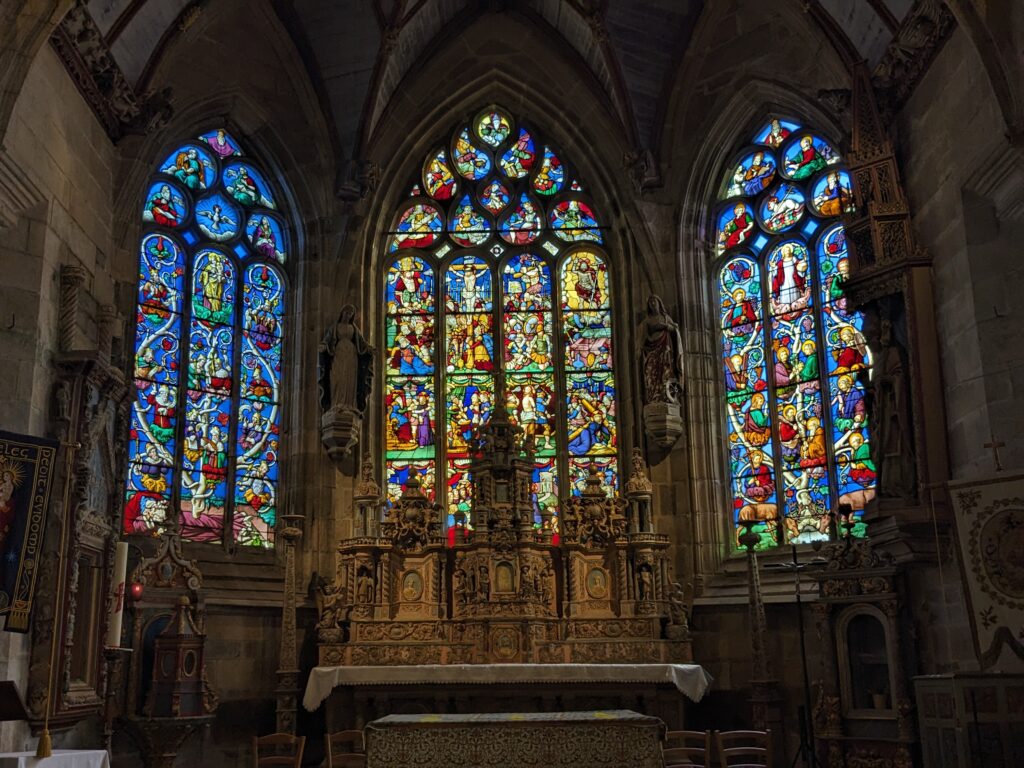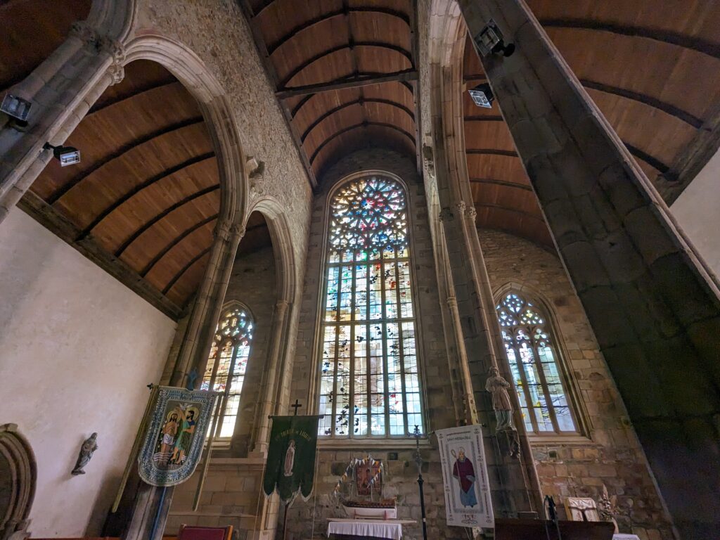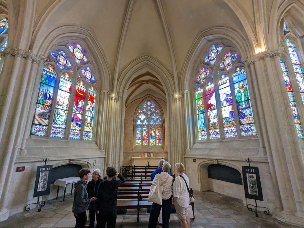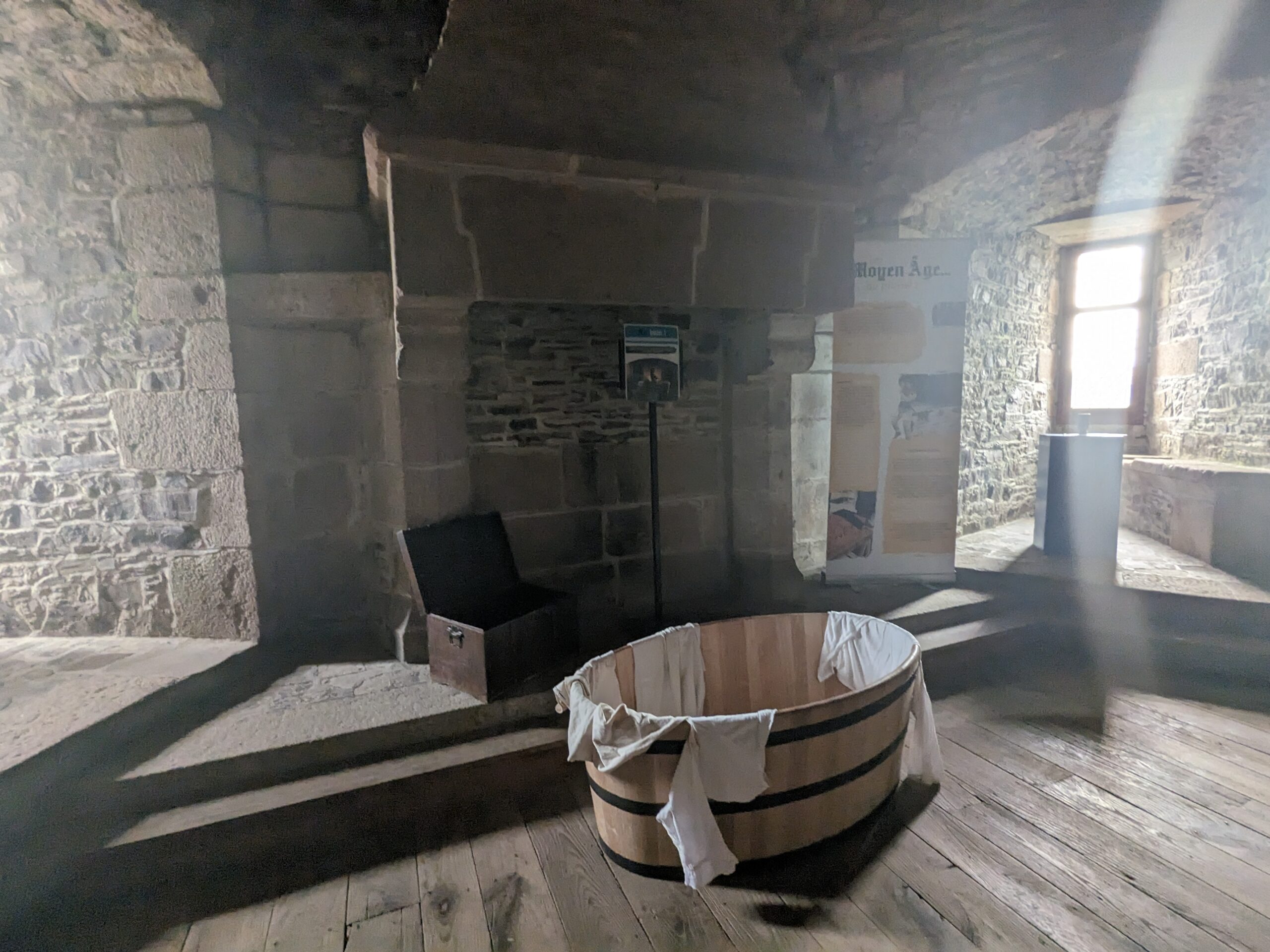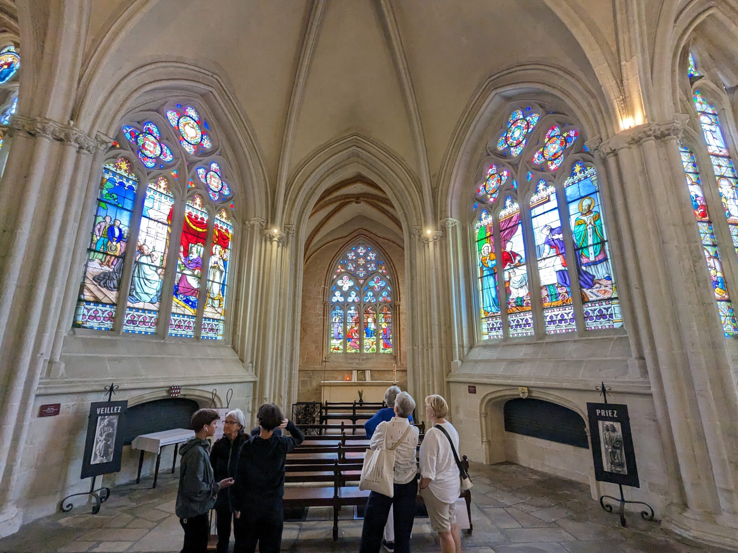 Nach einem letzten Frühstück mit Traumaussicht, sogar mit Wasser, nehmen wir schweren Herzens Abschied vom Meer. Vor uns liegen 230 km. Unser letztes Ziel in der Bretagne ist Fougères. Hier gibt es einen netten Camping Municipal (21,-€) und eine Burg (9,-€/P.). Heute ist es mit 31° und hoher Luftfeuchtigkeit fast unerträglich. Dazu spinnt Google und schickt uns in Fougères erstmal kreuz und quer. Als wir endlich den Campingplatz erreichen, ist dort eine lange Schlange vor uns, die erstmal abgefertigt werden muss. Nach einem Espresso schwingen wir uns trotz der Hitze auf die Räder, um das Chateau zu suchen. Leider ist Google immer noch bockig, aber schließlich finden wir es doch und starten die Besichtigung. Danach noch die 4 Wasserräder, (eins erzeugt den Strom für das Museum) und die Kirche Saint-Sulpice de Fougères, wieder mal mit tollen Buntglasfenstern. Dann haben wir hier endgültig genug geschwitzt und radeln zurück, um auf dem Campingplatz weiter zu schwitzen.