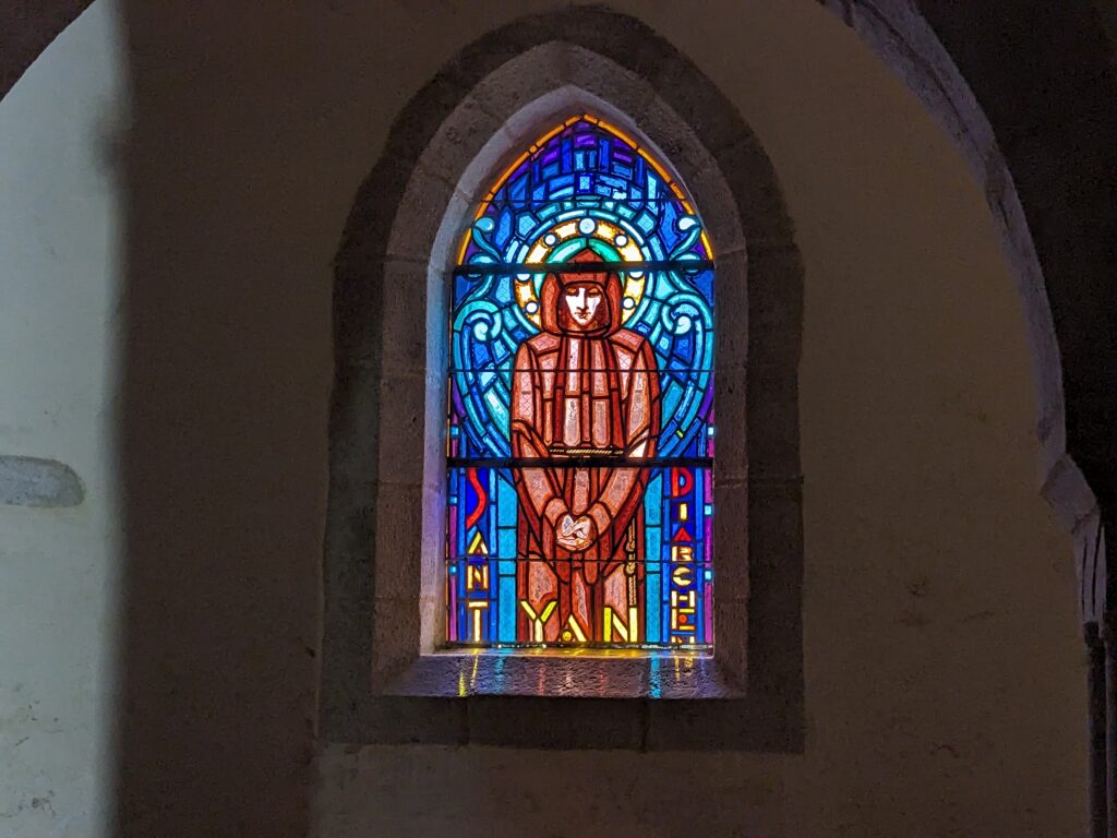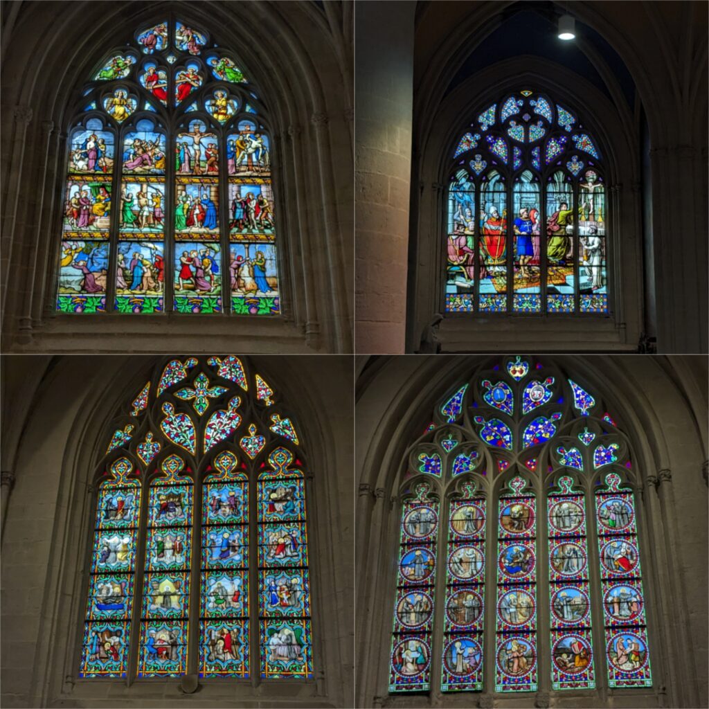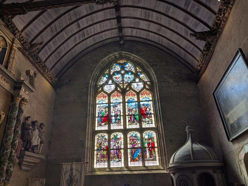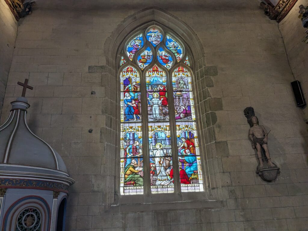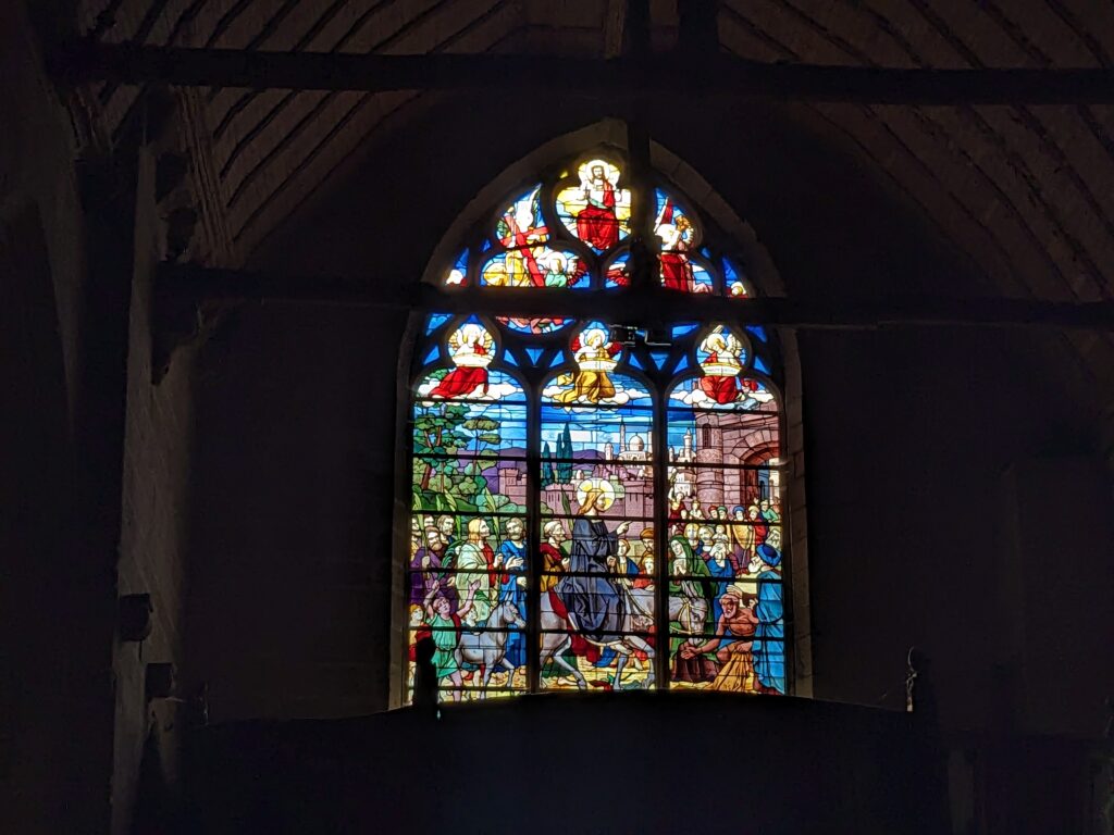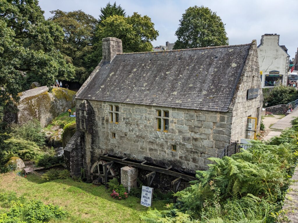Nach einem letzten Frühstück mit Traumaussicht, sogar mit Wasser, nehmen wir schweren Herzens Abschied vom Meer. Vor uns liegen 230 km. Unser letztes Ziel in der Bretagne ist Fougères. Hier gibt es einen netten Camping Municipal (21,-€) und eine Burg (9,-€/P.). Heute ist es mit 31° und hoher Luftfeuchtigkeit fast unerträglich. Dazu spinnt Google und schickt uns in Fougères erstmal kreuz und quer. Als wir endlich den Campingplatz erreichen, ist dort eine lange Schlange vor uns, die erstmal abgefertigt werden muss. Nach einem Espresso schwingen wir uns trotz der Hitze auf die Räder, um das Chateau zu suchen. Leider ist Google immer noch bockig, aber schließlich finden wir es doch und starten die Besichtigung. Danach noch die 4 Wasserräder, (eins erzeugt den Strom für das Museum) und die Kirche Saint-Sulpice de Fougères, wieder mal mit tollen Buntglasfenstern. Dann haben wir hier endgültig genug geschwitzt und radeln zurück, um auf dem Campingplatz weiter zu schwitzen.