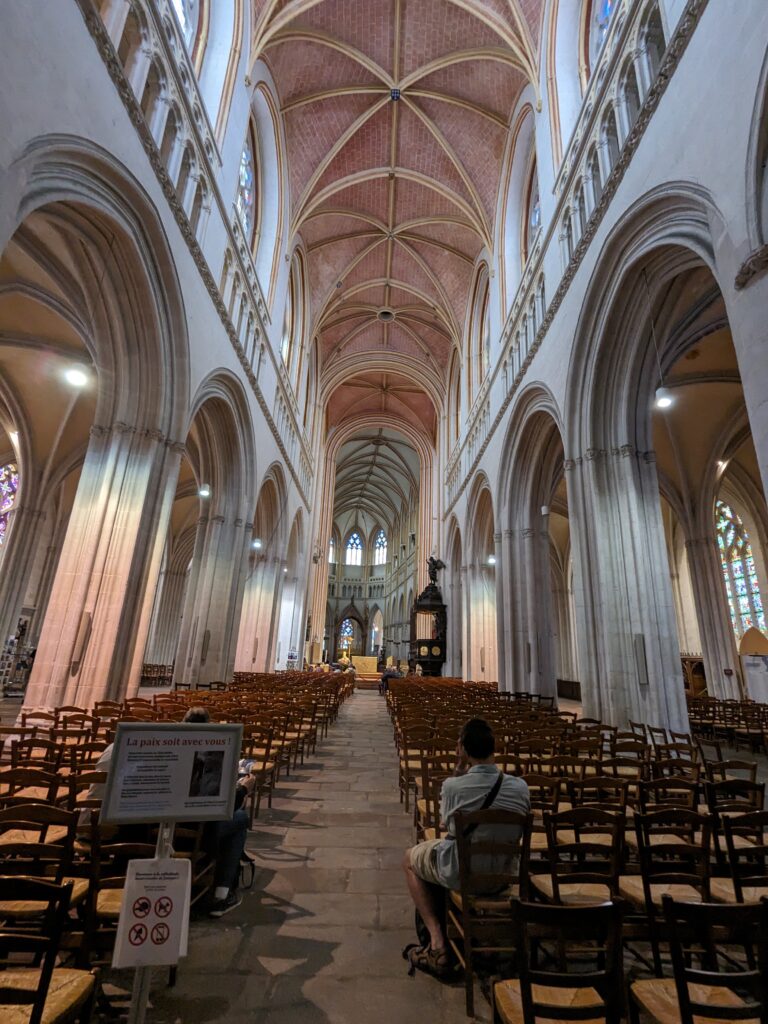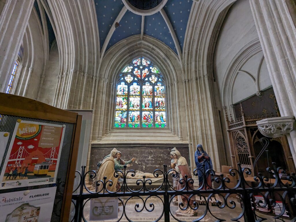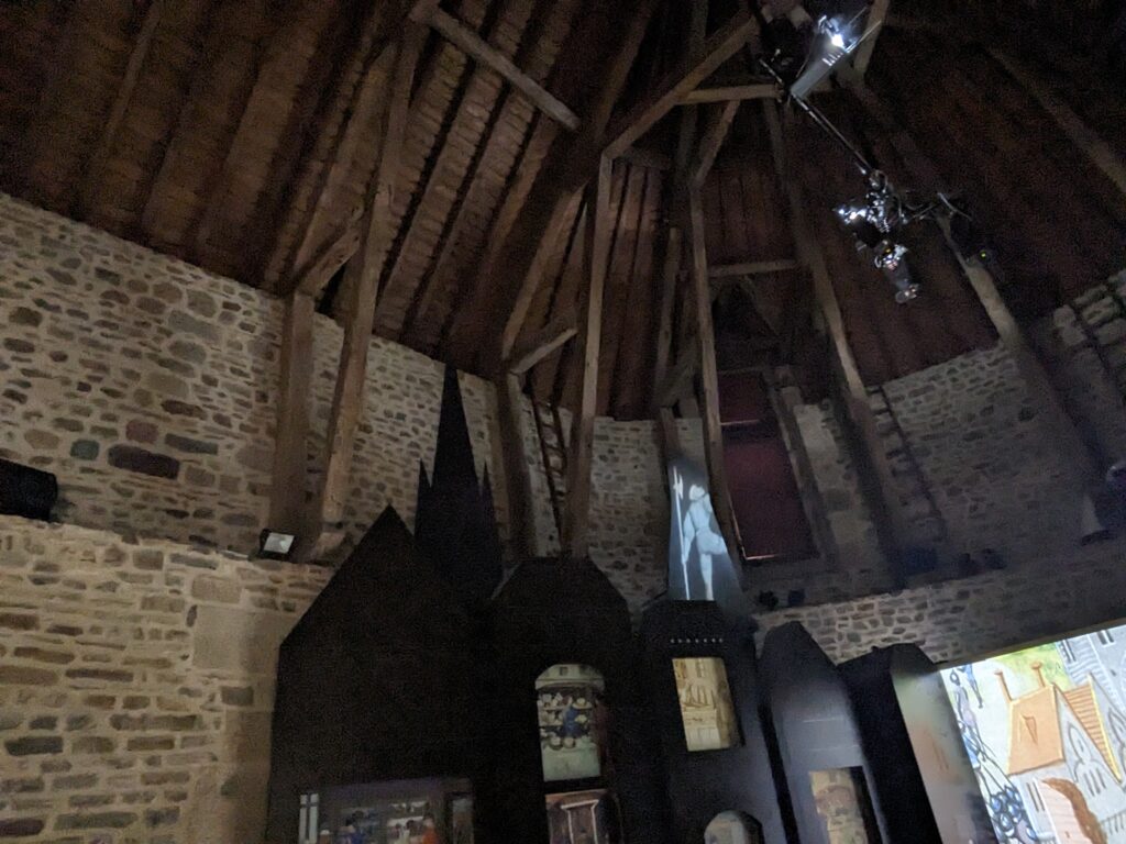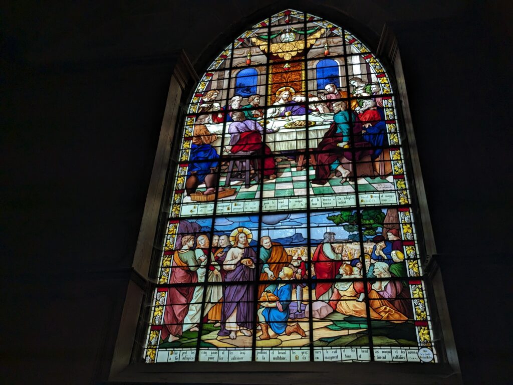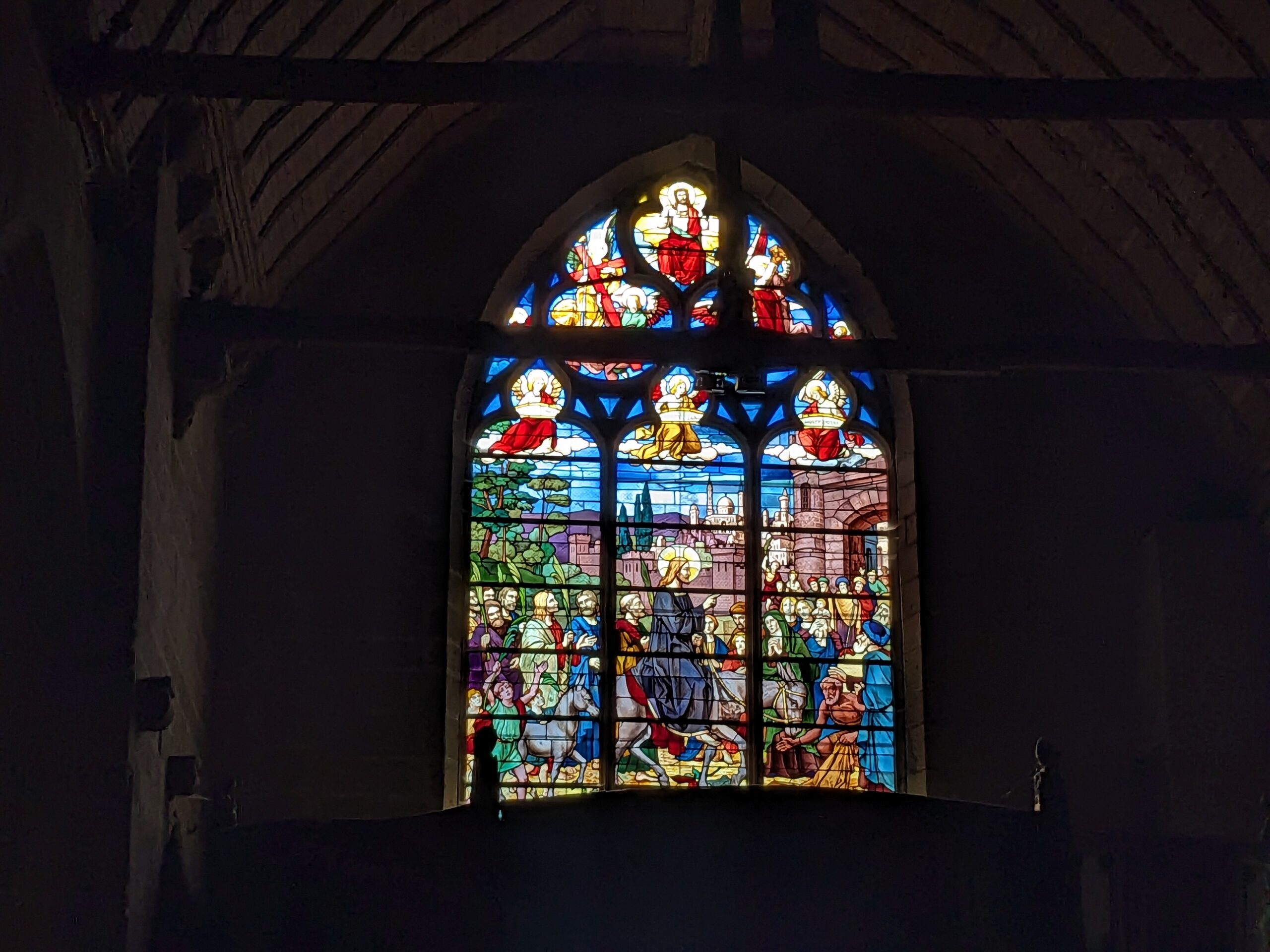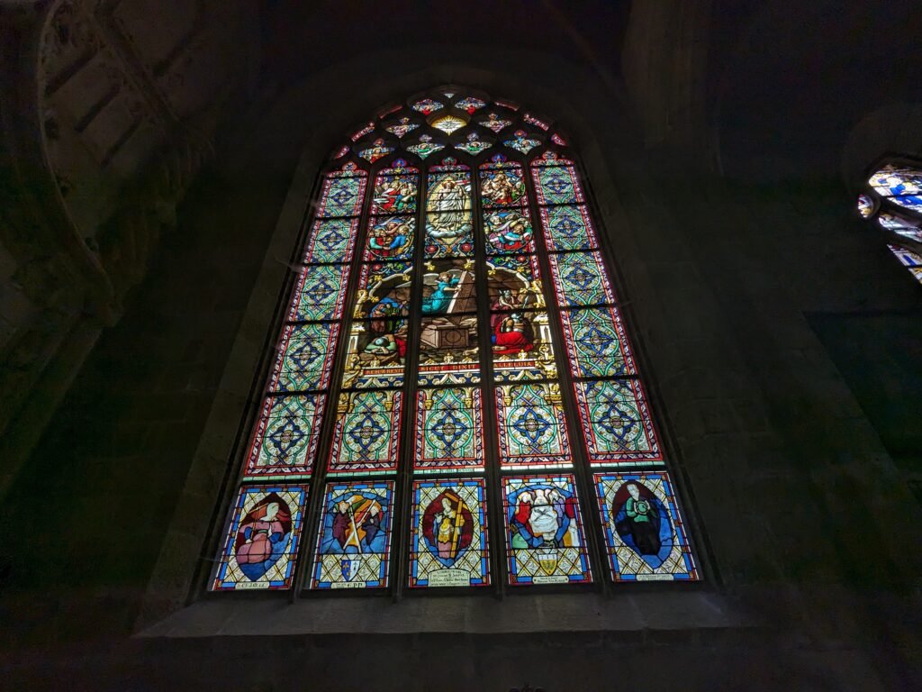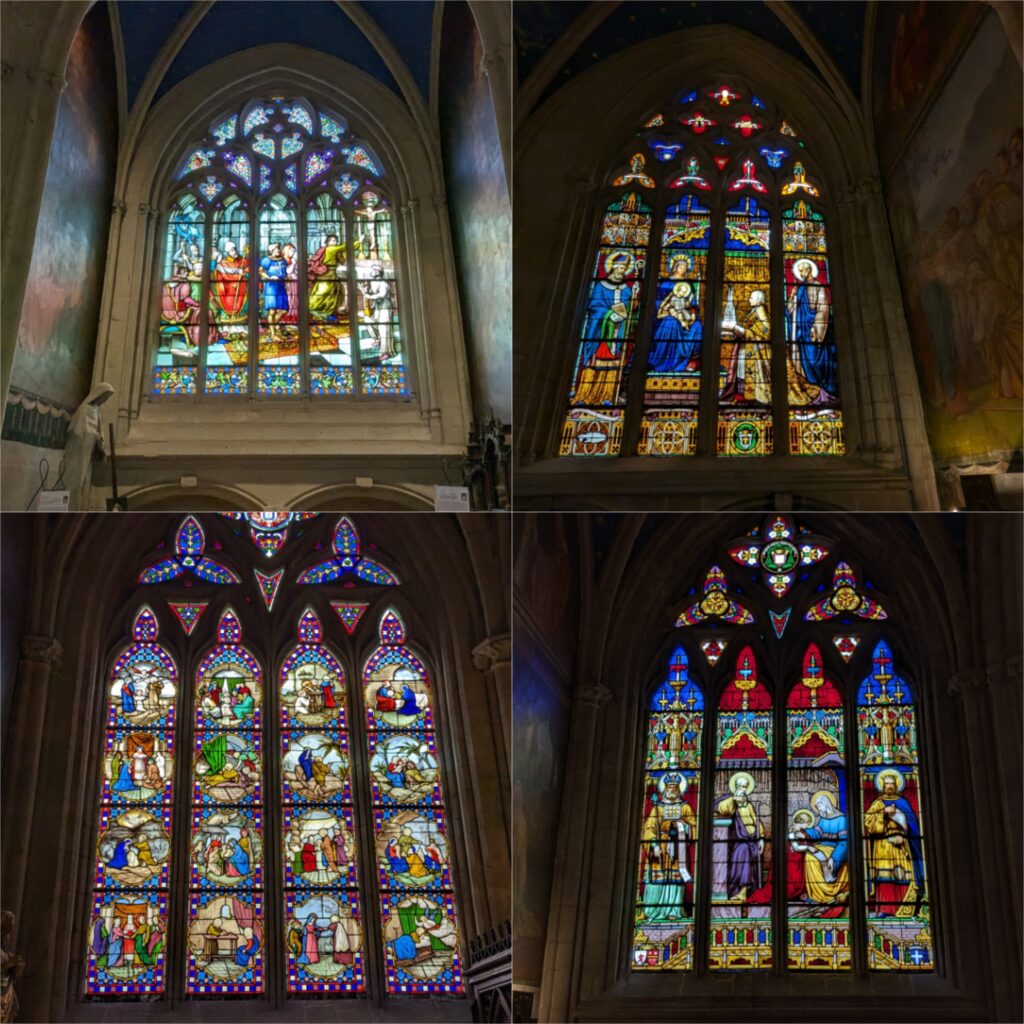 Nach einem letzten Frühstück mit Traumaussicht, sogar mit Wasser, nehmen wir schweren Herzens Abschied vom Meer. Vor uns liegen 230 km. Unser letztes Ziel in der Bretagne ist Fougères. Hier gibt es einen netten Camping Municipal (21,-€) und eine Burg (9,-€/P.). Heute ist es mit 31° und hoher Luftfeuchtigkeit fast unerträglich. Dazu spinnt Google und schickt uns in Fougères erstmal kreuz und quer. Als wir endlich den Campingplatz erreichen, ist dort eine lange Schlange vor uns, die erstmal abgefertigt werden muss. Nach einem Espresso schwingen wir uns trotz der Hitze auf die Räder, um das Chateau zu suchen. Leider ist Google immer noch bockig, aber schließlich finden wir es doch und starten die Besichtigung. Danach noch die 4 Wasserräder, (eins erzeugt den Strom für das Museum) und die Kirche Saint-Sulpice de Fougères, wieder mal mit tollen Buntglasfenstern. Dann haben wir hier endgültig genug geschwitzt und radeln zurück, um auf dem Campingplatz weiter zu schwitzen.