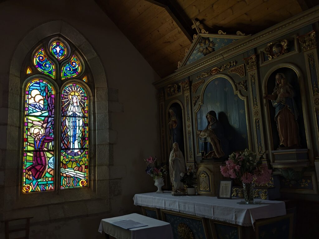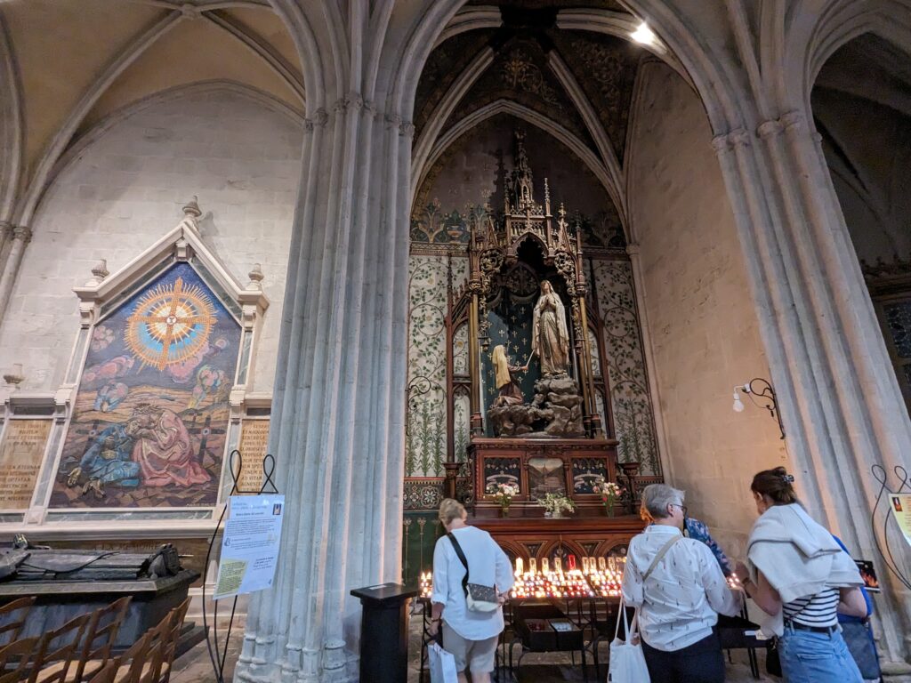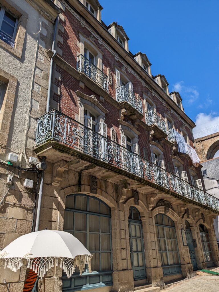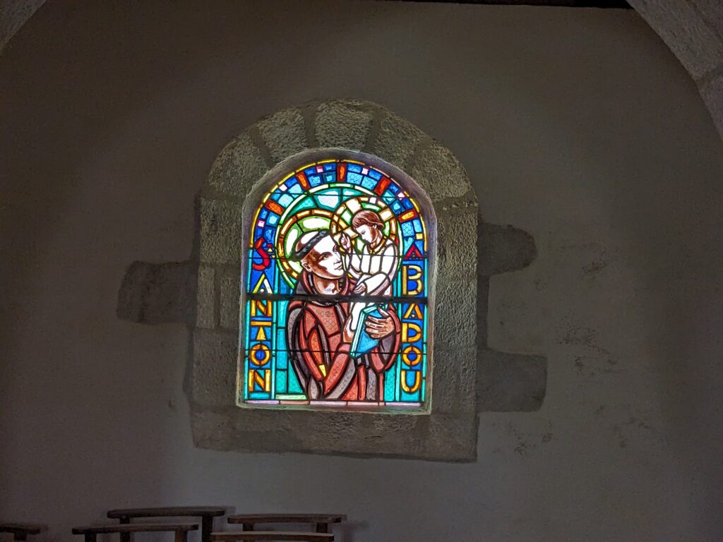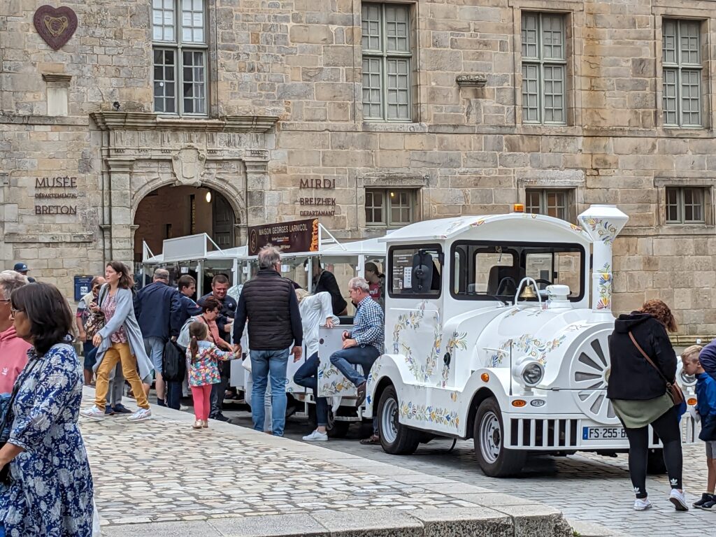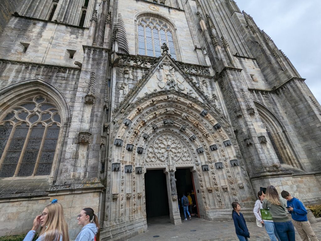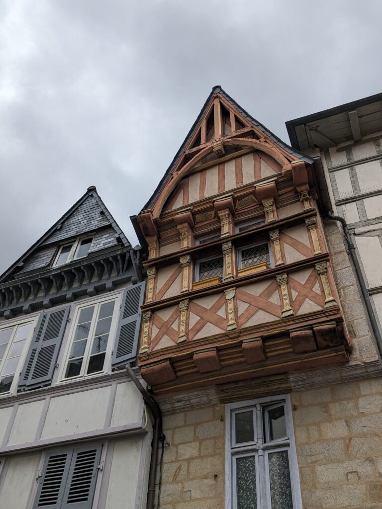 Nach einem letzten Frühstück mit Traumaussicht, sogar mit Wasser, nehmen wir schweren Herzens Abschied vom Meer. Vor uns liegen 230 km. Unser letztes Ziel in der Bretagne ist Fougères. Hier gibt es einen netten Camping Municipal (21,-€) und eine Burg (9,-€/P.). Heute ist es mit 31° und hoher Luftfeuchtigkeit fast unerträglich. Dazu spinnt Google und schickt uns in Fougères erstmal kreuz und quer. Als wir endlich den Campingplatz erreichen, ist dort eine lange Schlange vor uns, die erstmal abgefertigt werden muss. Nach einem Espresso schwingen wir uns trotz der Hitze auf die Räder, um das Chateau zu suchen. Leider ist Google immer noch bockig, aber schließlich finden wir es doch und starten die Besichtigung. Danach noch die 4 Wasserräder, (eins erzeugt den Strom für das Museum) und die Kirche Saint-Sulpice de Fougères, wieder mal mit tollen Buntglasfenstern. Dann haben wir hier endgültig genug geschwitzt und radeln zurück, um auf dem Campingplatz weiter zu schwitzen.
