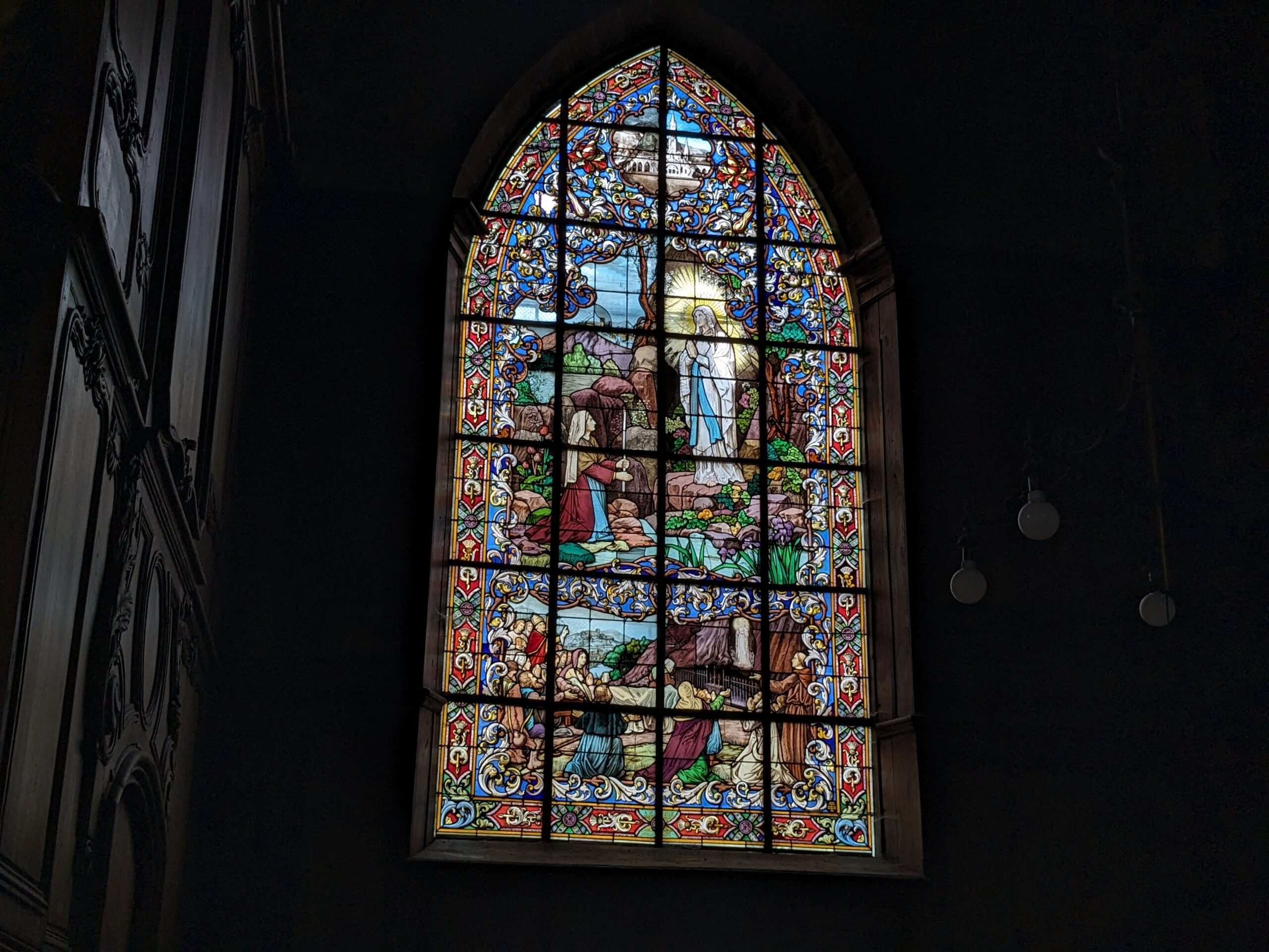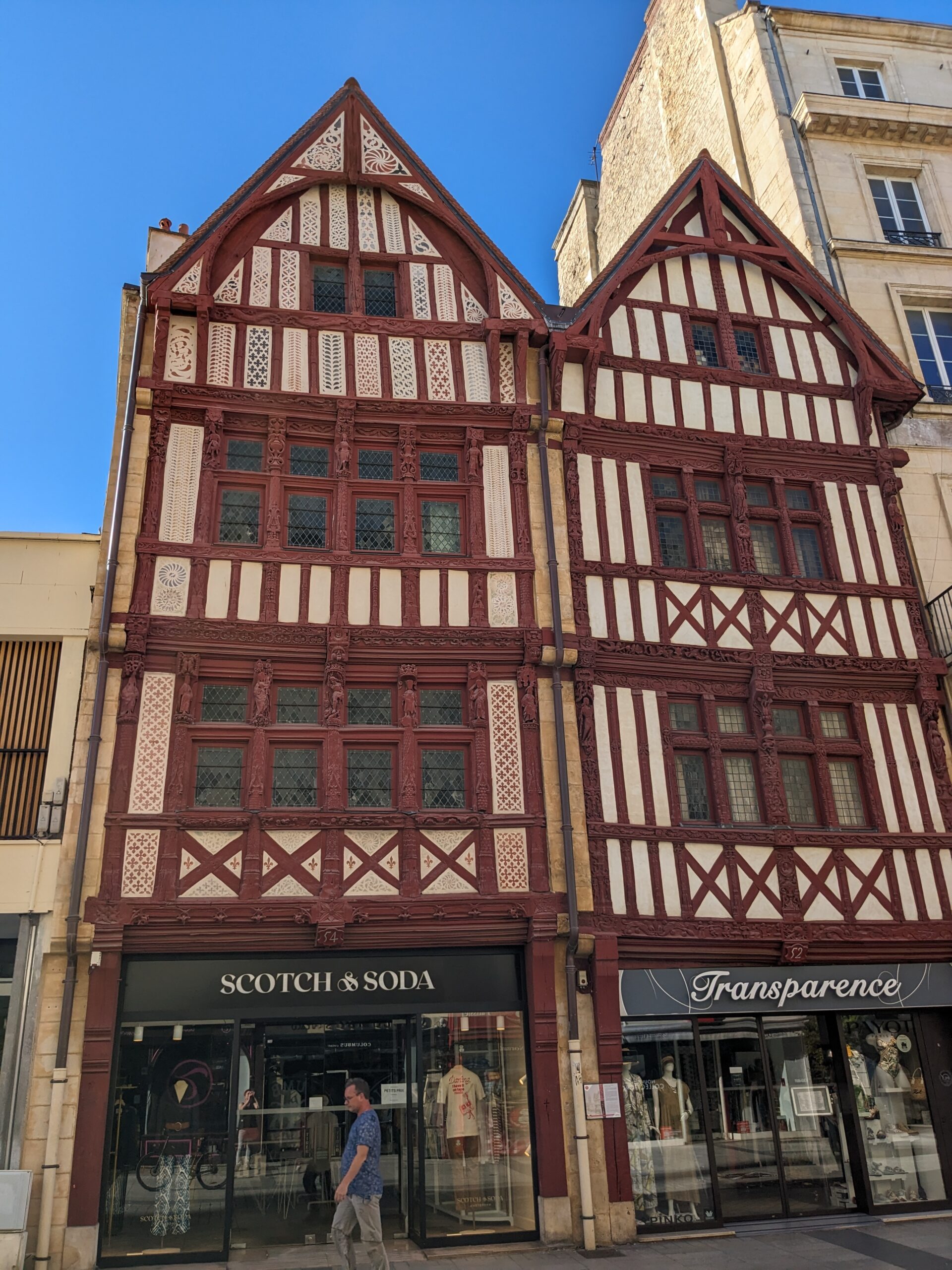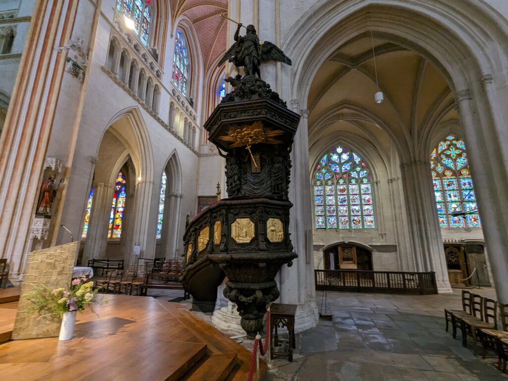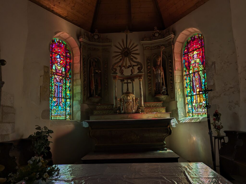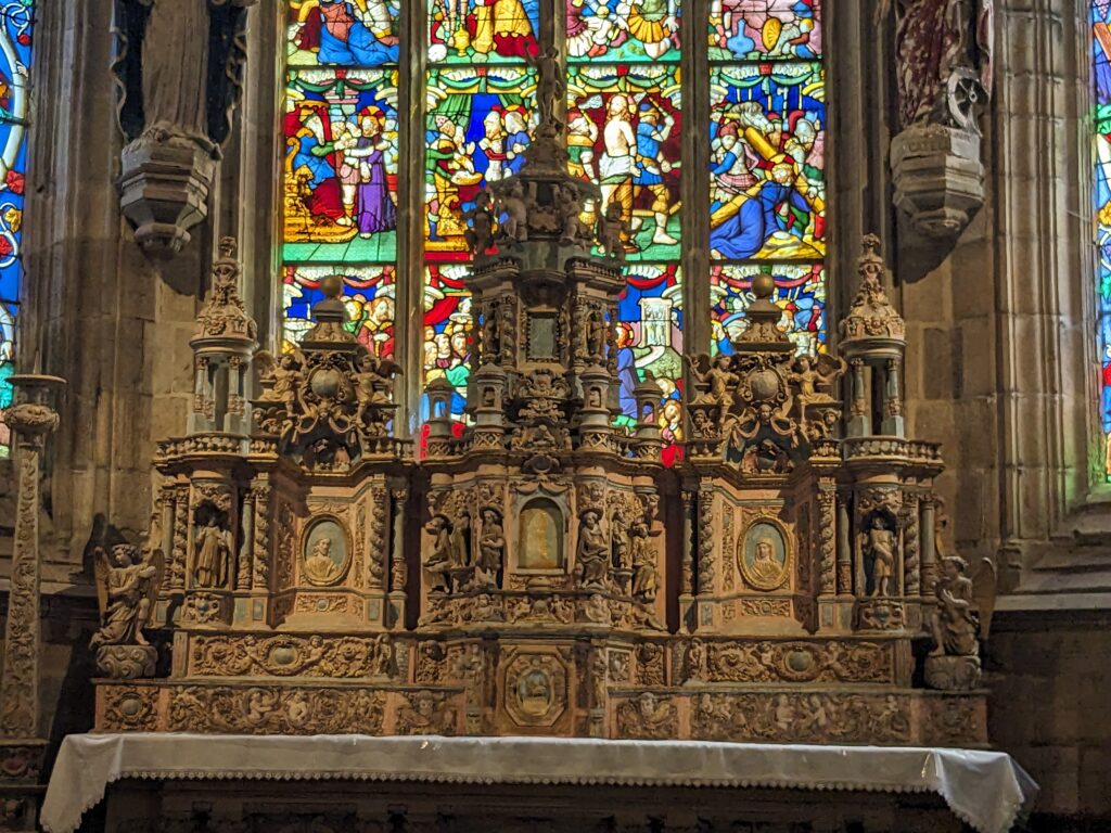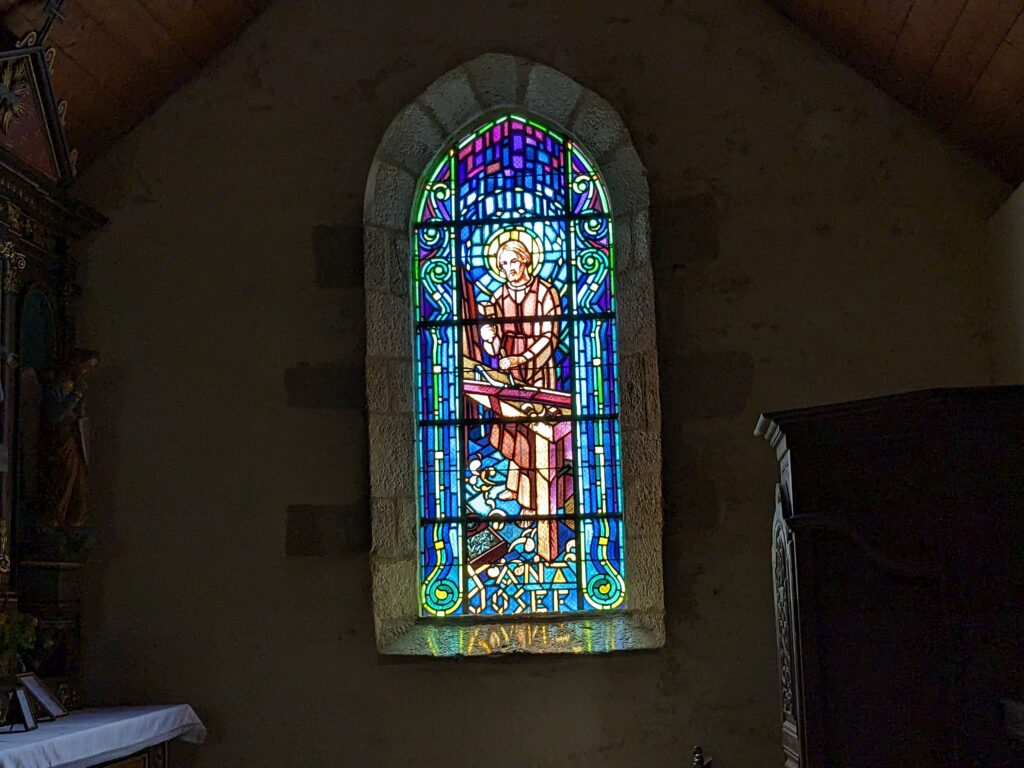 Nach einem letzten Frühstück mit Traumaussicht, sogar mit Wasser, nehmen wir schweren Herzens Abschied vom Meer. Vor uns liegen 230 km. Unser letztes Ziel in der Bretagne ist Fougères. Hier gibt es einen netten Camping Municipal (21,-€) und eine Burg (9,-€/P.). Heute ist es mit 31° und hoher Luftfeuchtigkeit fast unerträglich. Dazu spinnt Google und schickt uns in Fougères erstmal kreuz und quer. Als wir endlich den Campingplatz erreichen, ist dort eine lange Schlange vor uns, die erstmal abgefertigt werden muss. Nach einem Espresso schwingen wir uns trotz der Hitze auf die Räder, um das Chateau zu suchen. Leider ist Google immer noch bockig, aber schließlich finden wir es doch und starten die Besichtigung. Danach noch die 4 Wasserräder, (eins erzeugt den Strom für das Museum) und die Kirche Saint-Sulpice de Fougères, wieder mal mit tollen Buntglasfenstern. Dann haben wir hier endgültig genug geschwitzt und radeln zurück, um auf dem Campingplatz weiter zu schwitzen.