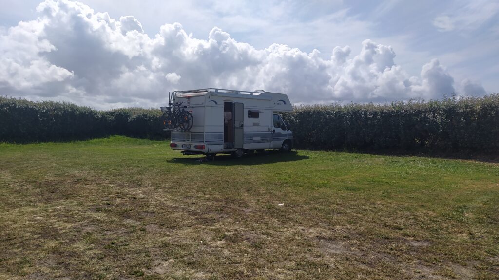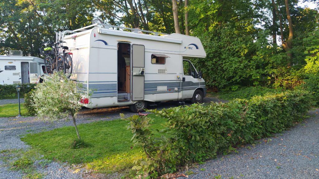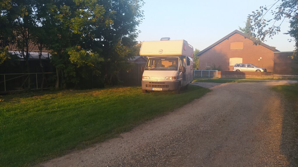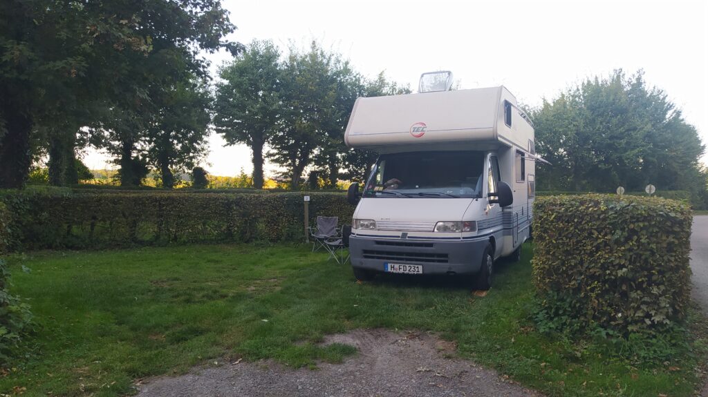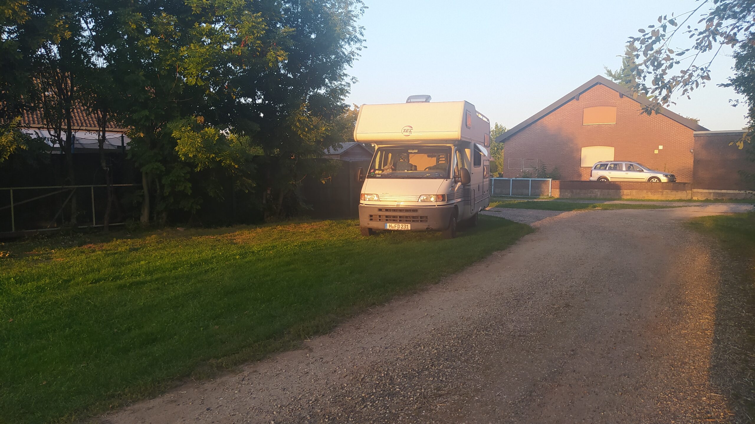 Die Nacht war angenehm ruhig. Heute müssen wir durch Belgien und das bei 32°, zuerst geht es noch ein kleines Stück durch Frankreich und an der zweiten Mautstelle funktioniert unser Bip&Go nicht. Heute sind wir plötzlich Klasse 3 und dürfen nicht durch. Wahrscheinlich wegen der offenen Dachluke im Alkoven. Erst die helfende Hand eines Mitarbeiters öffnet die Schranke. Dann geht es über die Grenze. Der Verkehr ist die Hölle. Rappelvoll! Reifenteile, oder besser fast der ganze Reifen auf der Fahrbahn, die Lkw’s fahren wie besengt, ziehen einfach rüber ohne Rücksicht auf Verluste. Schließlich folgt noch ein Stückchen Niederlande bis wir wieder in Deutschland ankommen. Ralf hat uns telefonisch auf einem Landvergnügen-Platz bei einem Demeter Biohof in Selfkant, etwas nördlich von Aachen avisiert. Wir kaufen im Hofladen Minutenschnitzel und leckeren Kartoffelsalat und später schwitzend den Rest des Tages abhängen.