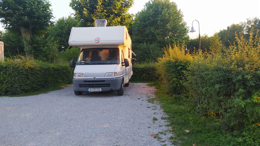 Start bei 190200 km. Diesmal wird das Womo vor der Haustür beladen. Um 16 Uhr ist alles fertig und wir starten zur A2 und fahren bewusst in den Stau. Im Schritttempo geht 15 Minuten bis zur Engstelle, in der Baustelle ist alles frei, danach auch. Lange wollten wir gar nicht fahren und parken um 18 Uhr auf dem Stellplatz in Löhne ein. Für 14 Euro stehen wir zwischen Hecken im Grünen. Die Nacht war unruhig, eine Disko in der Nähe hat bis 4 Uhr WumpaWumpa gemacht.