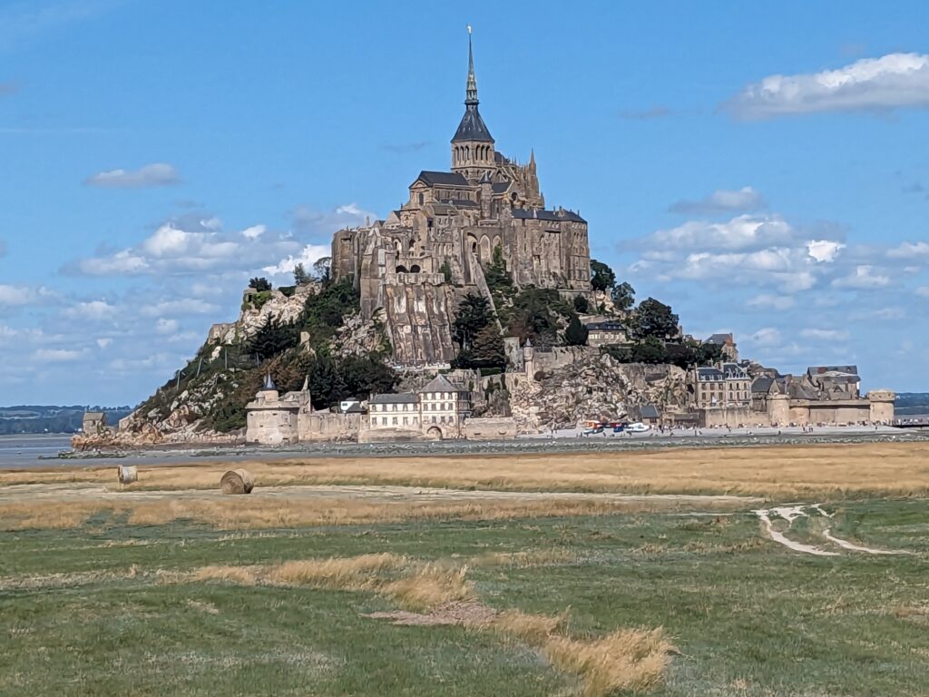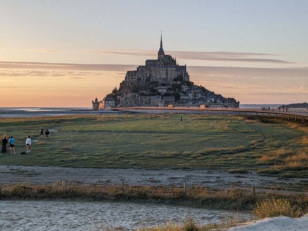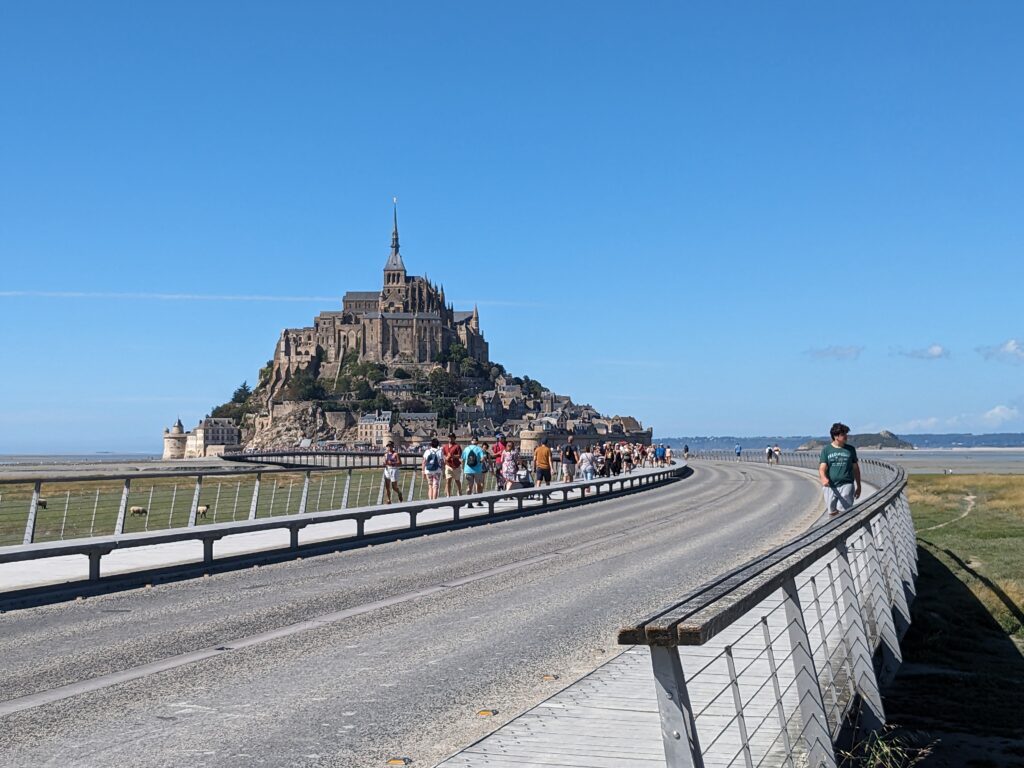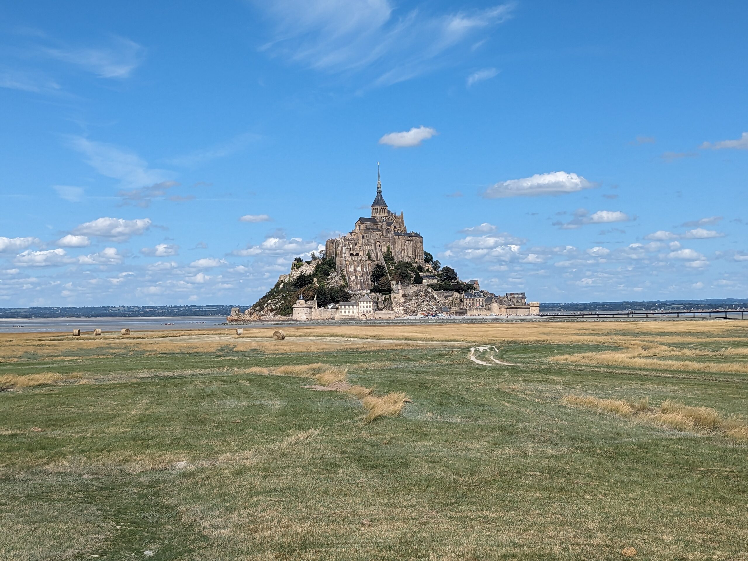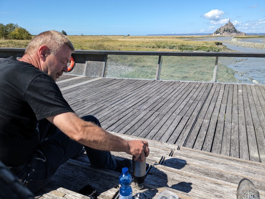 Wir stehen tatsächlich schon um kurz vor 7:00 auf. Ganz gemütlich machen wir uns fertig. Dann radelt Ralf los, um Baguette zu kaufen. Leider ohne Erfolg. Beide Bäcker in der Nähe haben geschlossen. Macht nichts. Das aufgetoastete Baguette von gestern tut es auch. Dann sind wir endlich abfahrbereit. Leider gibt es einen ziemlichen Stau bei der Entsorgung. Also nicht entsorgen! Bringt aber nichts, ein echter Spezialist steht vor der Schranke. Wir warten und warten. Als der endlich weg ist, meint ein anderer auf den Platz drauf fahren zu müssen. Jetzt sofort. Bevor wir die Chance haben runter zu fahren und blockiert wieder die einzige Schranke, er hat nämlich keine Pass’Étapes Karte. Also große Diskussion, erste Geldkarte funzt nicht, ins Auto steigen im Rucksack rumkramen, (wir warten) neuer Versuch. (wir warten immer noch) Funzt wieder nicht, schließlich gibt er endlich auf und wir können nach über einer halben Stunde endlich starten. Unser Ziel, der Stellplatz in der Nähe des Mont St. Michel, dort soll es laut App noch freie Plätze geben. Zunächst landen wir aber fälschlicher Weise auf dem Parkplatz von Mont. Die Massen strömen zum Shuttlebus, bloß weg hier. Aber weil es so viel Spaß macht, schickt Google uns gleich noch einmal dort lang. Dann noch etwas Geschiebe durch die Tourimassen im Ort. Um 12:15 Uhr stehen wir endlich reichlich genervt auf dem Stellplatz. Draußen herrschen knapp 30 Grad. Deshalb gibt es Mittags lecker belegte Baguettes aus der nahen Boulangerie. Später machen wir uns mit dem Rad auf zum Mont. So aus der Ferne betrachtet ist er richtig schön. Wir betrachten ihn von rechts und von links.. Dann gibt es auf dem Stauwerk frisch gebrühten Espresso und Gâteau Bretagne. Danach wagen wir uns noch auf den Damm. Da die Shuttlebusse hier nicht wenden können, haben sie Vorn und Hinten ein Fahrerhaus! Trotzdem herrscht hier das Chaos. „Die Karawane zieht weiter..“ wir auch ganz schnell weg hier, zurück zum Stellplatz. Nach einer mäßig guten Pizza schwingen wir uns allerdings noch einmal auf die Räder um noch einen abendlichen Blick auf den Mont zu werfen und nebenbei zwei Caches zu loggen. Bei unserer Rückkehr sind dann auch die letzten zwei (Behindertenplätze) von nicht behinderten Franzosen belegt und auch auf der Wiese stehen noch zwei Wohnmobile. Also ist der Platz mit mindestens 182 Womos absolut voll. 16,5 Euro inkl. 1,10 Euro Kurtaxe wurden vom Guthaben abgezogen, obwohl die Schranke beim 1. Versuch nicht aufging.