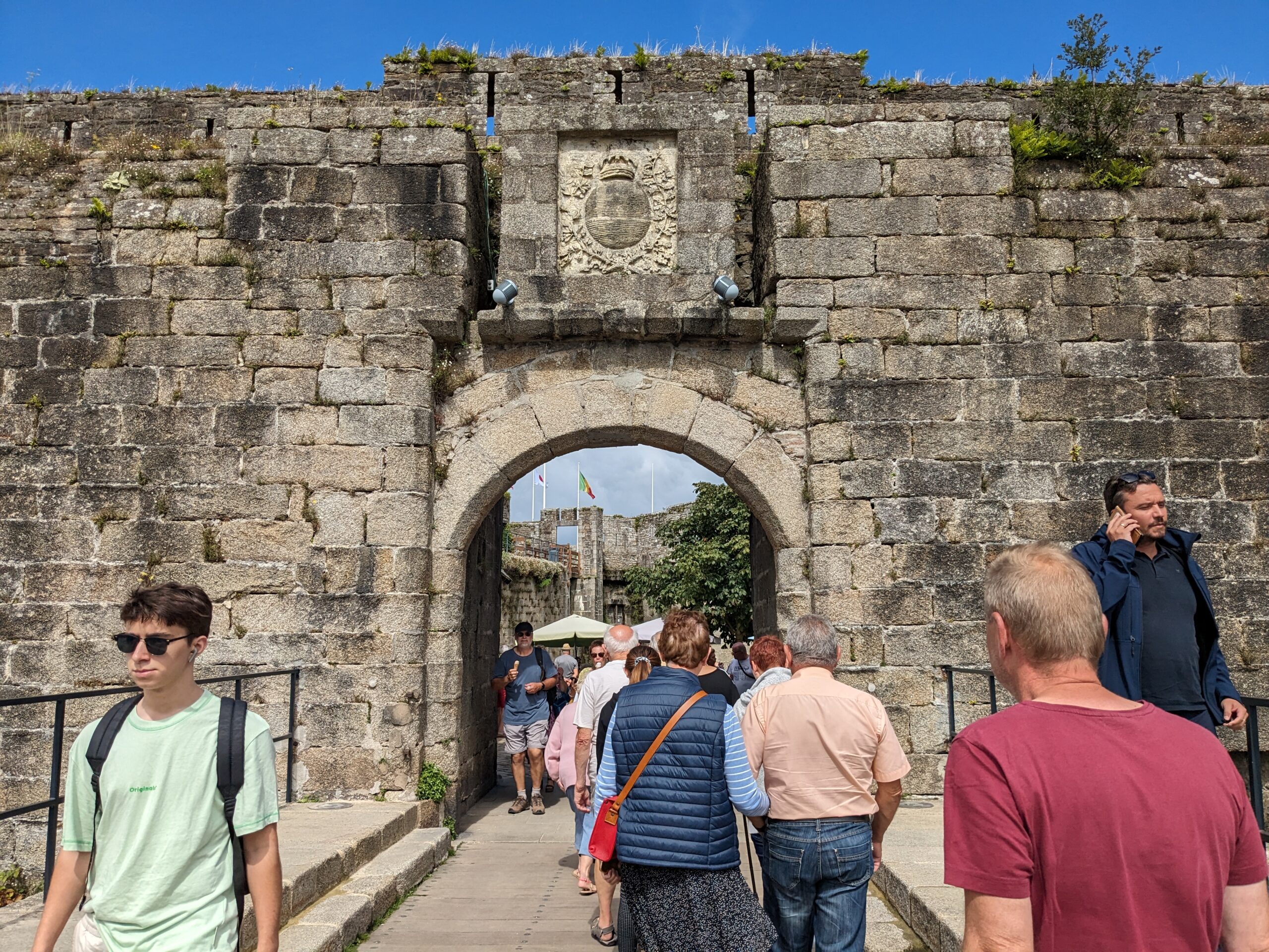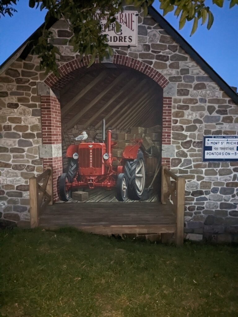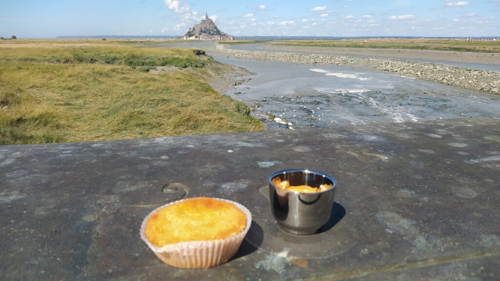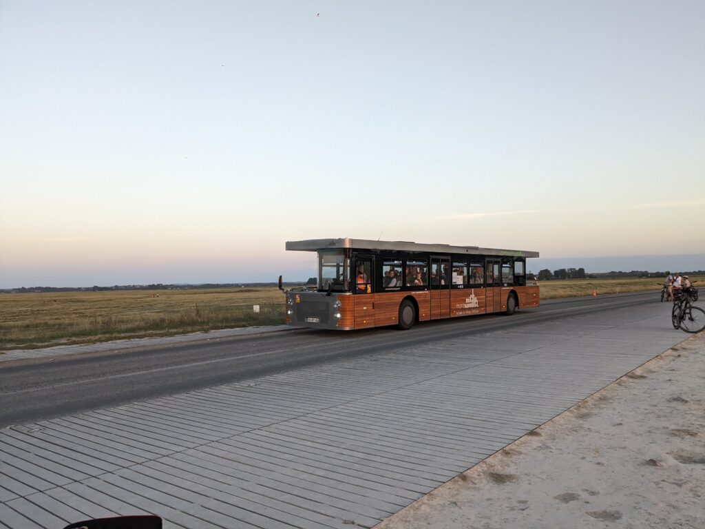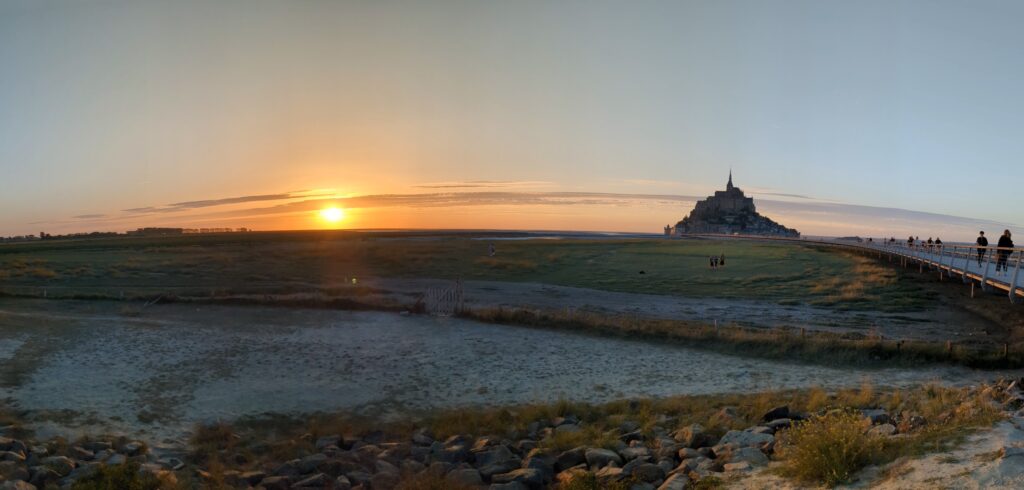 Wir stehen tatsächlich schon um kurz vor 7:00 auf. Ganz gemütlich machen wir uns fertig. Dann radelt Ralf los, um Baguette zu kaufen. Leider ohne Erfolg. Beide Bäcker in der Nähe haben geschlossen. Macht nichts. Das aufgetoastete Baguette von gestern tut es auch. Dann sind wir endlich abfahrbereit. Leider gibt es einen ziemlichen Stau bei der Entsorgung. Also nicht entsorgen! Bringt aber nichts, ein echter Spezialist steht vor der Schranke. Wir warten und warten. Als der endlich weg ist, meint ein anderer auf den Platz drauf fahren zu müssen. Jetzt sofort. Bevor wir die Chance haben runter zu fahren und blockiert wieder die einzige Schranke, er hat nämlich keine Pass’Étapes Karte. Also große Diskussion, erste Geldkarte funzt nicht, ins Auto steigen im Rucksack rumkramen, (wir warten) neuer Versuch. (wir warten immer noch) Funzt wieder nicht, schließlich gibt er endlich auf und wir können nach über einer halben Stunde endlich starten. Unser Ziel, der Stellplatz in der Nähe des Mont St. Michel, dort soll es laut App noch freie Plätze geben. Zunächst landen wir aber fälschlicher Weise auf dem Parkplatz von Mont. Die Massen strömen zum Shuttlebus, bloß weg hier. Aber weil es so viel Spaß macht, schickt Google uns gleich noch einmal dort lang. Dann noch etwas Geschiebe durch die Tourimassen im Ort. Um 12:15 Uhr stehen wir endlich reichlich genervt auf dem Stellplatz. Draußen herrschen knapp 30 Grad. Deshalb gibt es Mittags lecker belegte Baguettes aus der nahen Boulangerie. Später machen wir uns mit dem Rad auf zum Mont. So aus der Ferne betrachtet ist er richtig schön. Wir betrachten ihn von rechts und von links.. Dann gibt es auf dem Stauwerk frisch gebrühten Espresso und Gâteau Bretagne. Danach wagen wir uns noch auf den Damm. Da die Shuttlebusse hier nicht wenden können, haben sie Vorn und Hinten ein Fahrerhaus! Trotzdem herrscht hier das Chaos. „Die Karawane zieht weiter..“ wir auch ganz schnell weg hier, zurück zum Stellplatz. Nach einer mäßig guten Pizza schwingen wir uns allerdings noch einmal auf die Räder um noch einen abendlichen Blick auf den Mont zu werfen und nebenbei zwei Caches zu loggen. Bei unserer Rückkehr sind dann auch die letzten zwei (Behindertenplätze) von nicht behinderten Franzosen belegt und auch auf der Wiese stehen noch zwei Wohnmobile. Also ist der Platz mit mindestens 182 Womos absolut voll. 16,5 Euro inkl. 1,10 Euro Kurtaxe wurden vom Guthaben abgezogen, obwohl die Schranke beim 1. Versuch nicht aufging.