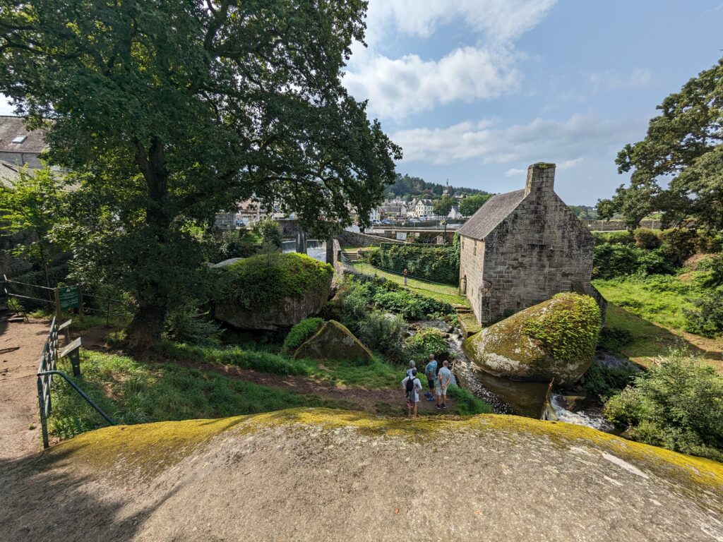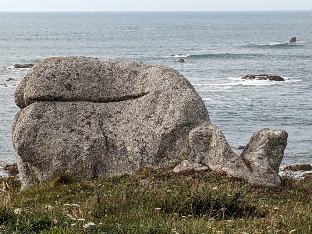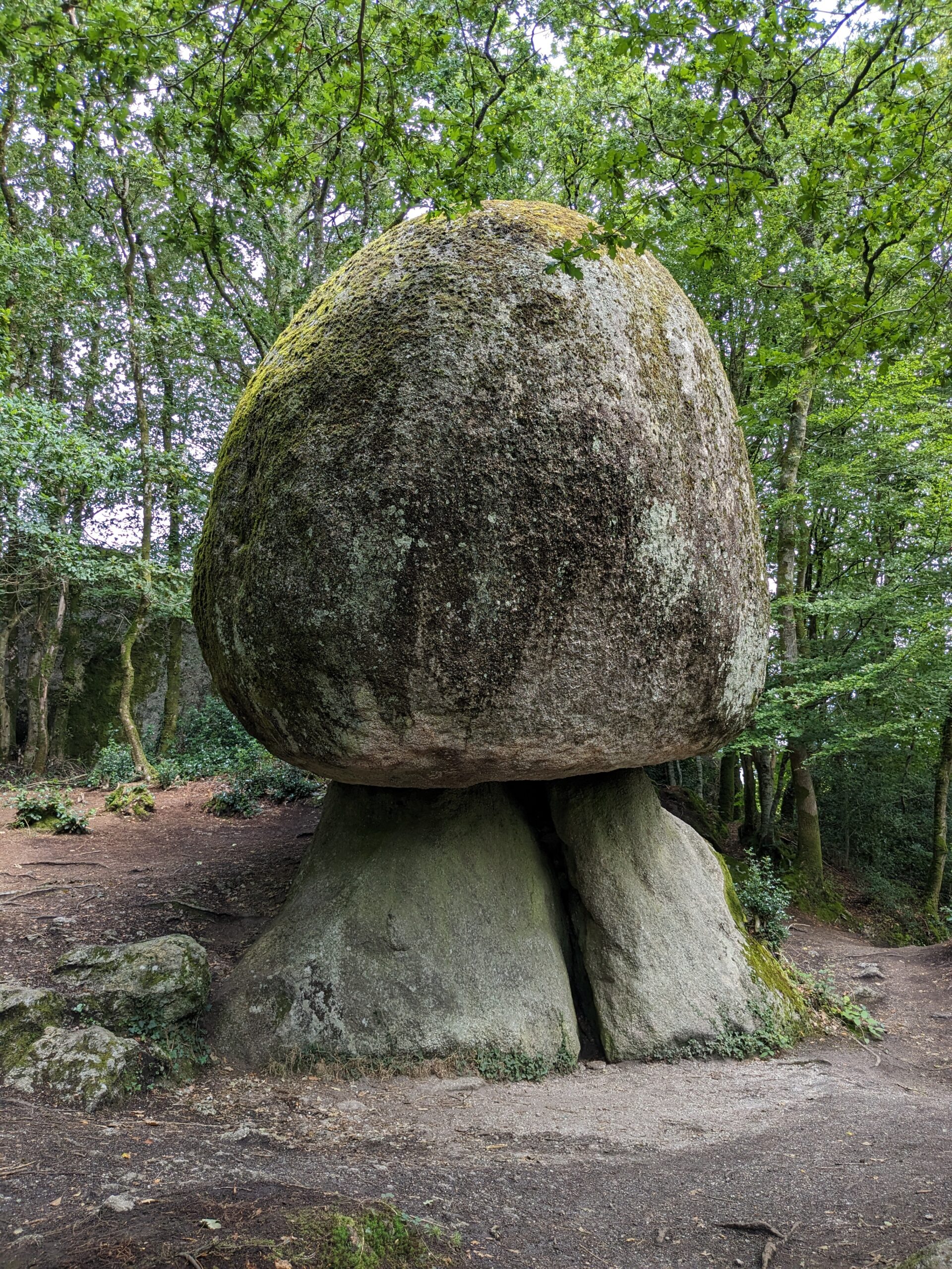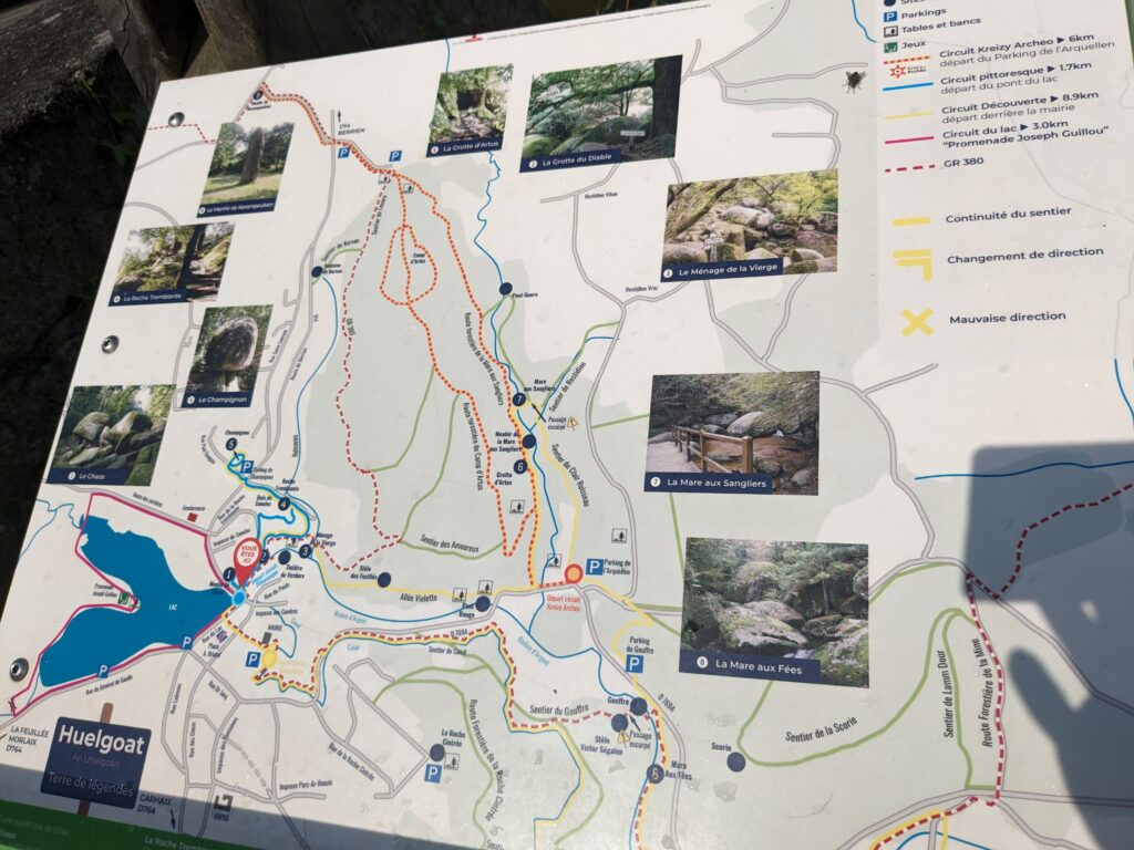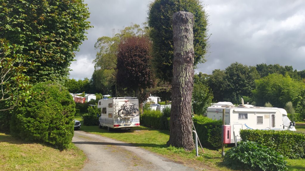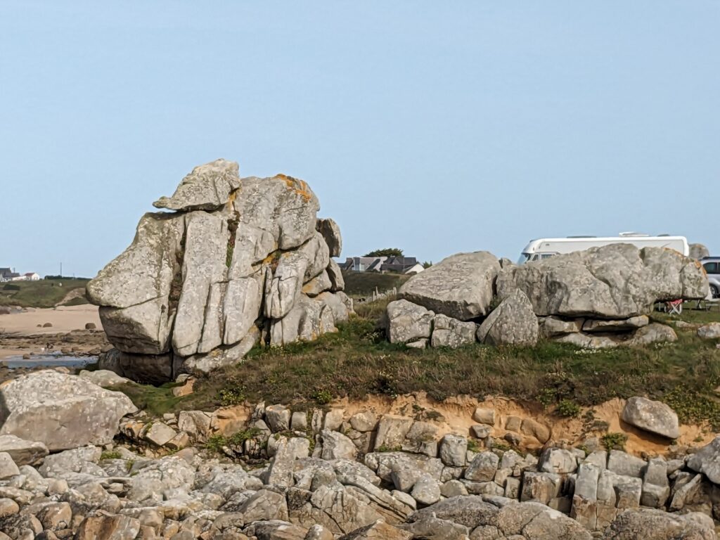 Nach nur 5 km quartieren wir uns früh auf dem Camping Municipal in Huelgoat ein. Auf festem Beton kann nichts passieren. 22,34 Euro bezahlen wir hier für einen Riesenplatz. Das Wetter ist gerade gut, wer weiß wie lange, also schnell Baguettes geschmiert und auf geht’s, zum „Le Chaos der Huelgoat“. Erstmal entlang des Sees. Dann ins Chaos, in die Grotte des Diable, zur Ménage la Vierge. Zum „La Roche Tremblante“ wenn man hier an der richtigen Stelle drückt, bewegt er sich tatsächlich ein klein wenig. Zu guter Letzt werfen wir noch einen Blick auf den „Champignon“, ist aber wohl eher ein Steinpilz. Nebenher haben wir einen Labcach abgeschlossen. Mit den üblichen Problemen in Frankreich schreibt man die Antworten mit oder ohne Tüdelchen? Da braucht es manchmal mehrere Anläufe. Wir laufen jedenfalls erst einmal eine Eisdiele an und dann geht es zurück zum Campingplatz. Nach einem Päuschen schwingen wir uns noch einmal auf die Räder und erledigen im Intermaché die nötigsten Einkäufe, bevor wir den Abend auf dem „Sofa“ beenden.