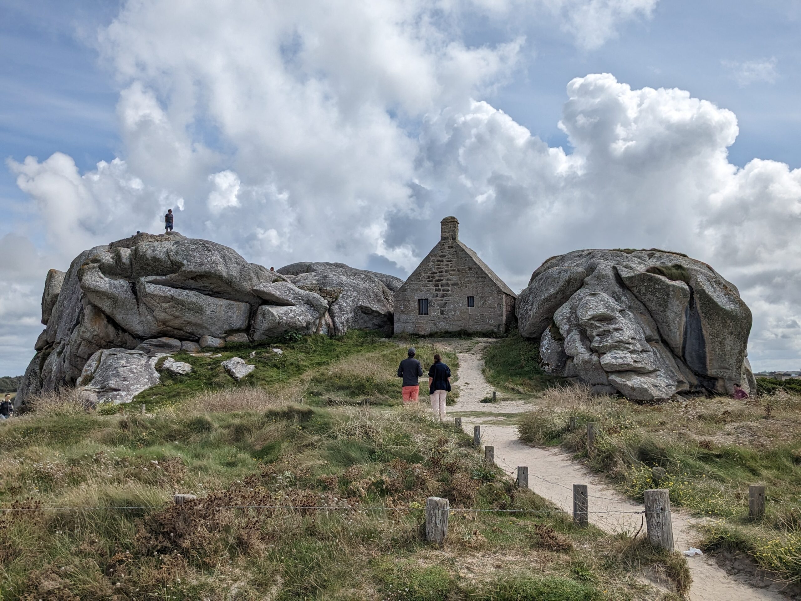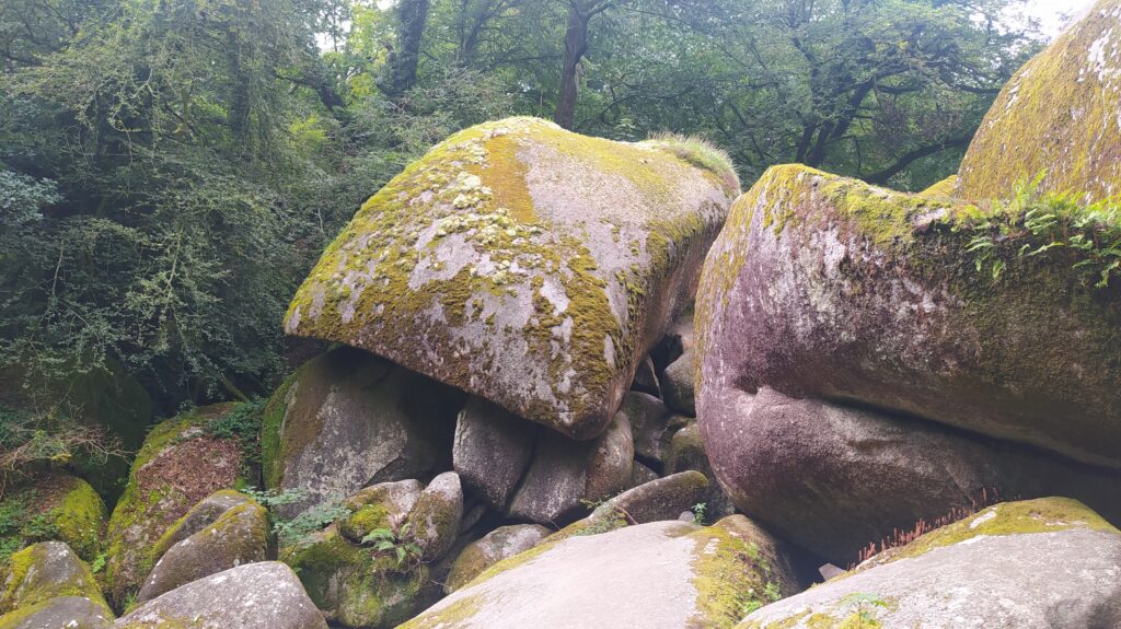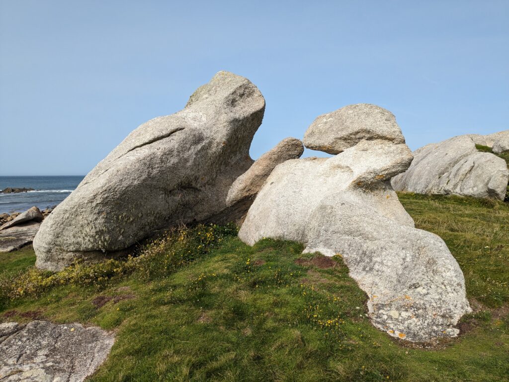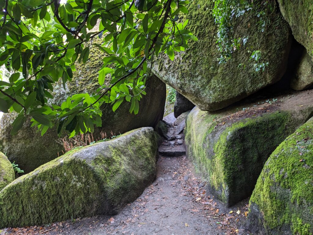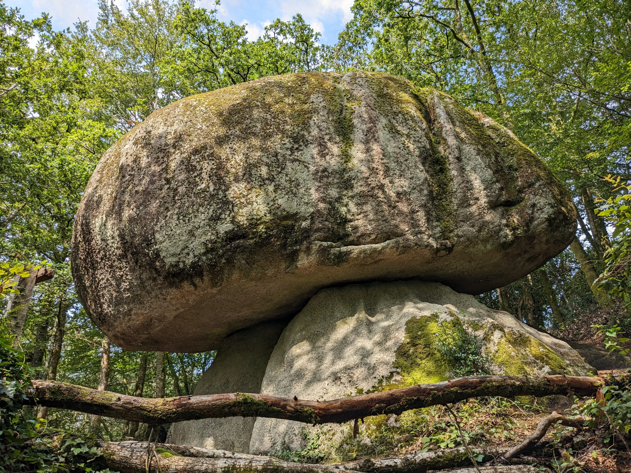 Nach nur 5 km quartieren wir uns früh auf dem Camping Municipal in Huelgoat ein. Auf festem Beton kann nichts passieren. 22,34 Euro bezahlen wir hier für einen Riesenplatz. Das Wetter ist gerade gut, wer weiß wie lange, also schnell Baguettes geschmiert und auf geht’s, zum „Le Chaos der Huelgoat“. Erstmal entlang des Sees. Dann ins Chaos, in die Grotte des Diable, zur Ménage la Vierge. Zum „La Roche Tremblante“ wenn man hier an der richtigen Stelle drückt, bewegt er sich tatsächlich ein klein wenig. Zu guter Letzt werfen wir noch einen Blick auf den „Champignon“, ist aber wohl eher ein Steinpilz. Nebenher haben wir einen Labcach abgeschlossen. Mit den üblichen Problemen in Frankreich schreibt man die Antworten mit oder ohne Tüdelchen? Da braucht es manchmal mehrere Anläufe. Wir laufen jedenfalls erst einmal eine Eisdiele an und dann geht es zurück zum Campingplatz. Nach einem Päuschen schwingen wir uns noch einmal auf die Räder und erledigen im Intermaché die nötigsten Einkäufe, bevor wir den Abend auf dem „Sofa“ beenden.