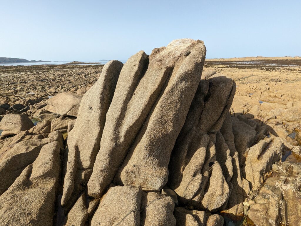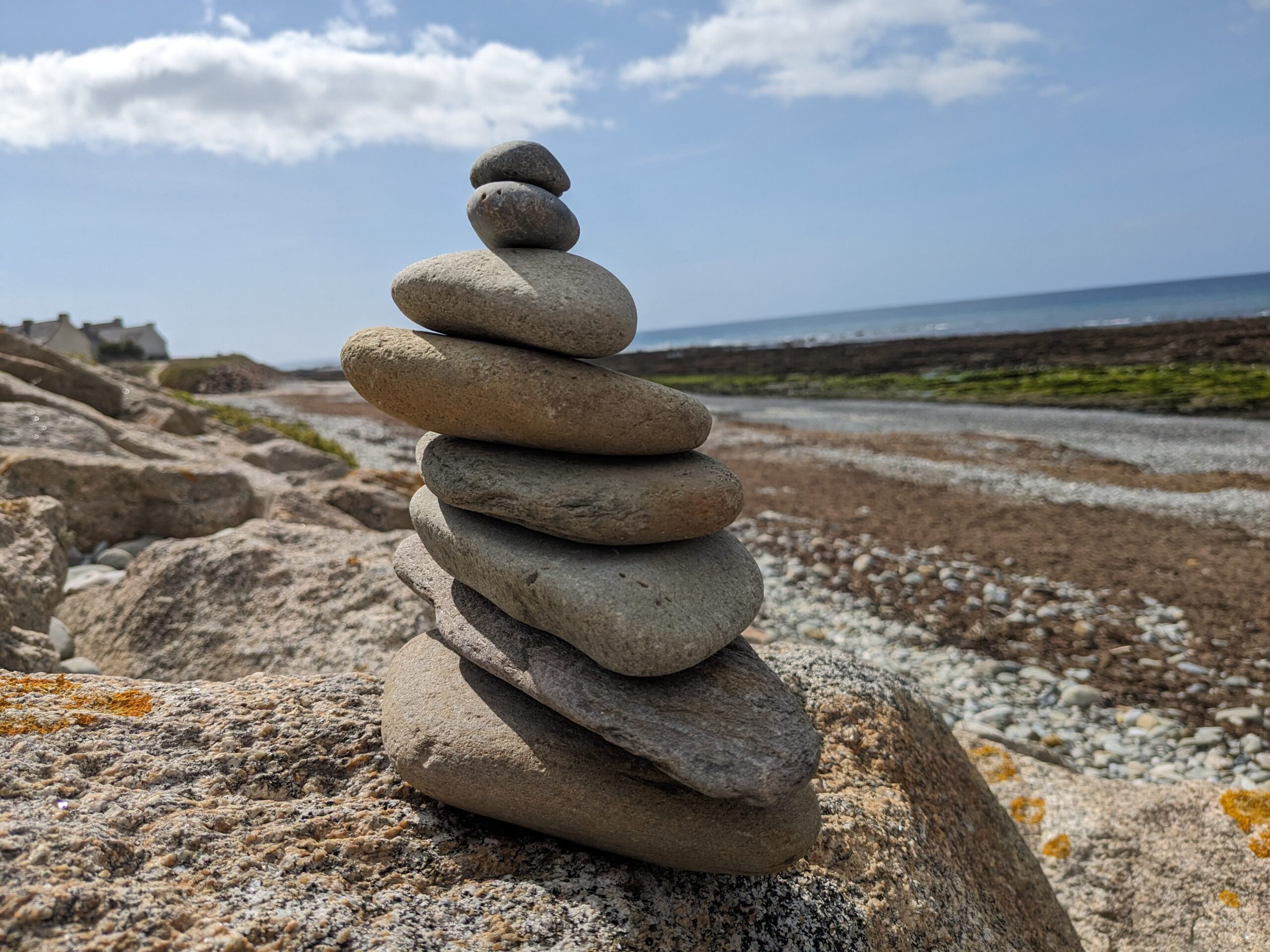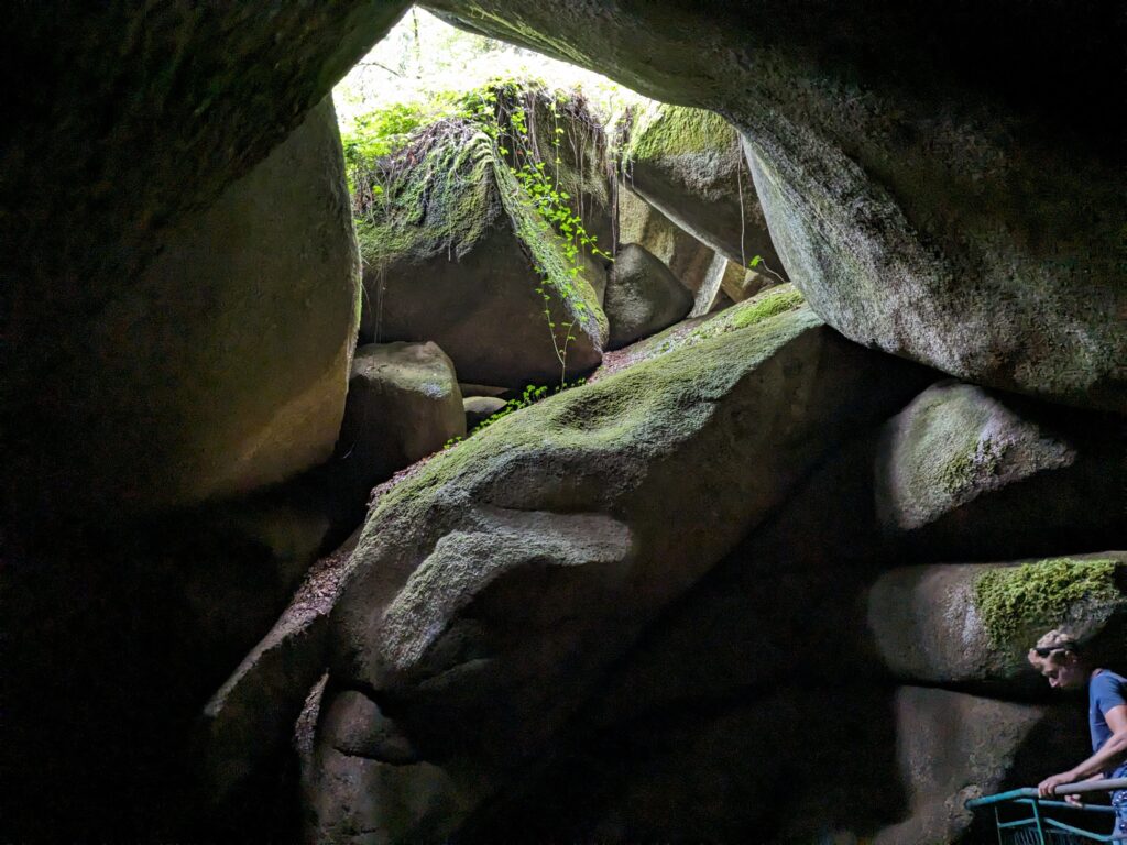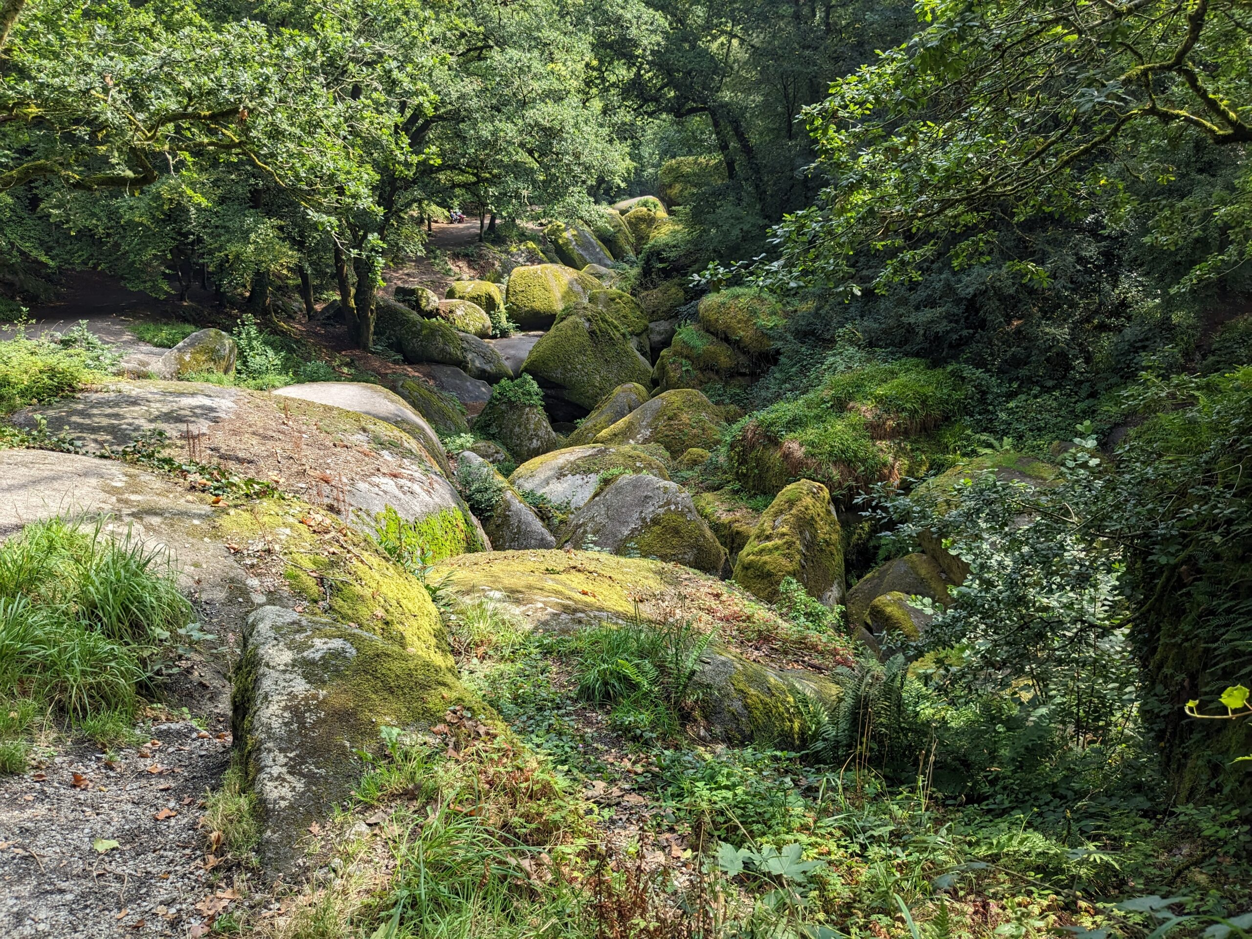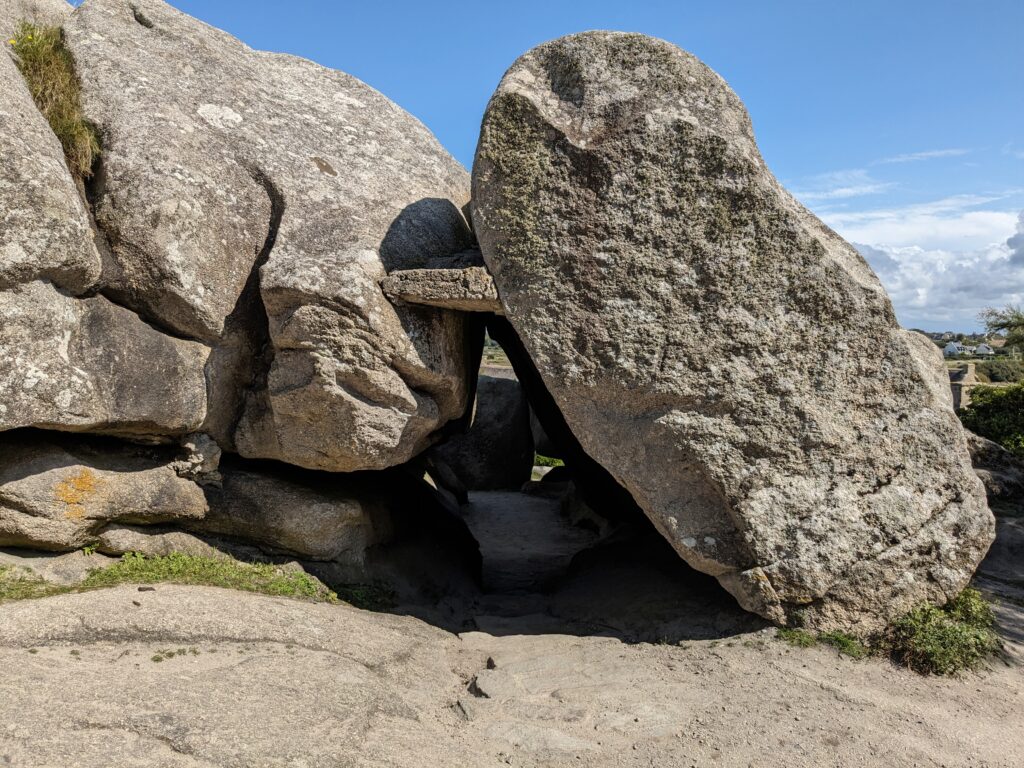 Nach nur 5 km quartieren wir uns früh auf dem Camping Municipal in Huelgoat ein. Auf festem Beton kann nichts passieren. 22,34 Euro bezahlen wir hier für einen Riesenplatz. Das Wetter ist gerade gut, wer weiß wie lange, also schnell Baguettes geschmiert und auf geht’s, zum „Le Chaos der Huelgoat“. Erstmal entlang des Sees. Dann ins Chaos, in die Grotte des Diable, zur Ménage la Vierge. Zum „La Roche Tremblante“ wenn man hier an der richtigen Stelle drückt, bewegt er sich tatsächlich ein klein wenig. Zu guter Letzt werfen wir noch einen Blick auf den „Champignon“, ist aber wohl eher ein Steinpilz. Nebenher haben wir einen Labcach abgeschlossen. Mit den üblichen Problemen in Frankreich schreibt man die Antworten mit oder ohne Tüdelchen? Da braucht es manchmal mehrere Anläufe. Wir laufen jedenfalls erst einmal eine Eisdiele an und dann geht es zurück zum Campingplatz. Nach einem Päuschen schwingen wir uns noch einmal auf die Räder und erledigen im Intermaché die nötigsten Einkäufe, bevor wir den Abend auf dem „Sofa“ beenden.