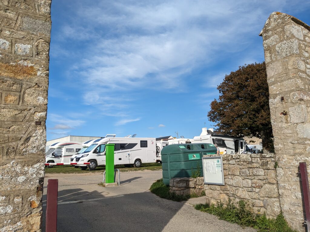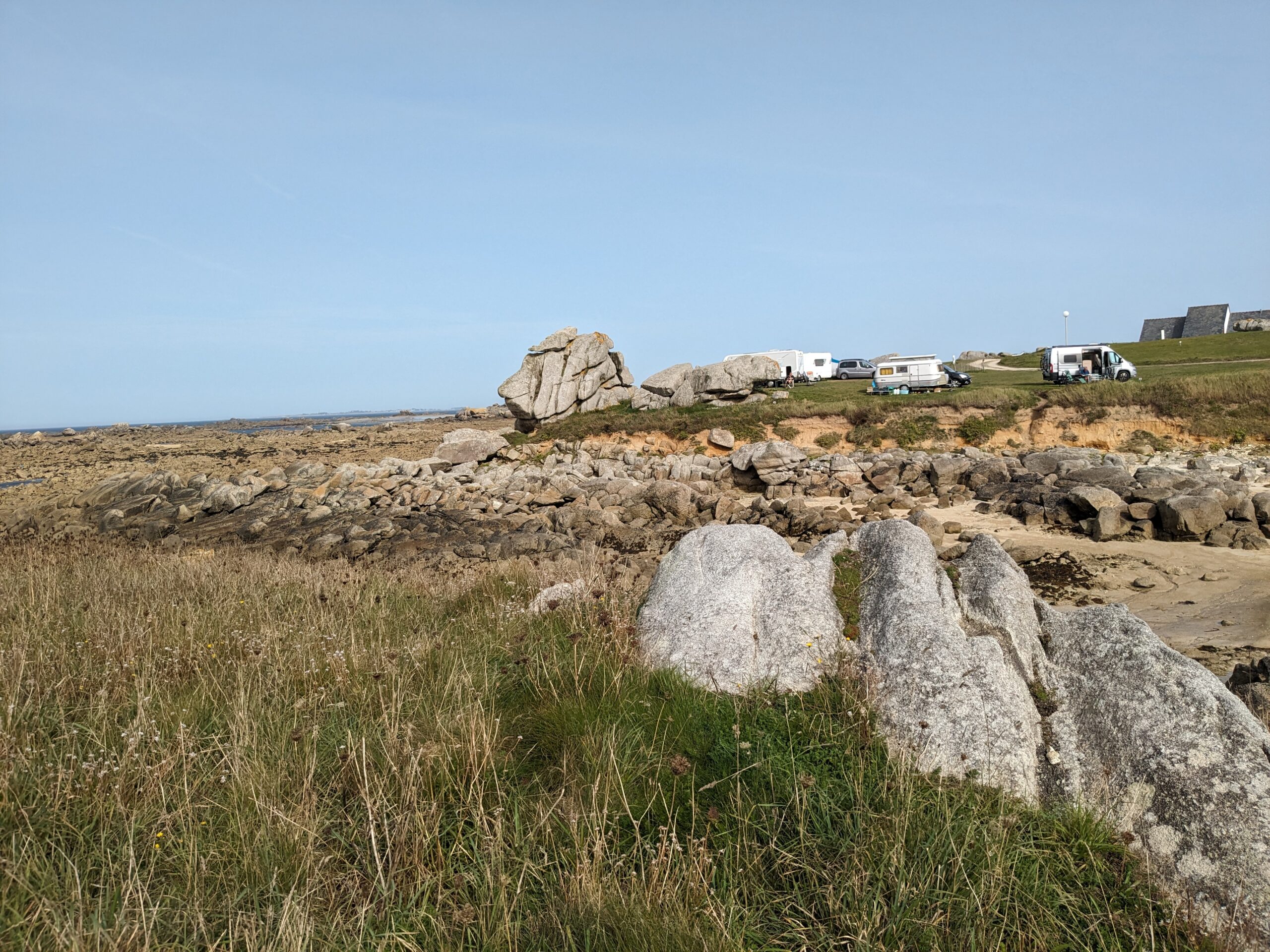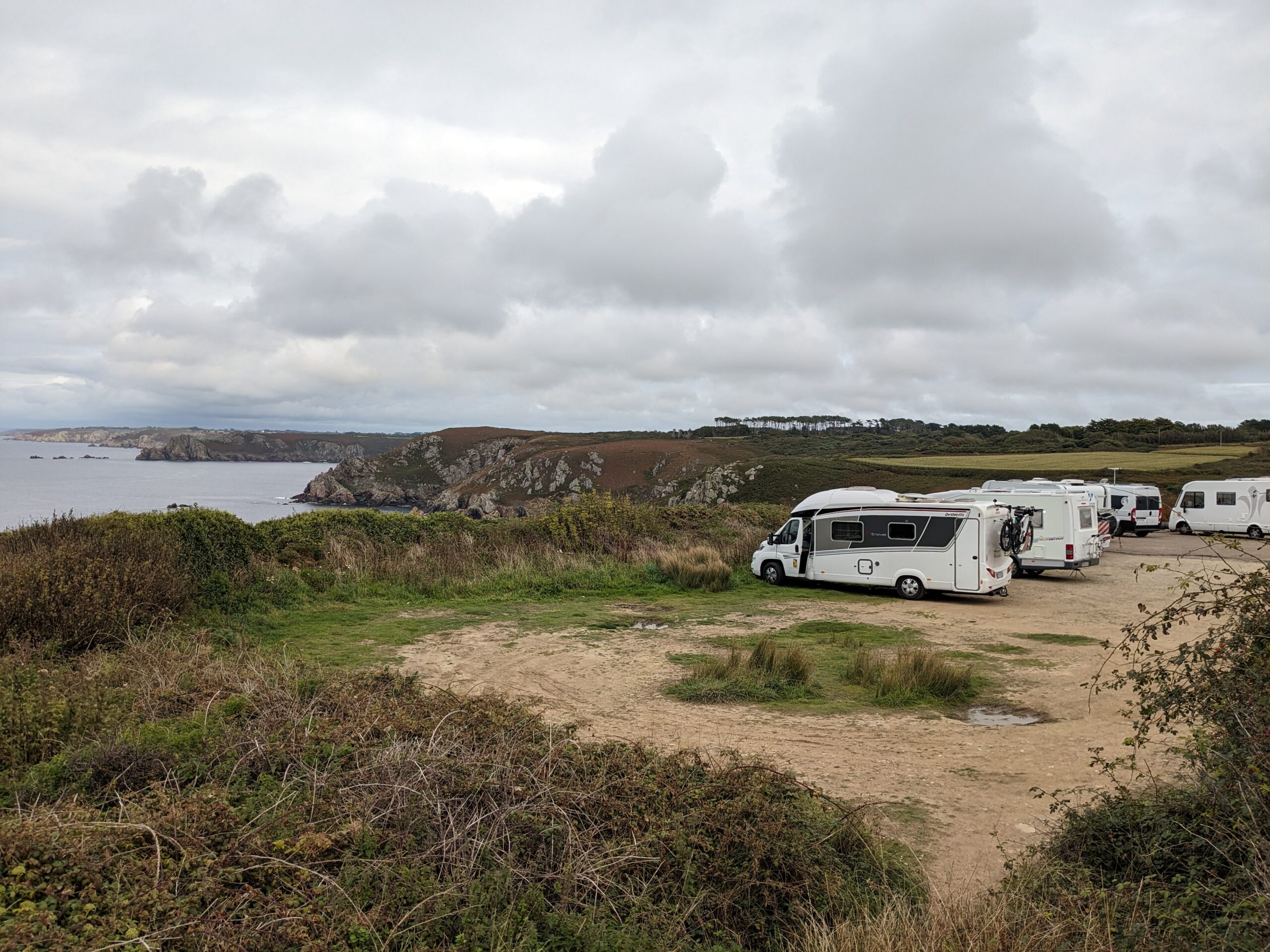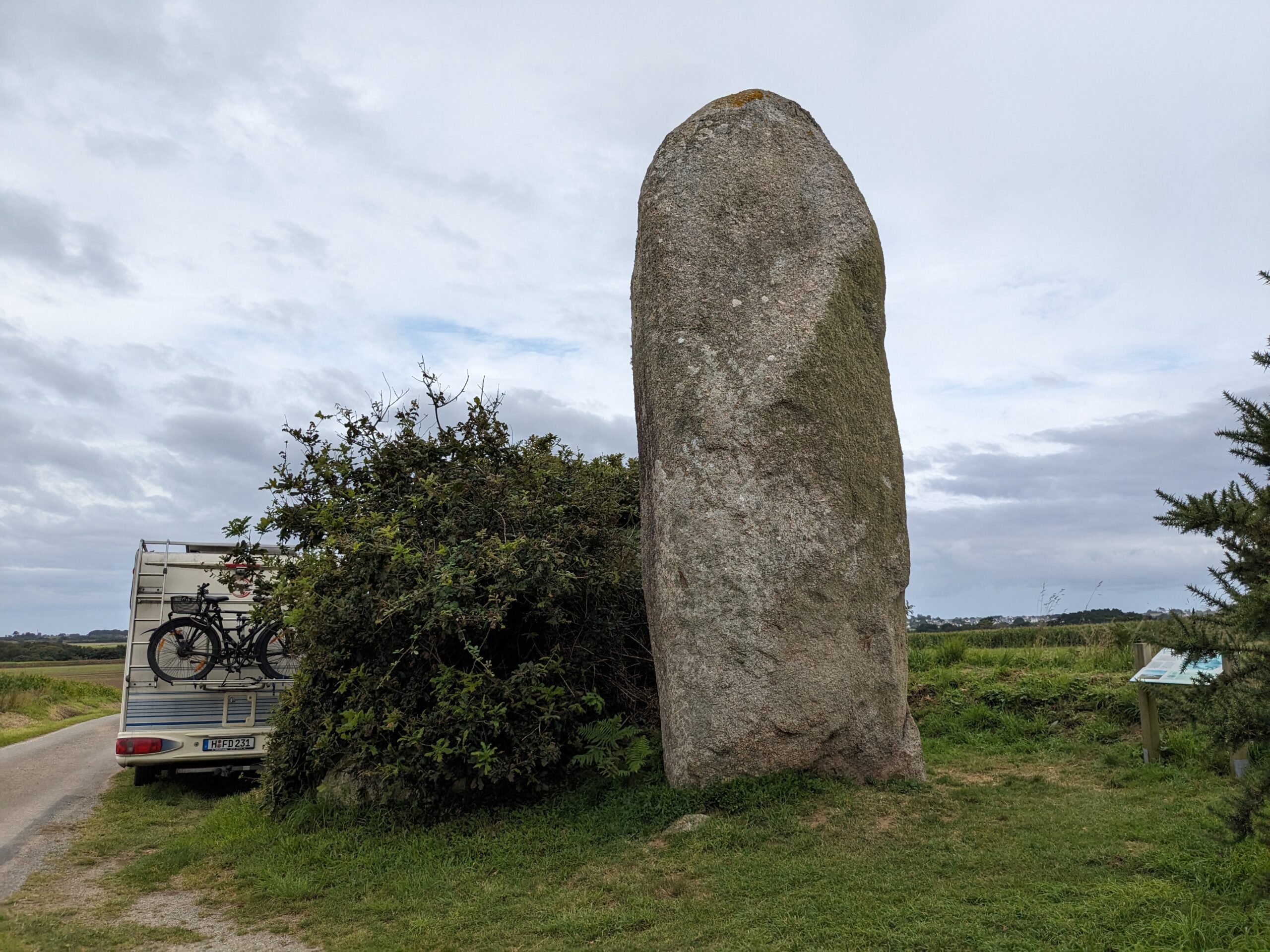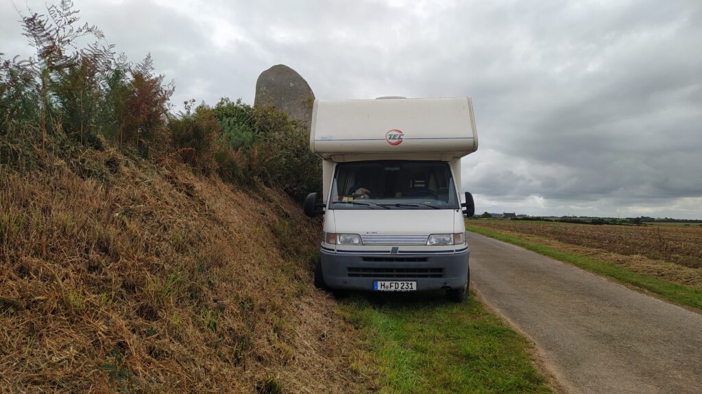 Heute ist das Wetter bewölkt und morgens haben wir nur 16 Grad, aber es ist trocken. Also alles gut. Wir starten Richtung Lilia. Es stehen Leuchttürme auf unserem Programm. Aber viel wichtiger ist die Baguette-Versorgung. Auch das ist hier kein Problem, nach ein paar km gibt es einen geöffneten Supermarkt! (Sonntags bis 13:00, ist hier ganz normal) Dann unser erstes Ziel. Der Phare de l’Ile Vierge. Mit knapp 83m der höchste Leuchtturm Europas. Wir müssen zwar etwas entfernt parken und den Rest zu Fuß gehen, aber es gibt Parkplätze, auch für Wohnmobile! Kostenlos! Nach dem Fototermin, fahren wir weiter Richtung Phare de Kermorvan. Aber vorher noch Mittagspause am einem Menhir bei Plouguin. Die Straße ist zwar etwas eng, aber parken geht. Frisch gestärkt geht es weiter. Vorbei am traumhaften Plage des Blancs Sablons zum Parkplatz des Leuchtturms. Es ist Sonntagnachmittag. Trotzdem finden wir ein Plätzchen zum Parken. Wieder kostenlos. Nur Campen dürfen wir nicht. Also einen Espresso aus der Akkumaschine und los. 15 Minuten und einen Menhir später stehen wir am Leuchtturm. Der ist gegen den anderen voll niedlich. Nach ausgiebiger Betrachtung traben wir zurück und fahren 11km zum Point St. Mathieu. Hier wartet ein Leuchtturm in einer Klosterruine und ein Labcache auf uns. Auch hier gibt es genügend Parkraum, auch für uns – und wieder: gratis! Schließlich sind genügend Fotos von diesem besonderen Ort gemacht und der Cache gelöst. Jetzt steht das Problem des Schlafplatzes an. Aber wir haben Glück, nur 5,4 km entfernt gibt es einen Stellplatz (90 Plätze) für 11,50€ mit Strom, einer Dusche, einem WC und einem Behinderten WC, sowie 10 Min. Frischwasser. Das Beste aber ist, die Aussicht auf die Halbinsel Crozon. Leider verschwindet der Abend im britischen, ach nein, bretonischen Landregen.