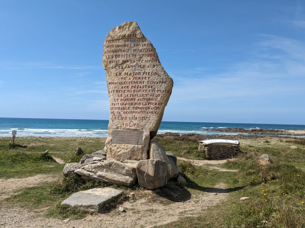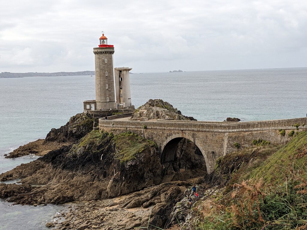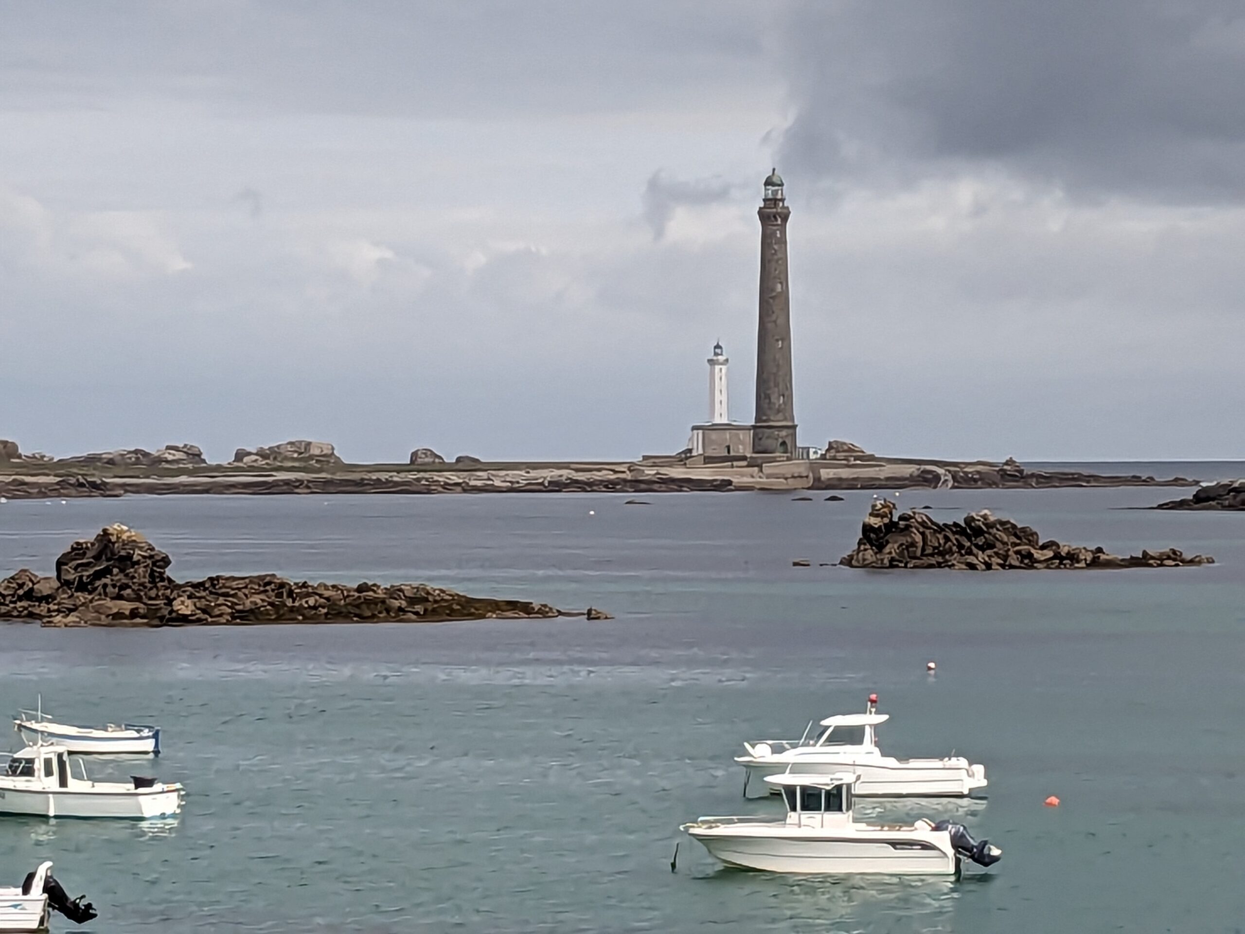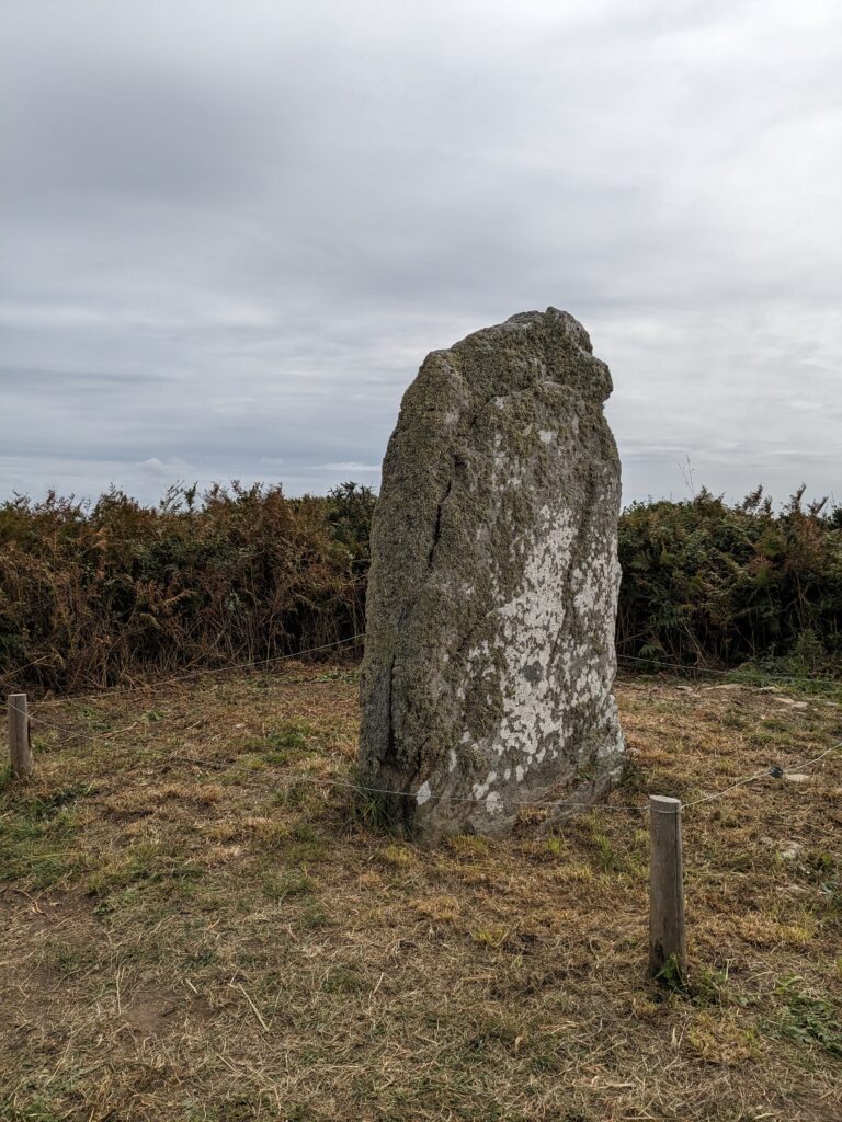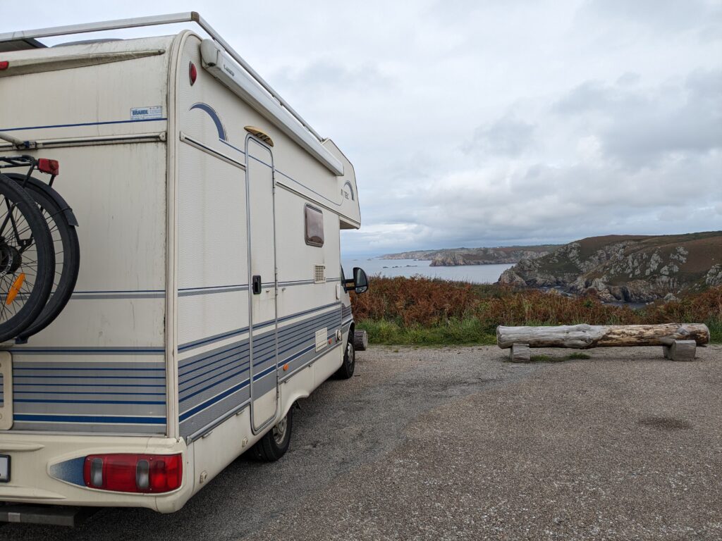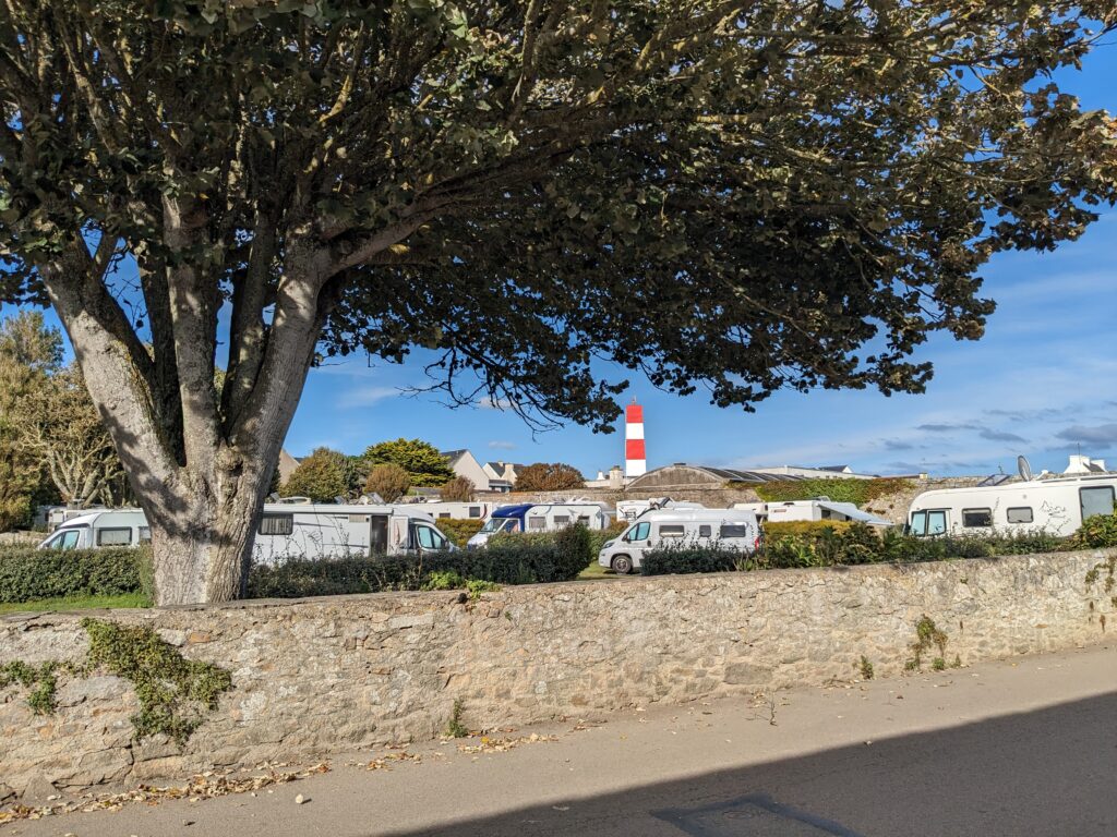 Heute ist das Wetter bewölkt und morgens haben wir nur 16 Grad, aber es ist trocken. Also alles gut. Wir starten Richtung Lilia. Es stehen Leuchttürme auf unserem Programm. Aber viel wichtiger ist die Baguette-Versorgung. Auch das ist hier kein Problem, nach ein paar km gibt es einen geöffneten Supermarkt! (Sonntags bis 13:00, ist hier ganz normal) Dann unser erstes Ziel. Der Phare de l’Ile Vierge. Mit knapp 83m der höchste Leuchtturm Europas. Wir müssen zwar etwas entfernt parken und den Rest zu Fuß gehen, aber es gibt Parkplätze, auch für Wohnmobile! Kostenlos! Nach dem Fototermin, fahren wir weiter Richtung Phare de Kermorvan. Aber vorher noch Mittagspause am einem Menhir bei Plouguin. Die Straße ist zwar etwas eng, aber parken geht. Frisch gestärkt geht es weiter. Vorbei am traumhaften Plage des Blancs Sablons zum Parkplatz des Leuchtturms. Es ist Sonntagnachmittag. Trotzdem finden wir ein Plätzchen zum Parken. Wieder kostenlos. Nur Campen dürfen wir nicht. Also einen Espresso aus der Akkumaschine und los. 15 Minuten und einen Menhir später stehen wir am Leuchtturm. Der ist gegen den anderen voll niedlich. Nach ausgiebiger Betrachtung traben wir zurück und fahren 11km zum Point St. Mathieu. Hier wartet ein Leuchtturm in einer Klosterruine und ein Labcache auf uns. Auch hier gibt es genügend Parkraum, auch für uns – und wieder: gratis! Schließlich sind genügend Fotos von diesem besonderen Ort gemacht und der Cache gelöst. Jetzt steht das Problem des Schlafplatzes an. Aber wir haben Glück, nur 5,4 km entfernt gibt es einen Stellplatz (90 Plätze) für 11,50€ mit Strom, einer Dusche, einem WC und einem Behinderten WC, sowie 10 Min. Frischwasser. Das Beste aber ist, die Aussicht auf die Halbinsel Crozon. Leider verschwindet der Abend im britischen, ach nein, bretonischen Landregen.