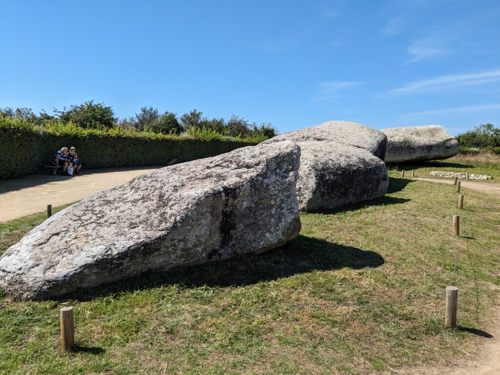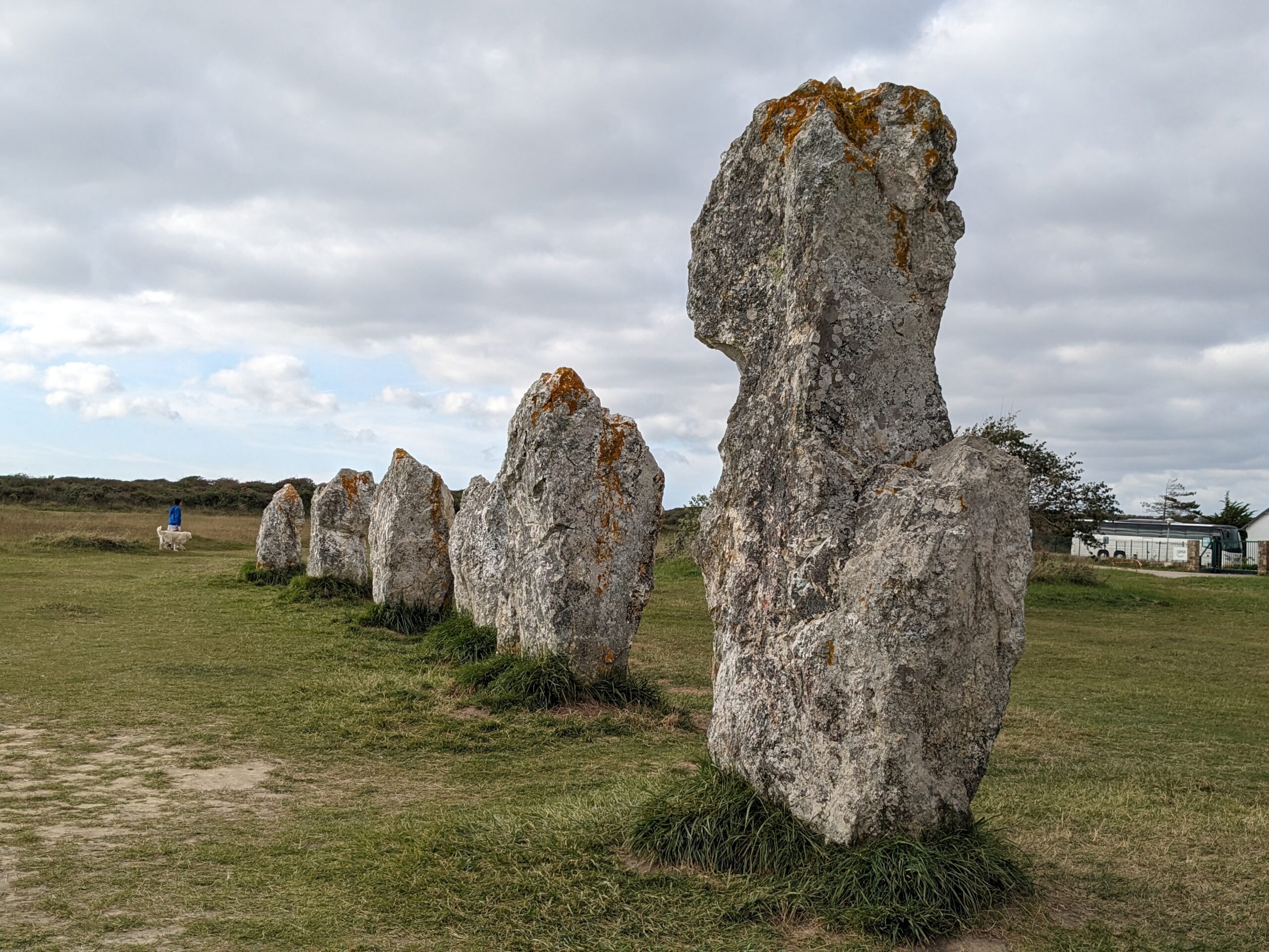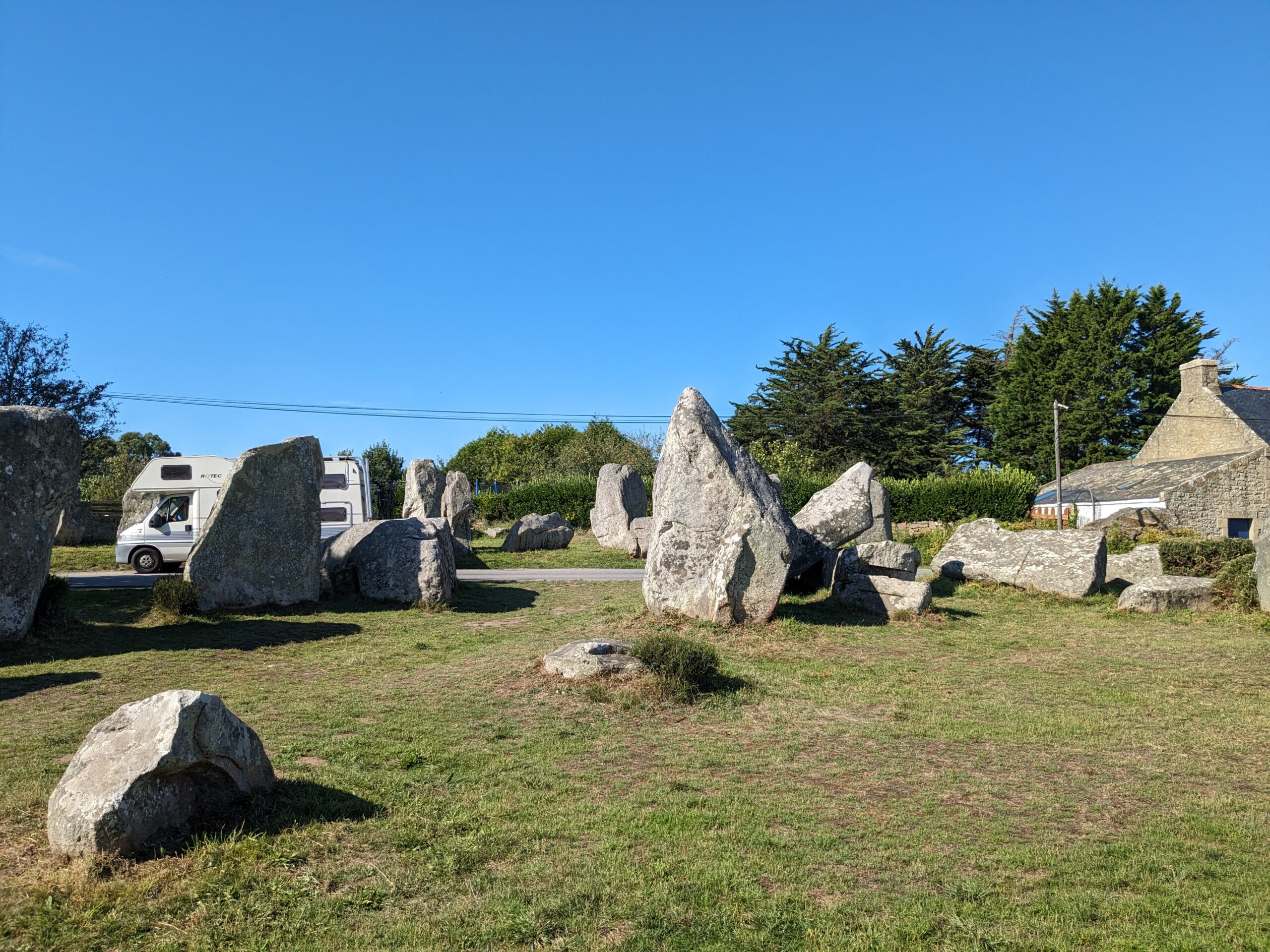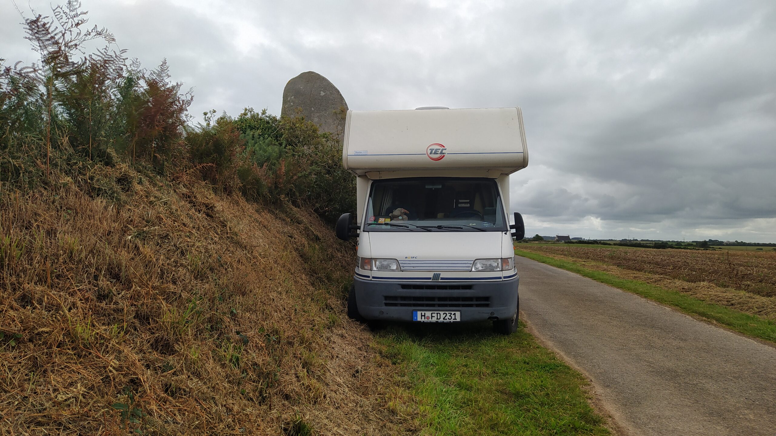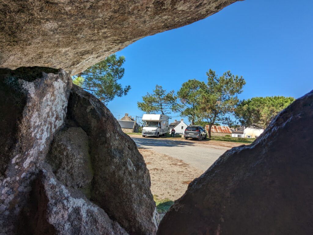 Schon beim Frühstück, mit Baguette vom Bächer mit Geldzählmaschine, scheint die Sonne, der Wetterbericht droht uns mit 30°. Wir starten an der Küste entlang, das ist aber nicht wirklich zielführend, es gibt einfach nicht genug Straßen. Also doch auf der D781 Richtung Carnac, kurz hinter Erdeven stossen wir bei Kerzerho auf die ersten Steinreihen, bei Crucuno steht ein Dolmen im Dorf und ein kleines Stückchen weiter einer im Wald. Dann nähern wir uns Carnac. Hier sieht Maps nur rot! Wir entschließen uns, das Chaos weiträumig zu umgehen und fahren am Strand entlang. Unser nächstes Ziel ist Locmariaquer, wir haben jetzt 30° und eigentlich ist es zu warm für irgendwas, aber wir gehen los, hier gibt es Tumuli und einen kaputten Riesenmenhir, der war mal über 20 m hoch (für 6,-€/Per). Nachdem alles ausgiebig fotografiert ist, versuchen wir unser Glück auf einem Stellplatz am Meer beim Point de Kerpenhir. Es sind noch 4 Plätze frei ganz hinten in der Ecke bei der Entsorgung. Nein danke! Also alles wieder zurück und über Auray nach Arradon. Hier gibt es laut App noch 22 freie Plätze. Um 15:00 erreichen wir den Stellplatz, ach nein, den Camping Municipal, nach kurzer Irritation ist klar, der Stellplatz ist nebenan, nur durch ein Holzzäunchen getrennt. Also flux um die Ecke gefahren, Wobi geparkt und faul sein. Nach dem obligatorischen SonnenuntergangsbeobachtungswartenmitvielrauchenundFliegenverscheuchen 😉 (mit dem Fahrrad) haben wir nochmal auf dem Platz umgeparkt, Jugendliche trugen ihre Zelte ziemlich knapp neben uns um und klimpern mit Flaschen.