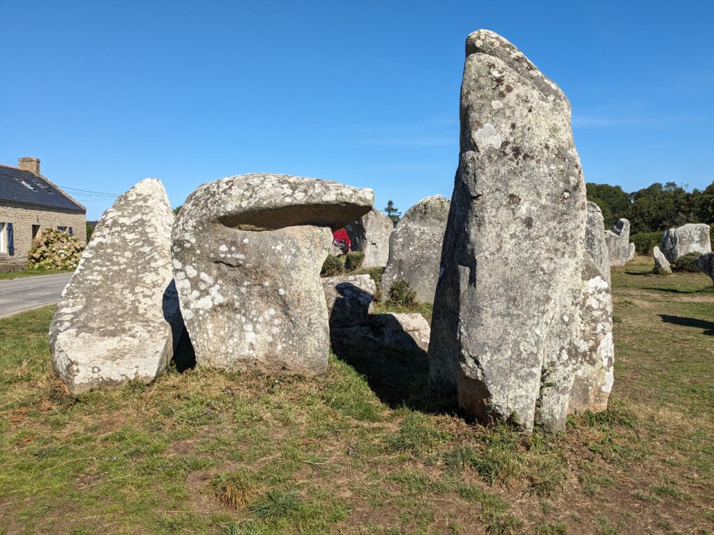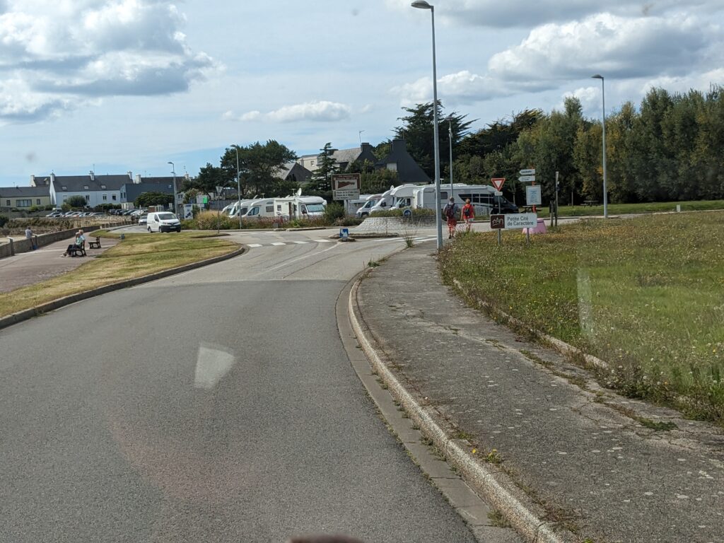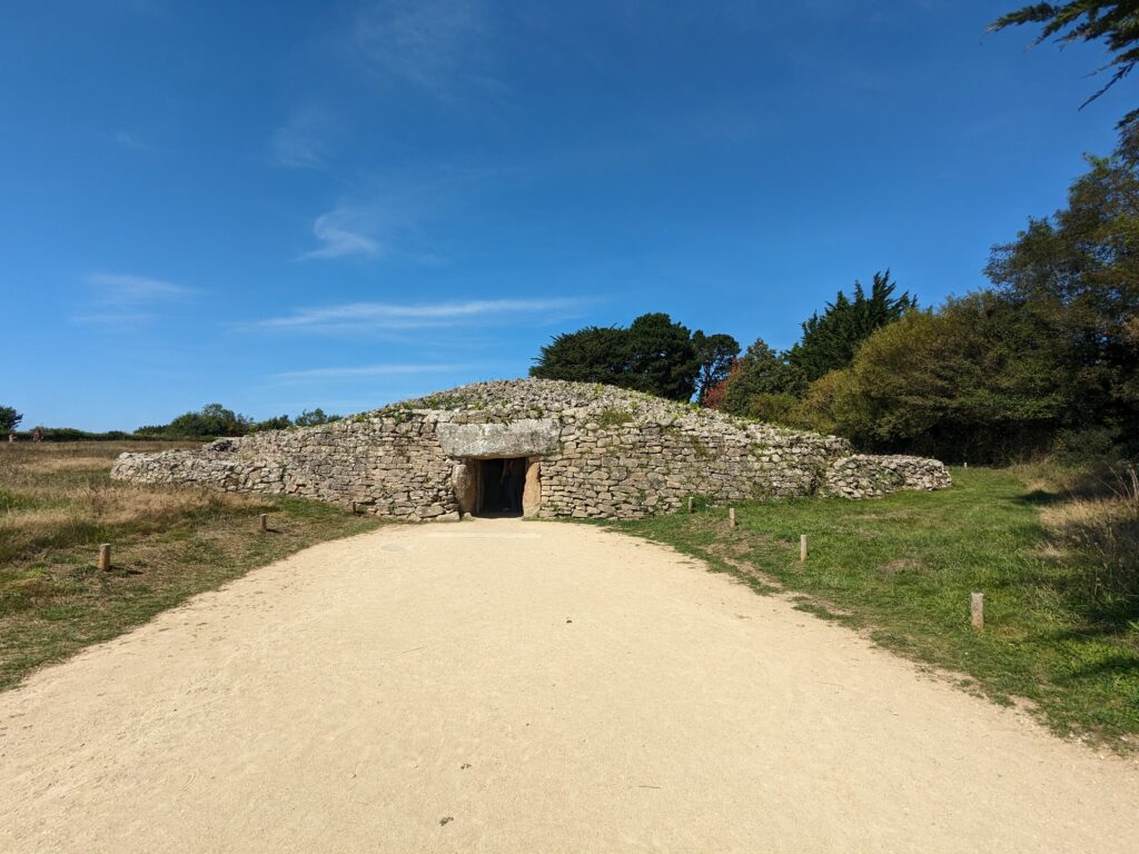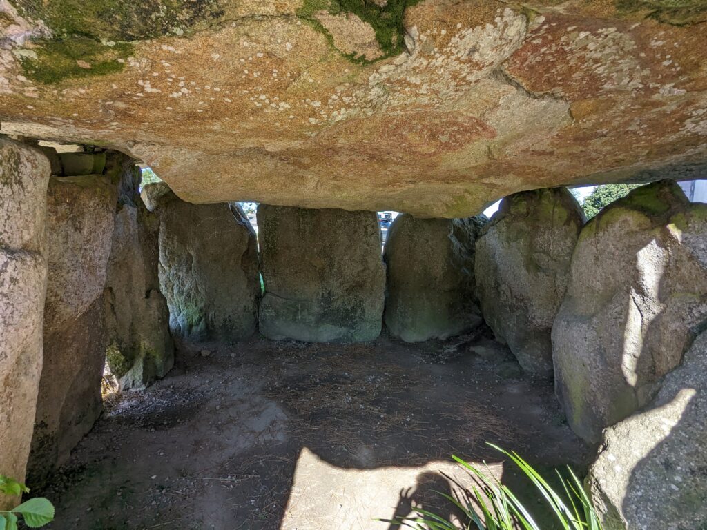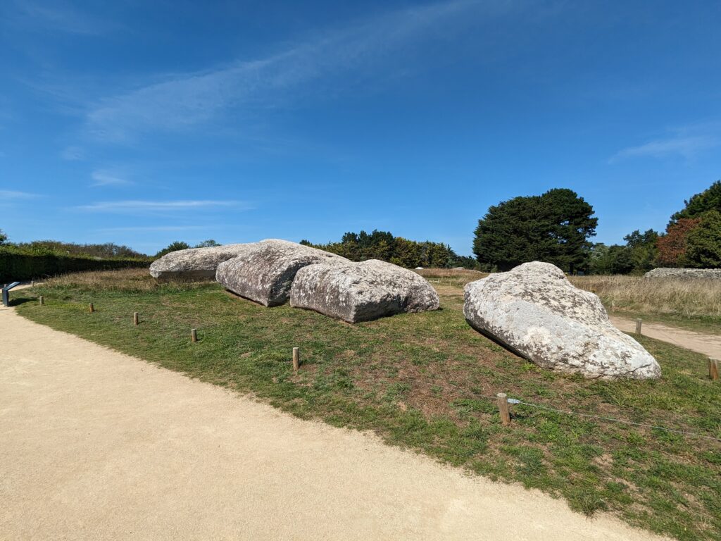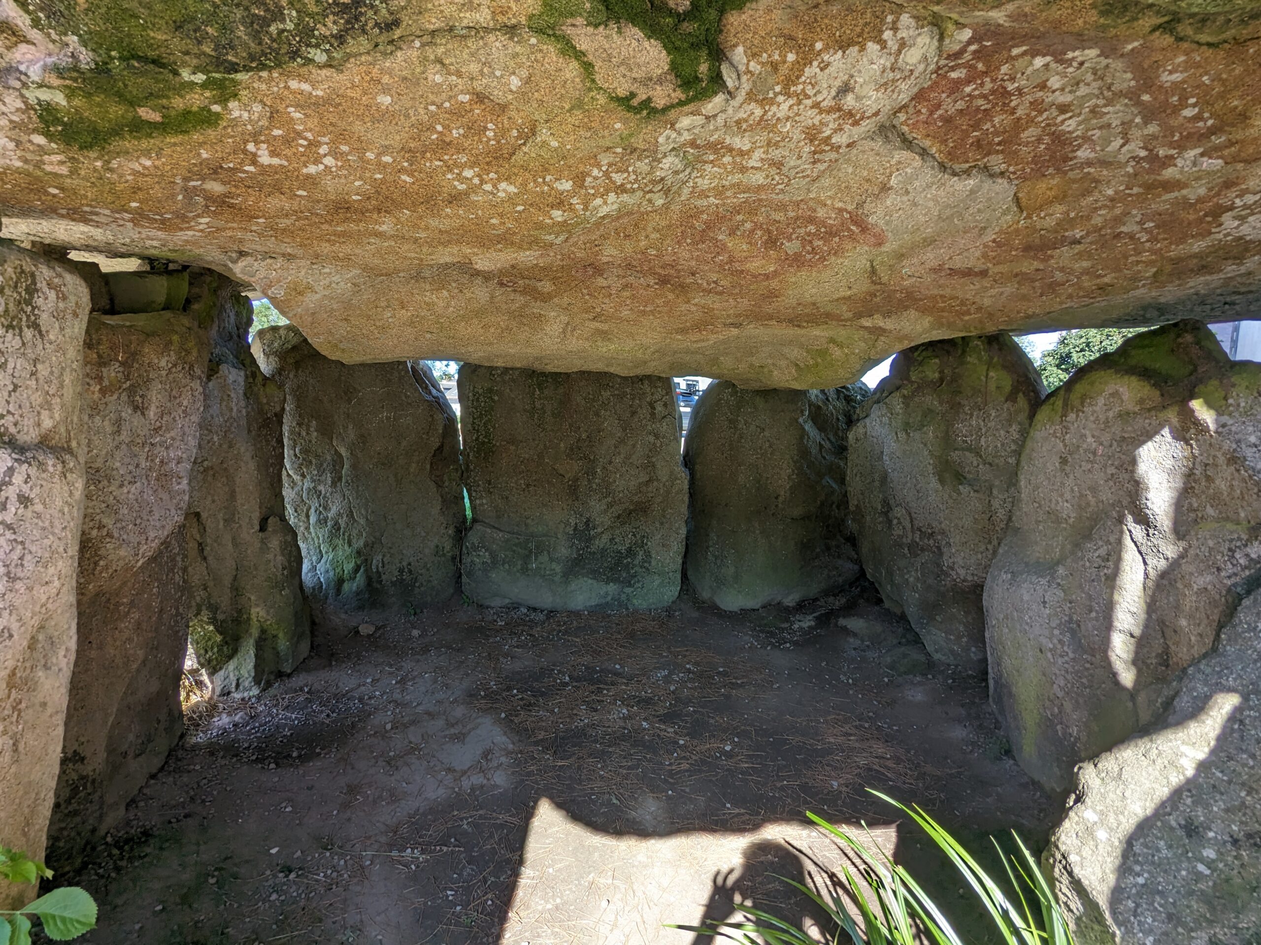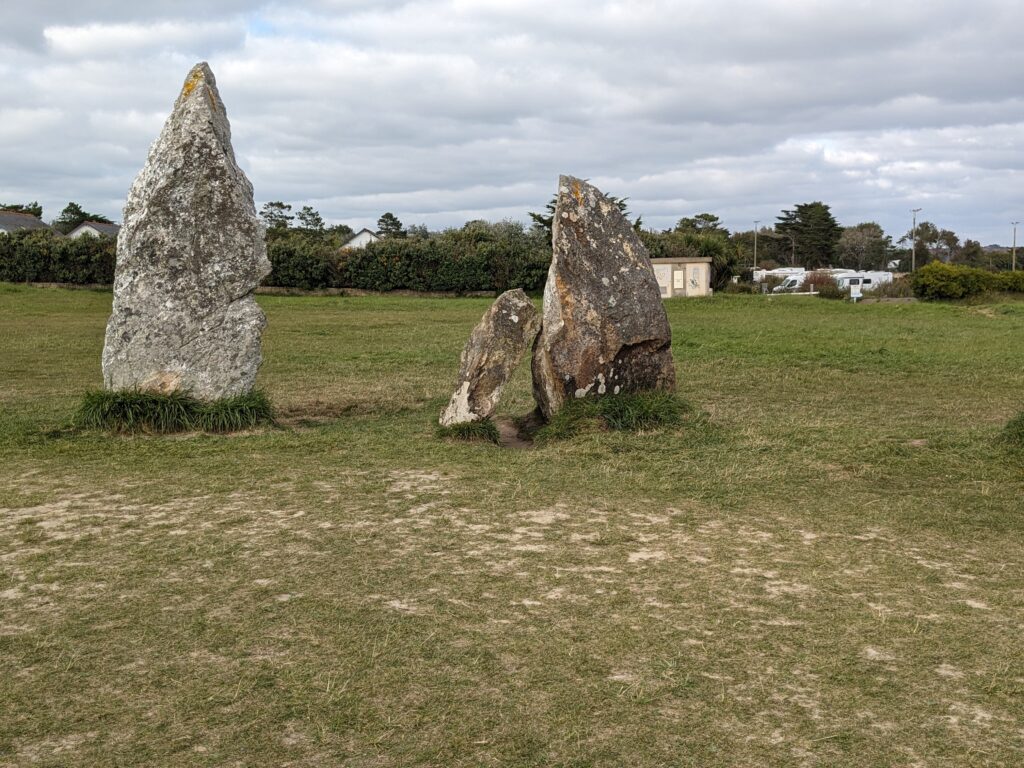 Schon beim Frühstück, mit Baguette vom Bächer mit Geldzählmaschine, scheint die Sonne, der Wetterbericht droht uns mit 30°. Wir starten an der Küste entlang, das ist aber nicht wirklich zielführend, es gibt einfach nicht genug Straßen. Also doch auf der D781 Richtung Carnac, kurz hinter Erdeven stossen wir bei Kerzerho auf die ersten Steinreihen, bei Crucuno steht ein Dolmen im Dorf und ein kleines Stückchen weiter einer im Wald. Dann nähern wir uns Carnac. Hier sieht Maps nur rot! Wir entschließen uns, das Chaos weiträumig zu umgehen und fahren am Strand entlang. Unser nächstes Ziel ist Locmariaquer, wir haben jetzt 30° und eigentlich ist es zu warm für irgendwas, aber wir gehen los, hier gibt es Tumuli und einen kaputten Riesenmenhir, der war mal über 20 m hoch (für 6,-€/Per). Nachdem alles ausgiebig fotografiert ist, versuchen wir unser Glück auf einem Stellplatz am Meer beim Point de Kerpenhir. Es sind noch 4 Plätze frei ganz hinten in der Ecke bei der Entsorgung. Nein danke! Also alles wieder zurück und über Auray nach Arradon. Hier gibt es laut App noch 22 freie Plätze. Um 15:00 erreichen wir den Stellplatz, ach nein, den Camping Municipal, nach kurzer Irritation ist klar, der Stellplatz ist nebenan, nur durch ein Holzzäunchen getrennt. Also flux um die Ecke gefahren, Wobi geparkt und faul sein. Nach dem obligatorischen SonnenuntergangsbeobachtungswartenmitvielrauchenundFliegenverscheuchen 😉 (mit dem Fahrrad) haben wir nochmal auf dem Platz umgeparkt, Jugendliche trugen ihre Zelte ziemlich knapp neben uns um und klimpern mit Flaschen.