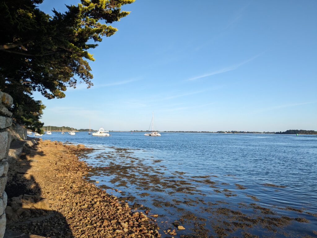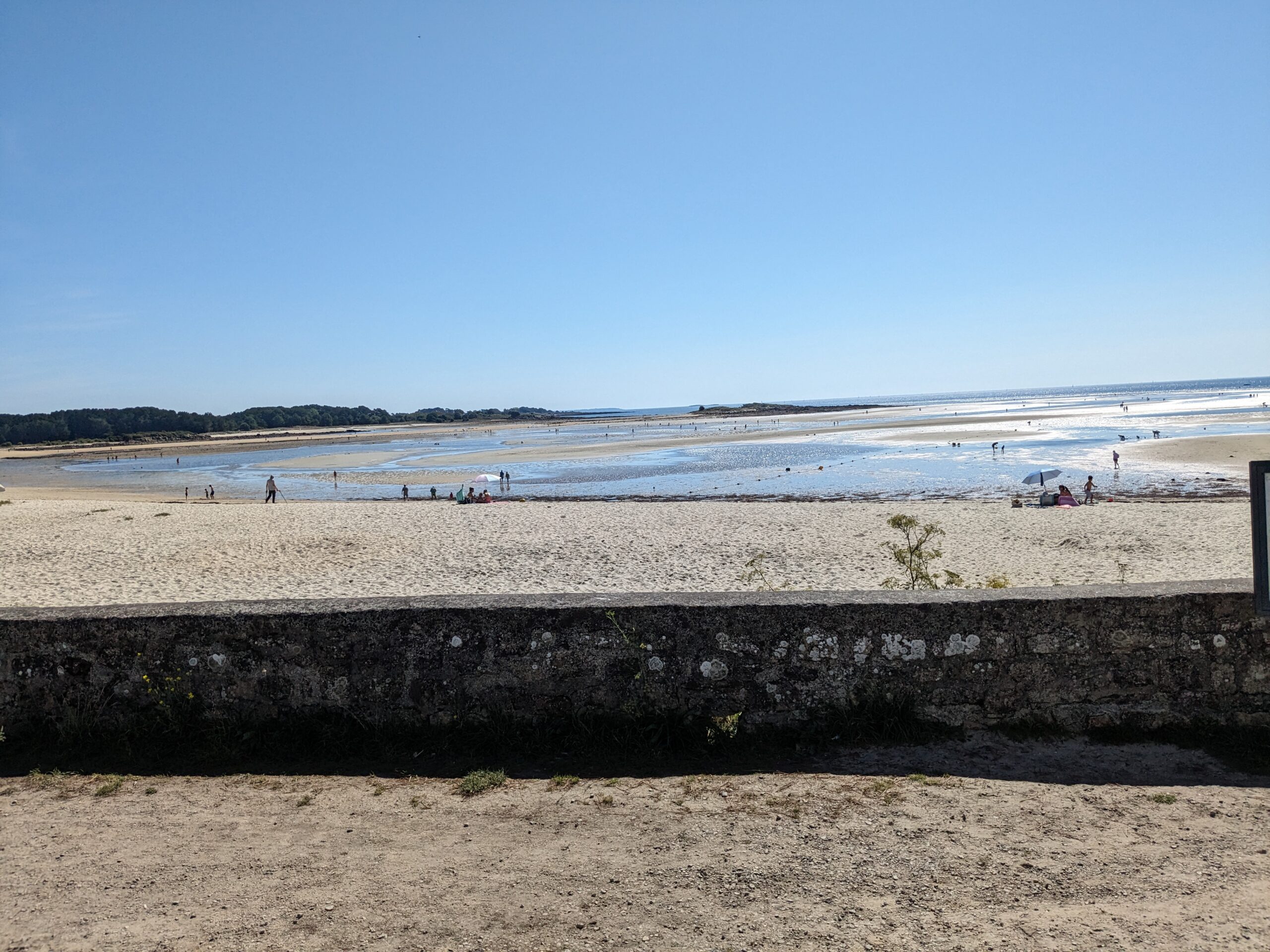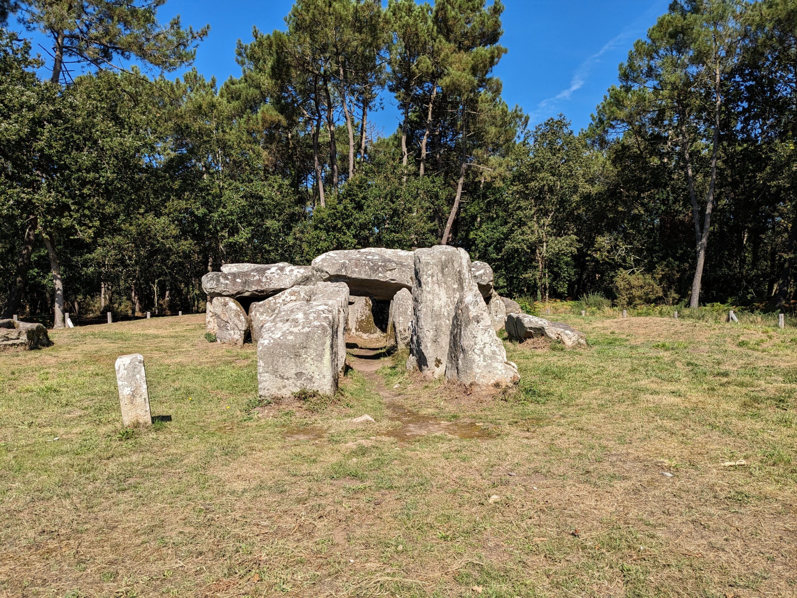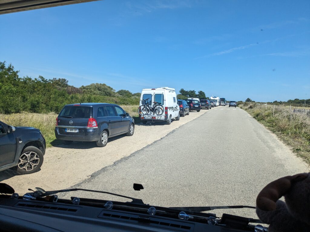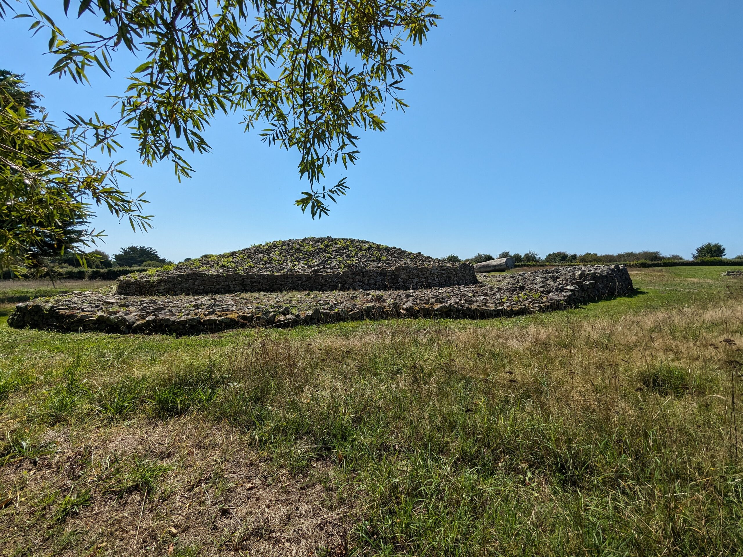 Schon beim Frühstück, mit Baguette vom Bächer mit Geldzählmaschine, scheint die Sonne, der Wetterbericht droht uns mit 30°. Wir starten an der Küste entlang, das ist aber nicht wirklich zielführend, es gibt einfach nicht genug Straßen. Also doch auf der D781 Richtung Carnac, kurz hinter Erdeven stossen wir bei Kerzerho auf die ersten Steinreihen, bei Crucuno steht ein Dolmen im Dorf und ein kleines Stückchen weiter einer im Wald. Dann nähern wir uns Carnac. Hier sieht Maps nur rot! Wir entschließen uns, das Chaos weiträumig zu umgehen und fahren am Strand entlang. Unser nächstes Ziel ist Locmariaquer, wir haben jetzt 30° und eigentlich ist es zu warm für irgendwas, aber wir gehen los, hier gibt es Tumuli und einen kaputten Riesenmenhir, der war mal über 20 m hoch (für 6,-€/Per). Nachdem alles ausgiebig fotografiert ist, versuchen wir unser Glück auf einem Stellplatz am Meer beim Point de Kerpenhir. Es sind noch 4 Plätze frei ganz hinten in der Ecke bei der Entsorgung. Nein danke! Also alles wieder zurück und über Auray nach Arradon. Hier gibt es laut App noch 22 freie Plätze. Um 15:00 erreichen wir den Stellplatz, ach nein, den Camping Municipal, nach kurzer Irritation ist klar, der Stellplatz ist nebenan, nur durch ein Holzzäunchen getrennt. Also flux um die Ecke gefahren, Wobi geparkt und faul sein. Nach dem obligatorischen SonnenuntergangsbeobachtungswartenmitvielrauchenundFliegenverscheuchen 😉 (mit dem Fahrrad) haben wir nochmal auf dem Platz umgeparkt, Jugendliche trugen ihre Zelte ziemlich knapp neben uns um und klimpern mit Flaschen.