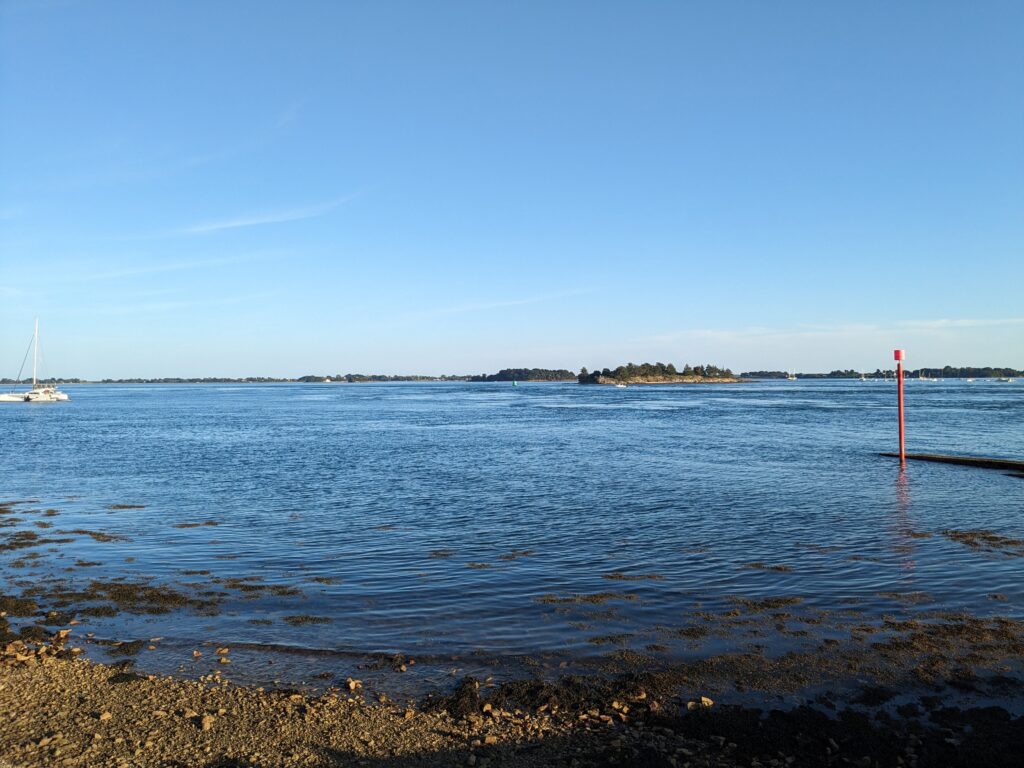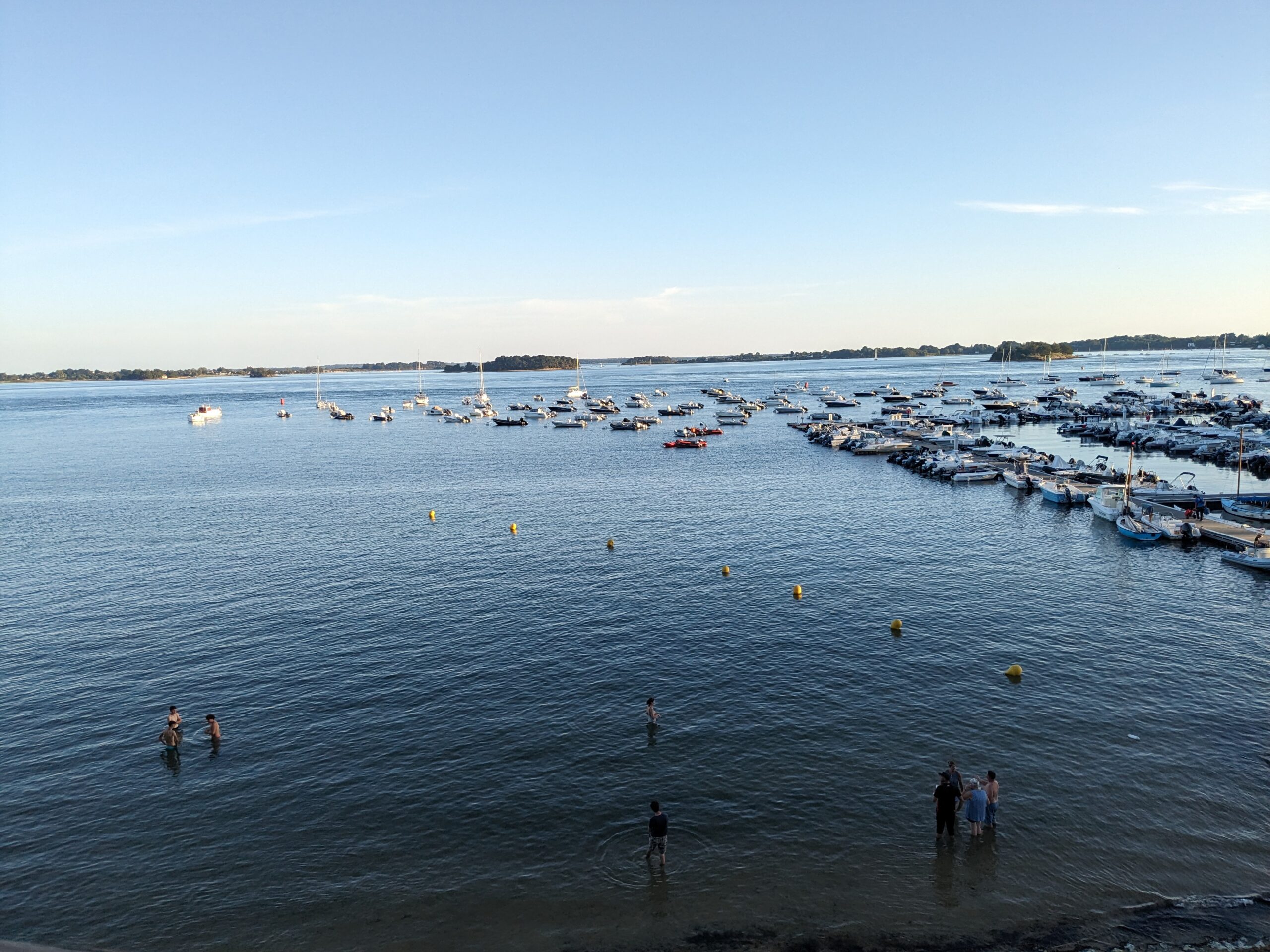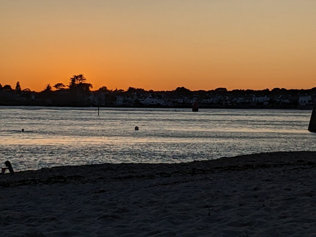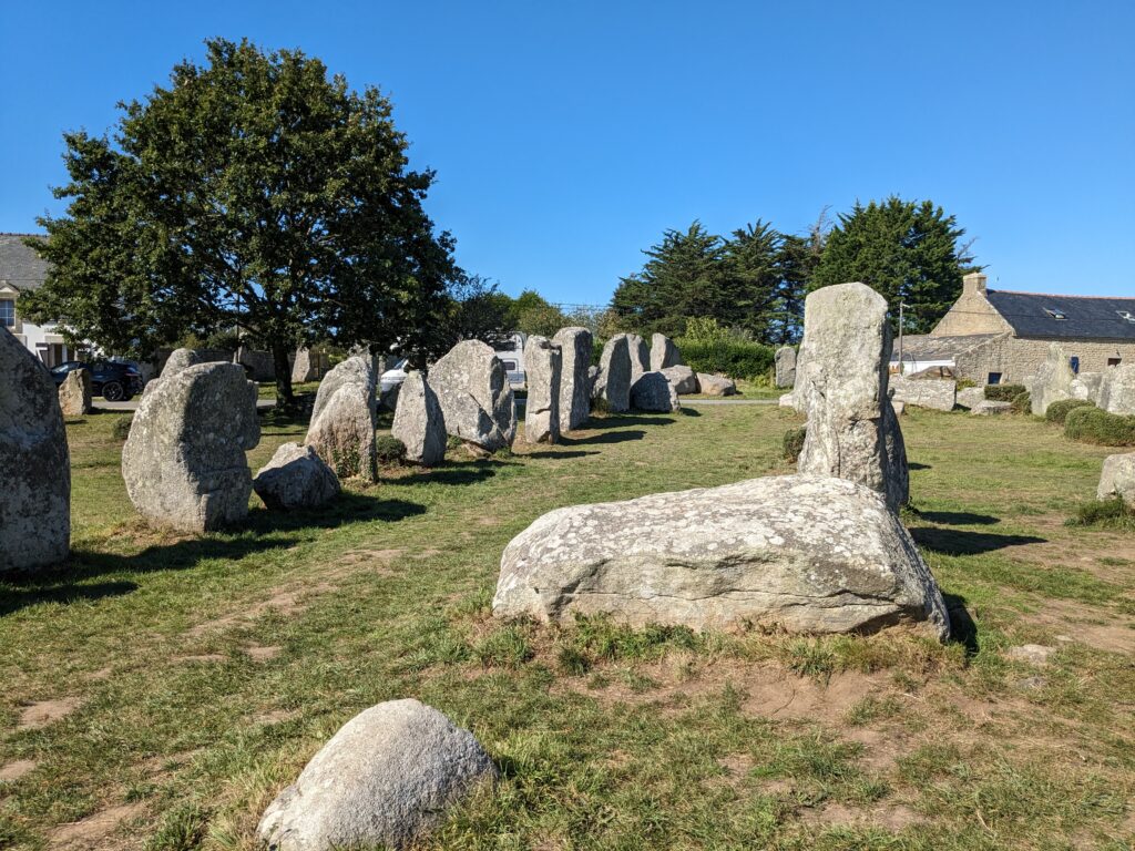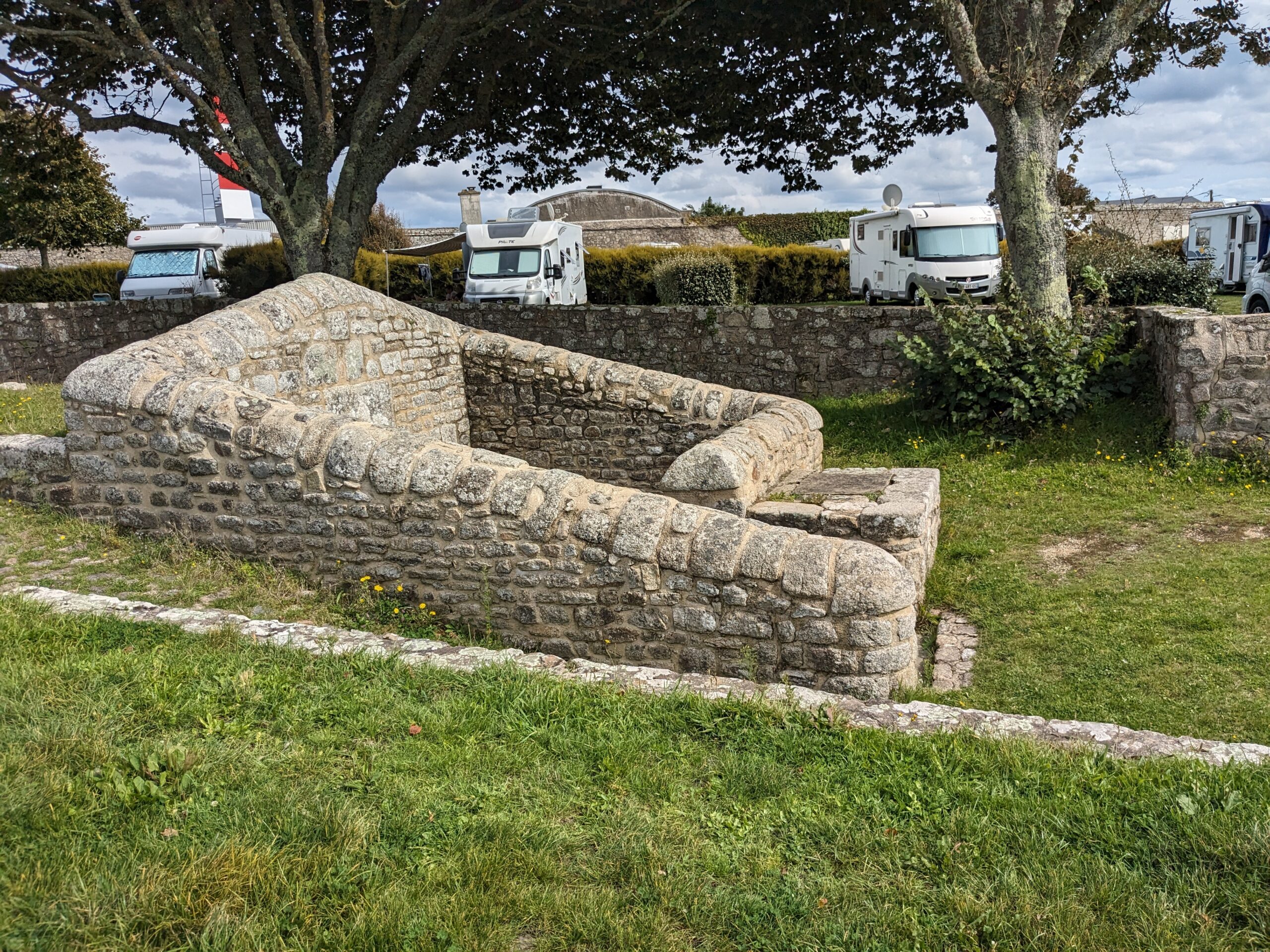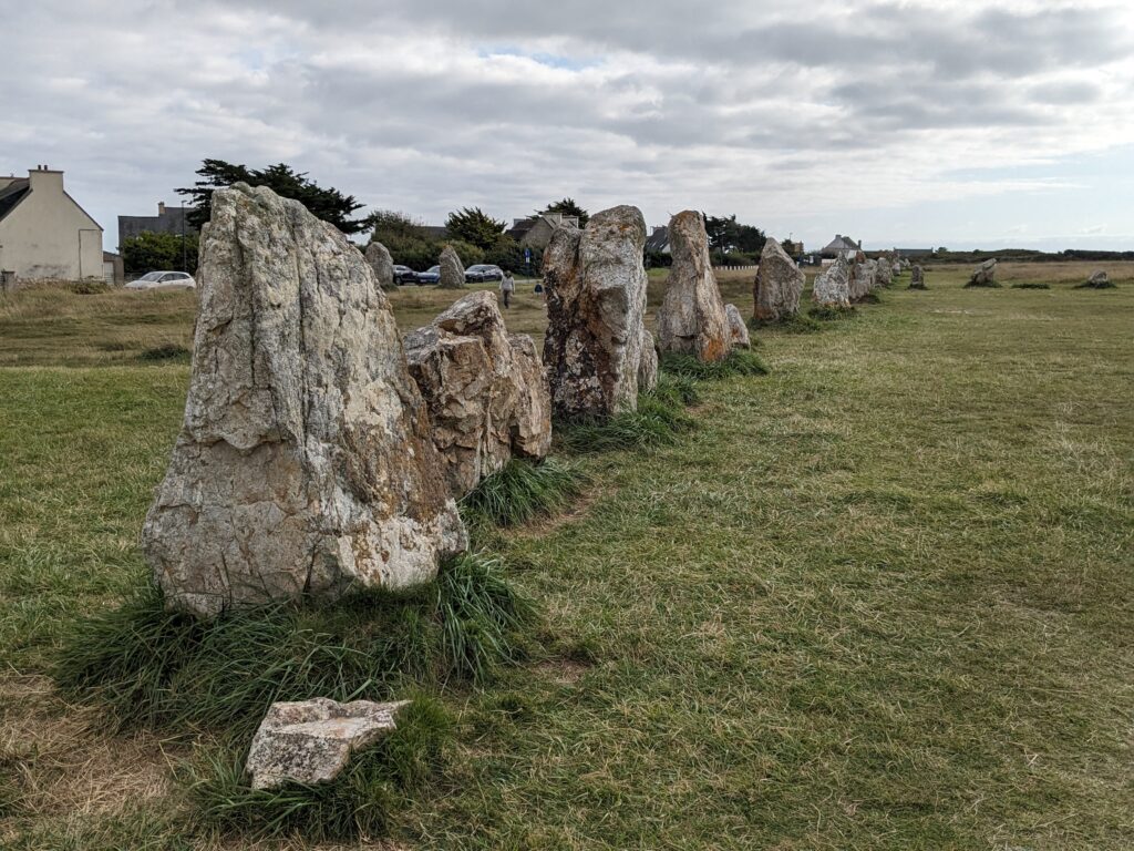Schon beim Frühstück, mit Baguette vom Bächer mit Geldzählmaschine, scheint die Sonne, der Wetterbericht droht uns mit 30°. Wir starten an der Küste entlang, das ist aber nicht wirklich zielführend, es gibt einfach nicht genug Straßen. Also doch auf der D781 Richtung Carnac, kurz hinter Erdeven stossen wir bei Kerzerho auf die ersten Steinreihen, bei Crucuno steht ein Dolmen im Dorf und ein kleines Stückchen weiter einer im Wald. Dann nähern wir uns Carnac. Hier sieht Maps nur rot! Wir entschließen uns, das Chaos weiträumig zu umgehen und fahren am Strand entlang. Unser nächstes Ziel ist Locmariaquer, wir haben jetzt 30° und eigentlich ist es zu warm für irgendwas, aber wir gehen los, hier gibt es Tumuli und einen kaputten Riesenmenhir, der war mal über 20 m hoch (für 6,-€/Per). Nachdem alles ausgiebig fotografiert ist, versuchen wir unser Glück auf einem Stellplatz am Meer beim Point de Kerpenhir. Es sind noch 4 Plätze frei ganz hinten in der Ecke bei der Entsorgung. Nein danke! Also alles wieder zurück und über Auray nach Arradon. Hier gibt es laut App noch 22 freie Plätze. Um 15:00 erreichen wir den Stellplatz, ach nein, den Camping Municipal, nach kurzer Irritation ist klar, der Stellplatz ist nebenan, nur durch ein Holzzäunchen getrennt. Also flux um die Ecke gefahren, Wobi geparkt und faul sein. Nach dem obligatorischen SonnenuntergangsbeobachtungswartenmitvielrauchenundFliegenverscheuchen 😉 (mit dem Fahrrad) haben wir nochmal auf dem Platz umgeparkt, Jugendliche trugen ihre Zelte ziemlich knapp neben uns um und klimpern mit Flaschen.