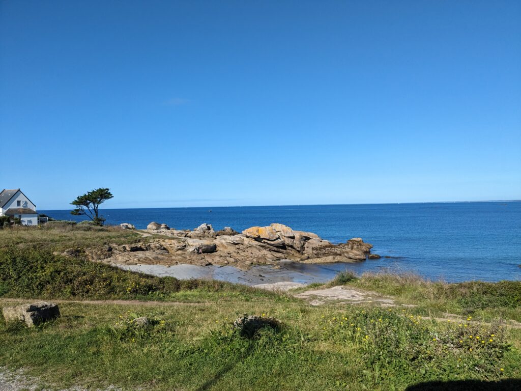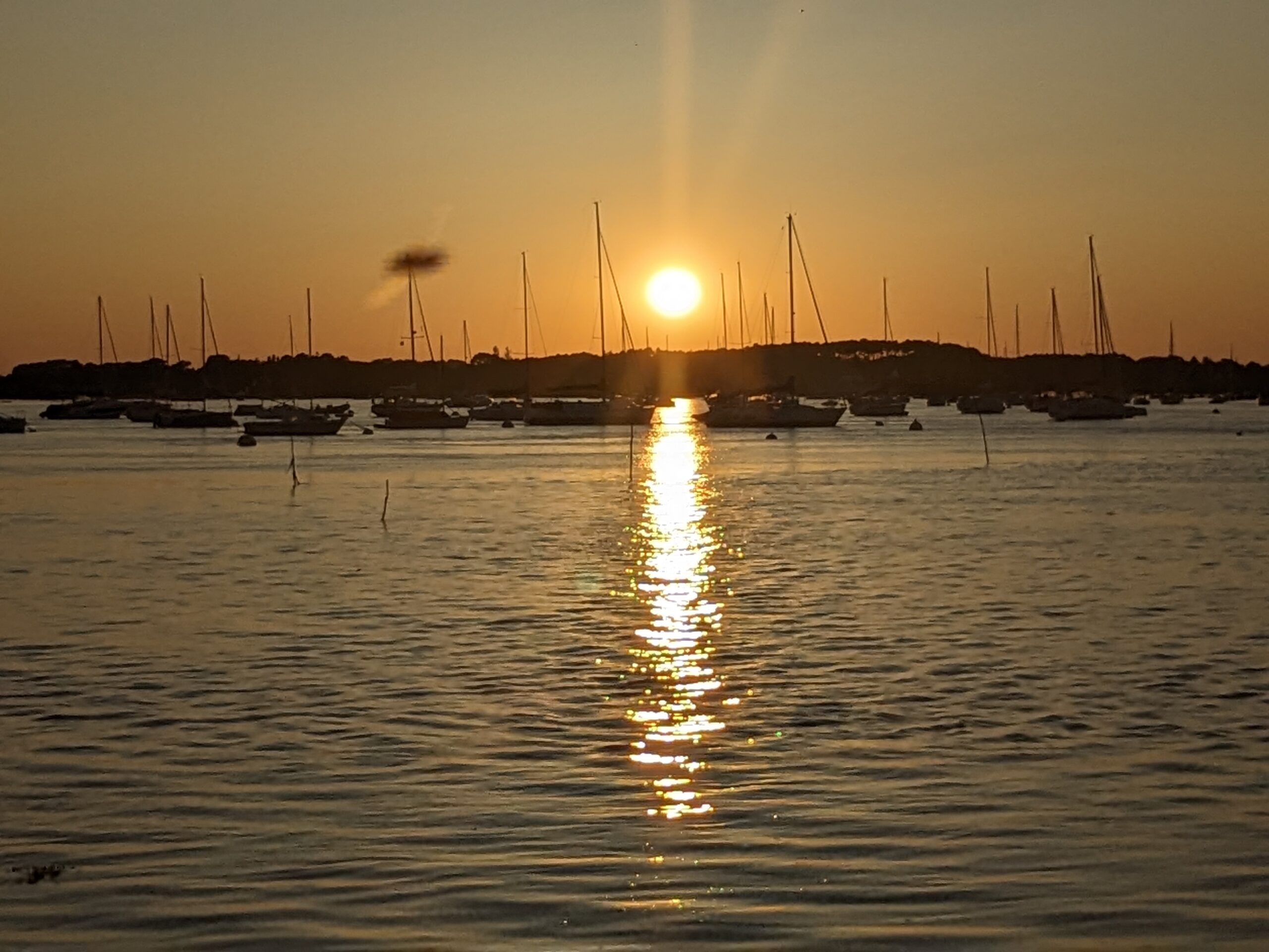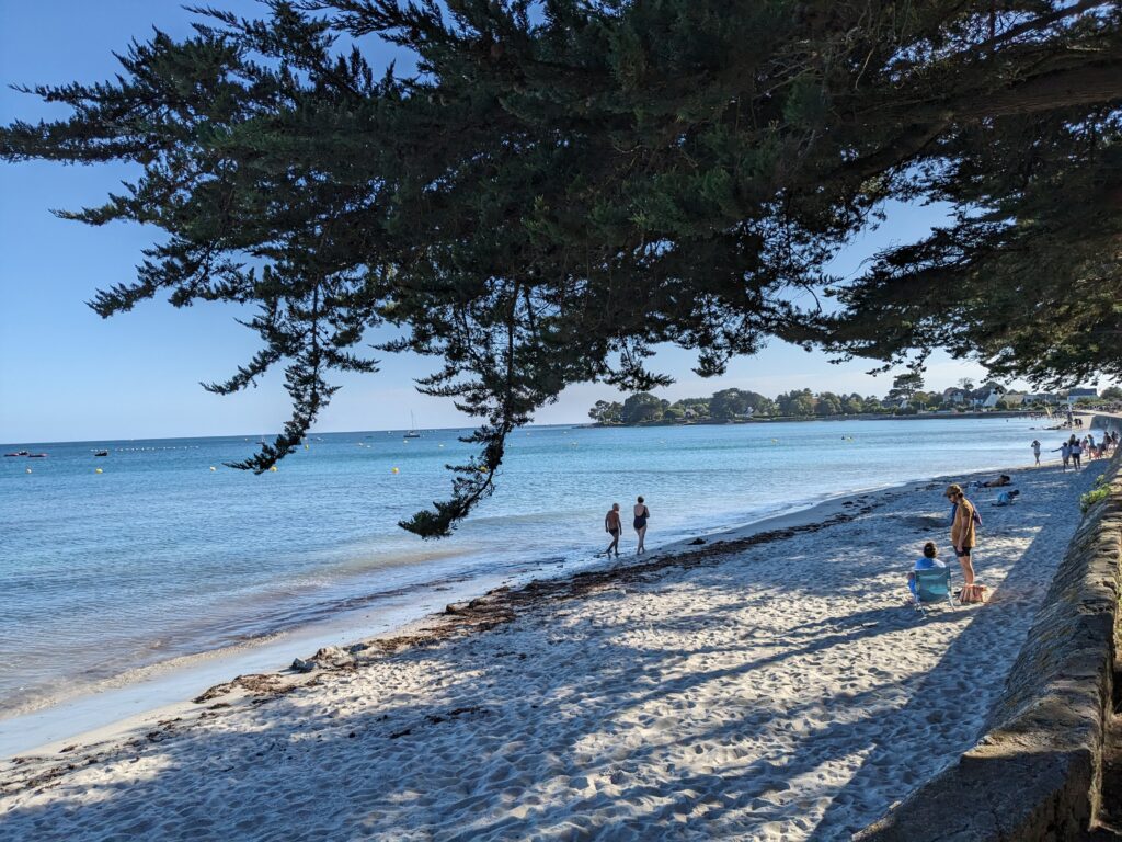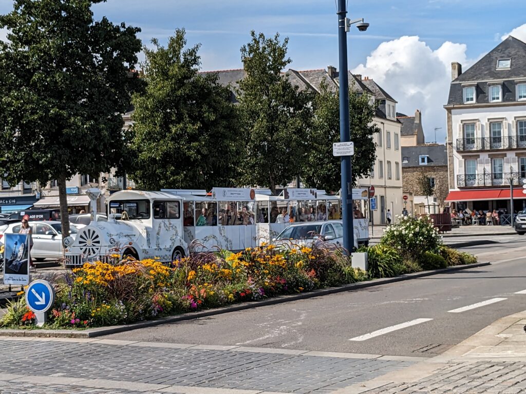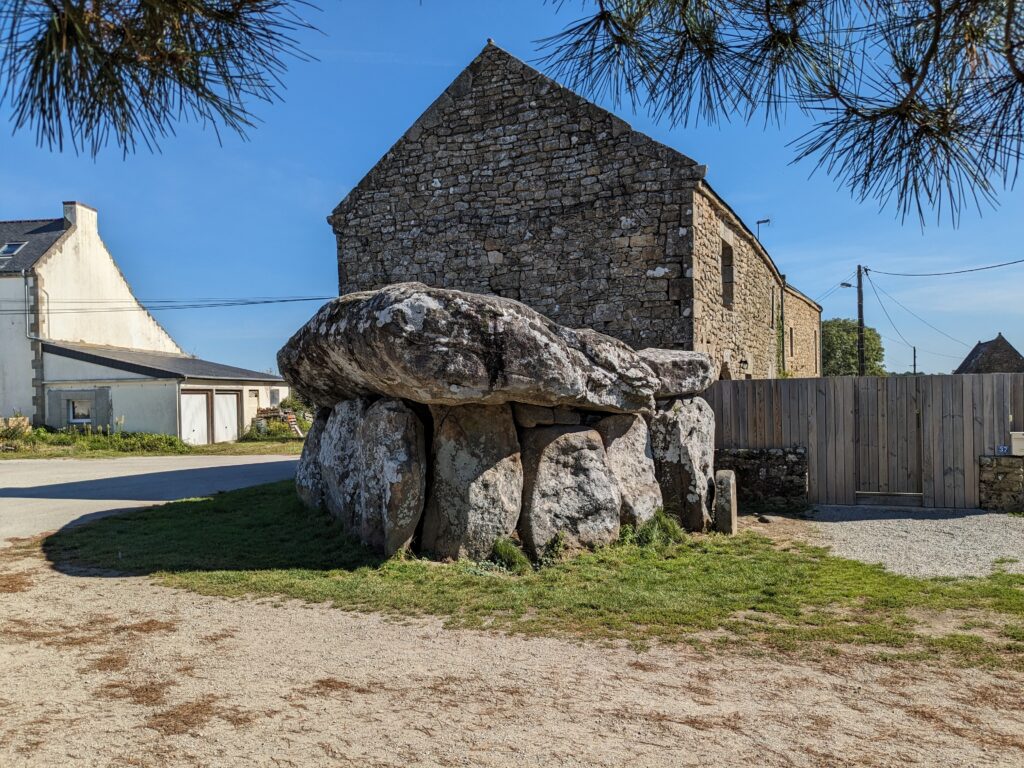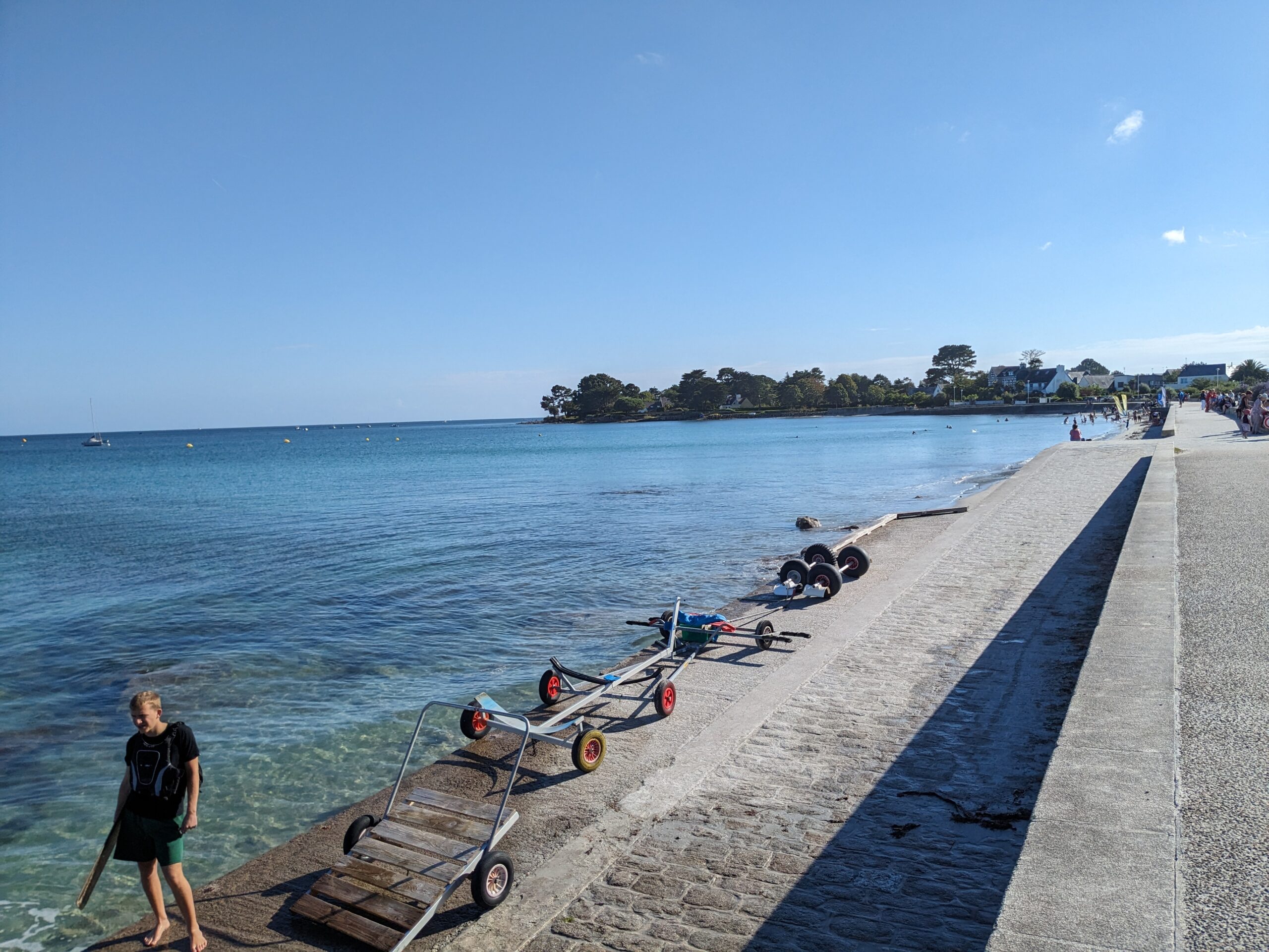 Schon beim Frühstück, mit Baguette vom Bächer mit Geldzählmaschine, scheint die Sonne, der Wetterbericht droht uns mit 30°. Wir starten an der Küste entlang, das ist aber nicht wirklich zielführend, es gibt einfach nicht genug Straßen. Also doch auf der D781 Richtung Carnac, kurz hinter Erdeven stossen wir bei Kerzerho auf die ersten Steinreihen, bei Crucuno steht ein Dolmen im Dorf und ein kleines Stückchen weiter einer im Wald. Dann nähern wir uns Carnac. Hier sieht Maps nur rot! Wir entschließen uns, das Chaos weiträumig zu umgehen und fahren am Strand entlang. Unser nächstes Ziel ist Locmariaquer, wir haben jetzt 30° und eigentlich ist es zu warm für irgendwas, aber wir gehen los, hier gibt es Tumuli und einen kaputten Riesenmenhir, der war mal über 20 m hoch (für 6,-€/Per). Nachdem alles ausgiebig fotografiert ist, versuchen wir unser Glück auf einem Stellplatz am Meer beim Point de Kerpenhir. Es sind noch 4 Plätze frei ganz hinten in der Ecke bei der Entsorgung. Nein danke! Also alles wieder zurück und über Auray nach Arradon. Hier gibt es laut App noch 22 freie Plätze. Um 15:00 erreichen wir den Stellplatz, ach nein, den Camping Municipal, nach kurzer Irritation ist klar, der Stellplatz ist nebenan, nur durch ein Holzzäunchen getrennt. Also flux um die Ecke gefahren, Wobi geparkt und faul sein. Nach dem obligatorischen SonnenuntergangsbeobachtungswartenmitvielrauchenundFliegenverscheuchen 😉 (mit dem Fahrrad) haben wir nochmal auf dem Platz umgeparkt, Jugendliche trugen ihre Zelte ziemlich knapp neben uns um und klimpern mit Flaschen.