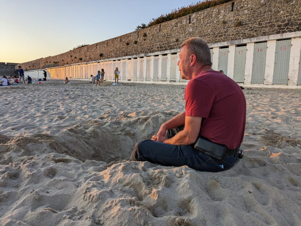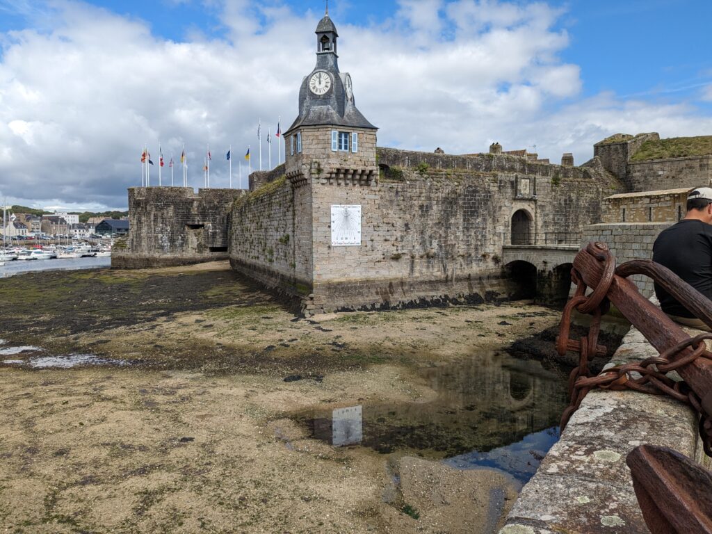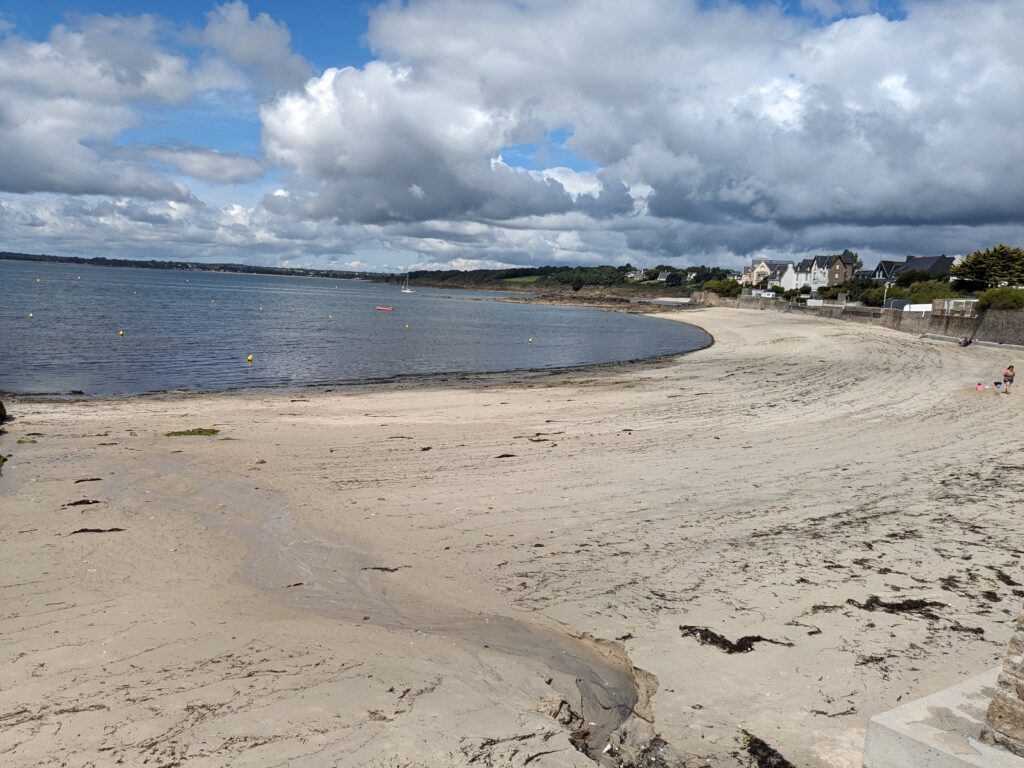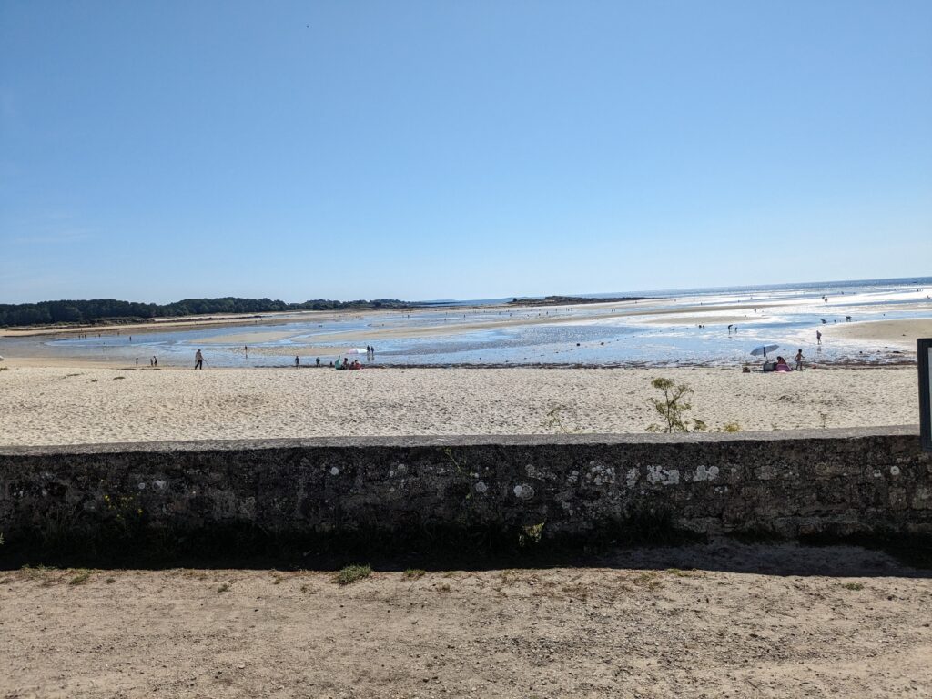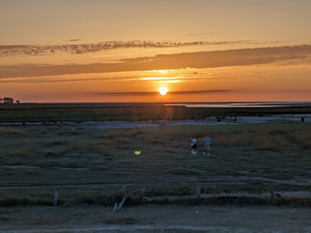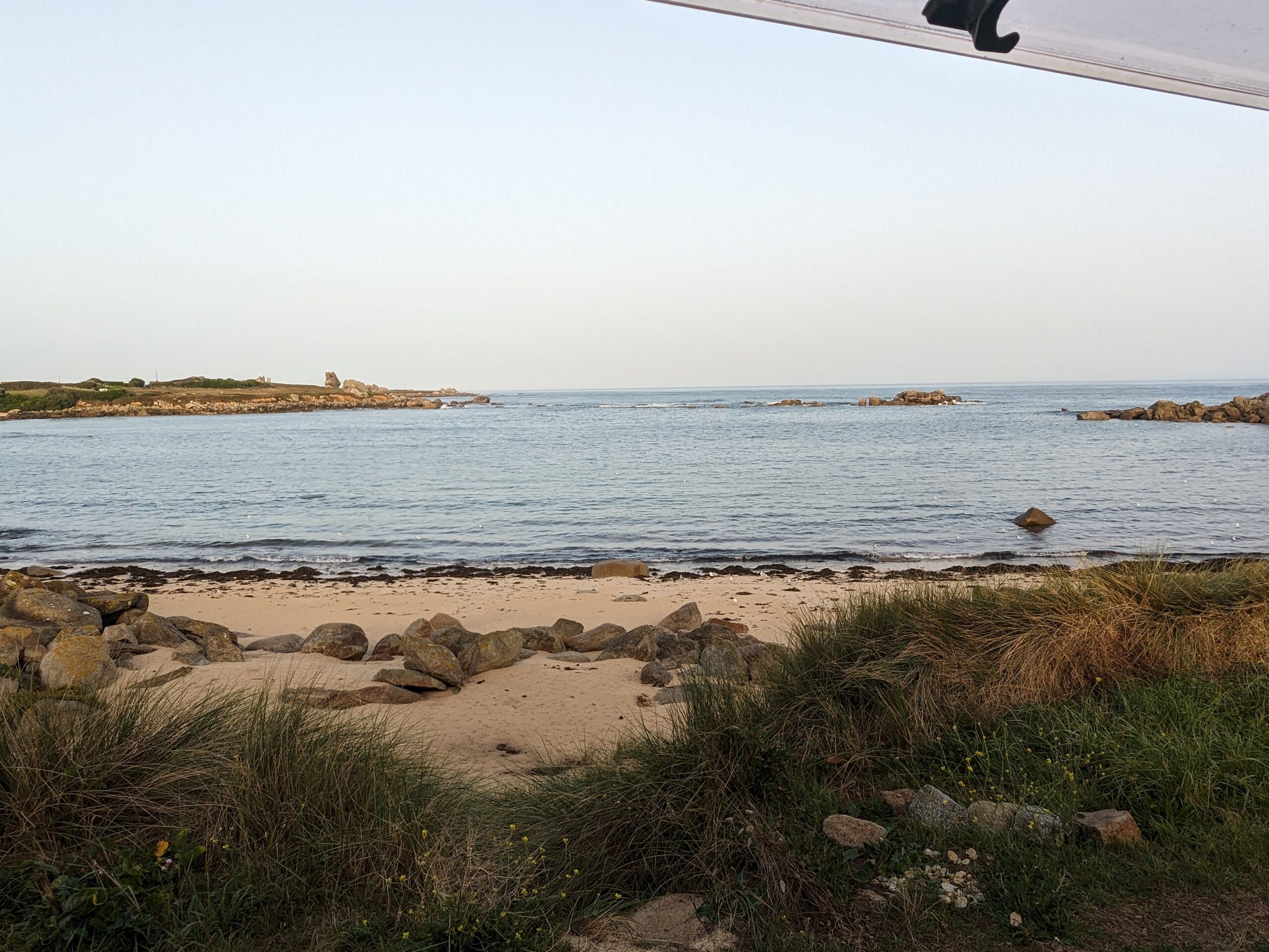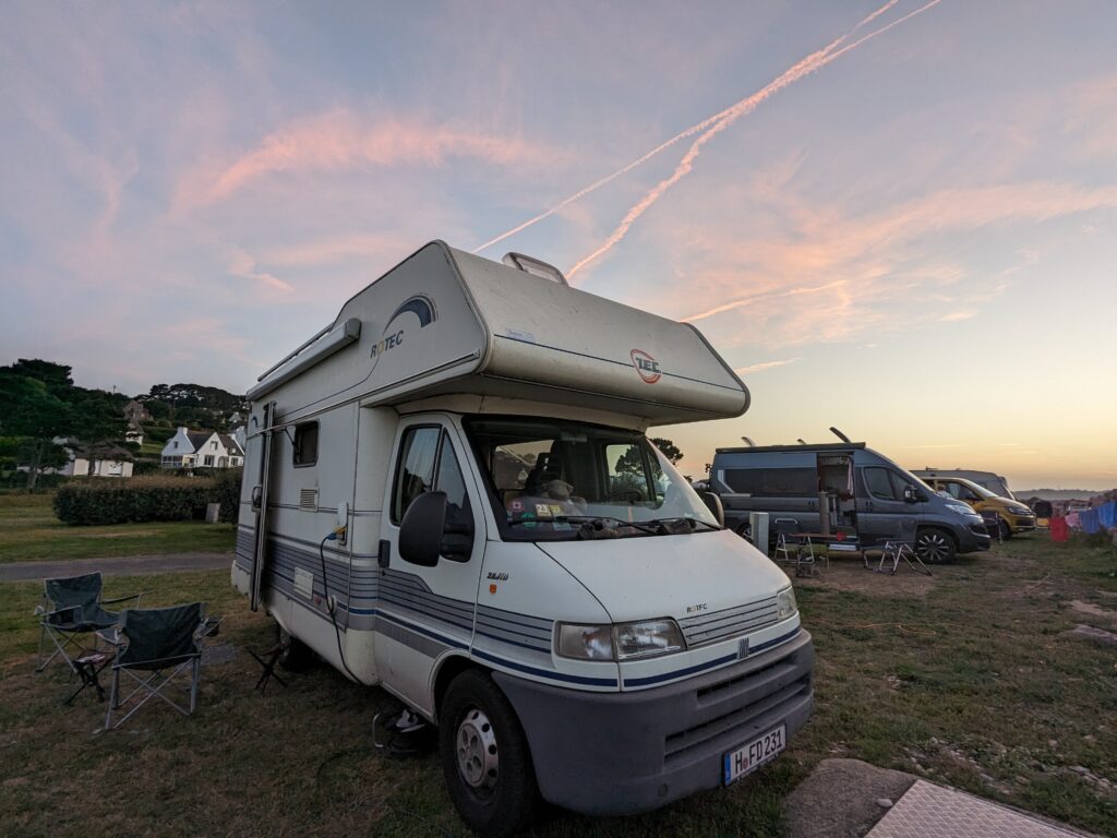 Als wir gestern Abend so auf den Golf von Morbihan gestarrt haben, war uns beiden klar, dass das nicht unsere Bretagne ist. Hat was von der Mecklenburger Seenplatte, nur zeitweise ohne Wasser. Ich weiß, das ist jetzt jammern auf hohem Niveau, aber nach nicht einmal 2 Minuten stand die Entscheidung, wir fahren zurück ans Meer, ans richtige Meer! Die gute Nachricht, die Kids haben keinen Lärm gemacht, trotzdem war die Nacht etwas unruhig. Es war sehr warm, deshalb offene Fenster und irgendwer hat Eicheln aufs Auto geschmissen. Wir haben auf der Flucht vor den vermeintlich lauten Kids unter einer Eiche geparkt. Dumm gelaufen. Trotzdem geht es kurz nach 10:00 los, Mittags sind wir in Pleyben. Hier gibt es eine tolle Kirche mit Calvarie und danach Baguette. Dann geht es weiter. Wir wundern uns etwas, dass es hier schon Schilder zum Mont St. Michel gibt, aber man weiß ja nie. Kurz darauf sind wir schlauer, wir sehen den Mont St. Michel, wir befahren und besteigen ihn sogar, wir sind fast allein und haben zwar einen Labcache, aber kein Internet. Dumm gelaufen. Dann geht es aber endlich weiter, noch ein kurzer Stopp bei Lidl, (es gibt keine frische Milch, keine Entenleberpastete und kein Tonic 🙁 . Dann erreichen wir um 16:00 endlich den Camping Municipal in Poulfoën. Wir finden ein Plätzchen direkt am „Strand“ (für 22,50€) und starten erst mal zu Fuß zum ersten Cache, der nur bei Ebbe zu erreichen ist. Danach mit den Rädern zum Menhir des Cam Louis. Nochmal 3 Caches und viele tolle Aussichten. Zurück am Wobi ist dann relaxen angesagt. Aus dem „Wohnzimmerfenster“ betrachten wir das Meer beim näherkommen. Der Sonnenuntergang fällt leider wegen Wolken aus. Aber die Stimmung, wenn die Wellen fast um die Reifen klatschen, ist genial.