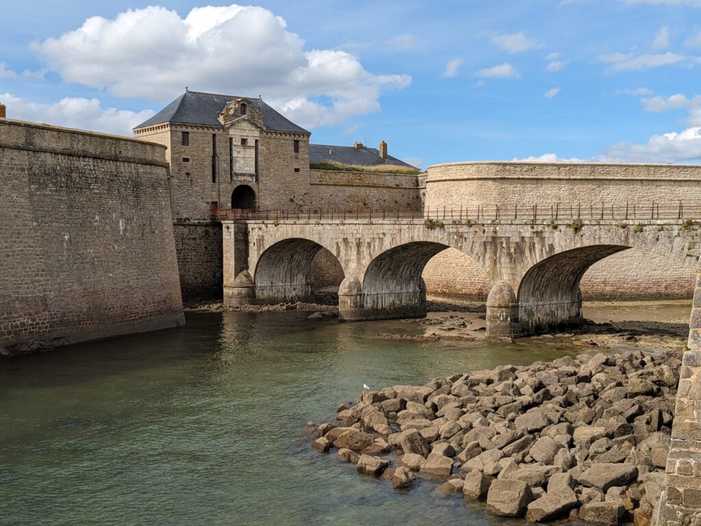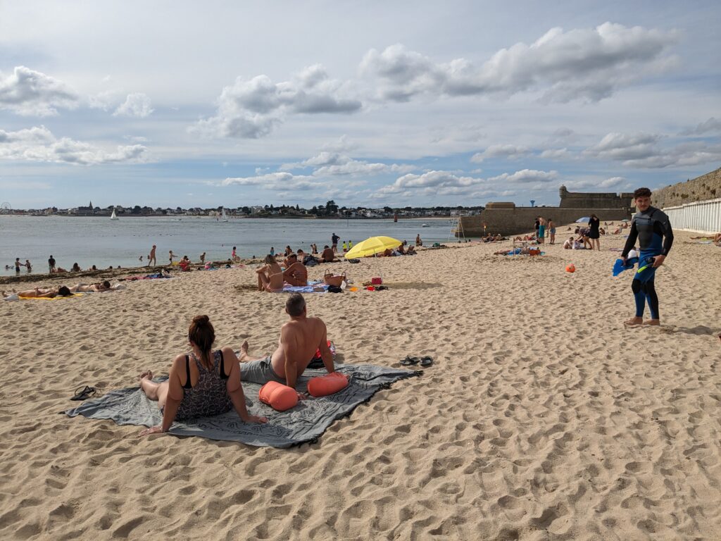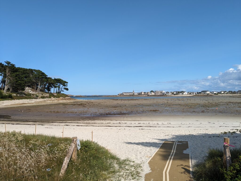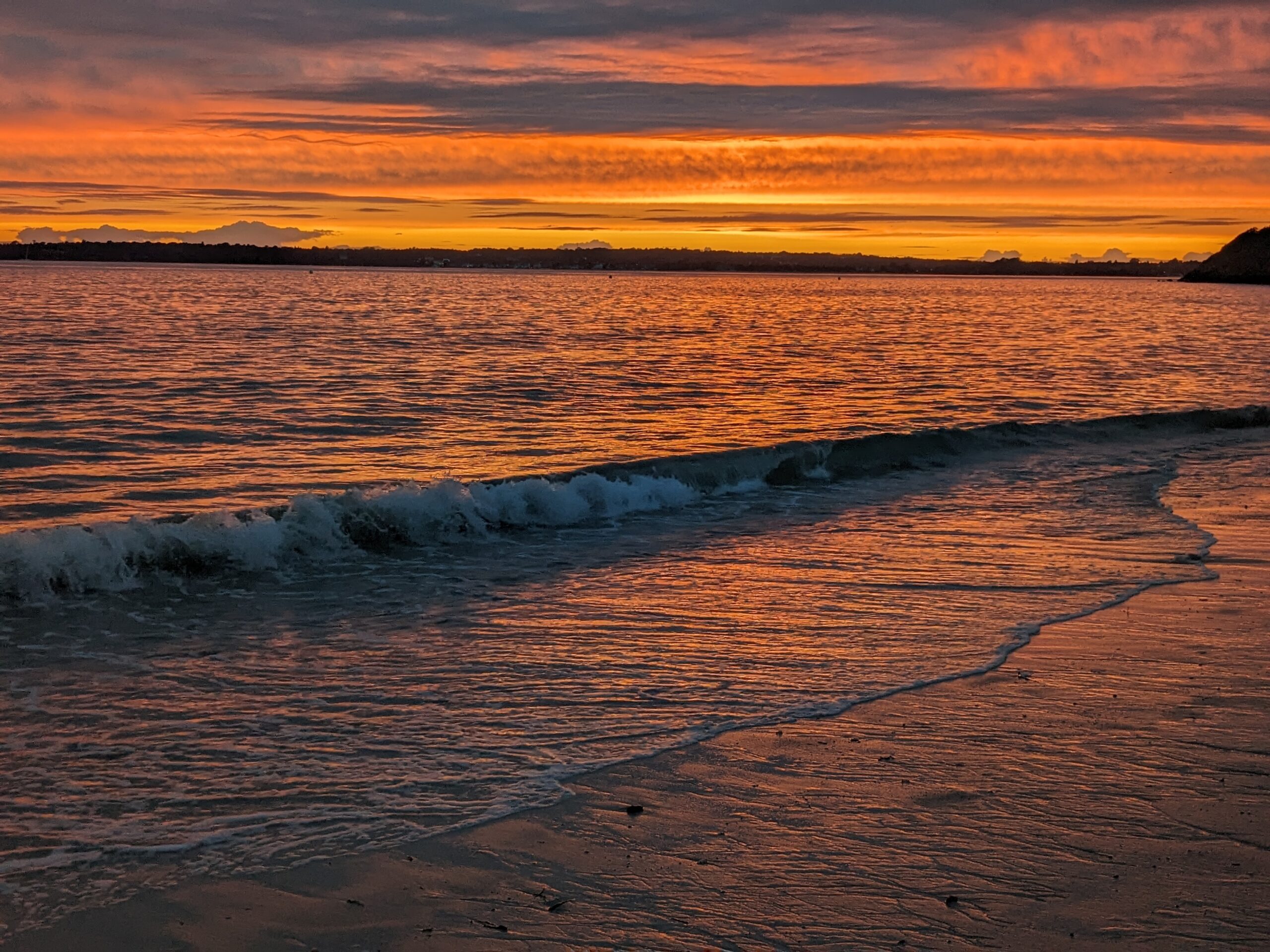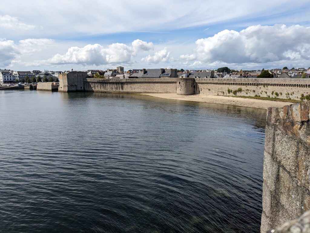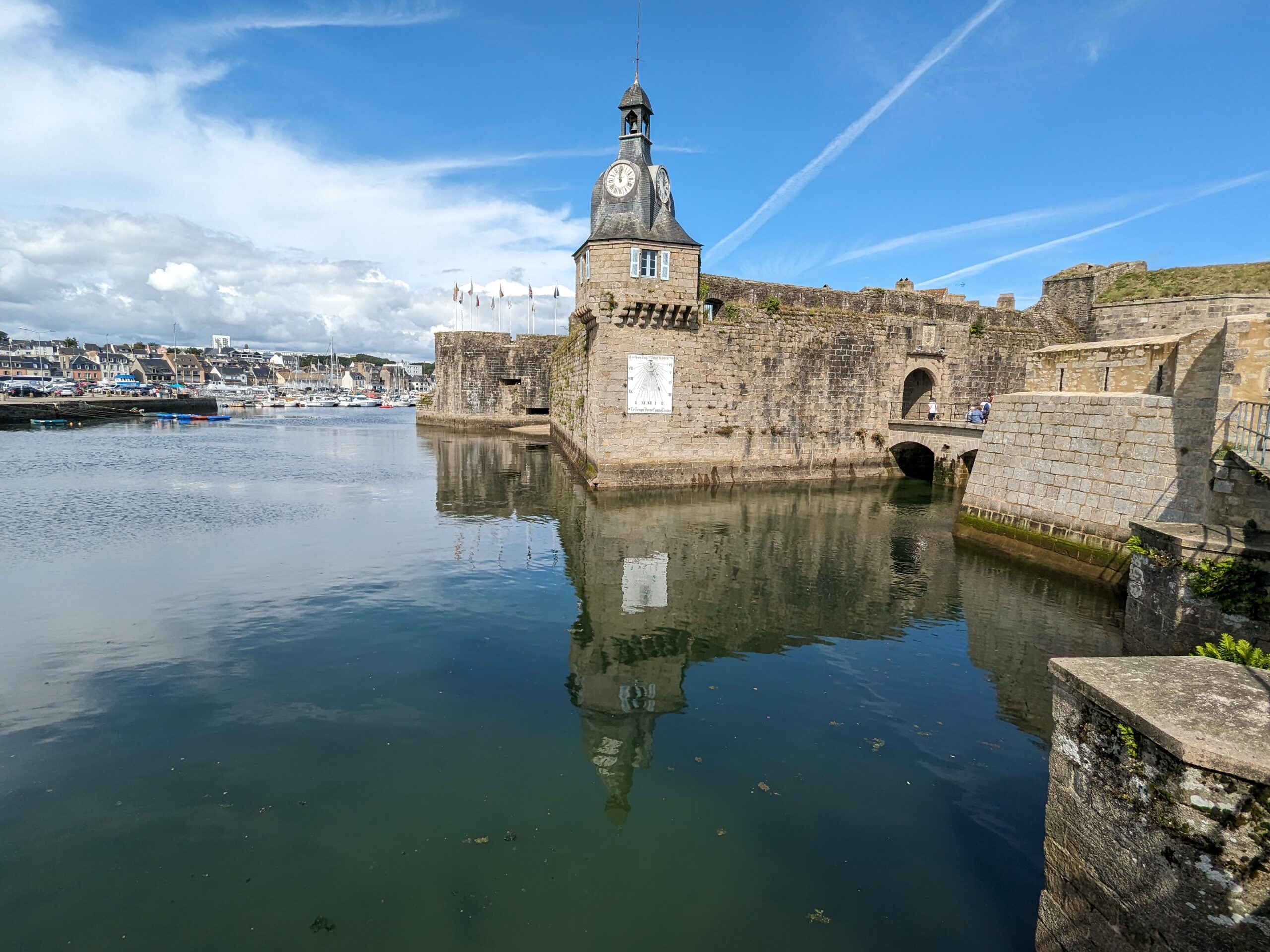 Als wir gestern Abend so auf den Golf von Morbihan gestarrt haben, war uns beiden klar, dass das nicht unsere Bretagne ist. Hat was von der Mecklenburger Seenplatte, nur zeitweise ohne Wasser. Ich weiß, das ist jetzt jammern auf hohem Niveau, aber nach nicht einmal 2 Minuten stand die Entscheidung, wir fahren zurück ans Meer, ans richtige Meer! Die gute Nachricht, die Kids haben keinen Lärm gemacht, trotzdem war die Nacht etwas unruhig. Es war sehr warm, deshalb offene Fenster und irgendwer hat Eicheln aufs Auto geschmissen. Wir haben auf der Flucht vor den vermeintlich lauten Kids unter einer Eiche geparkt. Dumm gelaufen. Trotzdem geht es kurz nach 10:00 los, Mittags sind wir in Pleyben. Hier gibt es eine tolle Kirche mit Calvarie und danach Baguette. Dann geht es weiter. Wir wundern uns etwas, dass es hier schon Schilder zum Mont St. Michel gibt, aber man weiß ja nie. Kurz darauf sind wir schlauer, wir sehen den Mont St. Michel, wir befahren und besteigen ihn sogar, wir sind fast allein und haben zwar einen Labcache, aber kein Internet. Dumm gelaufen. Dann geht es aber endlich weiter, noch ein kurzer Stopp bei Lidl, (es gibt keine frische Milch, keine Entenleberpastete und kein Tonic 🙁 . Dann erreichen wir um 16:00 endlich den Camping Municipal in Poulfoën. Wir finden ein Plätzchen direkt am „Strand“ (für 22,50€) und starten erst mal zu Fuß zum ersten Cache, der nur bei Ebbe zu erreichen ist. Danach mit den Rädern zum Menhir des Cam Louis. Nochmal 3 Caches und viele tolle Aussichten. Zurück am Wobi ist dann relaxen angesagt. Aus dem „Wohnzimmerfenster“ betrachten wir das Meer beim näherkommen. Der Sonnenuntergang fällt leider wegen Wolken aus. Aber die Stimmung, wenn die Wellen fast um die Reifen klatschen, ist genial.