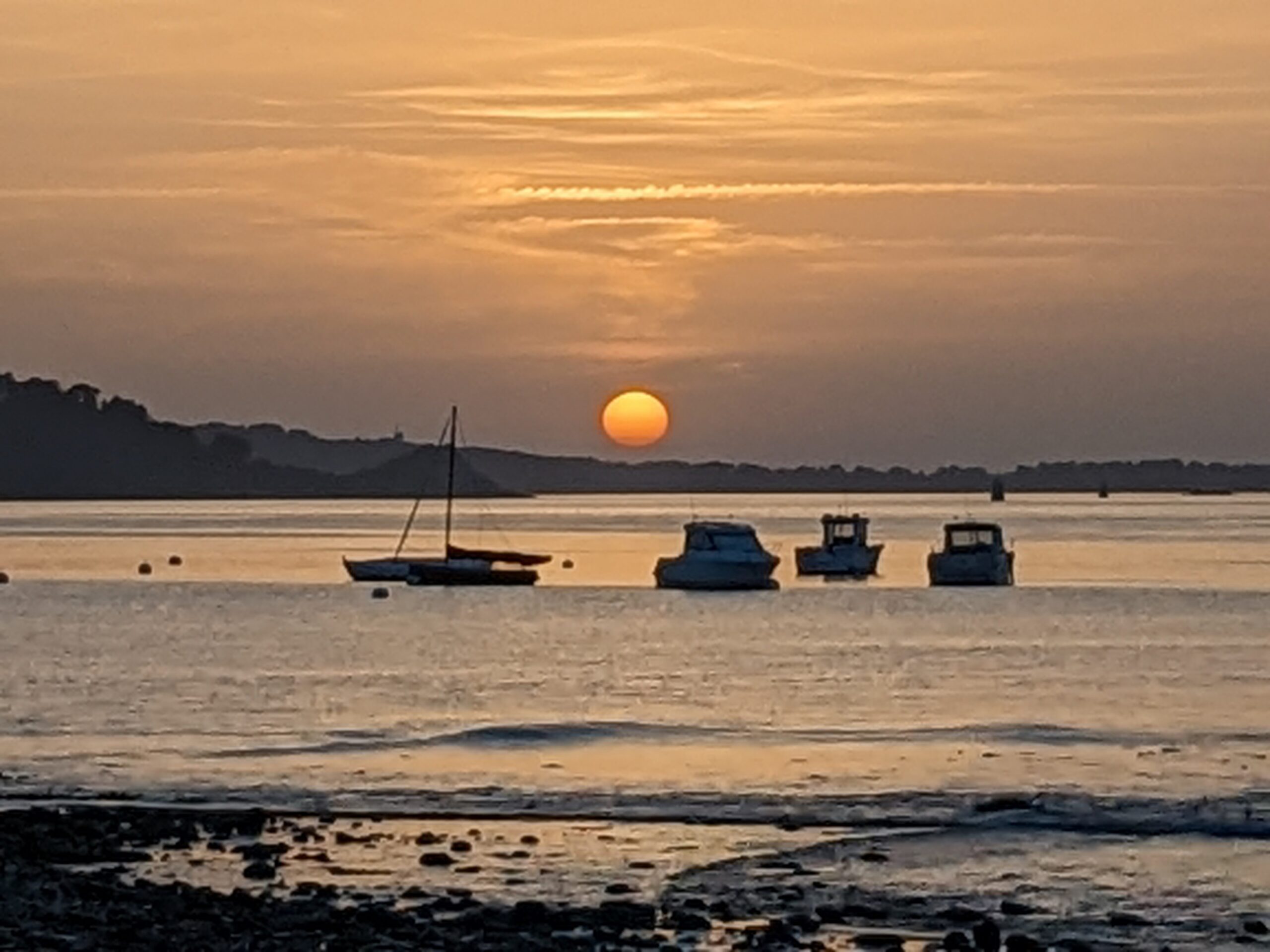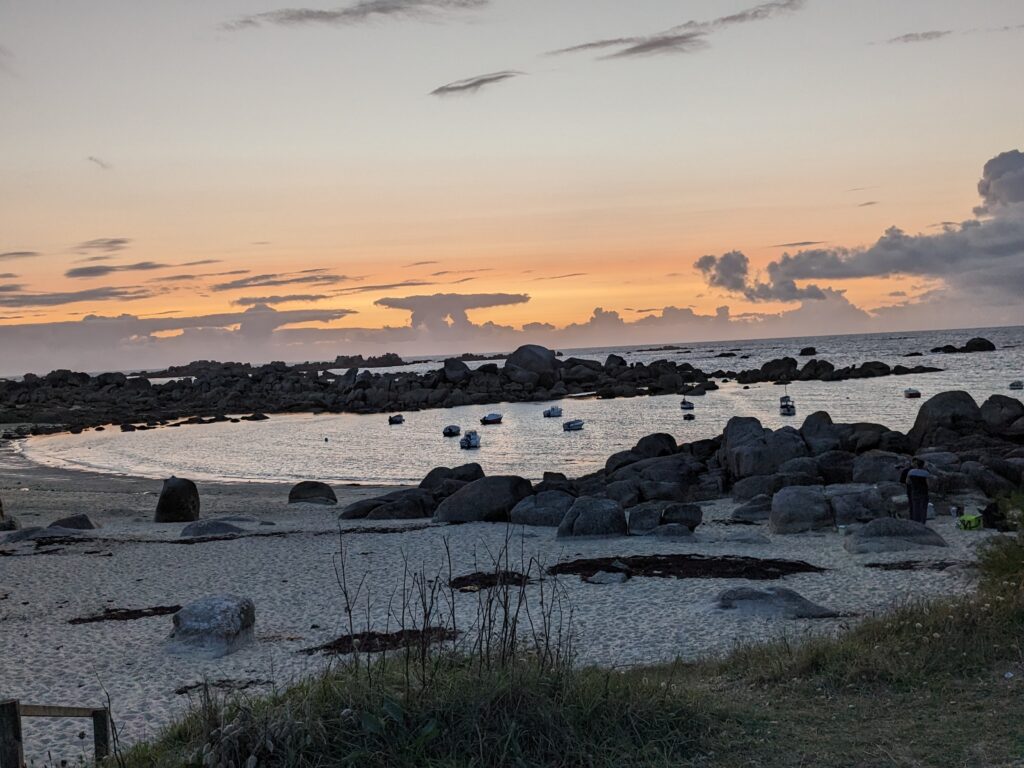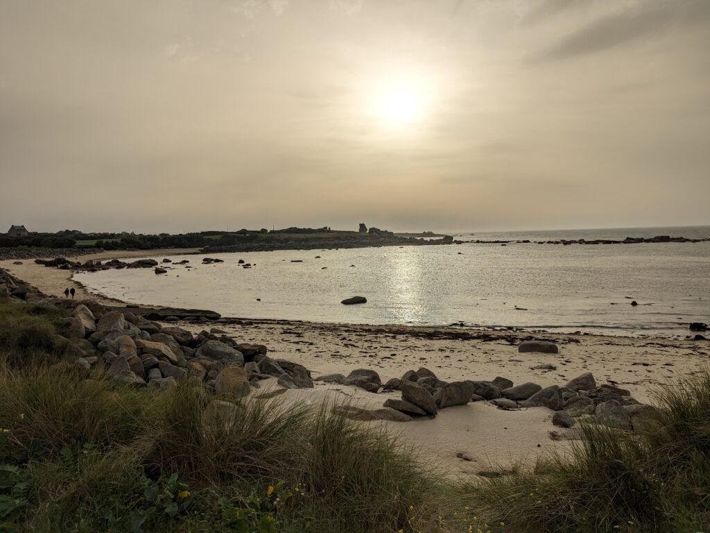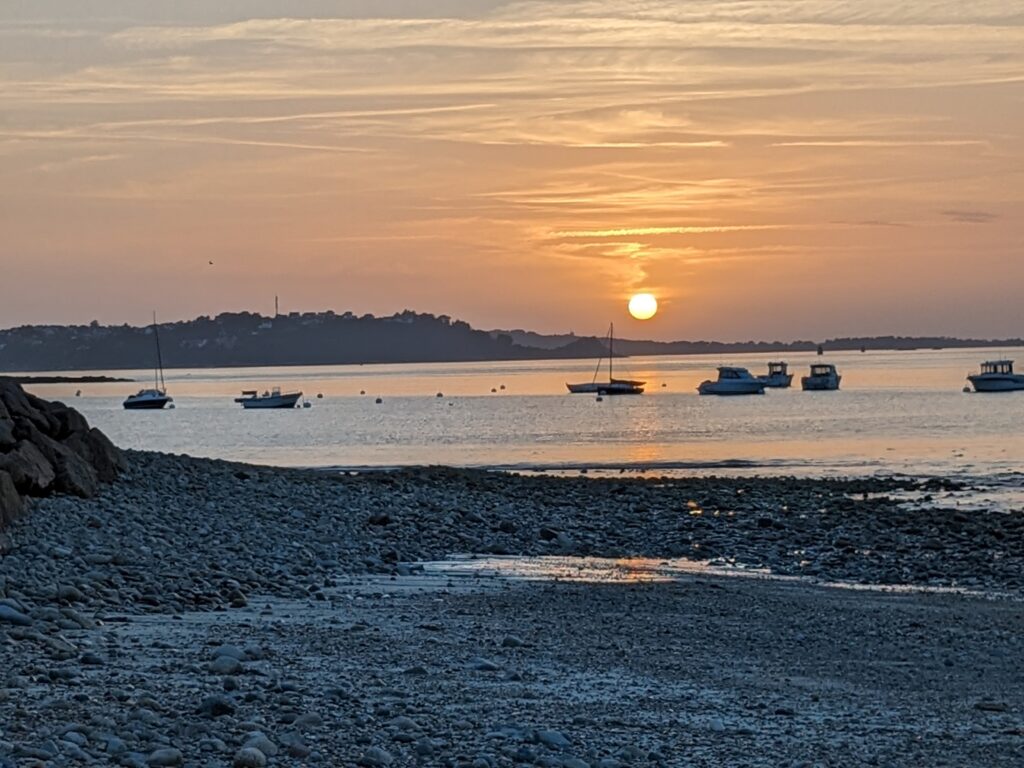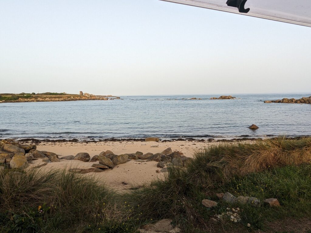 Die Sonne scheint, das Wasser ist da, der Tag fängt gut an. Nach einem Frühstück mit Traumaussicht brechen wir schweren Herzens auf. Aber das nächste Ziel ist ein alt bekanntes und verspricht ähnlich schön zu werden. Zunächst einmal geht es wieder durch Morlaix von hier wollen wir an der Küste entlang Richtung Osten, klappt nicht immer mangels Straßen, aber die eine oder andere schöne Aussicht können wir mitnehmen. Bei Plougasnou ist die Durchfahrt gesperrt (Marché) weiß Google nicht, also suchen wir eine Alternative und landen in St.-Jean du Diogt. Hier gibt es eine schöne Kirche. Danach fahren wir auf der D64A und werden mit Traumausichen und einigen Parkmöglichkeiten für Womos belohnt. Die Côte de Granit Rose lassen wir ganz bewusst wieder aus. Den Touristenrummel müssen wir uns nicht antun. Zwischendurch gibt es noch ein wenig Gas für die Gasflasche, ist nicht so oft hier zu bekommen. Um 15:30 erreichen wir nach unzähligen Kreiseln den Campingplatz „Les 7 Iles“ in Trélévern. Der ist zumindest in der ersten Reihe auch jetzt noch gut gefüllt. Wir bekommen aber noch ein Plätzchen (23,00€) und da gerade Ebbe ist machen wir erst einmal einen Spaziergang, wir finden Meeresschnecken, Seepocken, Seetang und sogar Austern, aber Ralf will davon partout nichts zum Abendessen. Später kommt das Wasser zurück und alle warten auf den Sonnenuntergang.
