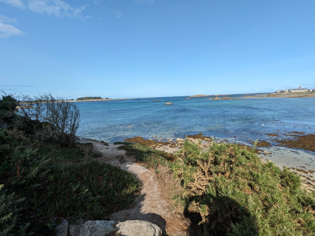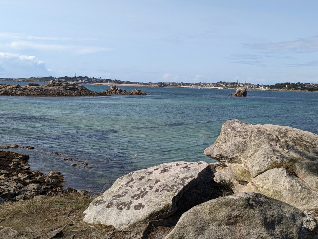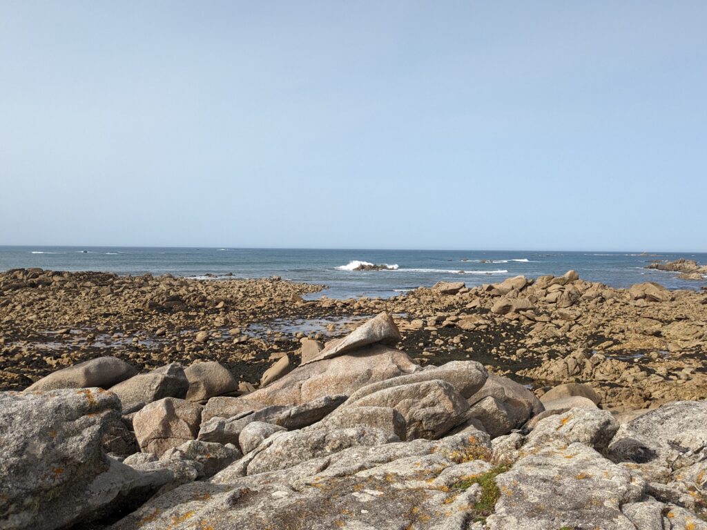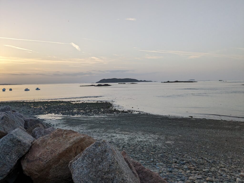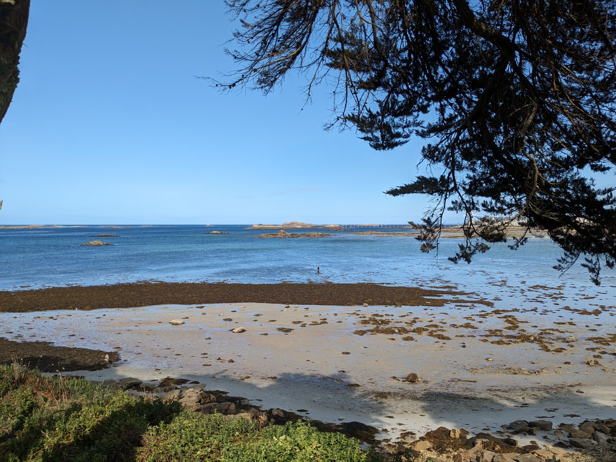 Die Sonne scheint, das Wasser ist da, der Tag fängt gut an. Nach einem Frühstück mit Traumaussicht brechen wir schweren Herzens auf. Aber das nächste Ziel ist ein alt bekanntes und verspricht ähnlich schön zu werden. Zunächst einmal geht es wieder durch Morlaix von hier wollen wir an der Küste entlang Richtung Osten, klappt nicht immer mangels Straßen, aber die eine oder andere schöne Aussicht können wir mitnehmen. Bei Plougasnou ist die Durchfahrt gesperrt (Marché) weiß Google nicht, also suchen wir eine Alternative und landen in St.-Jean du Diogt. Hier gibt es eine schöne Kirche. Danach fahren wir auf der D64A und werden mit Traumausichen und einigen Parkmöglichkeiten für Womos belohnt. Die Côte de Granit Rose lassen wir ganz bewusst wieder aus. Den Touristenrummel müssen wir uns nicht antun. Zwischendurch gibt es noch ein wenig Gas für die Gasflasche, ist nicht so oft hier zu bekommen. Um 15:30 erreichen wir nach unzähligen Kreiseln den Campingplatz „Les 7 Iles“ in Trélévern. Der ist zumindest in der ersten Reihe auch jetzt noch gut gefüllt. Wir bekommen aber noch ein Plätzchen (23,00€) und da gerade Ebbe ist machen wir erst einmal einen Spaziergang, wir finden Meeresschnecken, Seepocken, Seetang und sogar Austern, aber Ralf will davon partout nichts zum Abendessen. Später kommt das Wasser zurück und alle warten auf den Sonnenuntergang.