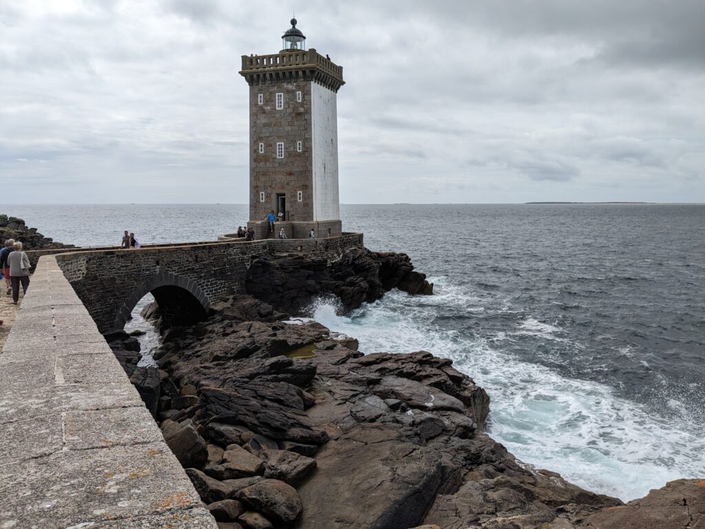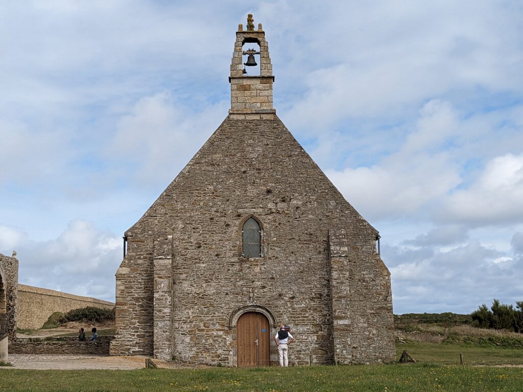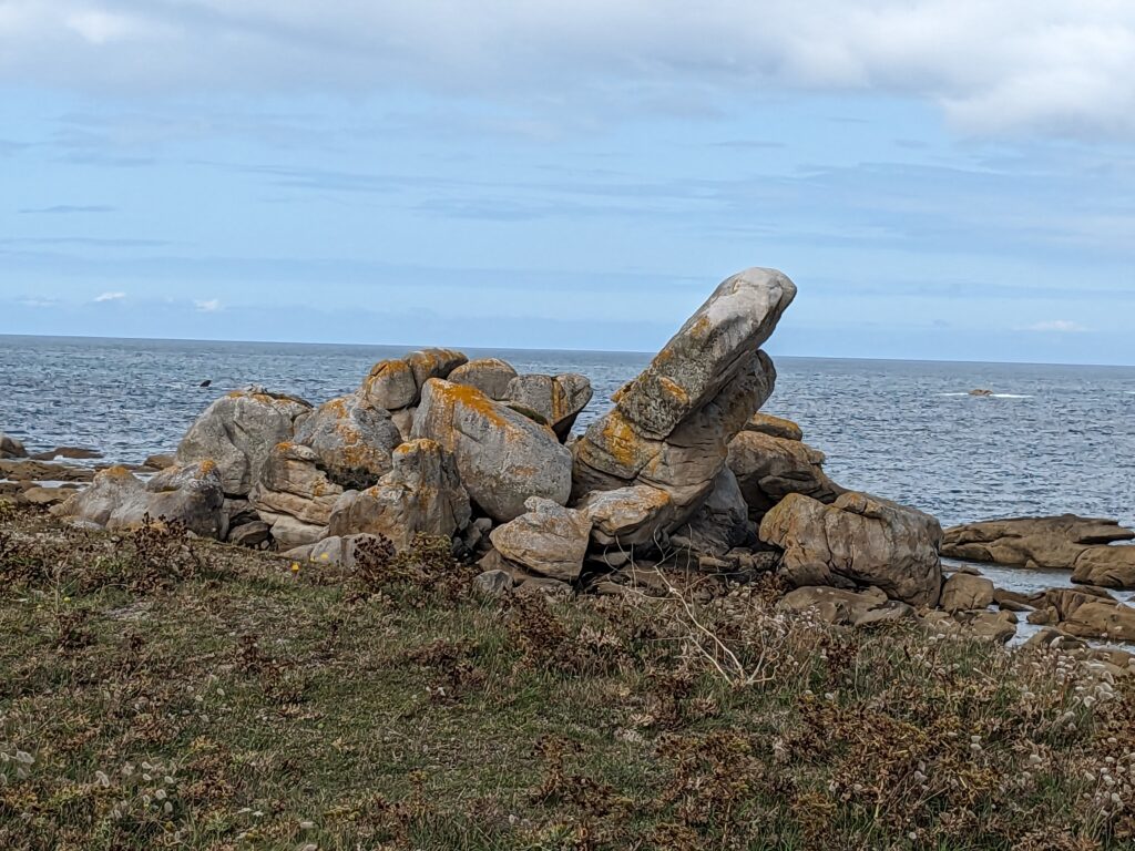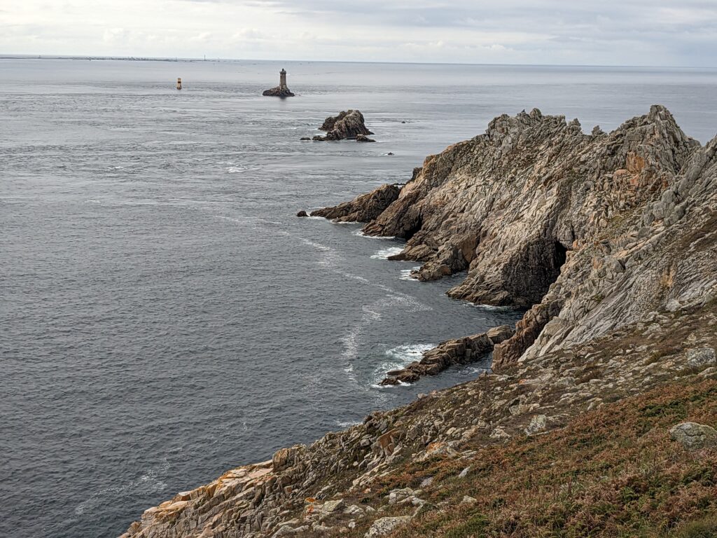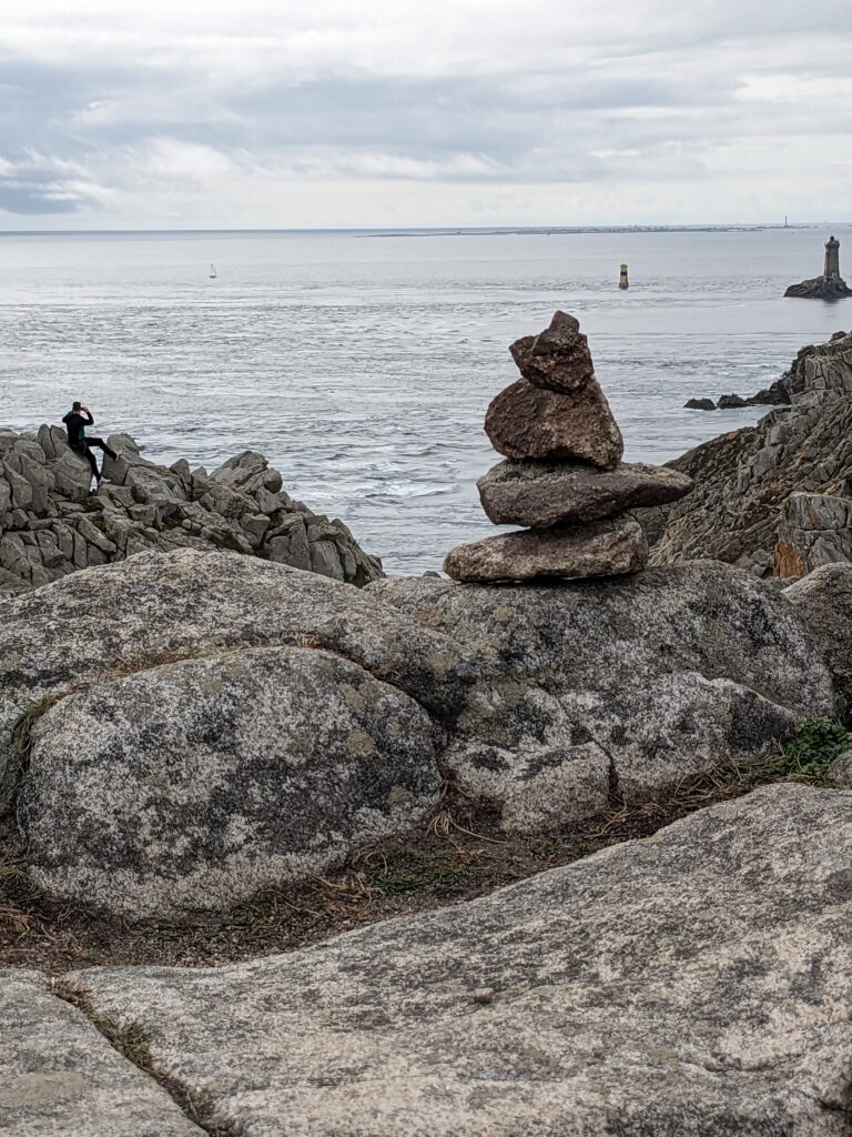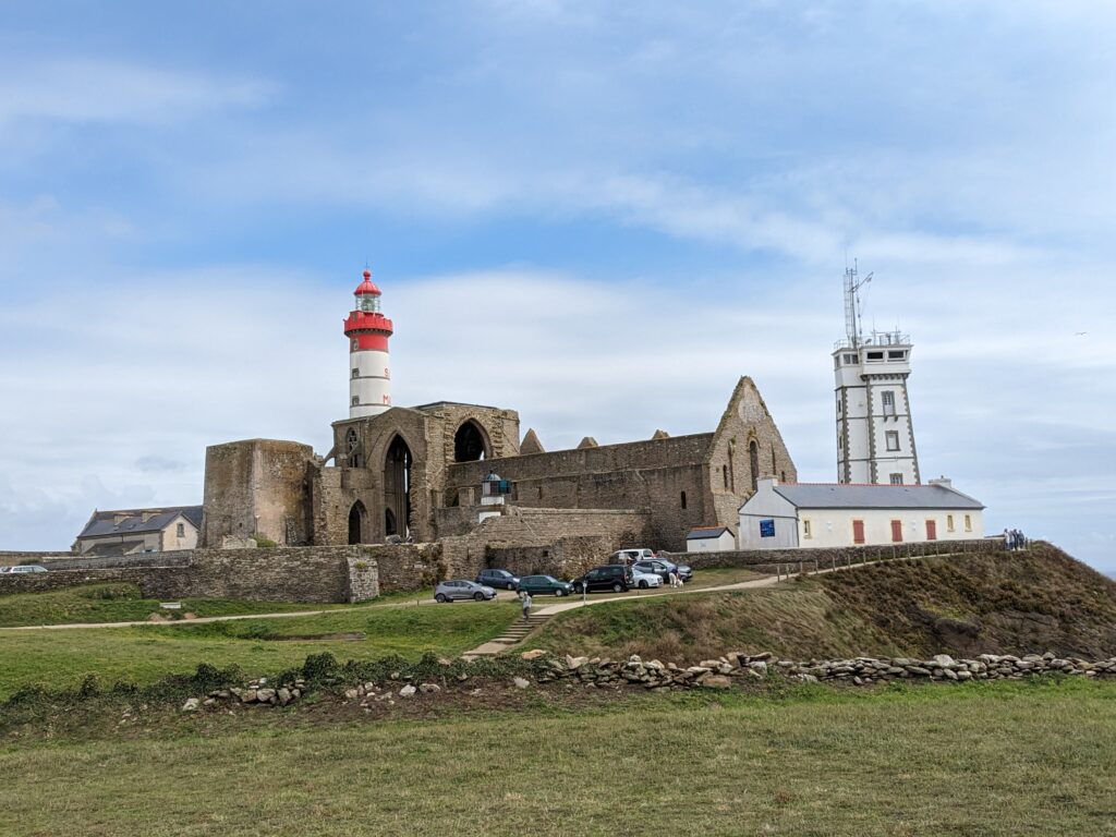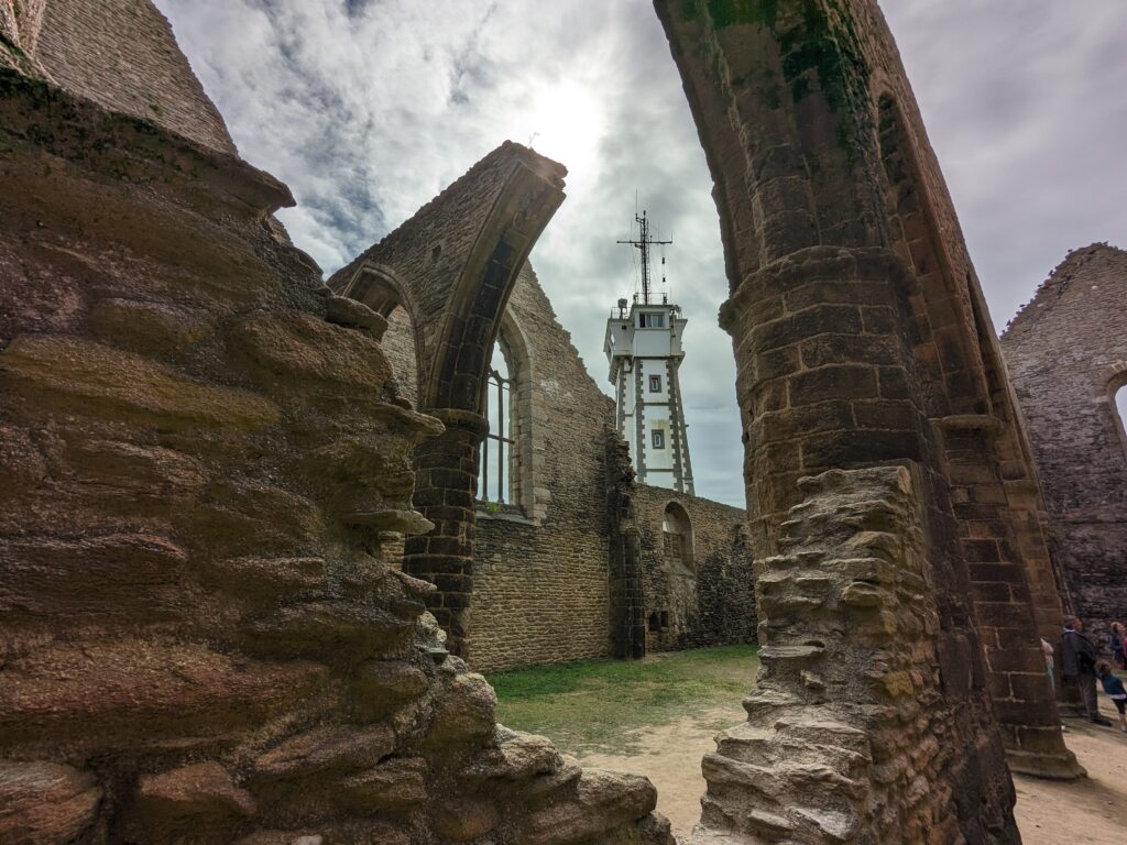 Das Wetter ist nach wie vor wolkig, aber wieder trocken. Nach einem Frühstück mit Huhn, geht es zur Crozon Halbinsel. Aber als Erstes gibt es noch einen kleinen Leuchtturm. Den Phare Petit Minou. Als kleinen „Beifang“ gibt es 2 Caches, bevor es bergan zurück zum Wobi geht. Dann müssen wir durch Brest. Das einzig positive an Brest ist, wir können hier Gas tanken und Baguette kaufen. Ansonsten: bloß weg. In Plougastel-Daoulas machen wir einen kurzen Stopp, um uns eine Calvarie anzusehen, dann geht es weiter, pünktlich zum Kaffee erreichen wir die Abbaye Landevennec. Eine Ruine, die wir uns ansehen wollen, dank Google ist ein Parkplatz schnell gefunden. Hier gibt es Espresso aus der Akkumaschine und Himbeertörtchen. Dann stapfen wir los und stehen nach ein paar  Minuten in einer riesigen modernen Kirche, von Ruinen keine Spur. Das hier ist das neue Kloster, das alte, sprich die Ruine ist 10 Minuten den Hügel runter. Das verursacht Ralf mächtig schlechte Laune, den Hügel runter heißt später Hügel rauf. Wir machen es trotzdem und betrachten uns das Museum und die Ruine. Dann unter Schnaufen und Murren zurück zum Wobi und Abfahrt. Bei Camaret-sur-Mer gibt es einen Stellplatz ohne Strom aber mit „Steingarten“ (die Steinreihen von Lagatjar sind direkt vor der Tür) für 12.00€. Aber bevor wir zum gemütlichen Teil übergehen, geht es noch auf die nahe Klippe und zu 2 Caches.