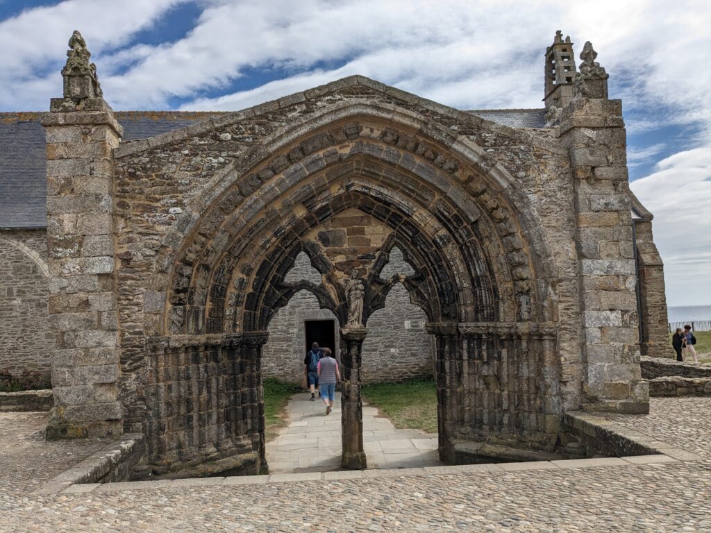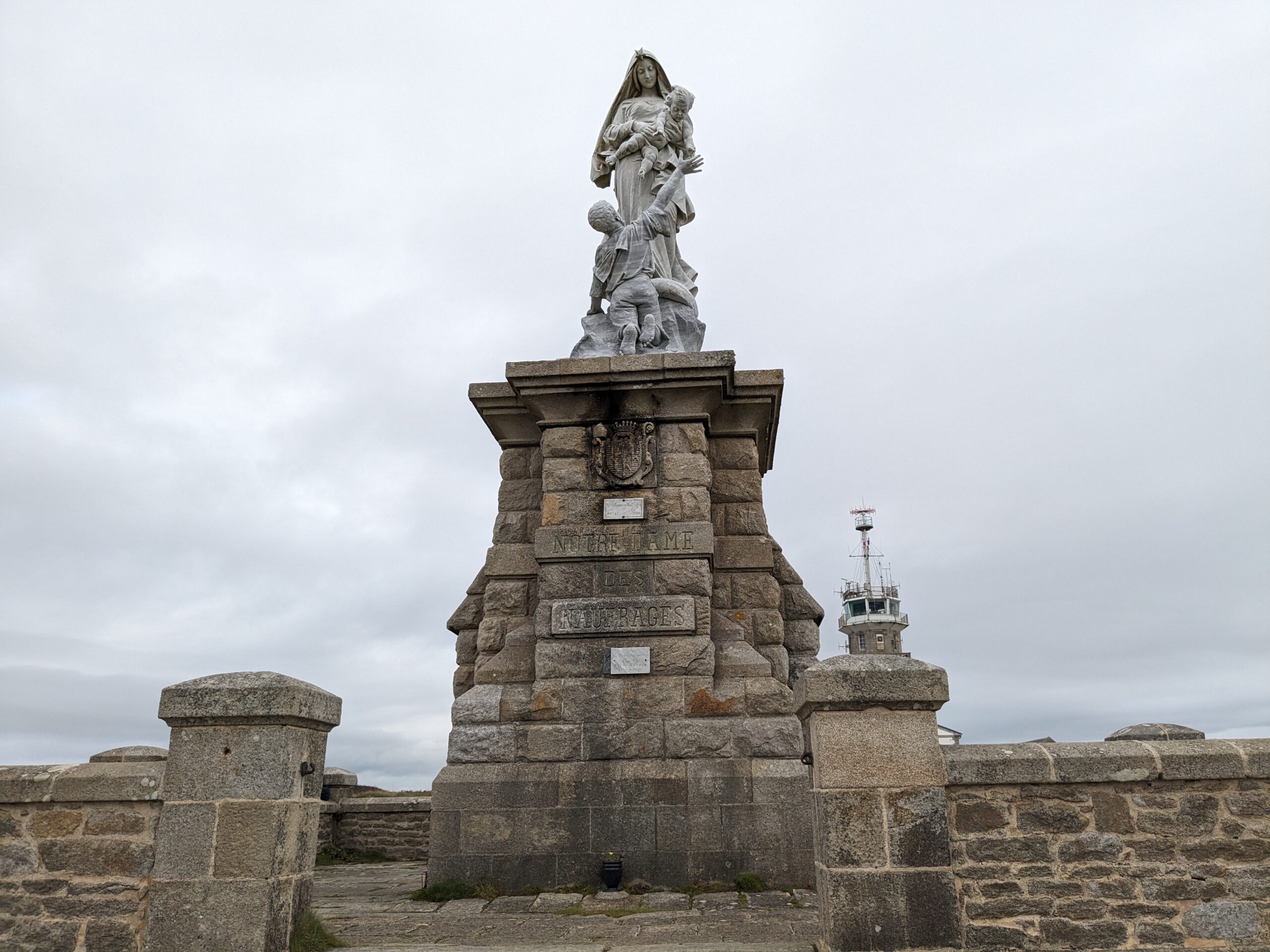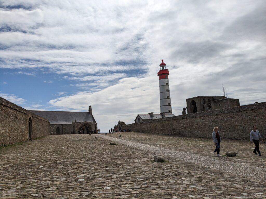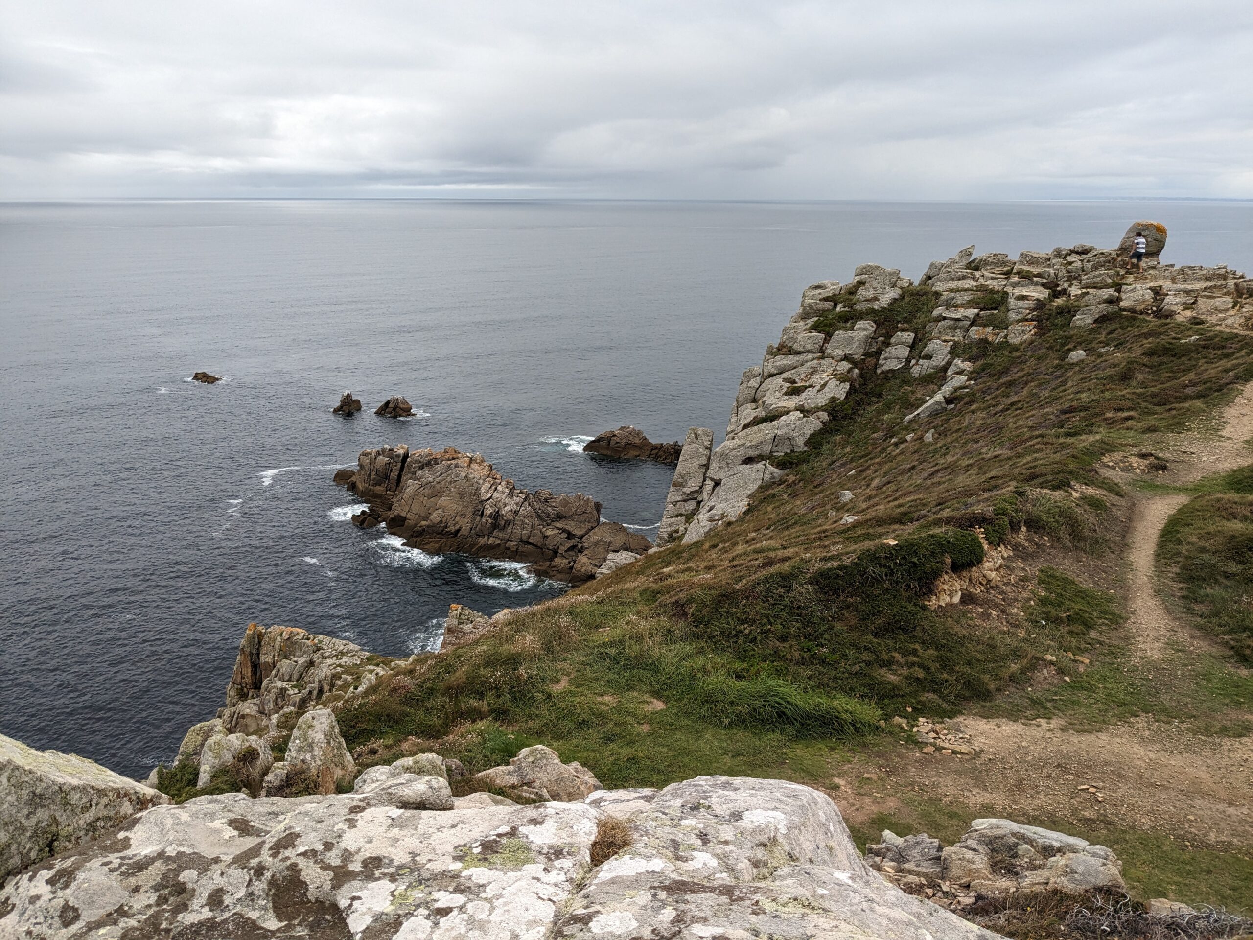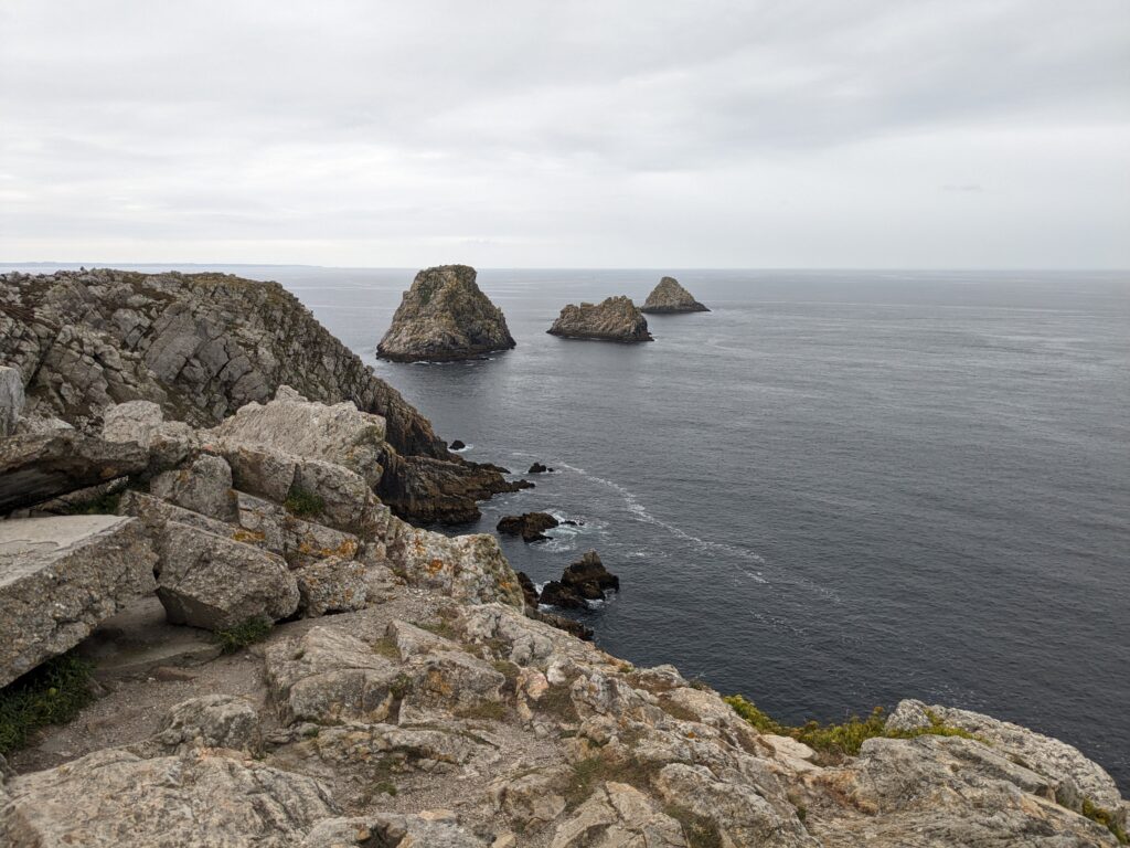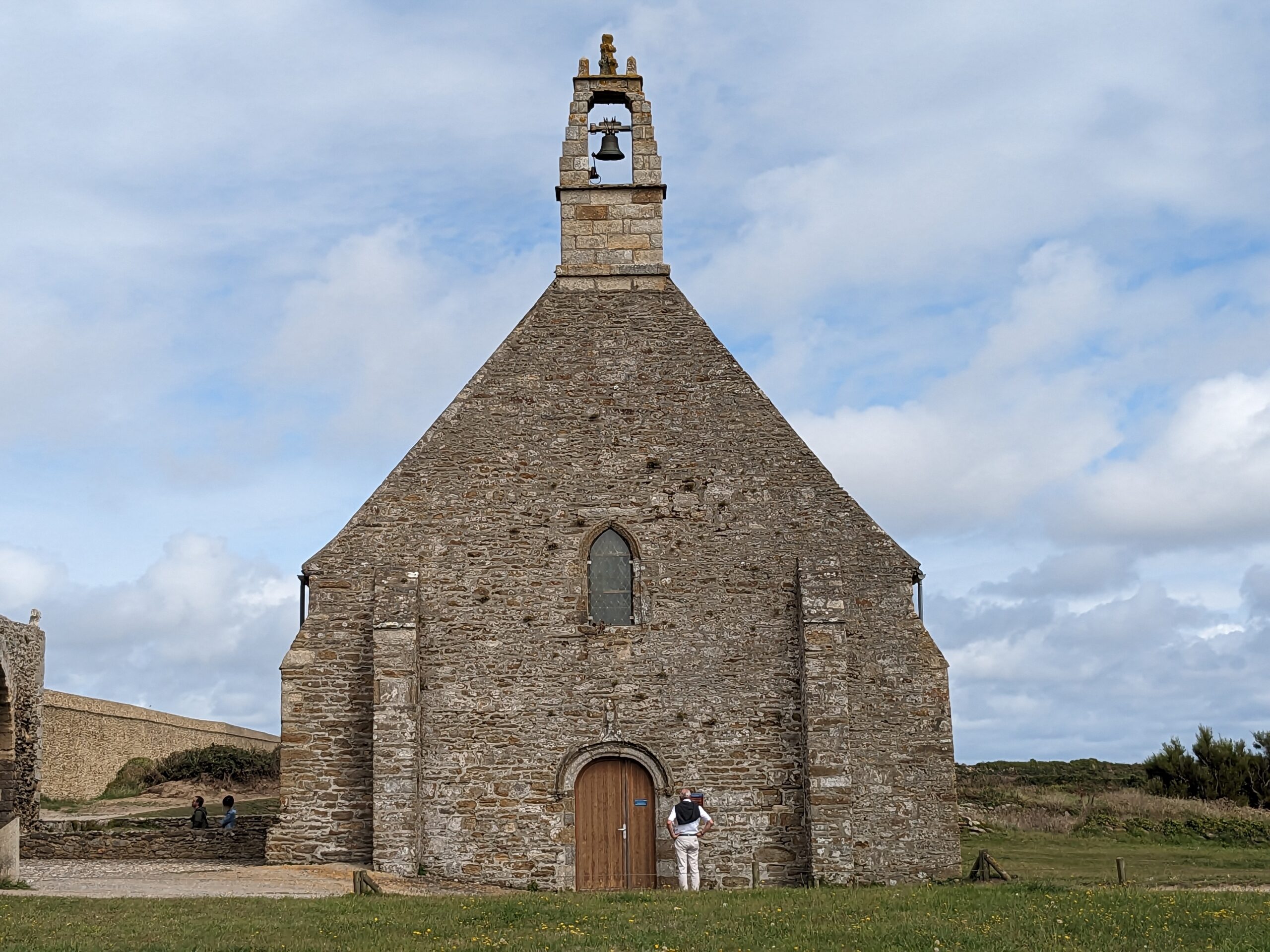 Das Wetter ist nach wie vor wolkig, aber wieder trocken. Nach einem Frühstück mit Huhn, geht es zur Crozon Halbinsel. Aber als Erstes gibt es noch einen kleinen Leuchtturm. Den Phare Petit Minou. Als kleinen „Beifang“ gibt es 2 Caches, bevor es bergan zurück zum Wobi geht. Dann müssen wir durch Brest. Das einzig positive an Brest ist, wir können hier Gas tanken und Baguette kaufen. Ansonsten: bloß weg. In Plougastel-Daoulas machen wir einen kurzen Stopp, um uns eine Calvarie anzusehen, dann geht es weiter, pünktlich zum Kaffee erreichen wir die Abbaye Landevennec. Eine Ruine, die wir uns ansehen wollen, dank Google ist ein Parkplatz schnell gefunden. Hier gibt es Espresso aus der Akkumaschine und Himbeertörtchen. Dann stapfen wir los und stehen nach ein paar  Minuten in einer riesigen modernen Kirche, von Ruinen keine Spur. Das hier ist das neue Kloster, das alte, sprich die Ruine ist 10 Minuten den Hügel runter. Das verursacht Ralf mächtig schlechte Laune, den Hügel runter heißt später Hügel rauf. Wir machen es trotzdem und betrachten uns das Museum und die Ruine. Dann unter Schnaufen und Murren zurück zum Wobi und Abfahrt. Bei Camaret-sur-Mer gibt es einen Stellplatz ohne Strom aber mit „Steingarten“ (die Steinreihen von Lagatjar sind direkt vor der Tür) für 12.00€. Aber bevor wir zum gemütlichen Teil übergehen, geht es noch auf die nahe Klippe und zu 2 Caches.
