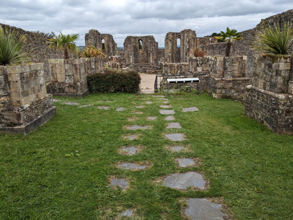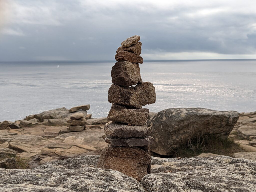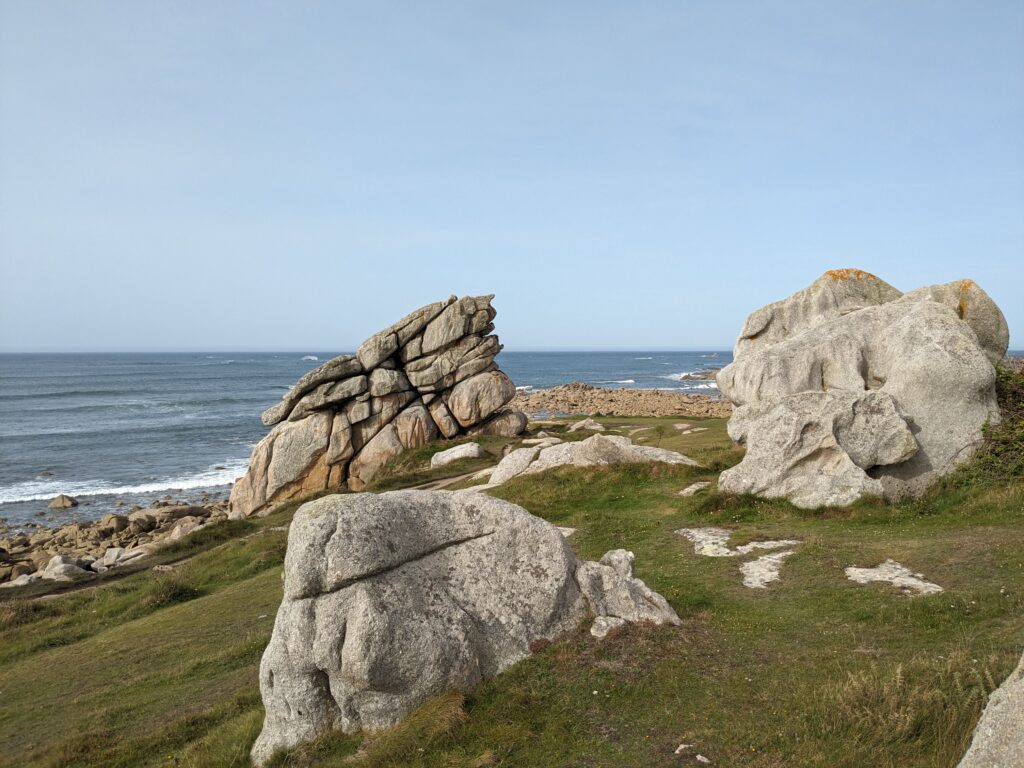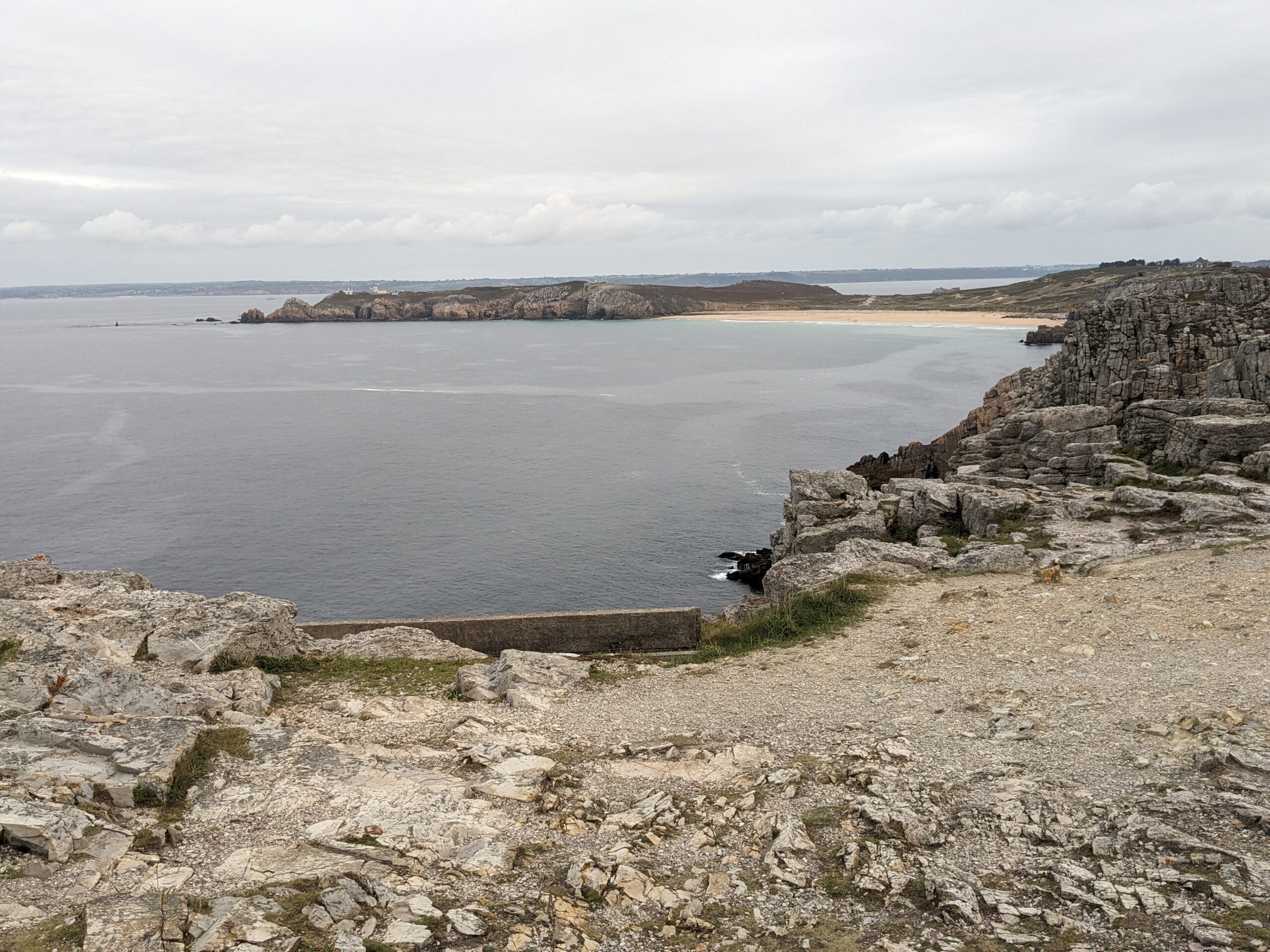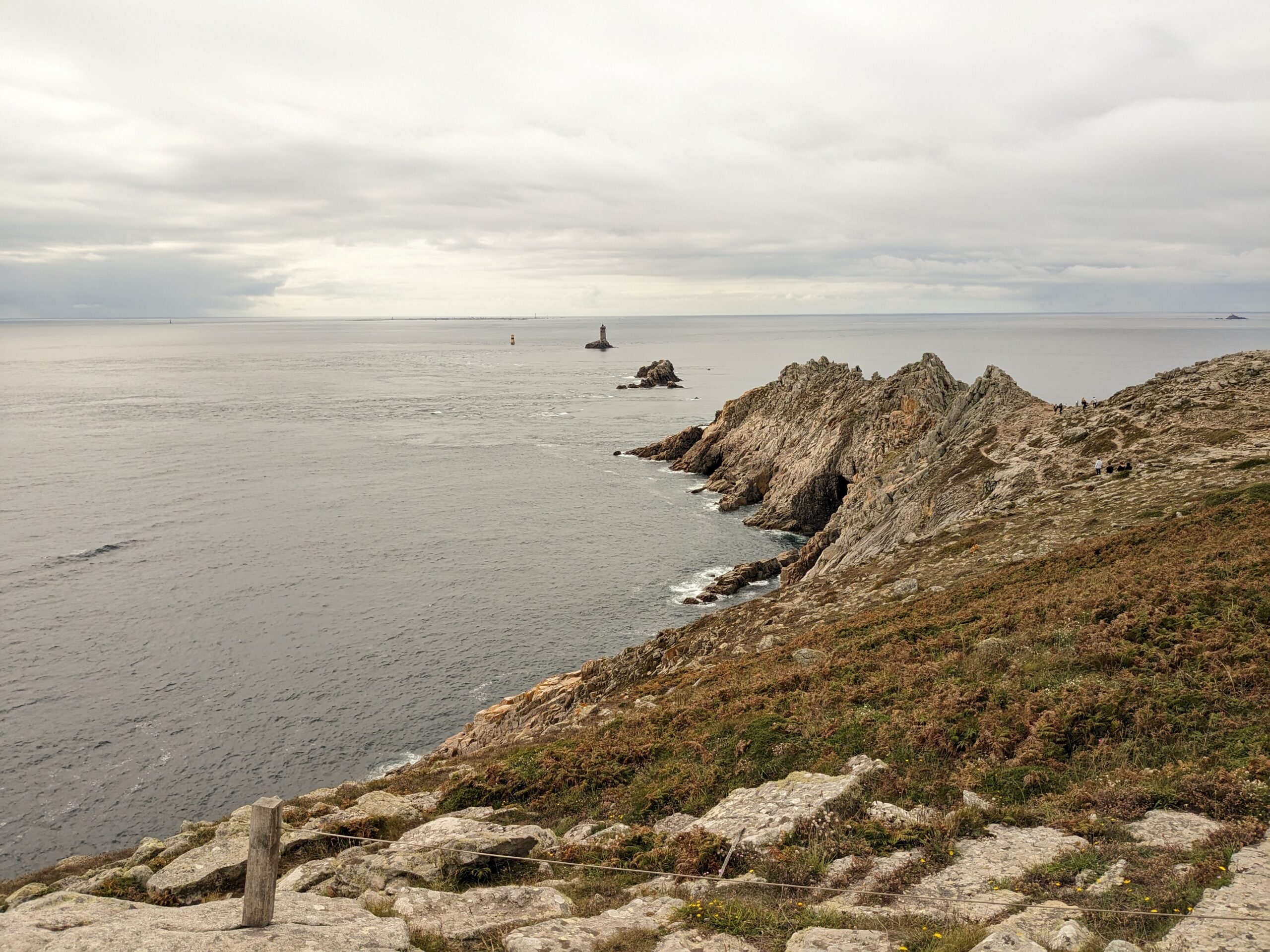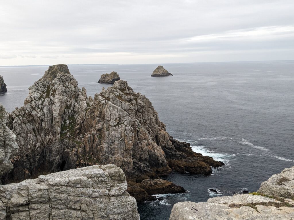 Das Wetter ist nach wie vor wolkig, aber wieder trocken. Nach einem Frühstück mit Huhn, geht es zur Crozon Halbinsel. Aber als Erstes gibt es noch einen kleinen Leuchtturm. Den Phare Petit Minou. Als kleinen „Beifang“ gibt es 2 Caches, bevor es bergan zurück zum Wobi geht. Dann müssen wir durch Brest. Das einzig positive an Brest ist, wir können hier Gas tanken und Baguette kaufen. Ansonsten: bloß weg. In Plougastel-Daoulas machen wir einen kurzen Stopp, um uns eine Calvarie anzusehen, dann geht es weiter, pünktlich zum Kaffee erreichen wir die Abbaye Landevennec. Eine Ruine, die wir uns ansehen wollen, dank Google ist ein Parkplatz schnell gefunden. Hier gibt es Espresso aus der Akkumaschine und Himbeertörtchen. Dann stapfen wir los und stehen nach ein paar  Minuten in einer riesigen modernen Kirche, von Ruinen keine Spur. Das hier ist das neue Kloster, das alte, sprich die Ruine ist 10 Minuten den Hügel runter. Das verursacht Ralf mächtig schlechte Laune, den Hügel runter heißt später Hügel rauf. Wir machen es trotzdem und betrachten uns das Museum und die Ruine. Dann unter Schnaufen und Murren zurück zum Wobi und Abfahrt. Bei Camaret-sur-Mer gibt es einen Stellplatz ohne Strom aber mit „Steingarten“ (die Steinreihen von Lagatjar sind direkt vor der Tür) für 12.00€. Aber bevor wir zum gemütlichen Teil übergehen, geht es noch auf die nahe Klippe und zu 2 Caches.