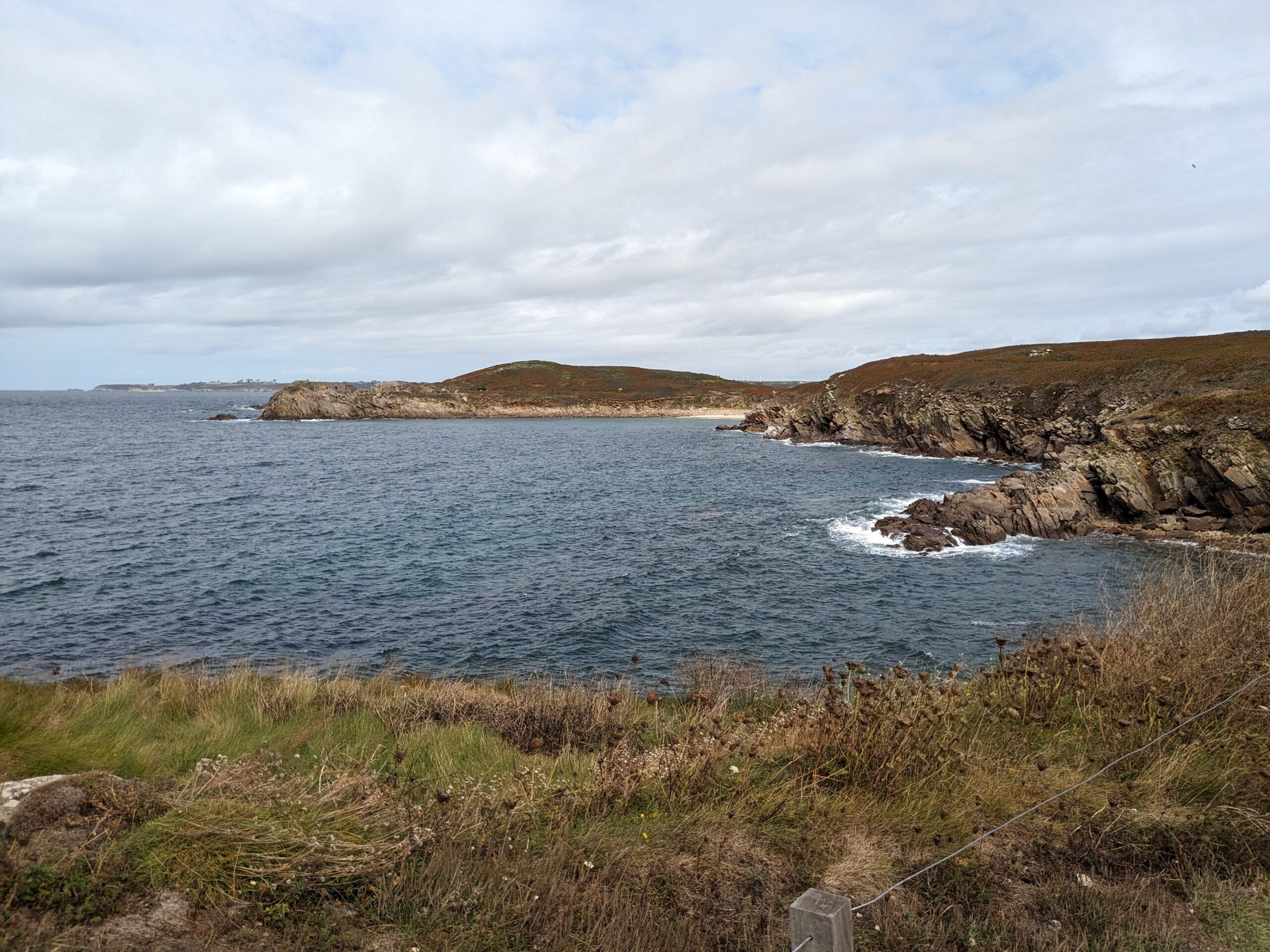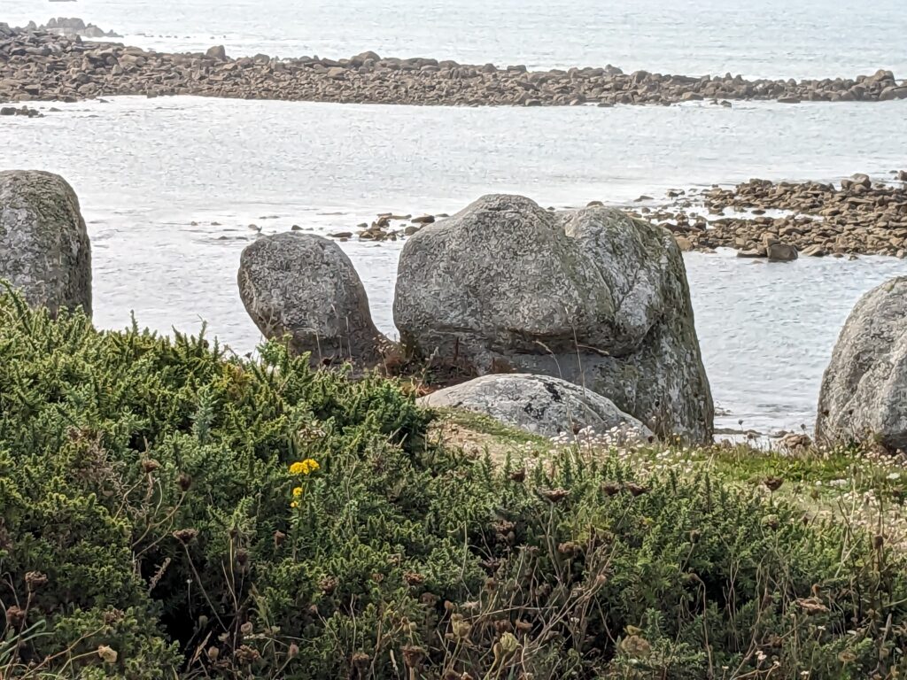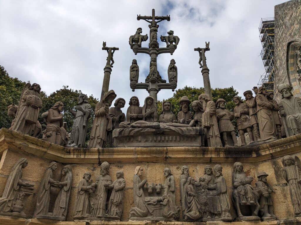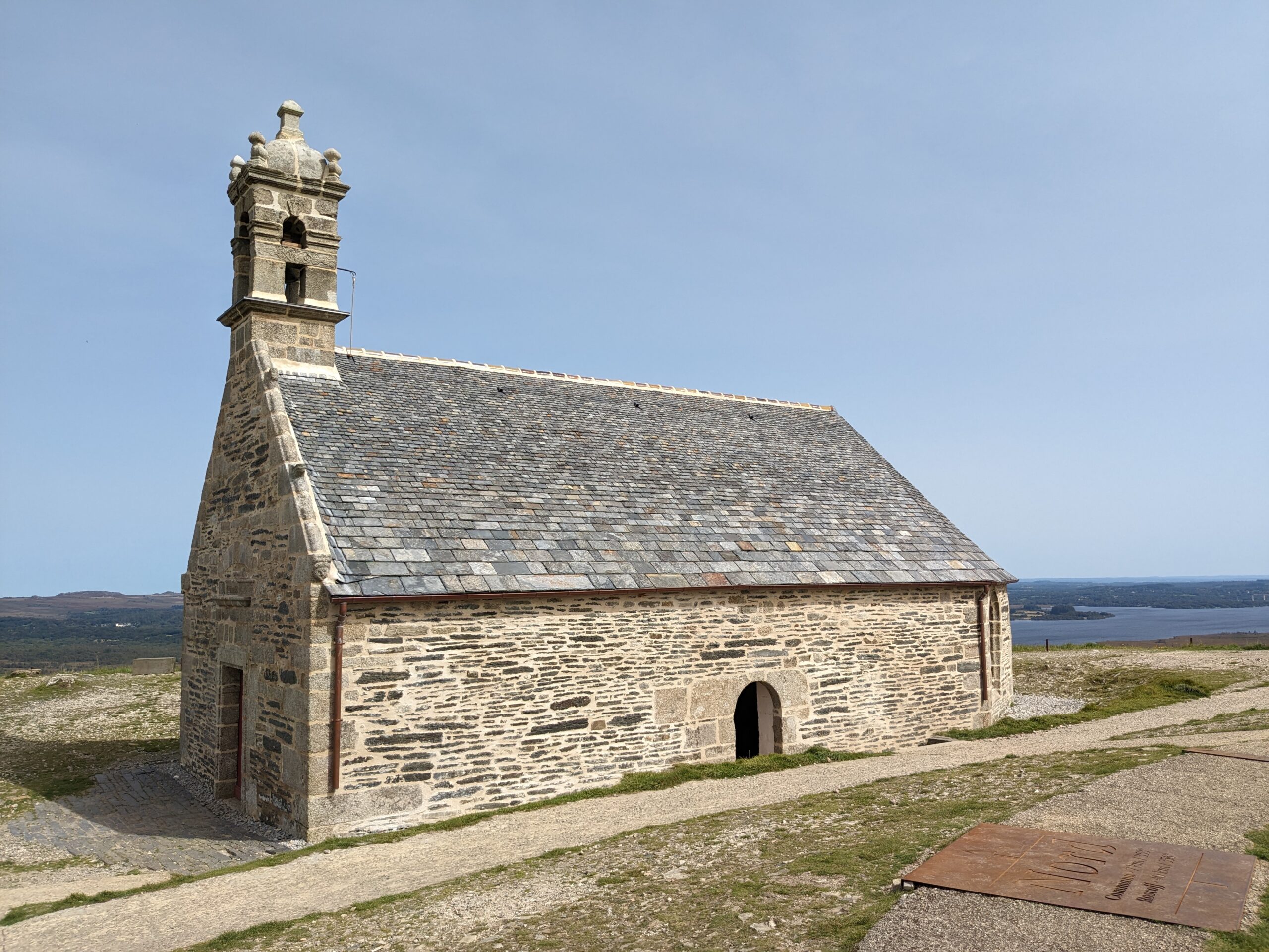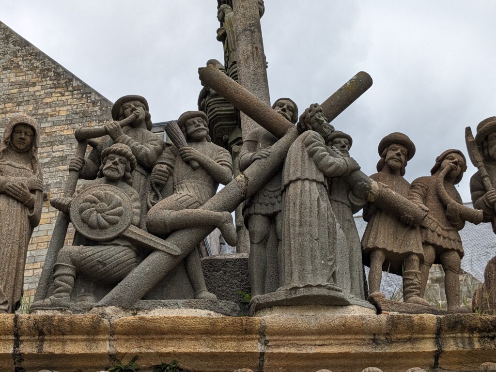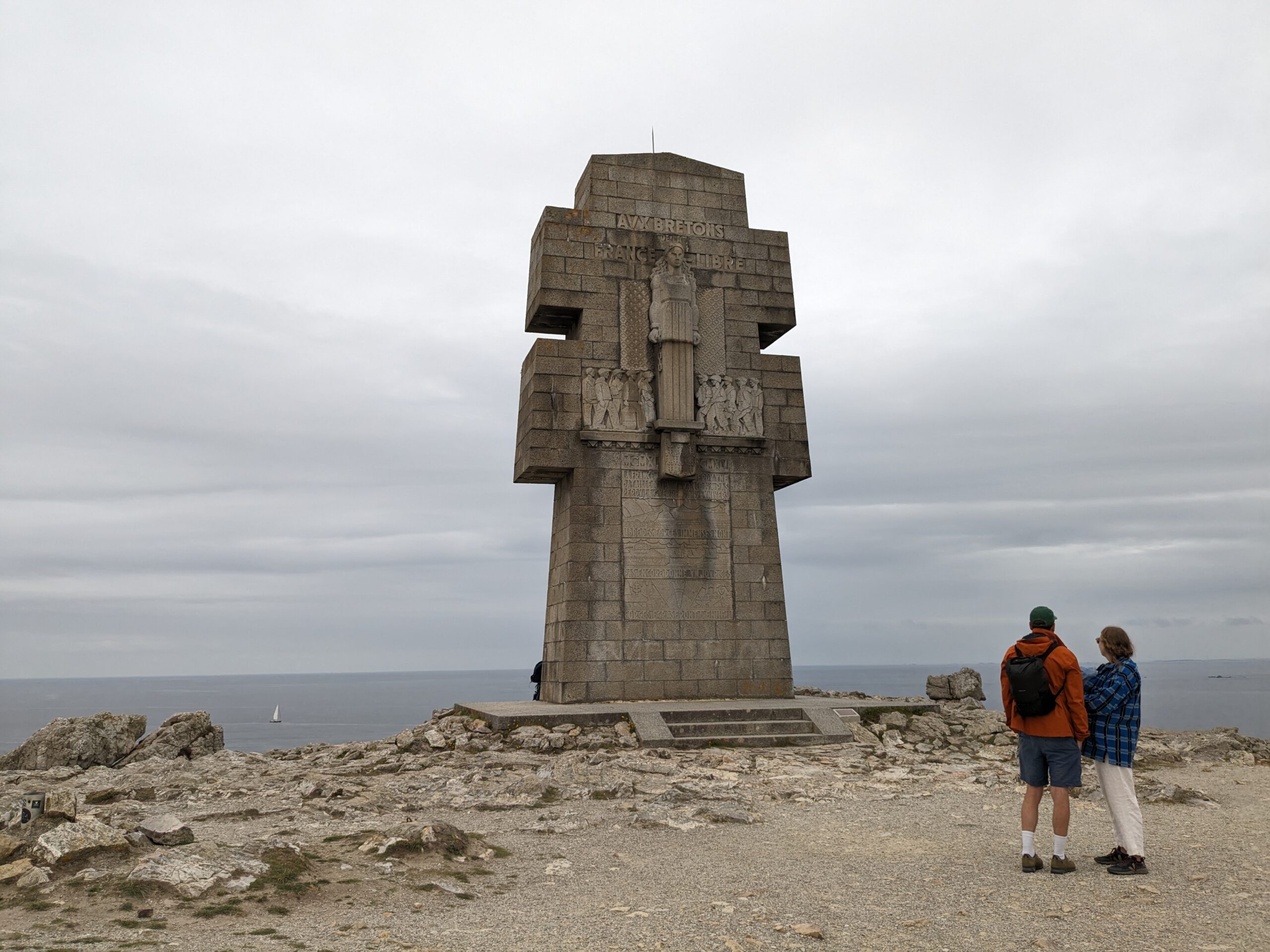 Das Wetter ist nach wie vor wolkig, aber wieder trocken. Nach einem Frühstück mit Huhn, geht es zur Crozon Halbinsel. Aber als Erstes gibt es noch einen kleinen Leuchtturm. Den Phare Petit Minou. Als kleinen „Beifang“ gibt es 2 Caches, bevor es bergan zurück zum Wobi geht. Dann müssen wir durch Brest. Das einzig positive an Brest ist, wir können hier Gas tanken und Baguette kaufen. Ansonsten: bloß weg. In Plougastel-Daoulas machen wir einen kurzen Stopp, um uns eine Calvarie anzusehen, dann geht es weiter, pünktlich zum Kaffee erreichen wir die Abbaye Landevennec. Eine Ruine, die wir uns ansehen wollen, dank Google ist ein Parkplatz schnell gefunden. Hier gibt es Espresso aus der Akkumaschine und Himbeertörtchen. Dann stapfen wir los und stehen nach ein paar  Minuten in einer riesigen modernen Kirche, von Ruinen keine Spur. Das hier ist das neue Kloster, das alte, sprich die Ruine ist 10 Minuten den Hügel runter. Das verursacht Ralf mächtig schlechte Laune, den Hügel runter heißt später Hügel rauf. Wir machen es trotzdem und betrachten uns das Museum und die Ruine. Dann unter Schnaufen und Murren zurück zum Wobi und Abfahrt. Bei Camaret-sur-Mer gibt es einen Stellplatz ohne Strom aber mit „Steingarten“ (die Steinreihen von Lagatjar sind direkt vor der Tür) für 12.00€. Aber bevor wir zum gemütlichen Teil übergehen, geht es noch auf die nahe Klippe und zu 2 Caches.
