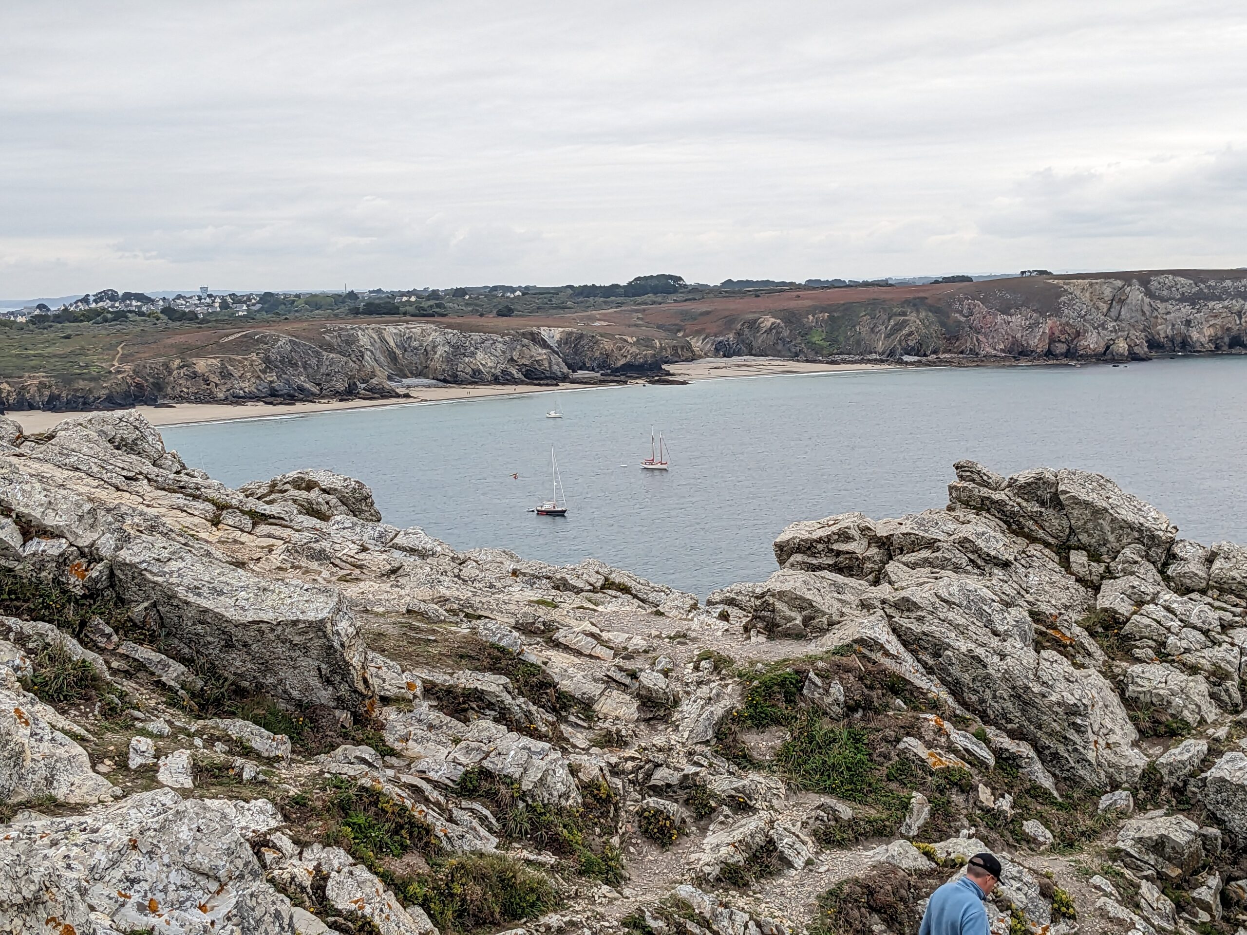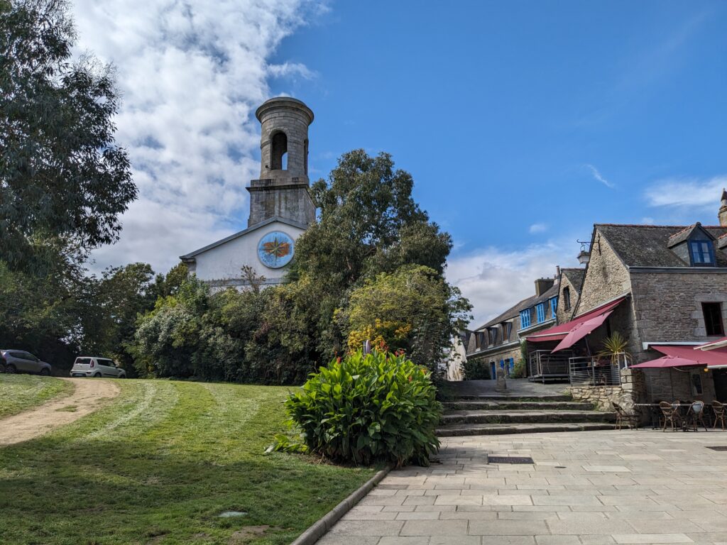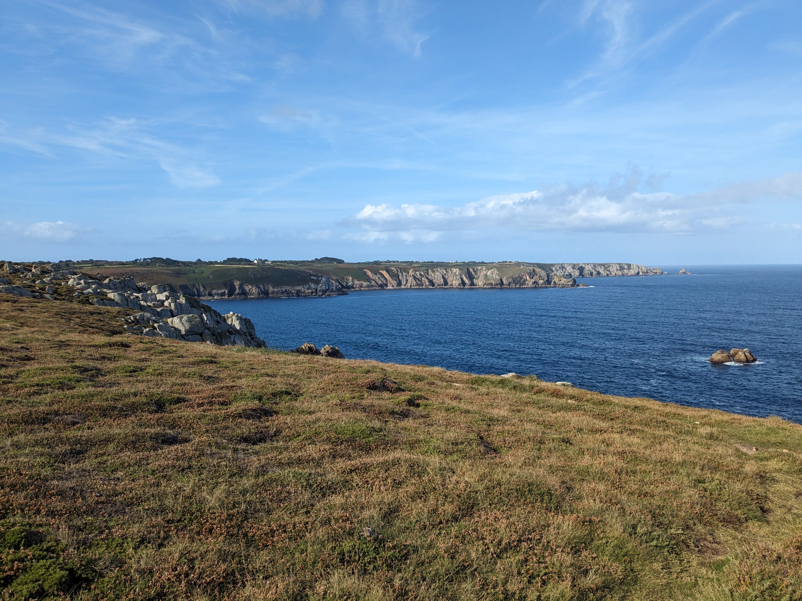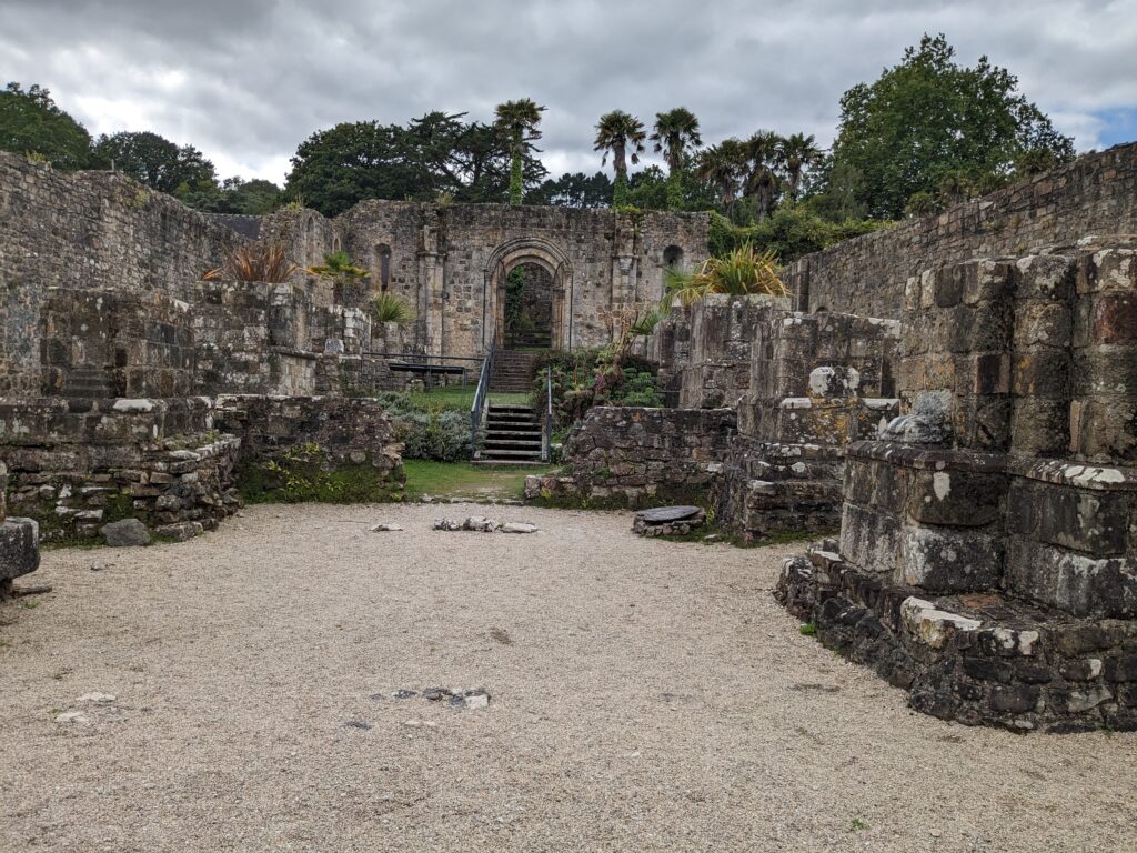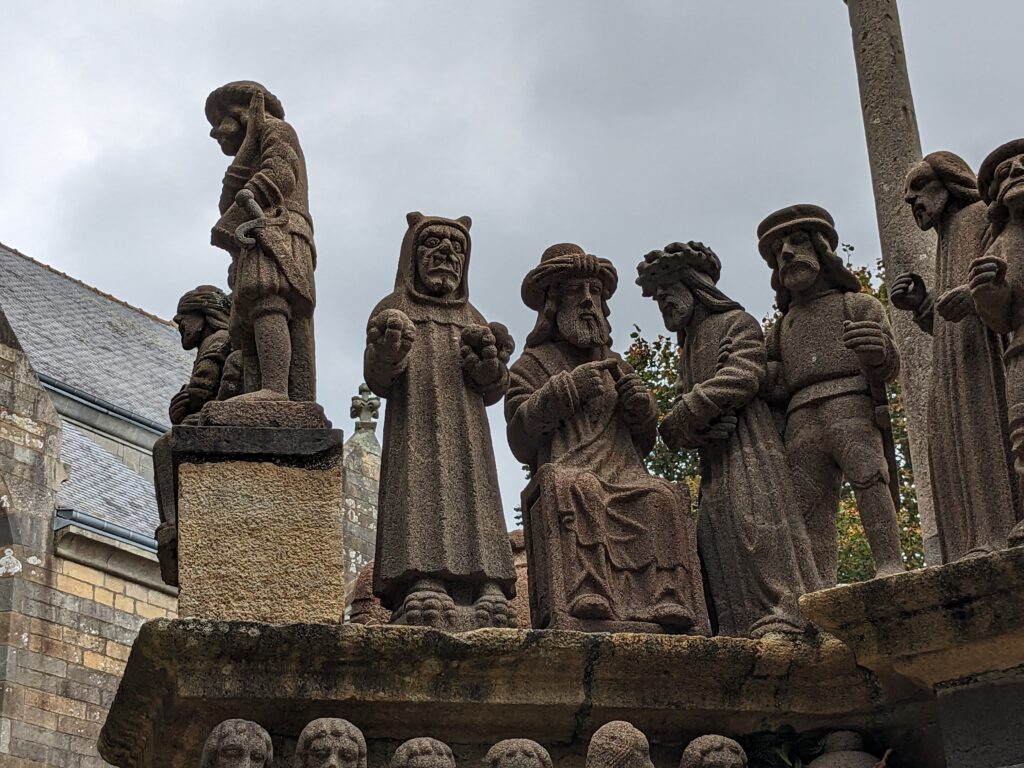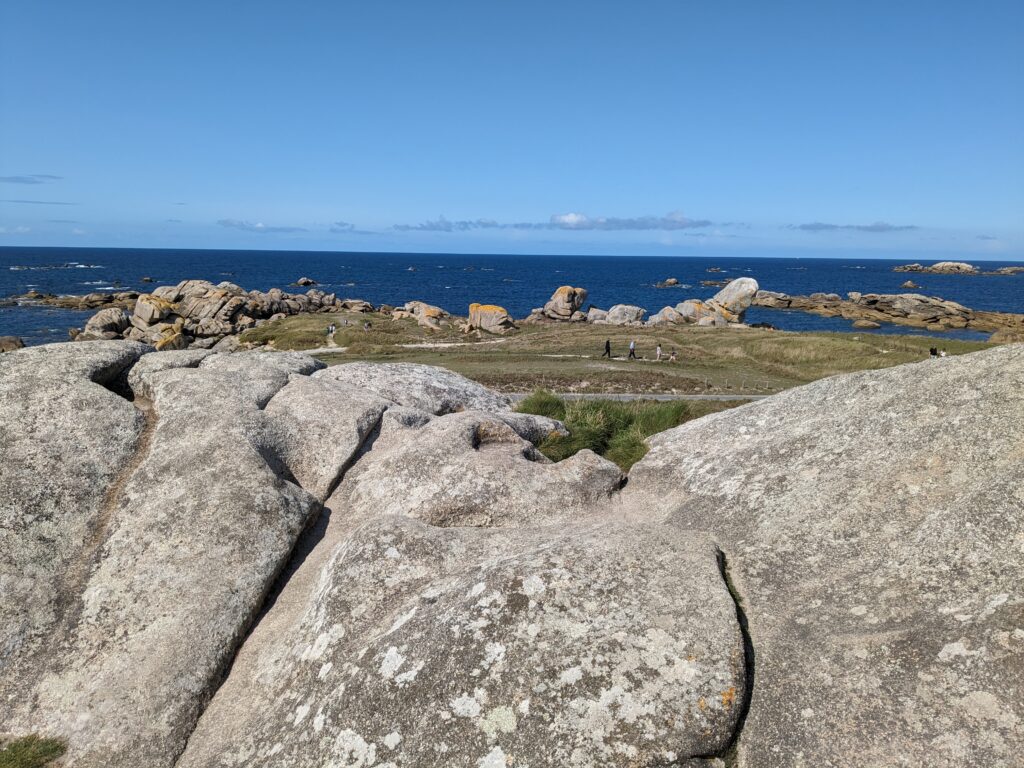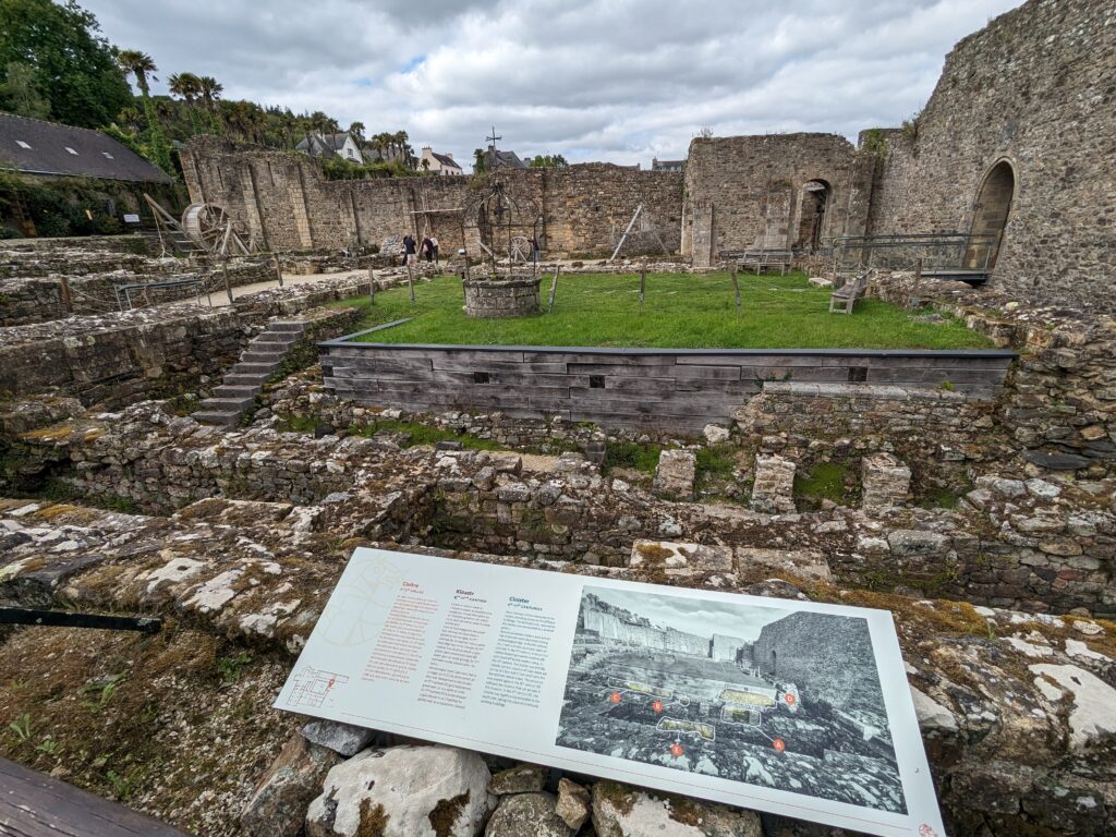 Das Wetter ist nach wie vor wolkig, aber wieder trocken. Nach einem Frühstück mit Huhn, geht es zur Crozon Halbinsel. Aber als Erstes gibt es noch einen kleinen Leuchtturm. Den Phare Petit Minou. Als kleinen „Beifang“ gibt es 2 Caches, bevor es bergan zurück zum Wobi geht. Dann müssen wir durch Brest. Das einzig positive an Brest ist, wir können hier Gas tanken und Baguette kaufen. Ansonsten: bloß weg. In Plougastel-Daoulas machen wir einen kurzen Stopp, um uns eine Calvarie anzusehen, dann geht es weiter, pünktlich zum Kaffee erreichen wir die Abbaye Landevennec. Eine Ruine, die wir uns ansehen wollen, dank Google ist ein Parkplatz schnell gefunden. Hier gibt es Espresso aus der Akkumaschine und Himbeertörtchen. Dann stapfen wir los und stehen nach ein paar  Minuten in einer riesigen modernen Kirche, von Ruinen keine Spur. Das hier ist das neue Kloster, das alte, sprich die Ruine ist 10 Minuten den Hügel runter. Das verursacht Ralf mächtig schlechte Laune, den Hügel runter heißt später Hügel rauf. Wir machen es trotzdem und betrachten uns das Museum und die Ruine. Dann unter Schnaufen und Murren zurück zum Wobi und Abfahrt. Bei Camaret-sur-Mer gibt es einen Stellplatz ohne Strom aber mit „Steingarten“ (die Steinreihen von Lagatjar sind direkt vor der Tür) für 12.00€. Aber bevor wir zum gemütlichen Teil übergehen, geht es noch auf die nahe Klippe und zu 2 Caches.