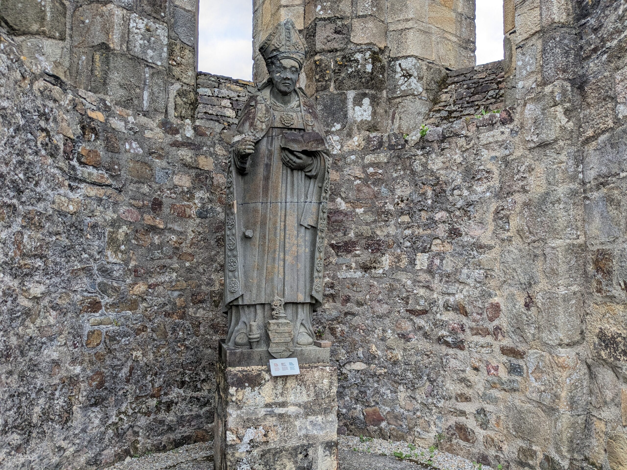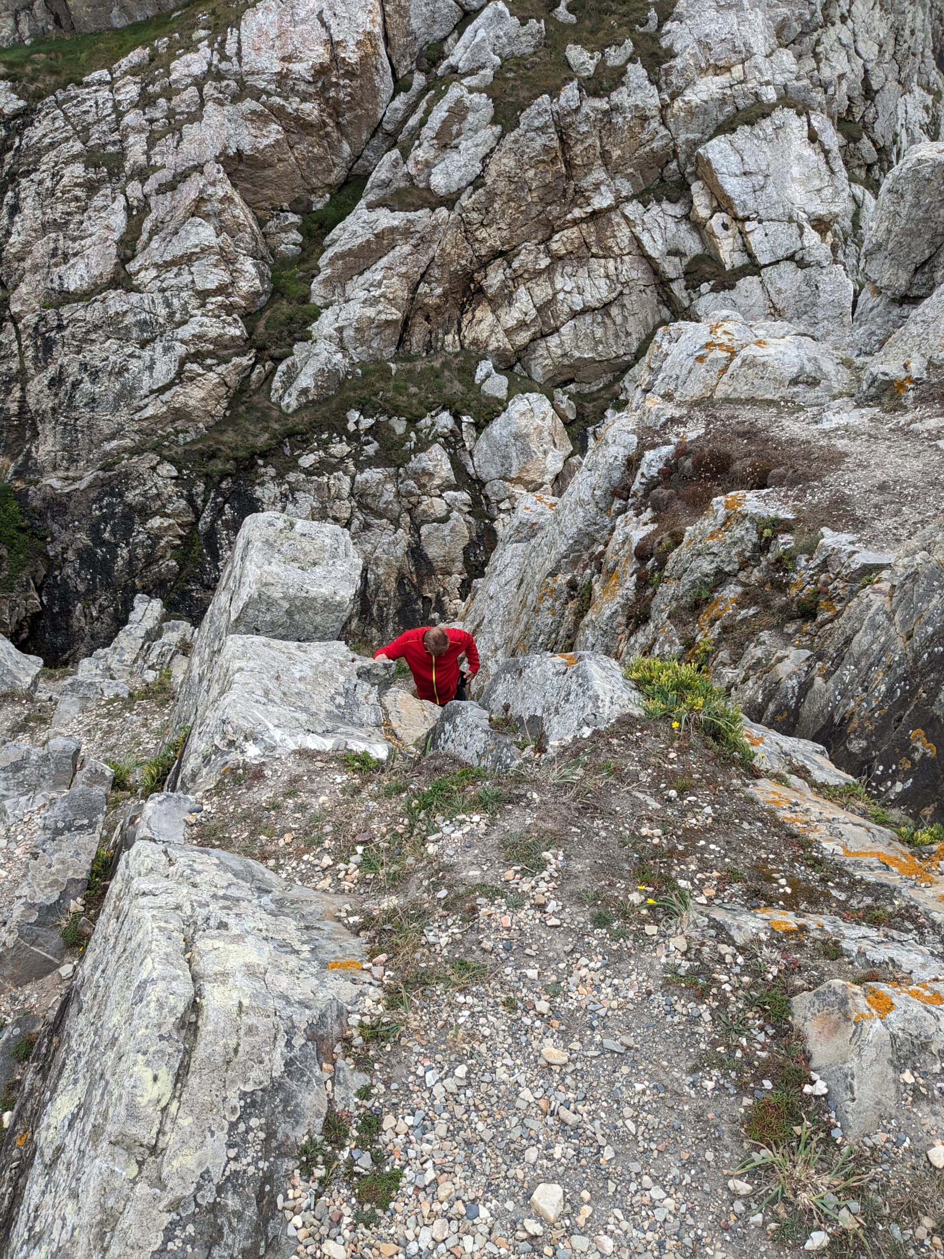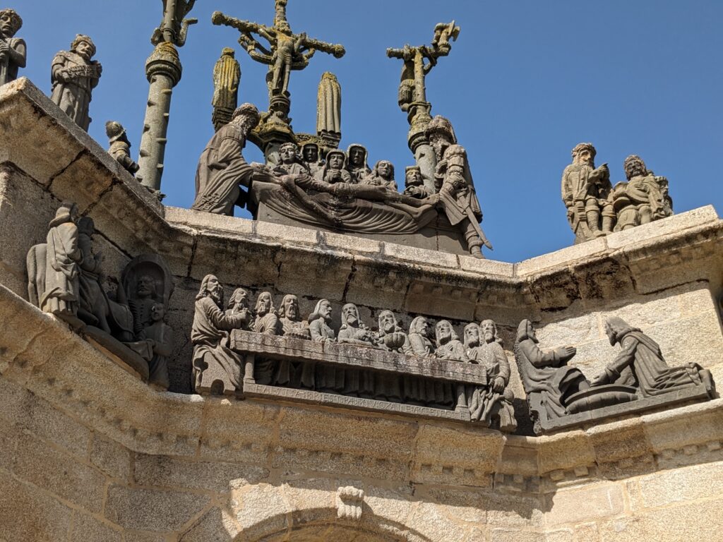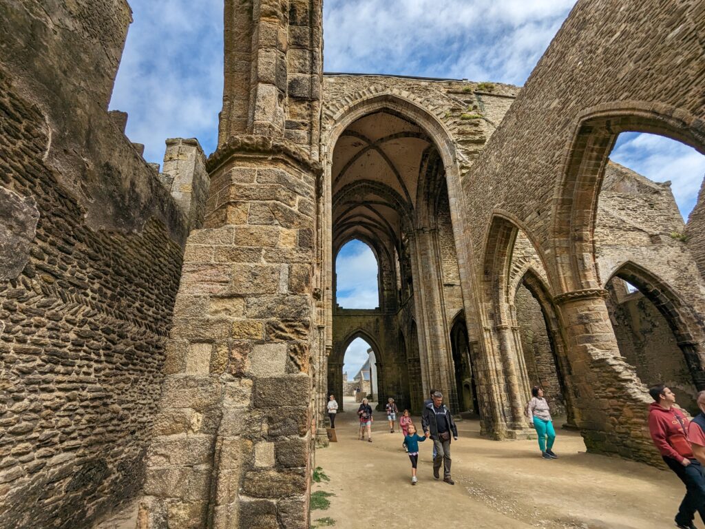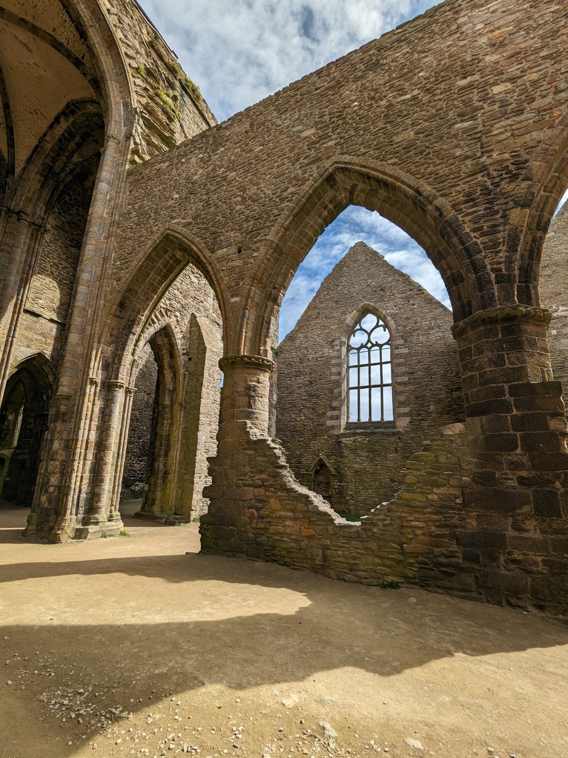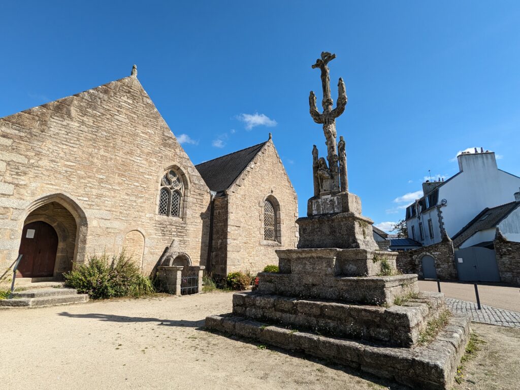 Das Wetter ist nach wie vor wolkig, aber wieder trocken. Nach einem Frühstück mit Huhn, geht es zur Crozon Halbinsel. Aber als Erstes gibt es noch einen kleinen Leuchtturm. Den Phare Petit Minou. Als kleinen „Beifang“ gibt es 2 Caches, bevor es bergan zurück zum Wobi geht. Dann müssen wir durch Brest. Das einzig positive an Brest ist, wir können hier Gas tanken und Baguette kaufen. Ansonsten: bloß weg. In Plougastel-Daoulas machen wir einen kurzen Stopp, um uns eine Calvarie anzusehen, dann geht es weiter, pünktlich zum Kaffee erreichen wir die Abbaye Landevennec. Eine Ruine, die wir uns ansehen wollen, dank Google ist ein Parkplatz schnell gefunden. Hier gibt es Espresso aus der Akkumaschine und Himbeertörtchen. Dann stapfen wir los und stehen nach ein paar  Minuten in einer riesigen modernen Kirche, von Ruinen keine Spur. Das hier ist das neue Kloster, das alte, sprich die Ruine ist 10 Minuten den Hügel runter. Das verursacht Ralf mächtig schlechte Laune, den Hügel runter heißt später Hügel rauf. Wir machen es trotzdem und betrachten uns das Museum und die Ruine. Dann unter Schnaufen und Murren zurück zum Wobi und Abfahrt. Bei Camaret-sur-Mer gibt es einen Stellplatz ohne Strom aber mit „Steingarten“ (die Steinreihen von Lagatjar sind direkt vor der Tür) für 12.00€. Aber bevor wir zum gemütlichen Teil übergehen, geht es noch auf die nahe Klippe und zu 2 Caches.