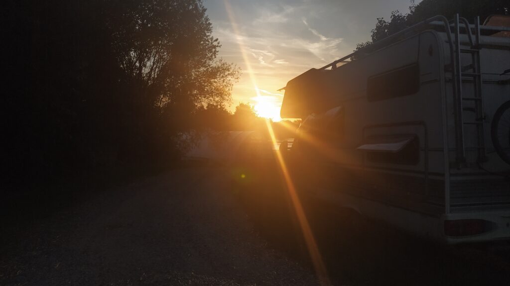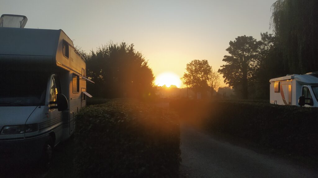 In der Nacht gab es kaum Abkühlung, trotzdem haben wir recht gut geschlafen, hier ist es herrlich ruhig, wenn die Nachbarn mit ihrem Camperschach (wer die Tür am lautesten knallt, hat gewonnen. Jeder hat 3 Versuche, ist sie wirklich zu? ) und dem Gasflaschenkegeln fertig sind und wenn dann noch die Fußhupe ? nebenan Ruhe gibt, ist alles schick! Heute ist leider Rückweg angesagt, aber bei 32° ist wohl die beste Option Fenster auf und Vollgas vorraus. Auf „überfüllten‘ Autobahnen geht es über „winzige“ Brücken Richtung Norden. Ralf hat Spaß mit Bip & Go. Wir können nicht nur die t-Spuren, sondern alle benutzen. Abends schlagen wir unser Nachtlager nach 445 km bei Cappy an der Somme 13:60€ (Pass’Etapes wieder mal) auf.