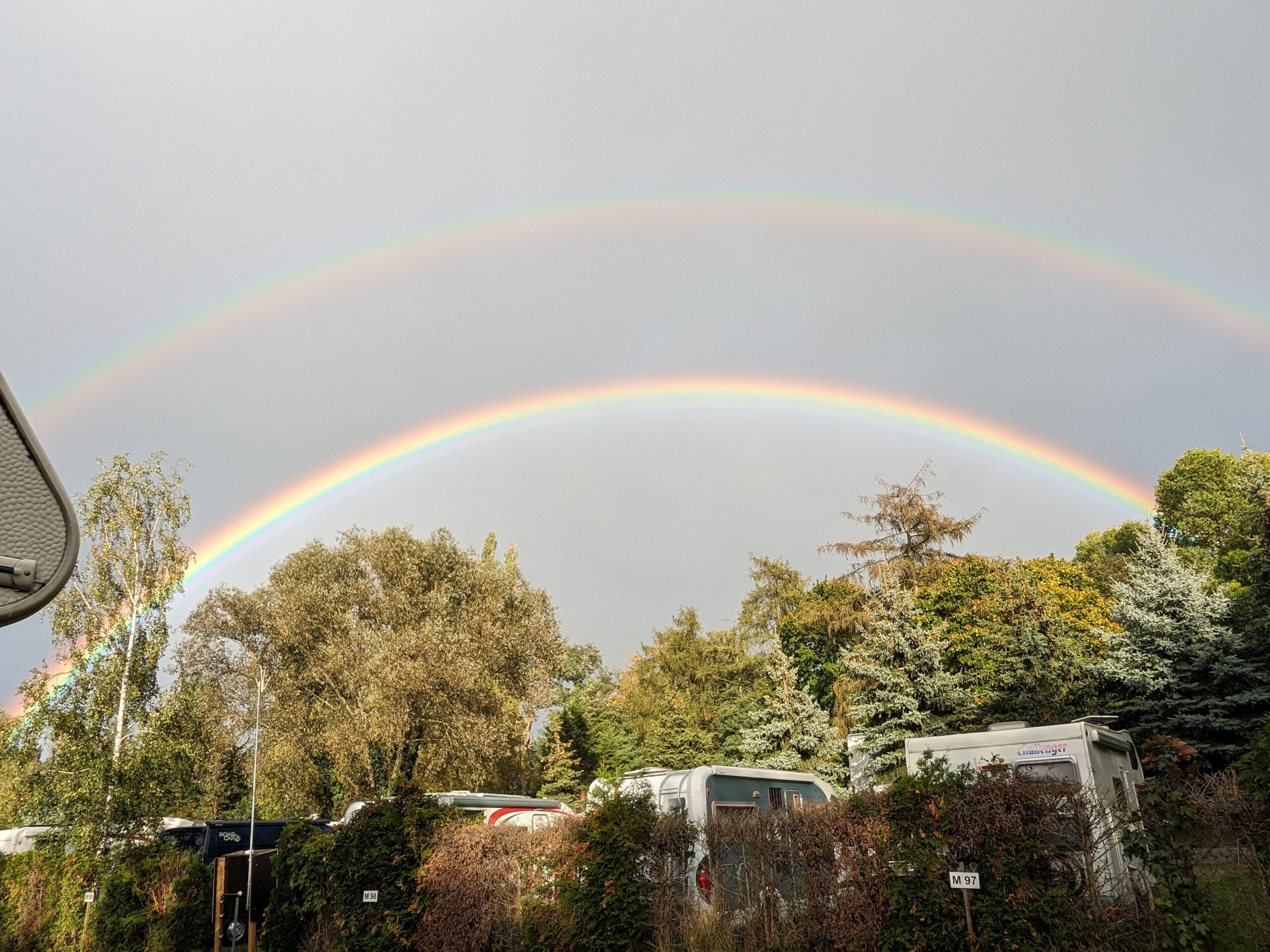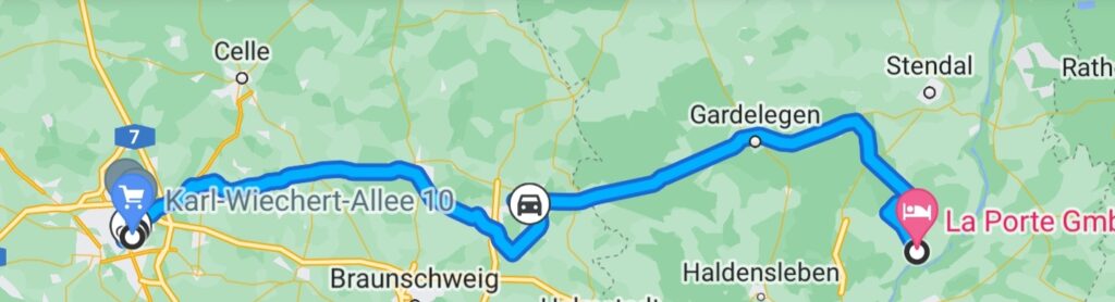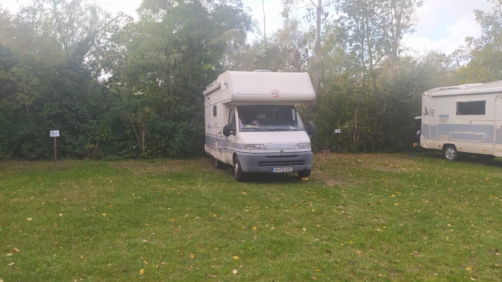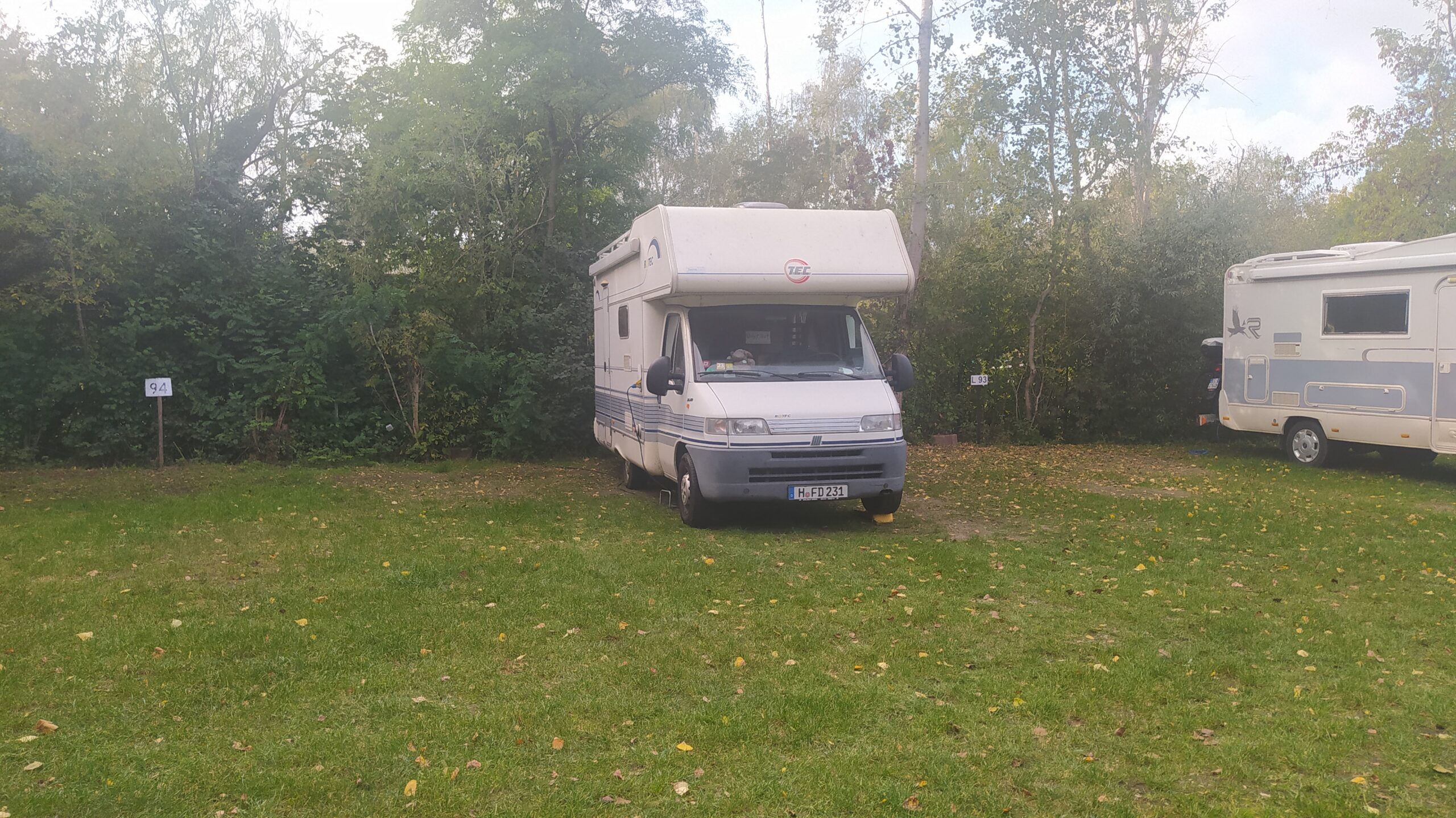 Abfahrt bei ca. 194470 km. Um 17 Uhr geht vor der Haustür los. Die A2 ist bei Braunschweig voll gesperrt, also nehmen wir die B188. Die ist bei Gifhorn auch gesperrt und wir irren umher. Um 20 Uhr erreichen wir den Stellplatz und ich checke uns mit der Reservierungsnummer ein, alle Daten kennt das System schon und alles geht fix. Die 5-köpfige Familie muss alle Namen und Daten von Hand eintippen, das dauert..