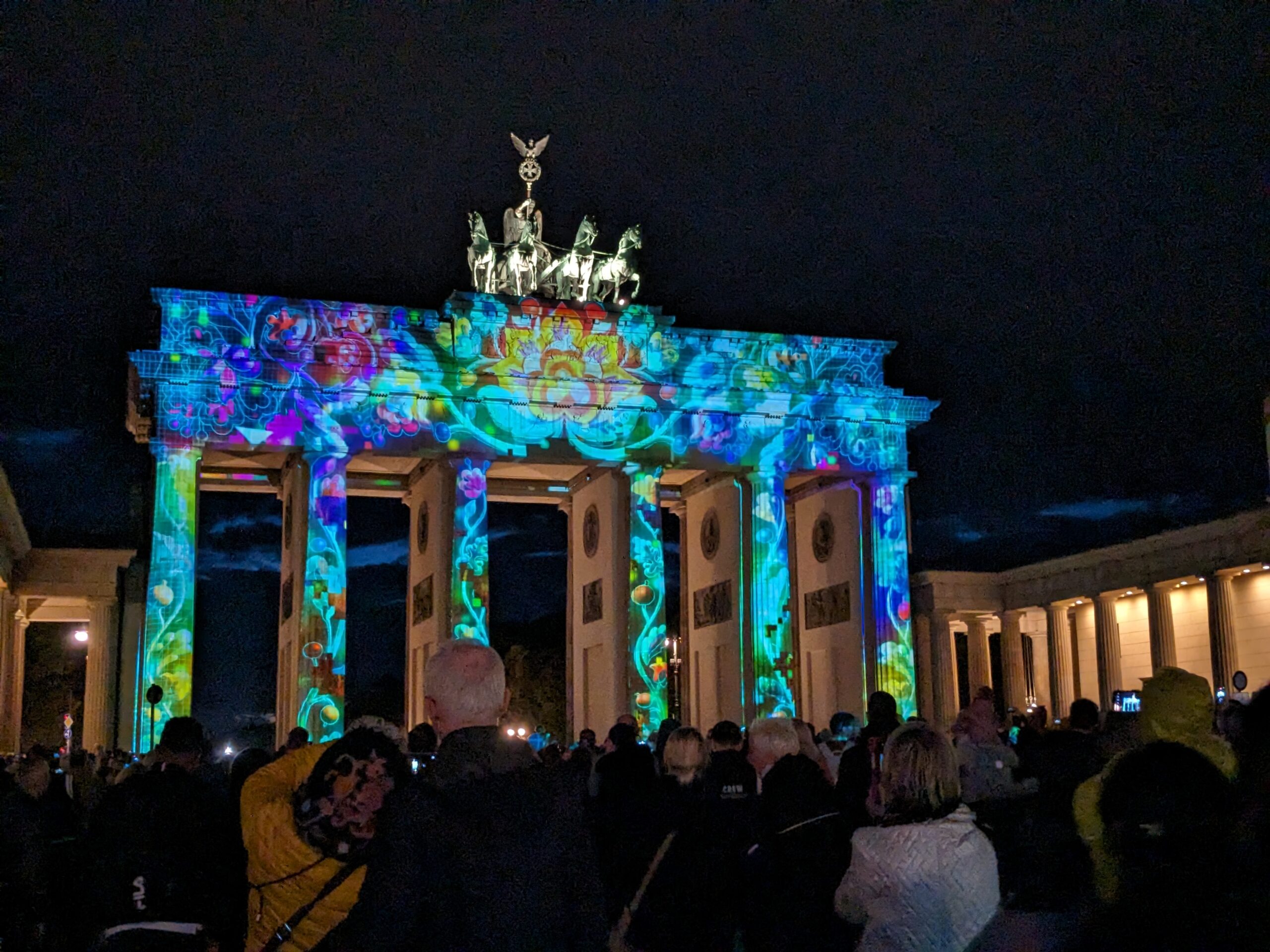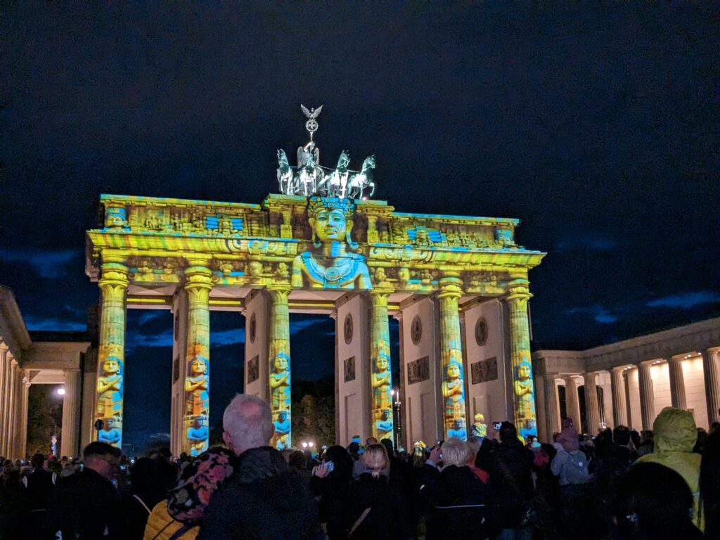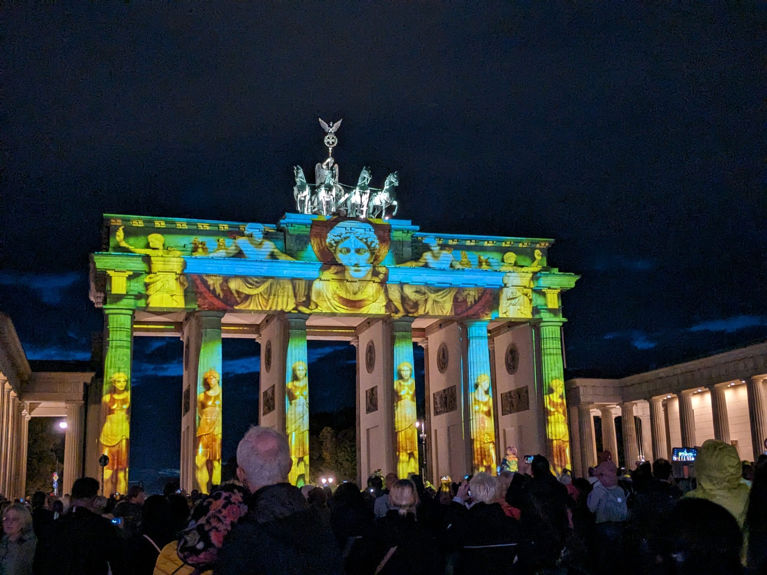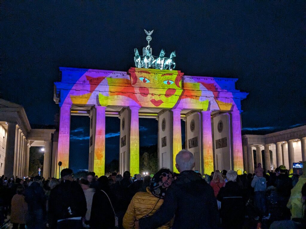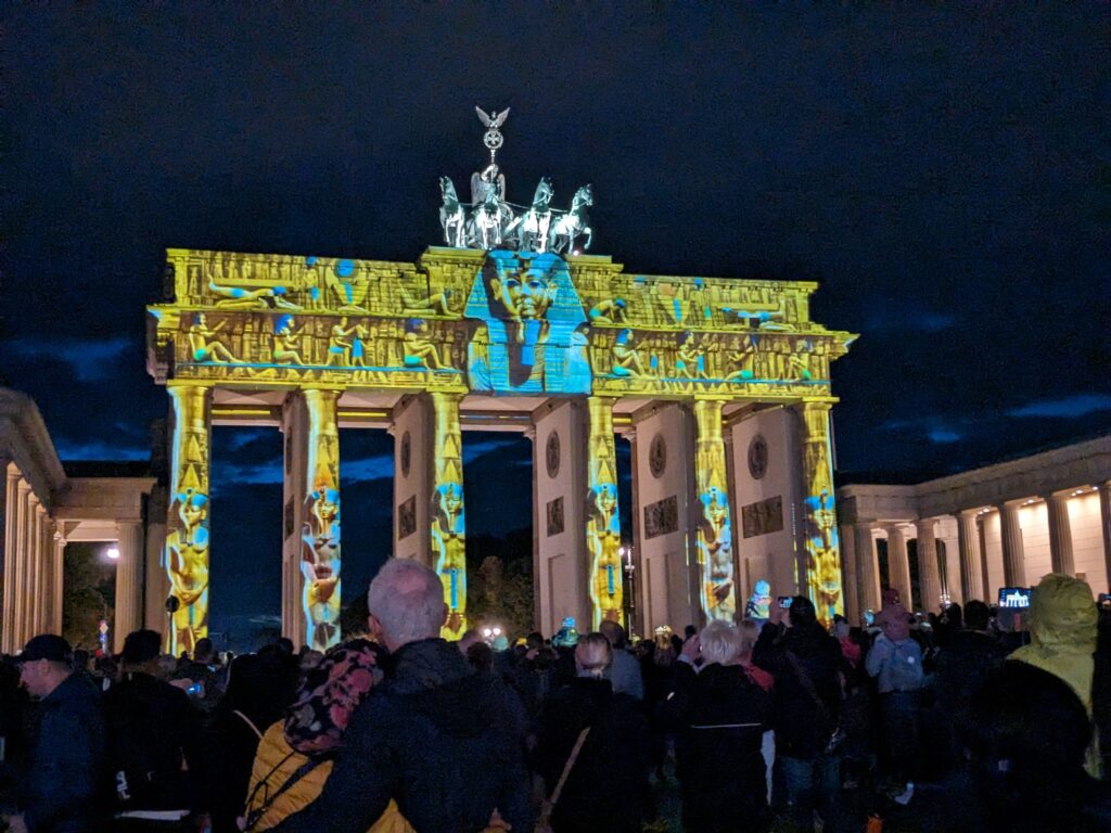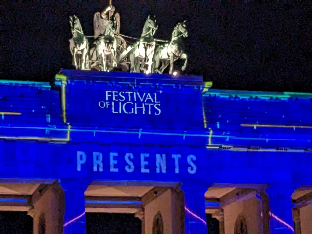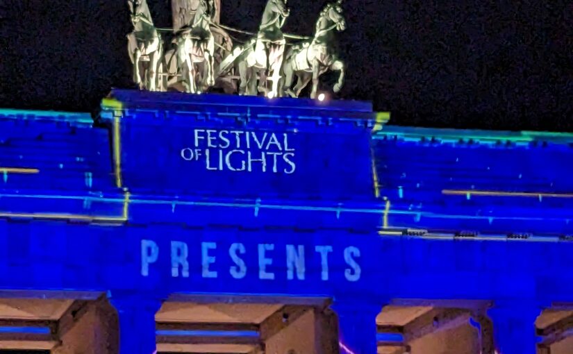 Nach einer sehr ruhigen Nacht sind wir um 11 Uhr startklar, diesmal hat die automatische Reinigung des Bongos im Camperclean auch gut funktioniert. Gegen 15 Uhr kommen wir nach der Umleitung der Umleitung in der Umleitung und Backfisch mit Kartoffelsalat in Ermangelung von auswärtiger Futter-Aufnahme auf dem Stellplatz in Berlin Tegel an. Nach einem kurzen Nickerchen, Ralf putzt derweil die Scheiben, geht es los, 15 Min. zu Fuß zum Bahnhof Tegel, dann mit dem S-Bahn 40 Minuten zum Bahnhof Friederichsstraße. Kurzer Stopp beim Chinamann und auf geht es zum „Festival of Lights‘ 1. Stopp Brandenburger Tor.