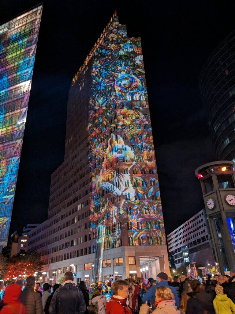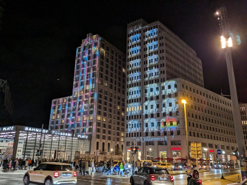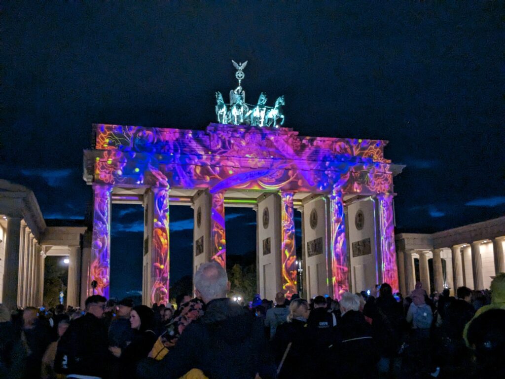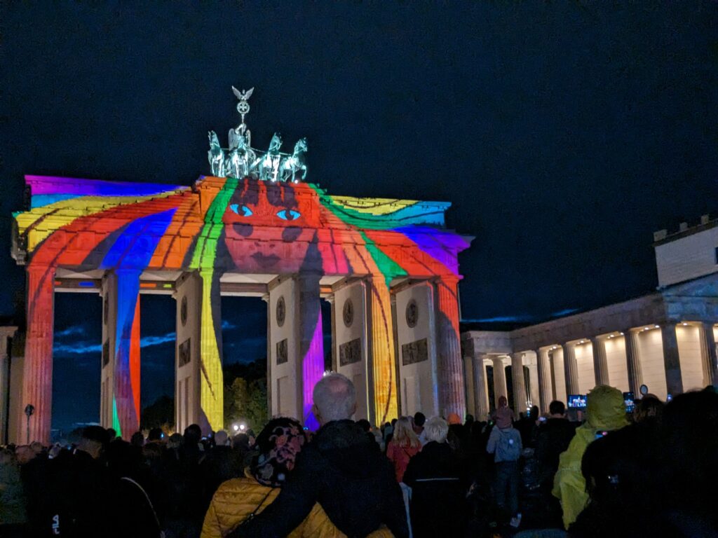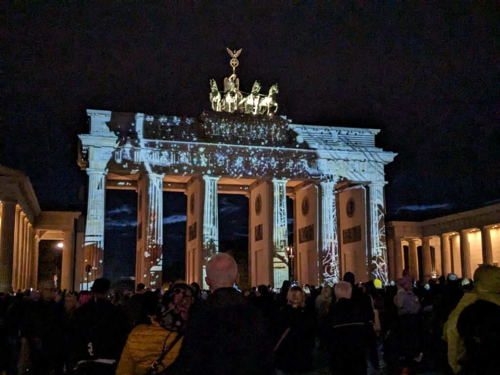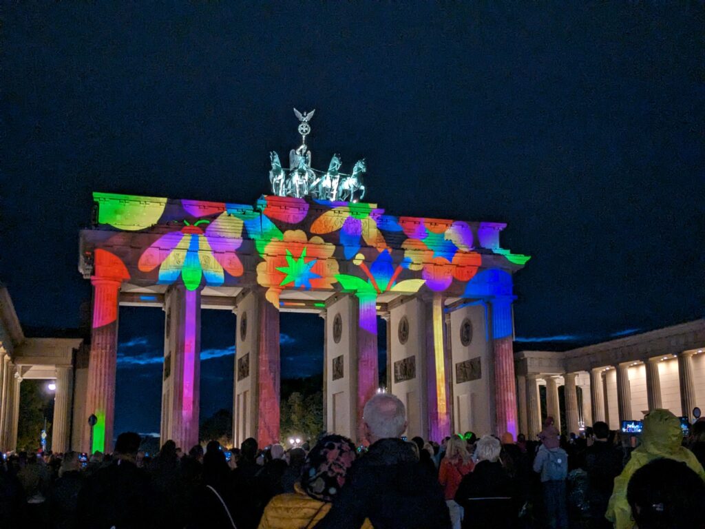 Nach einer sehr ruhigen Nacht sind wir um 11 Uhr startklar, diesmal hat die automatische Reinigung des Bongos im Camperclean auch gut funktioniert. Gegen 15 Uhr kommen wir nach der Umleitung der Umleitung in der Umleitung und Backfisch mit Kartoffelsalat in Ermangelung von auswärtiger Futter-Aufnahme auf dem Stellplatz in Berlin Tegel an. Nach einem kurzen Nickerchen, Ralf putzt derweil die Scheiben, geht es los, 15 Min. zu Fuß zum Bahnhof Tegel, dann mit dem S-Bahn 40 Minuten zum Bahnhof Friederichsstraße. Kurzer Stopp beim Chinamann und auf geht es zum „Festival of Lights‘ 1. Stopp Brandenburger Tor.