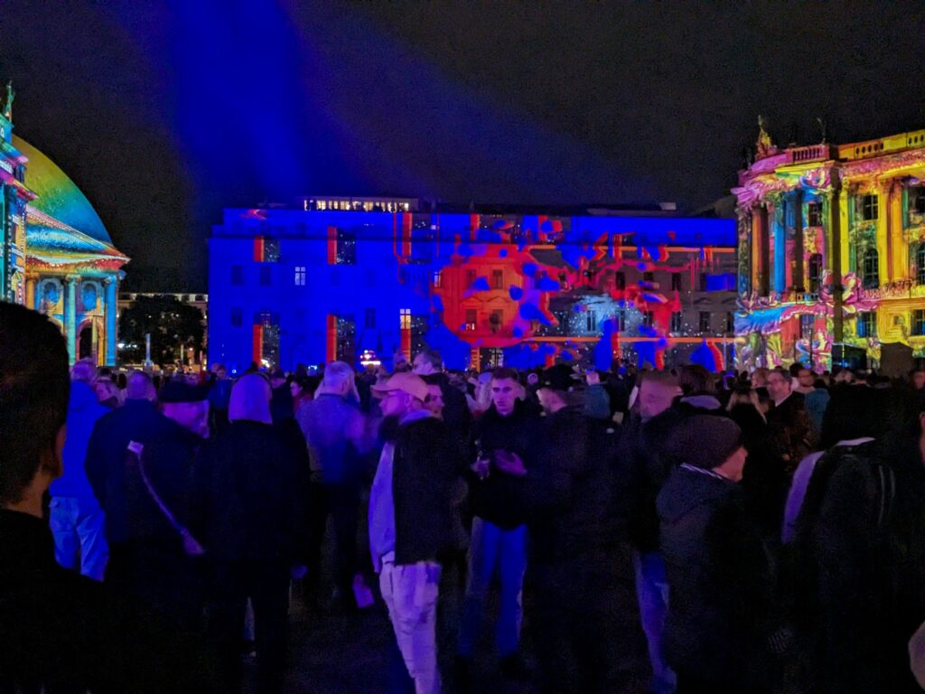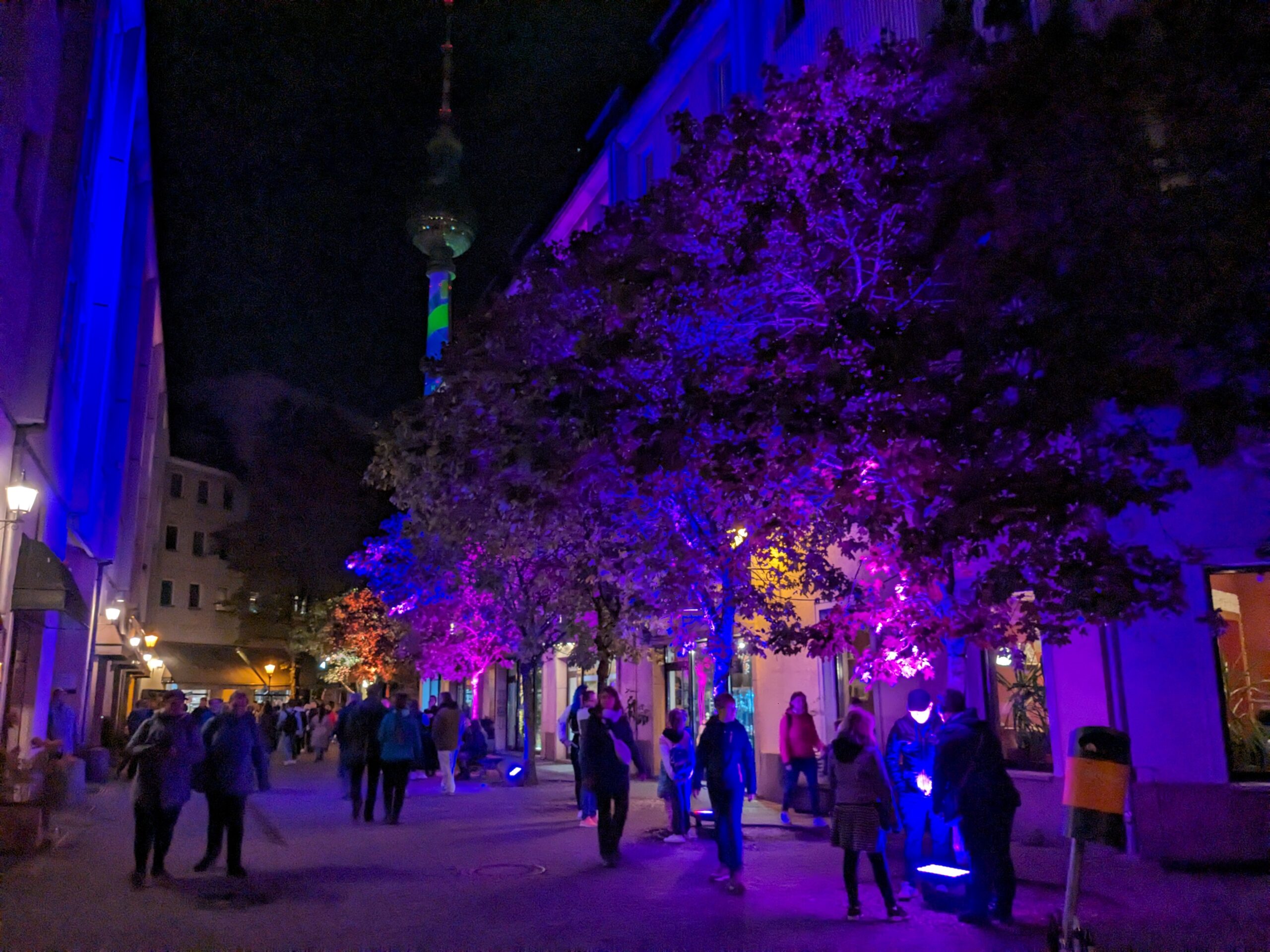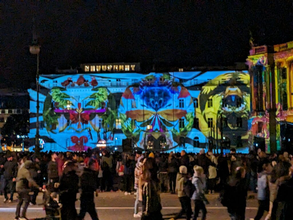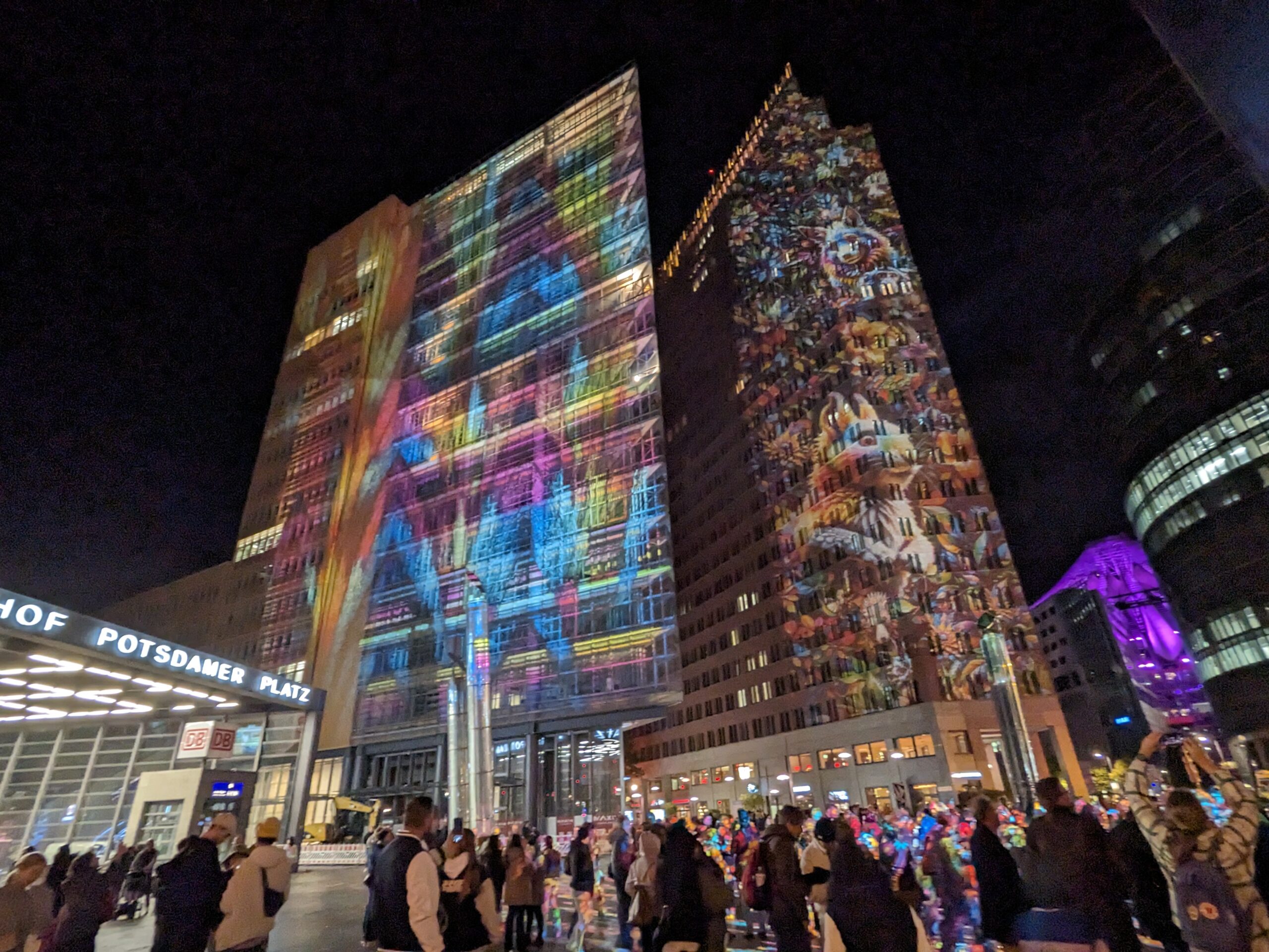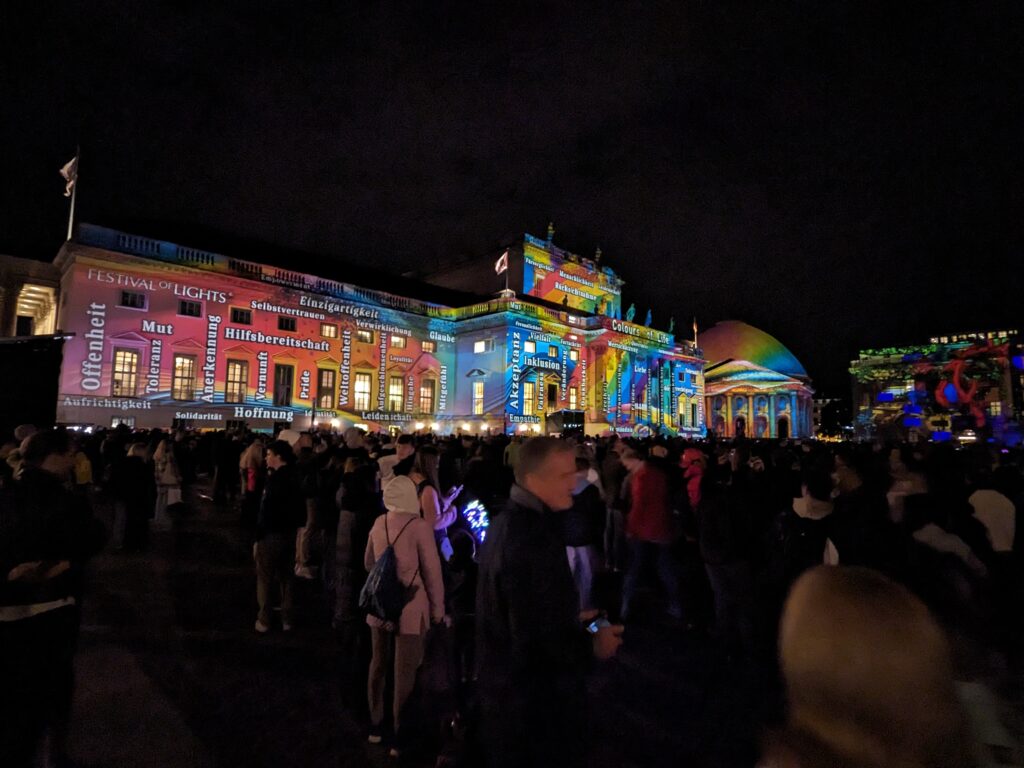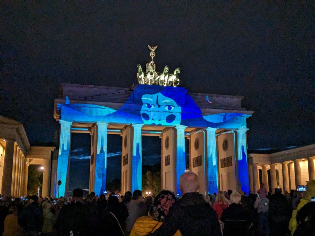Nach einer sehr ruhigen Nacht sind wir um 11 Uhr startklar, diesmal hat die automatische Reinigung des Bongos im Camperclean auch gut funktioniert. Gegen 15 Uhr kommen wir nach der Umleitung der Umleitung in der Umleitung und Backfisch mit Kartoffelsalat in Ermangelung von auswärtiger Futter-Aufnahme auf dem Stellplatz in Berlin Tegel an. Nach einem kurzen Nickerchen, Ralf putzt derweil die Scheiben, geht es los, 15 Min. zu Fuß zum Bahnhof Tegel, dann mit dem S-Bahn 40 Minuten zum Bahnhof Friederichsstraße. Kurzer Stopp beim Chinamann und auf geht es zum „Festival of Lights‘ 1. Stopp Brandenburger Tor.