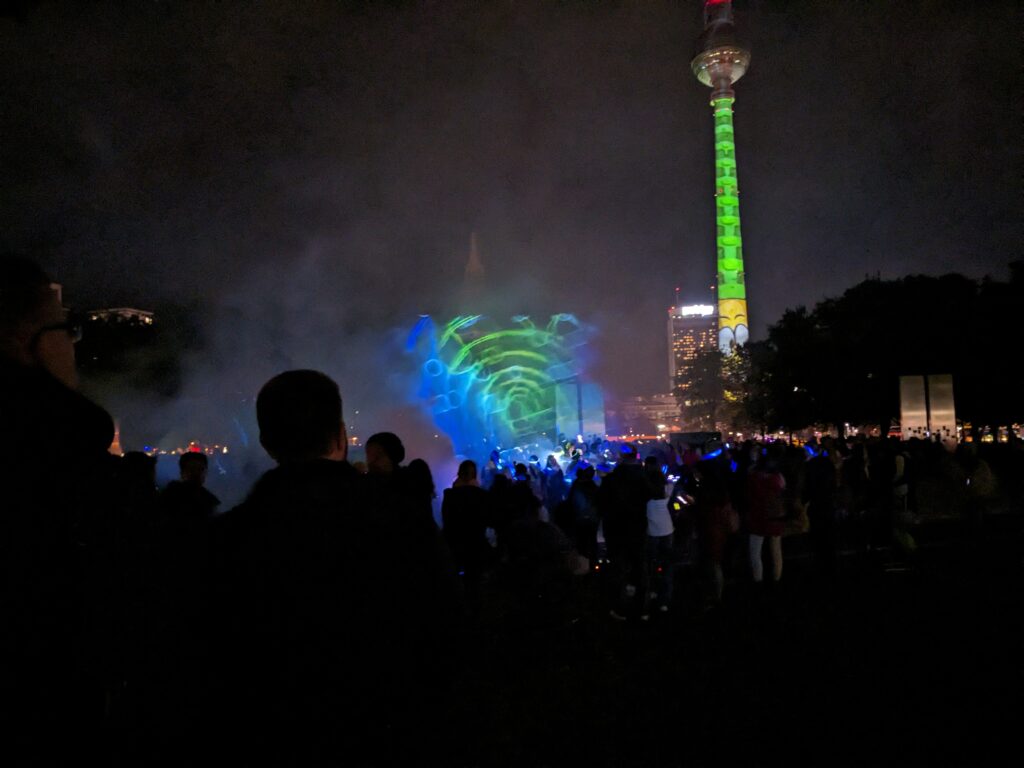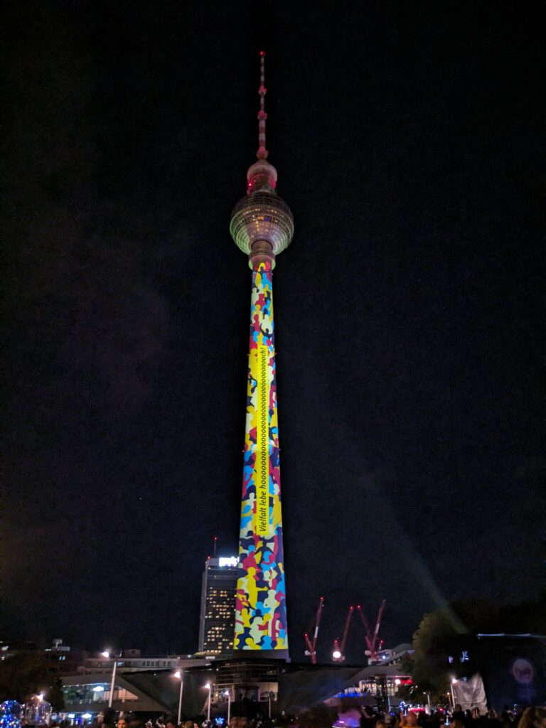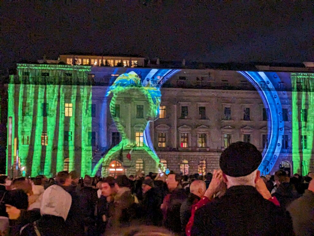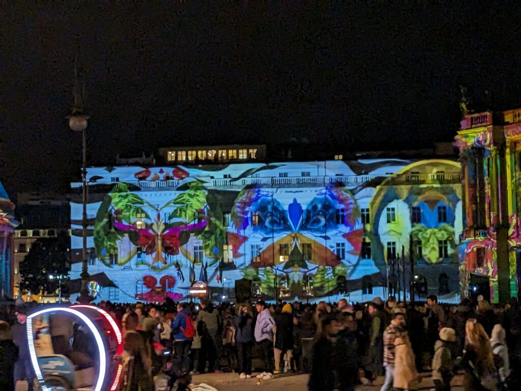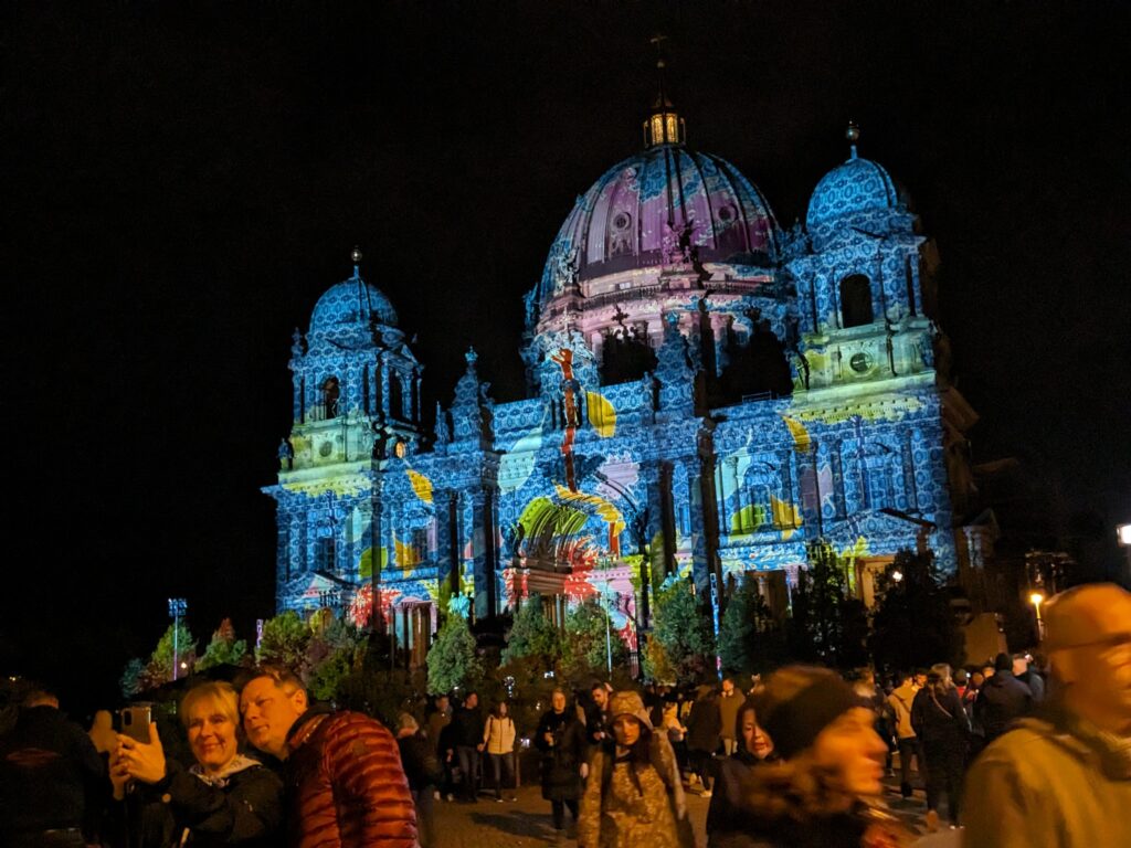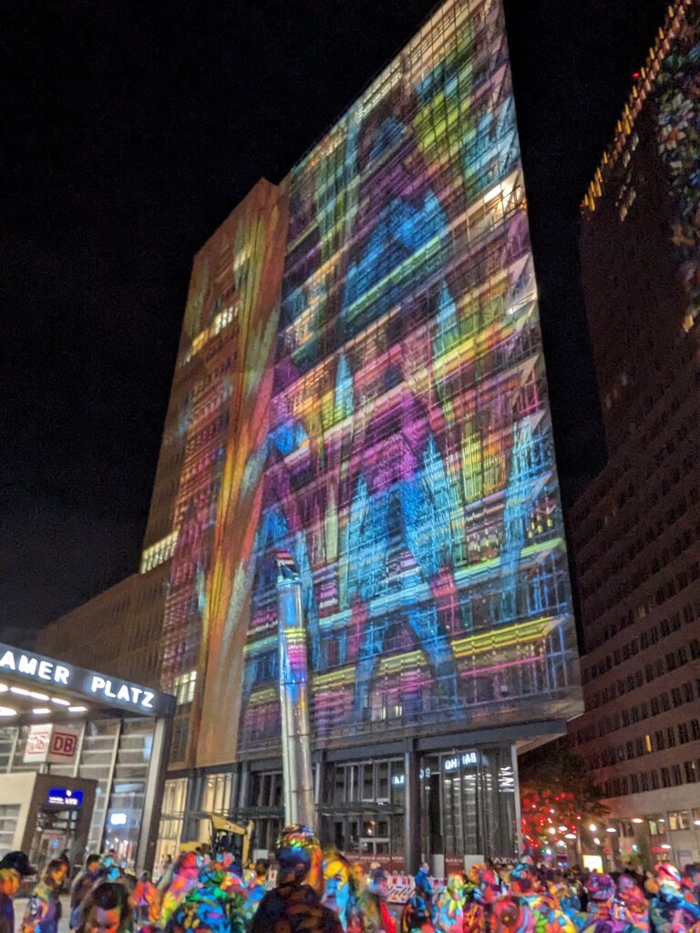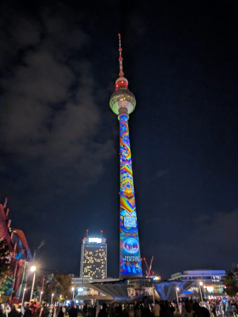 Nach einer sehr ruhigen Nacht sind wir um 11 Uhr startklar, diesmal hat die automatische Reinigung des Bongos im Camperclean auch gut funktioniert. Gegen 15 Uhr kommen wir nach der Umleitung der Umleitung in der Umleitung und Backfisch mit Kartoffelsalat in Ermangelung von auswärtiger Futter-Aufnahme auf dem Stellplatz in Berlin Tegel an. Nach einem kurzen Nickerchen, Ralf putzt derweil die Scheiben, geht es los, 15 Min. zu Fuß zum Bahnhof Tegel, dann mit dem S-Bahn 40 Minuten zum Bahnhof Friederichsstraße. Kurzer Stopp beim Chinamann und auf geht es zum „Festival of Lights‘ 1. Stopp Brandenburger Tor.