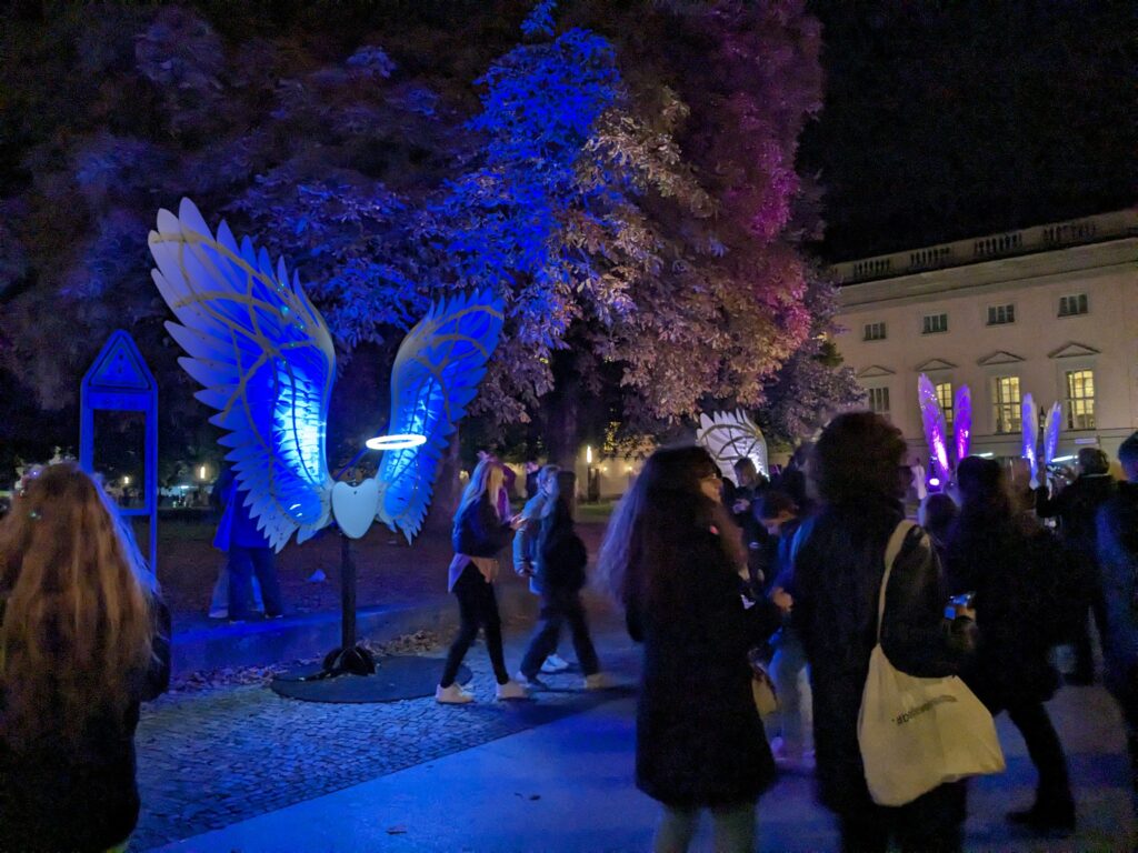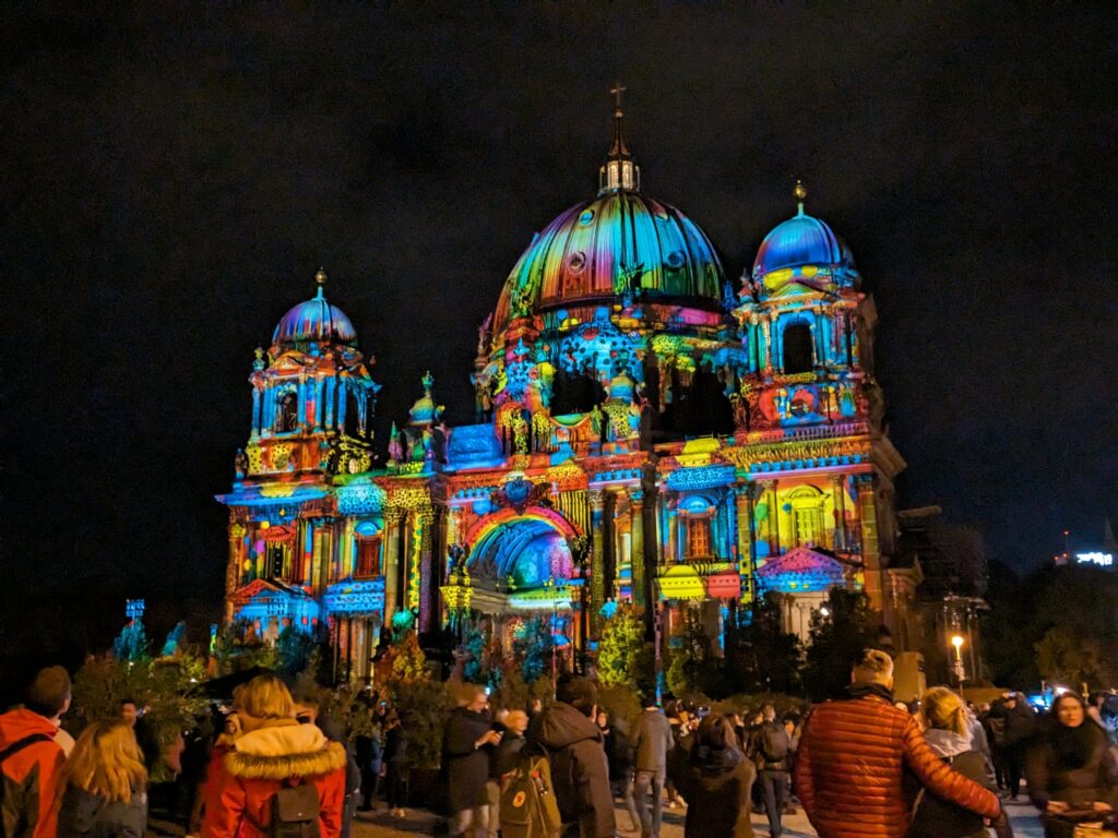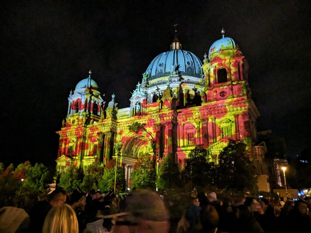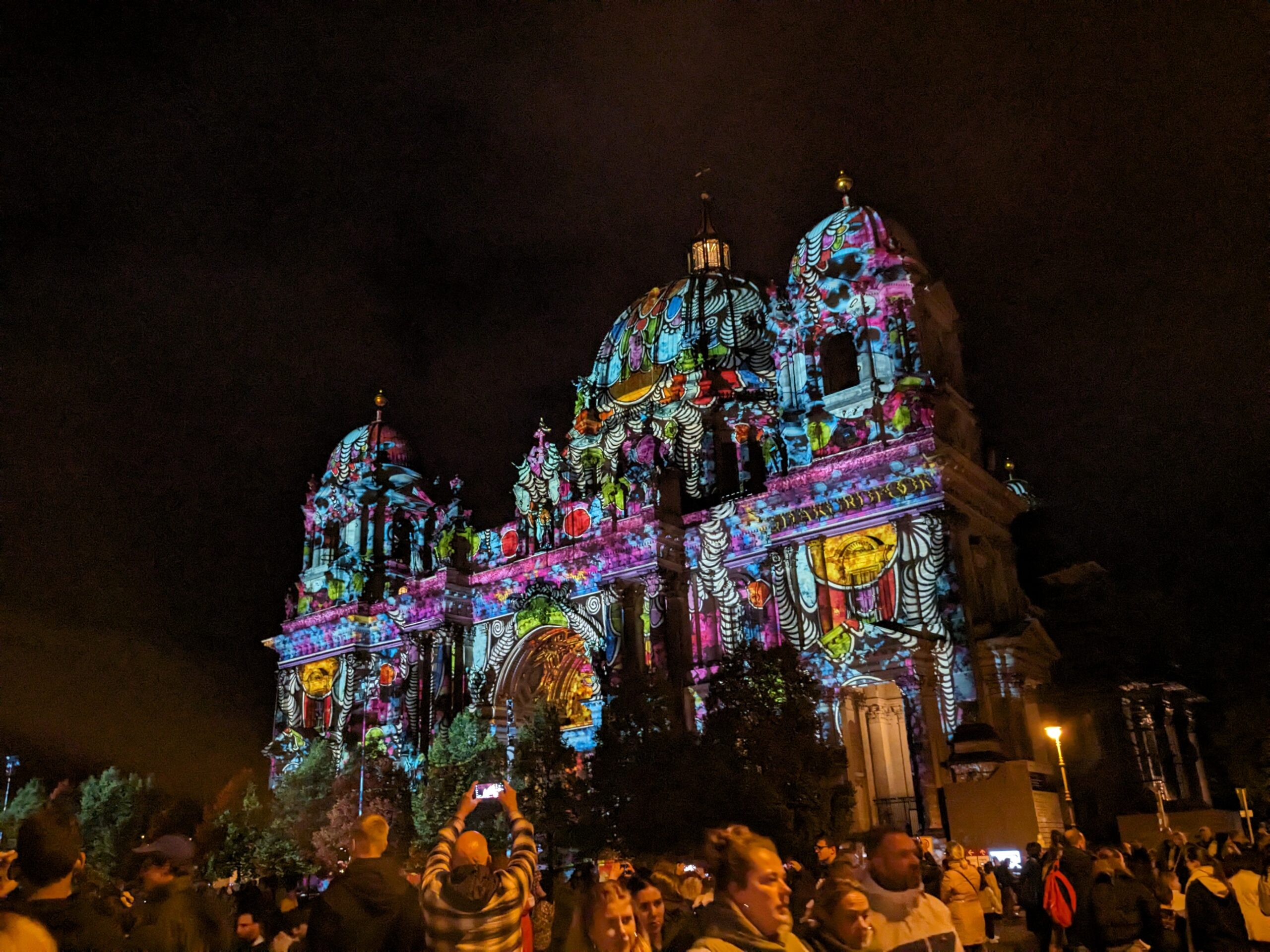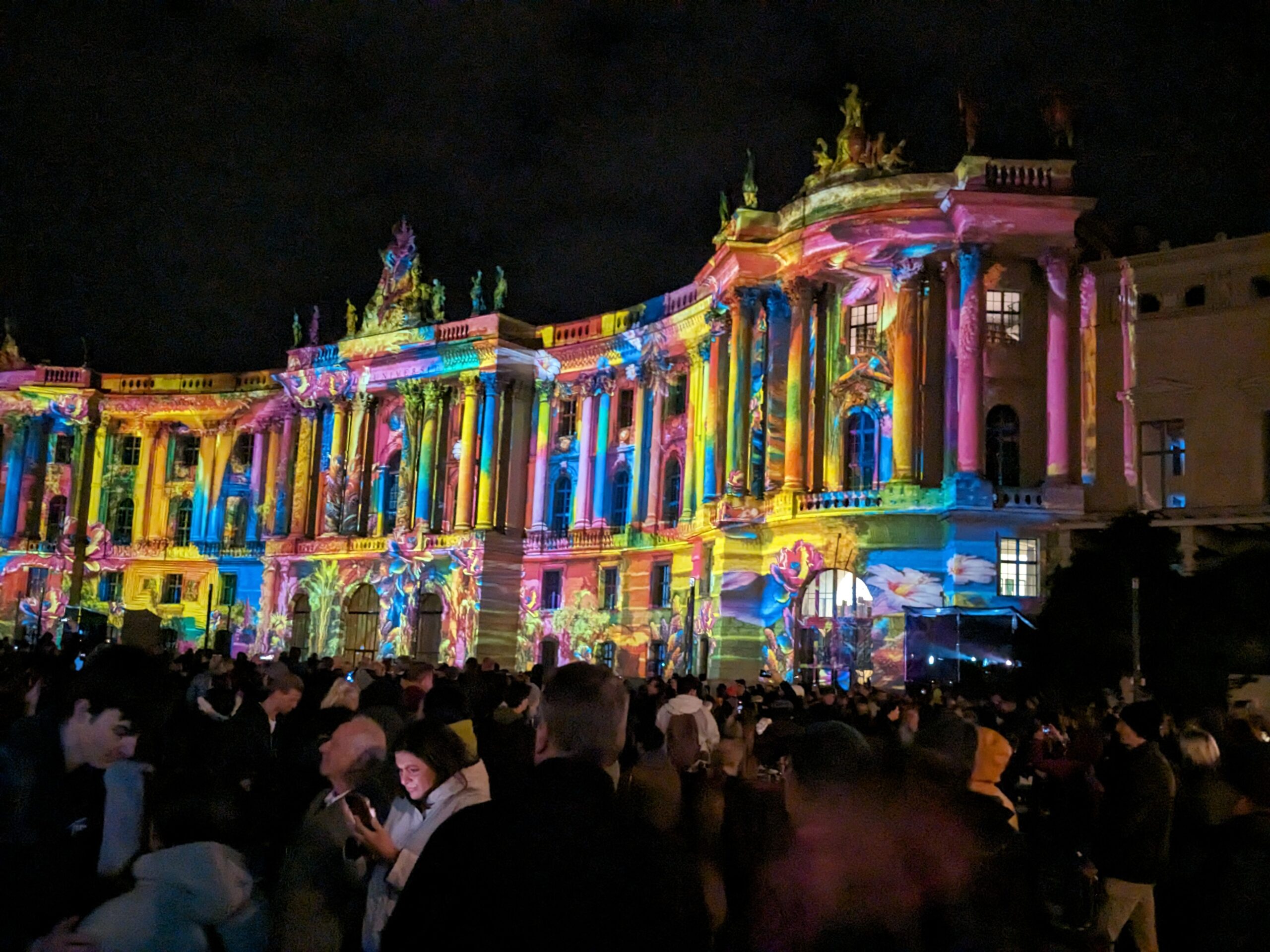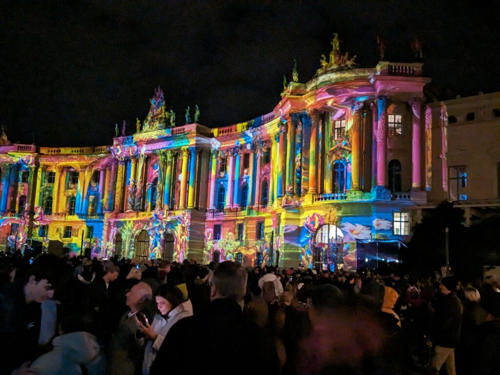 Nach einer sehr ruhigen Nacht sind wir um 11 Uhr startklar, diesmal hat die automatische Reinigung des Bongos im Camperclean auch gut funktioniert. Gegen 15 Uhr kommen wir nach der Umleitung der Umleitung in der Umleitung und Backfisch mit Kartoffelsalat in Ermangelung von auswärtiger Futter-Aufnahme auf dem Stellplatz in Berlin Tegel an. Nach einem kurzen Nickerchen, Ralf putzt derweil die Scheiben, geht es los, 15 Min. zu Fuß zum Bahnhof Tegel, dann mit dem S-Bahn 40 Minuten zum Bahnhof Friederichsstraße. Kurzer Stopp beim Chinamann und auf geht es zum „Festival of Lights‘ 1. Stopp Brandenburger Tor.