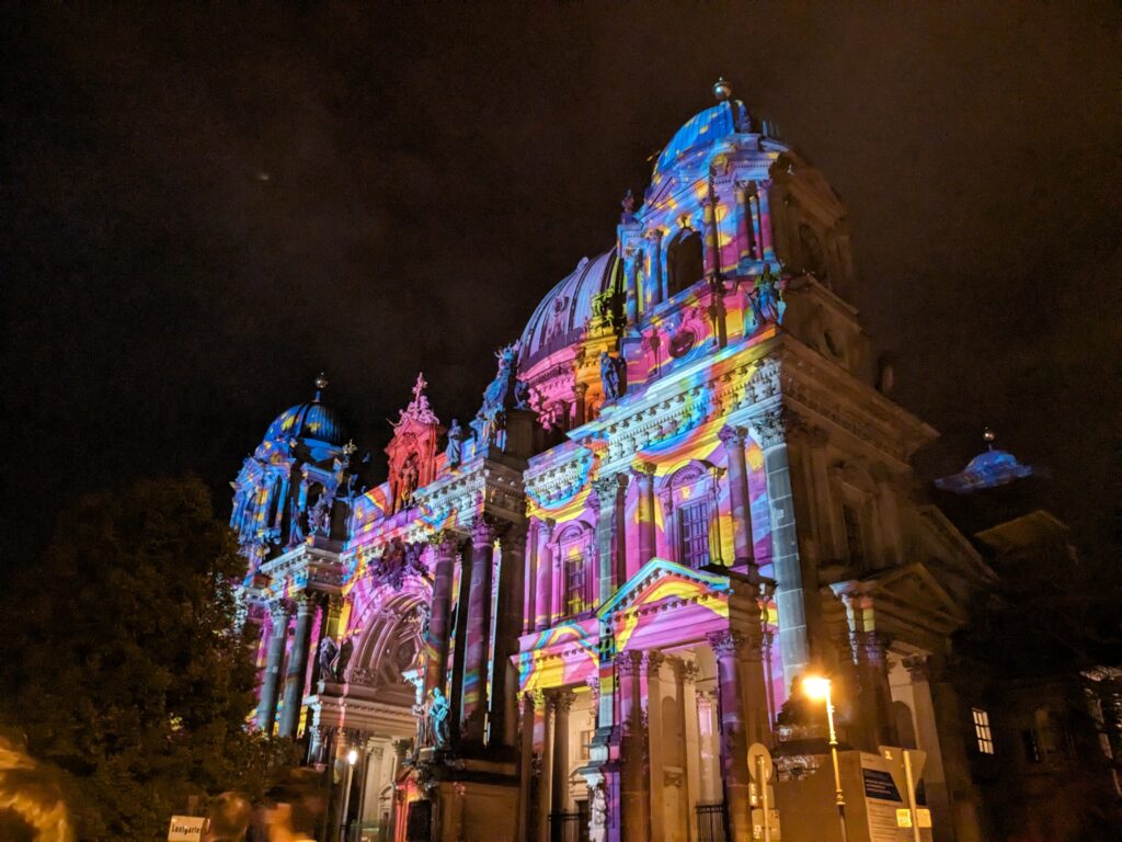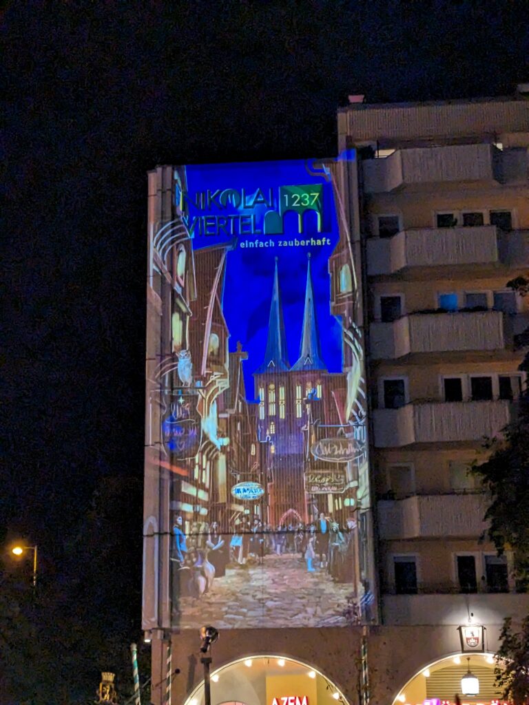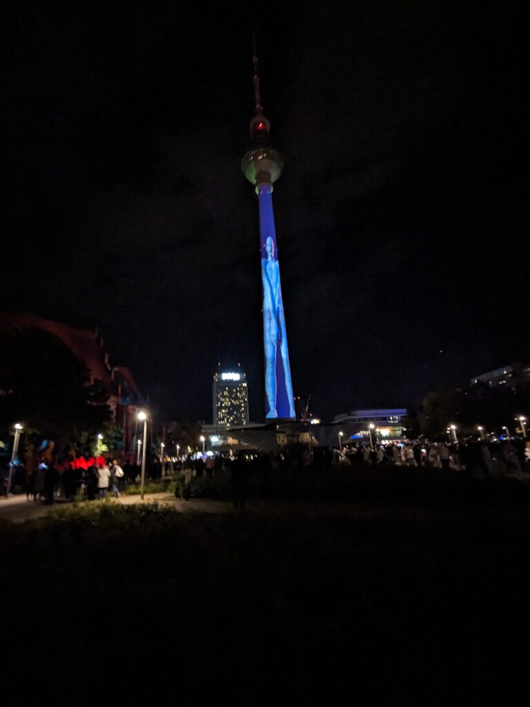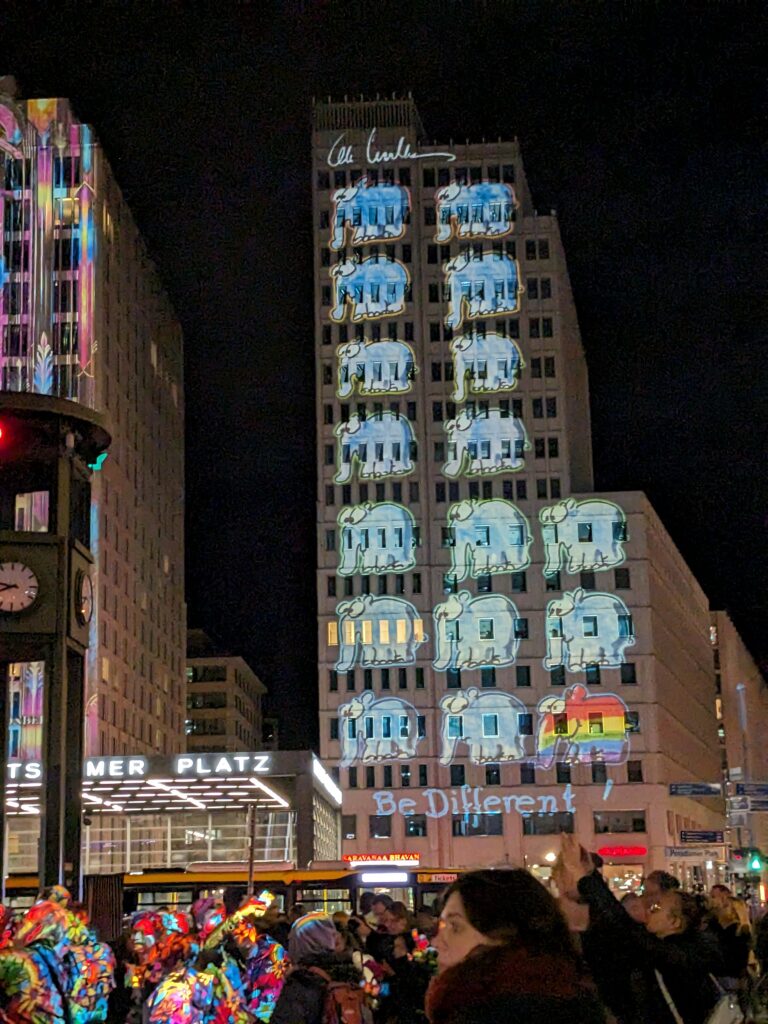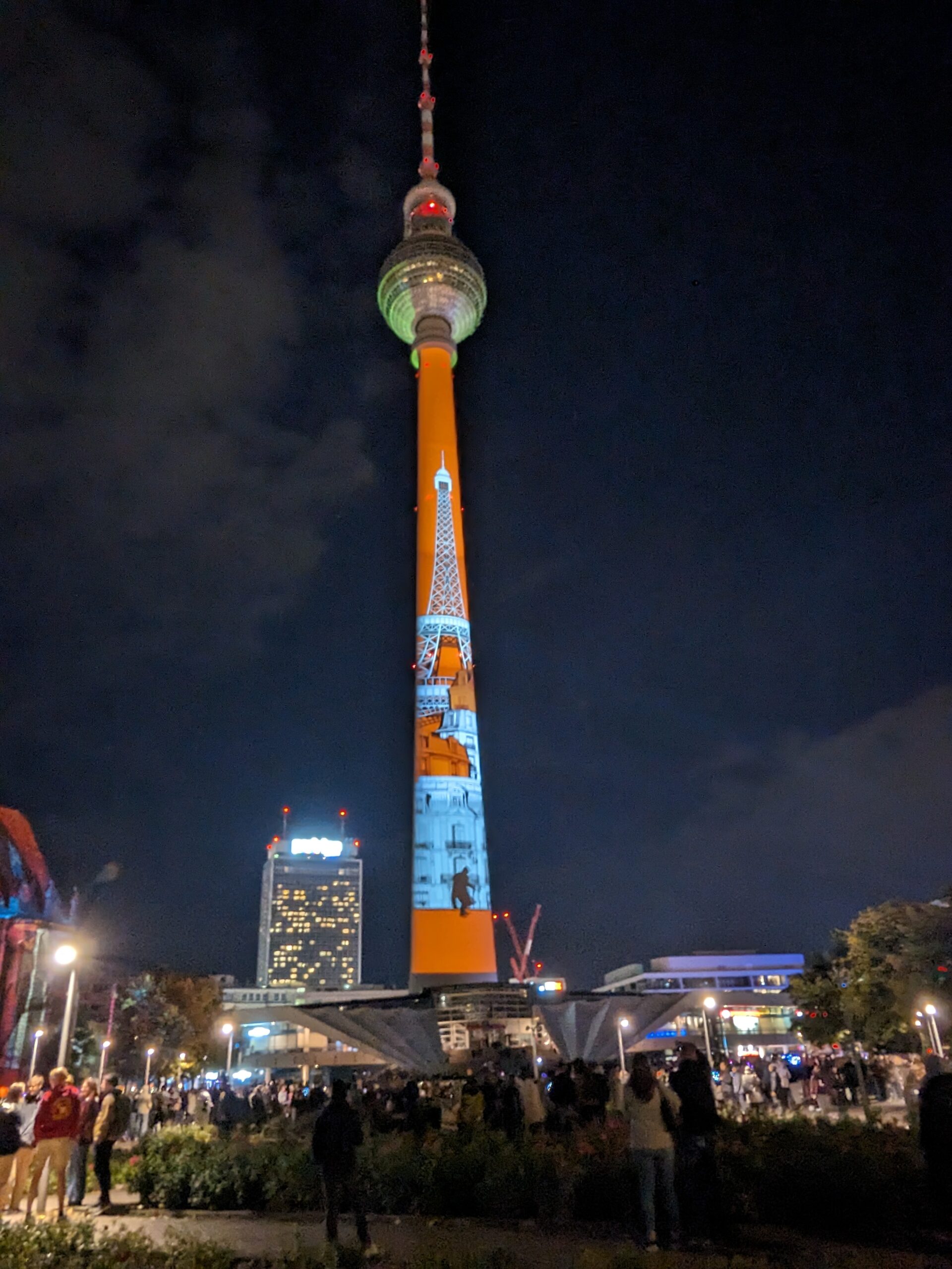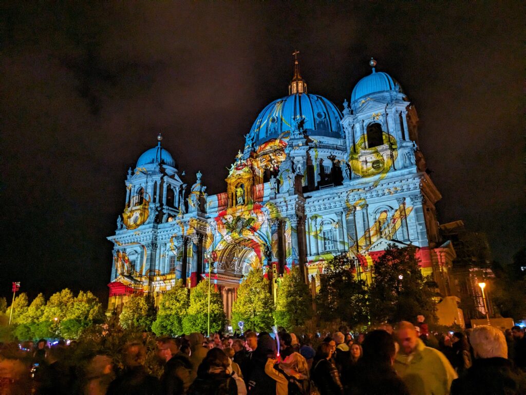 Nach einer sehr ruhigen Nacht sind wir um 11 Uhr startklar, diesmal hat die automatische Reinigung des Bongos im Camperclean auch gut funktioniert. Gegen 15 Uhr kommen wir nach der Umleitung der Umleitung in der Umleitung und Backfisch mit Kartoffelsalat in Ermangelung von auswärtiger Futter-Aufnahme auf dem Stellplatz in Berlin Tegel an. Nach einem kurzen Nickerchen, Ralf putzt derweil die Scheiben, geht es los, 15 Min. zu Fuß zum Bahnhof Tegel, dann mit dem S-Bahn 40 Minuten zum Bahnhof Friederichsstraße. Kurzer Stopp beim Chinamann und auf geht es zum „Festival of Lights‘ 1. Stopp Brandenburger Tor.