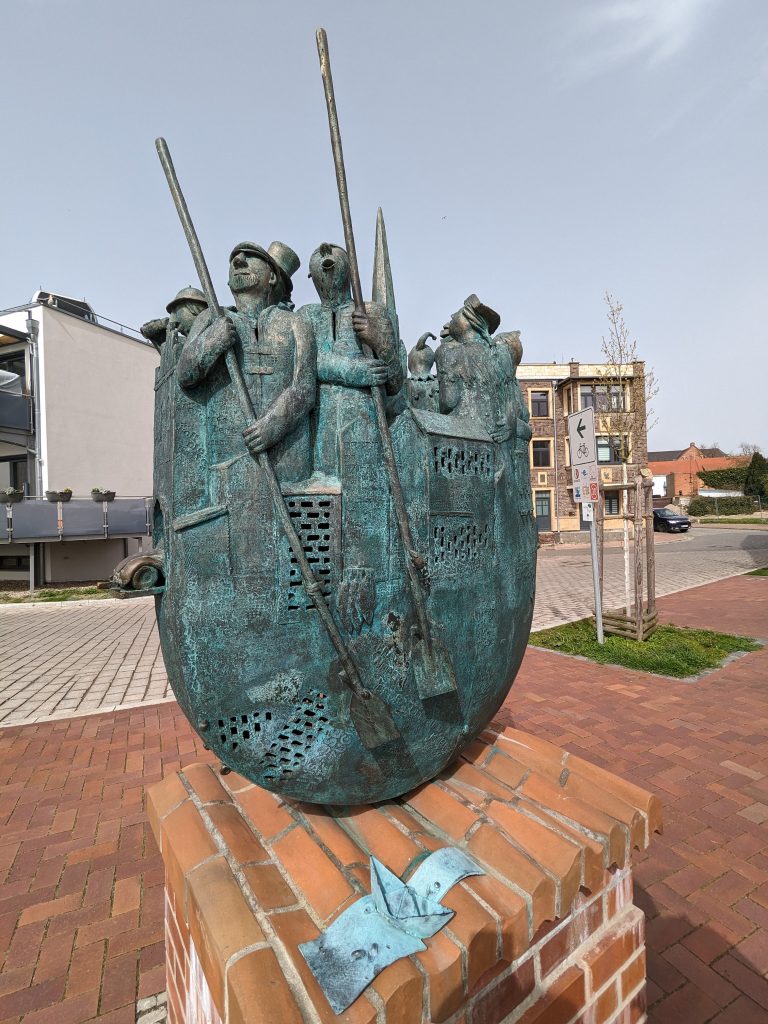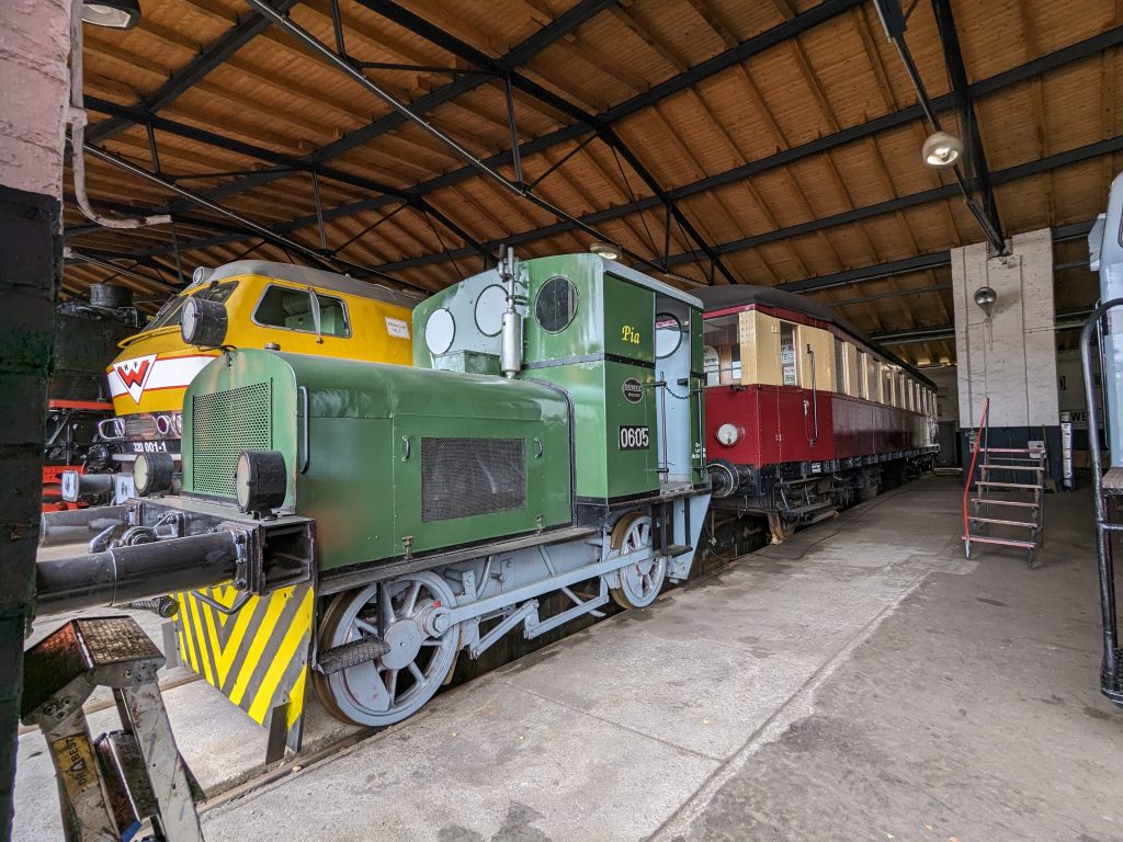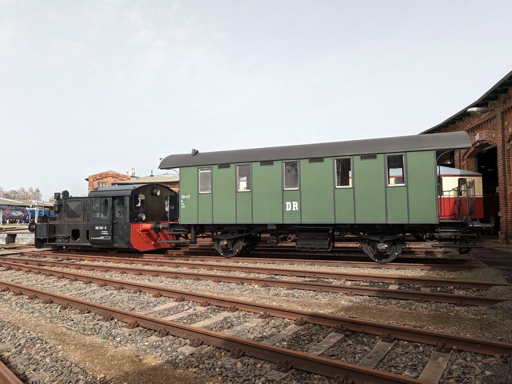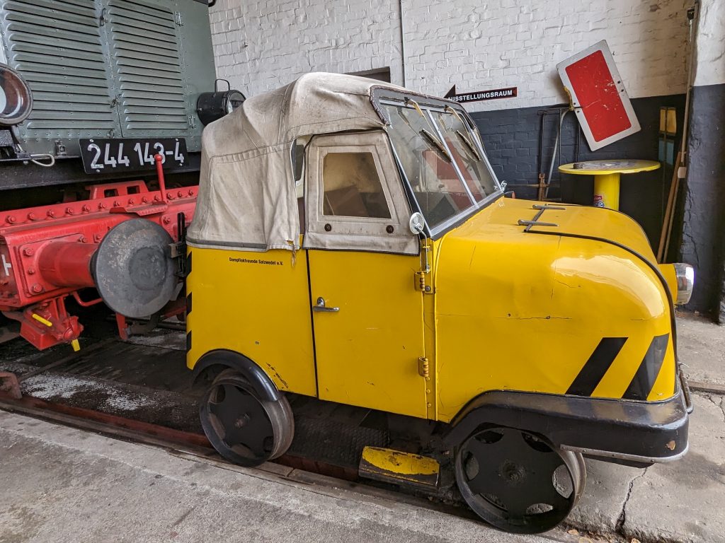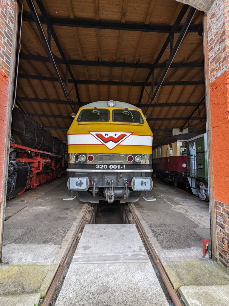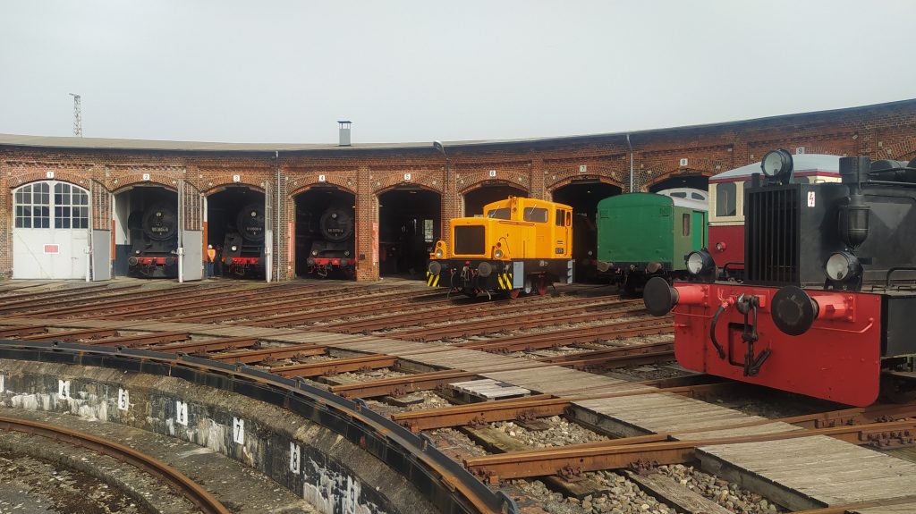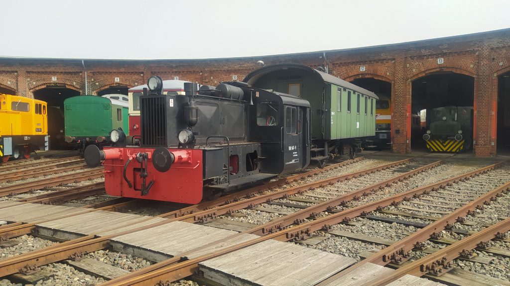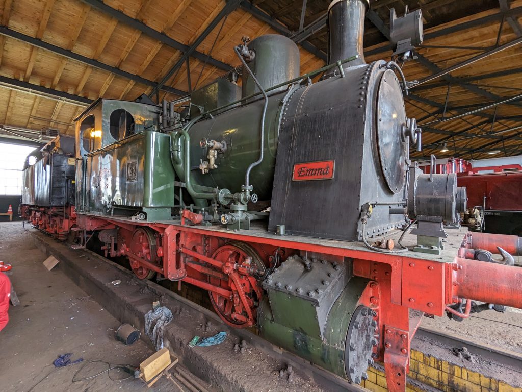 Der Wecker klingelt erst um 9 Uhr, so schaffe ich es nicht mehr in die Dusche. Also im Auto. Nach dem Frühstück radeln wir in den Ort. Ist sehr übersichtlich. Die meiste Zeit fahren wir erlaubterweise auf dem Bürgersteig wegen des Kopfsteinpflasters. Ein schneller Labcache wird absolviert. Nach einem Baguette als Mittagessen besichtigen wir den Lokschuppen, ein Verein, der hier Loks und Waggons sammelt und restauriert. Nachmittags gibt es lecker Eis in der einzigen Eisdiele. Zurück am Womo bekommen die Fahrräder vorne noch neue Bremsbeläge.